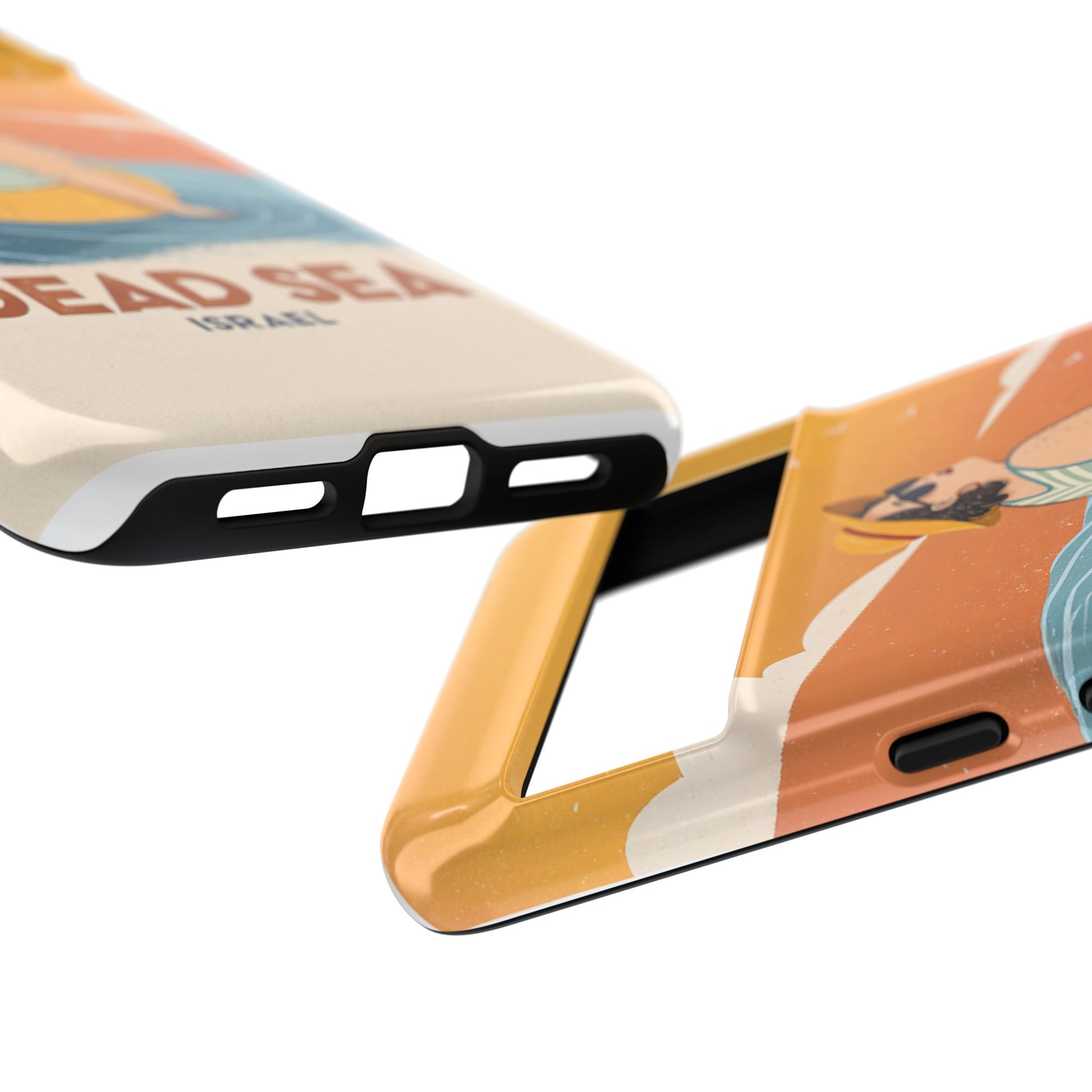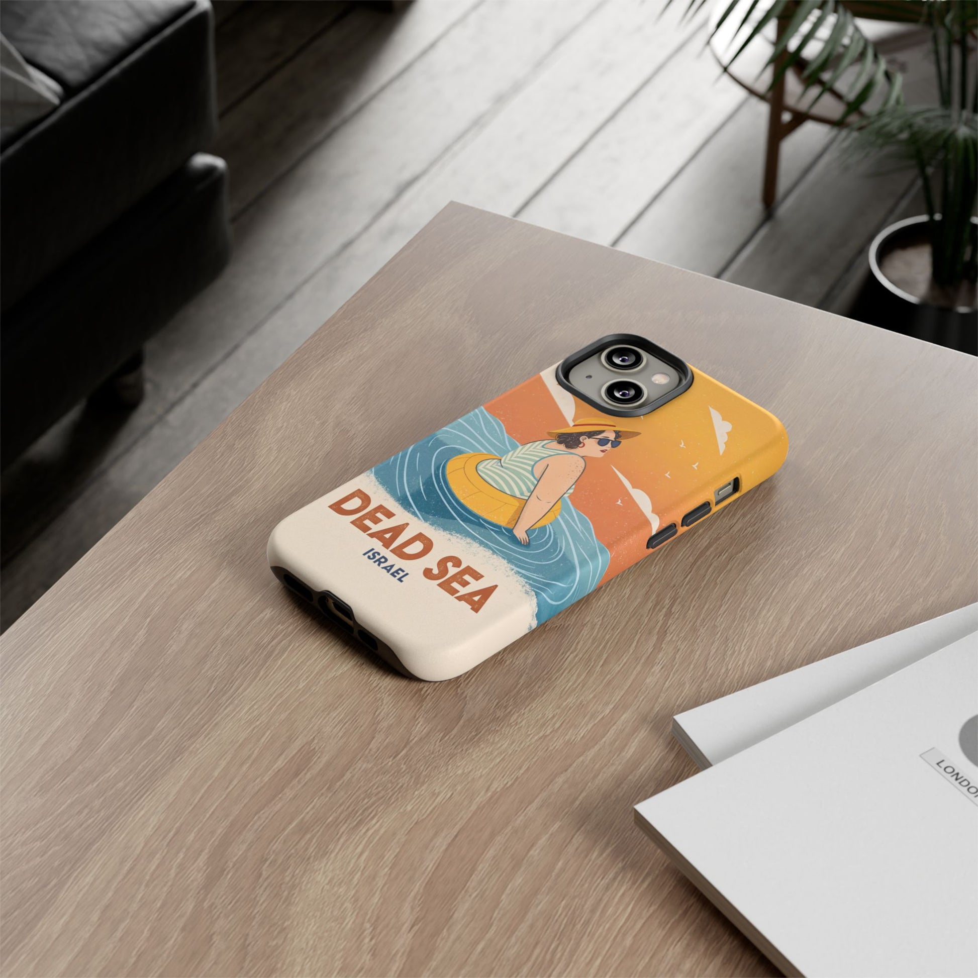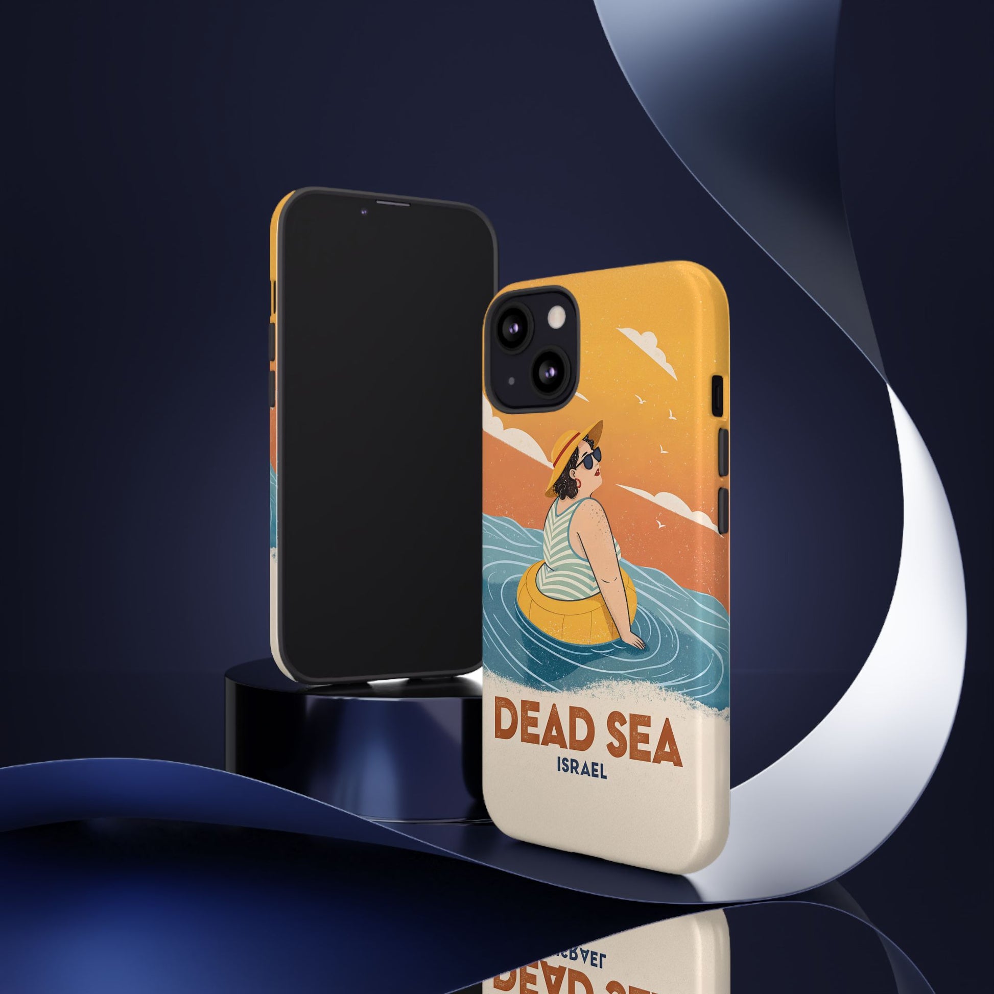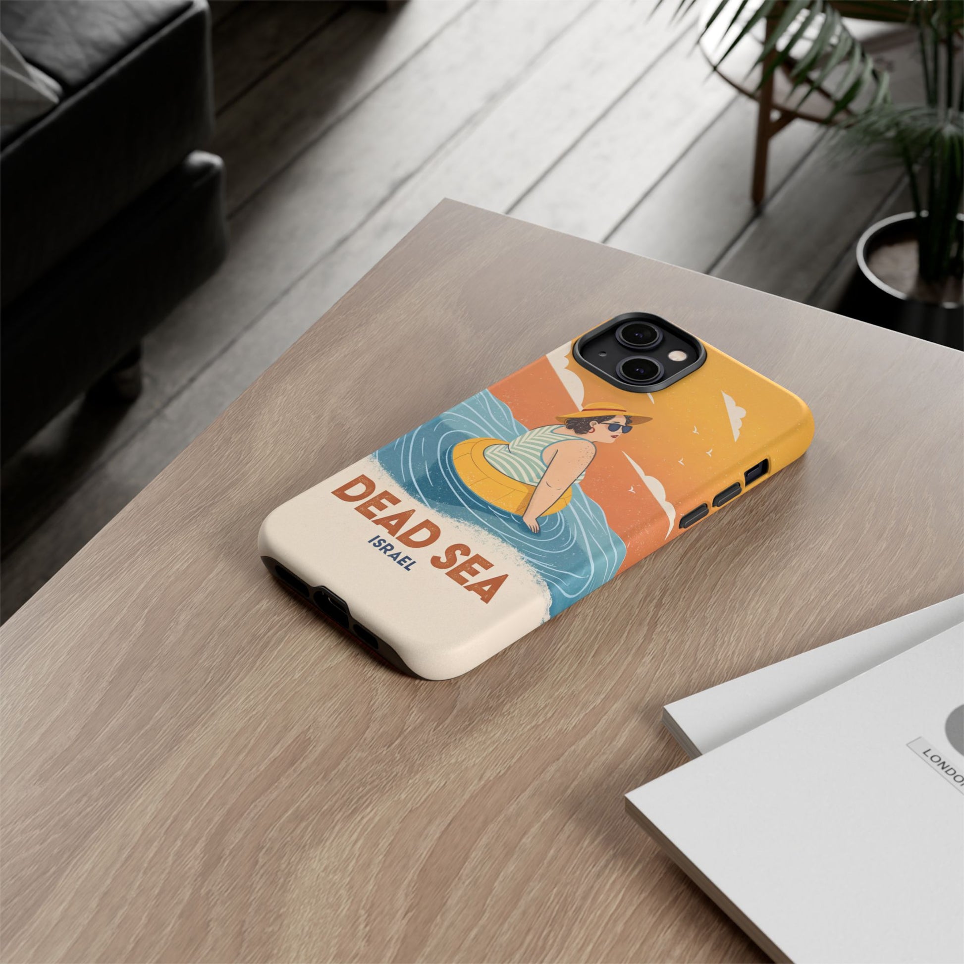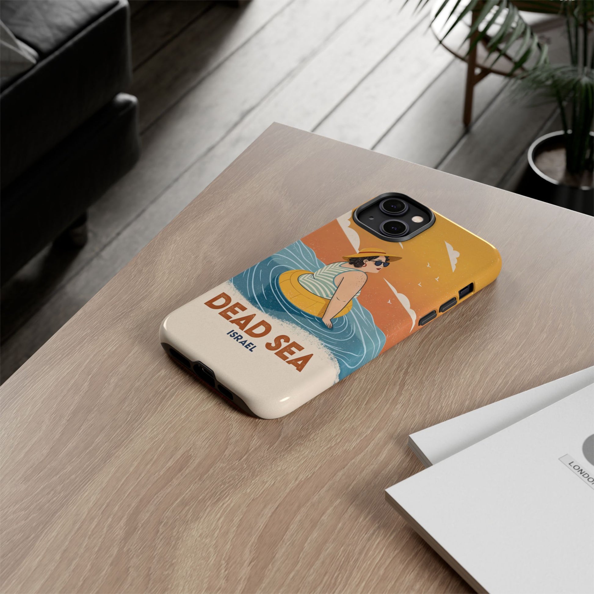 Ta med deg roen, magien og humoren fra Dødehavet med dette flotte retro-inspirerte mobildekselet. Designet viser en avslappet kvinne som flyter på det mineralrike vannet, omringet av myke blå bølger og en varm oransje himmel. Det kunstneriske uttrykket kombinerer vintage feriestemning med den ikoniske opplevelsen av å sveve uten anstrengelse på verdens salteste sjø.