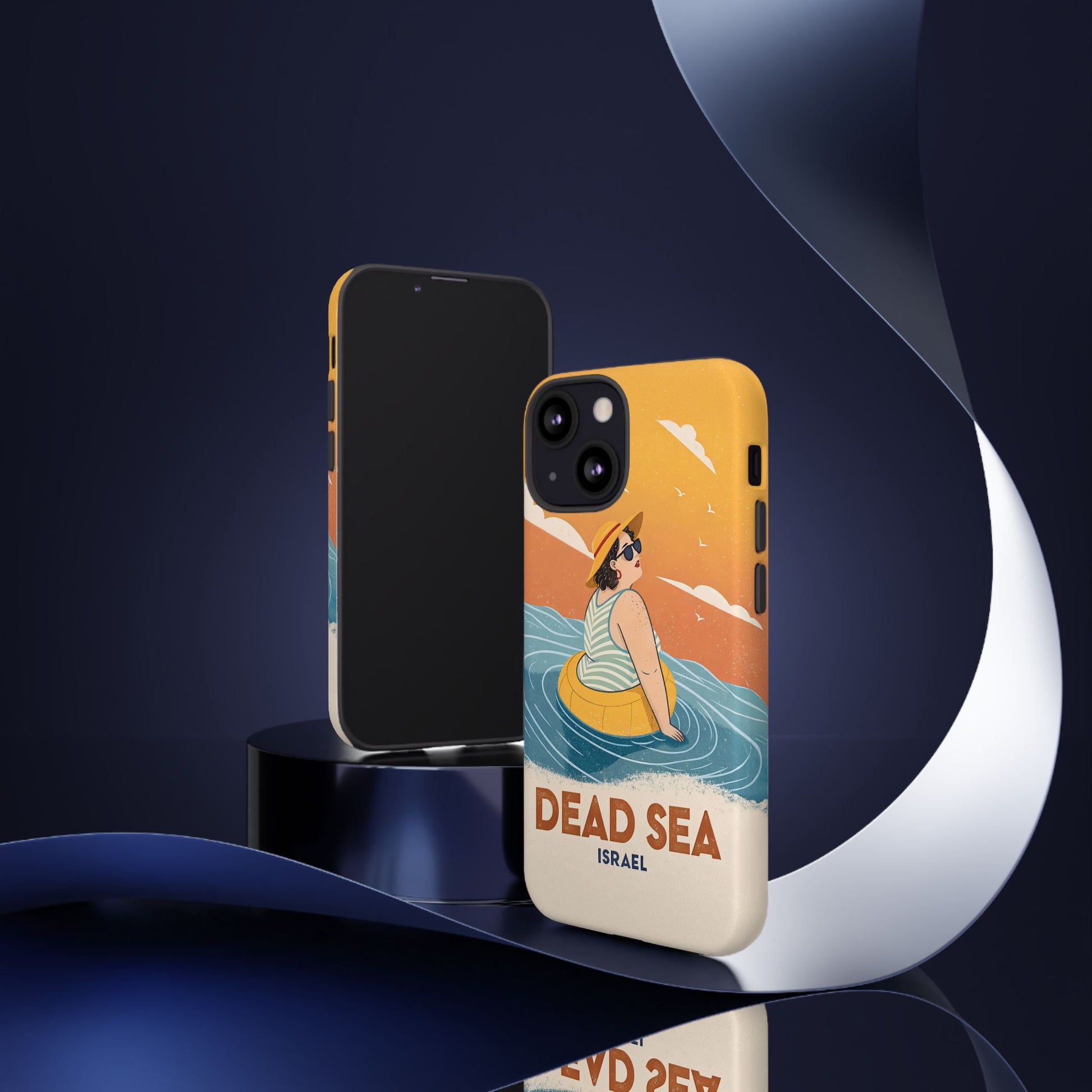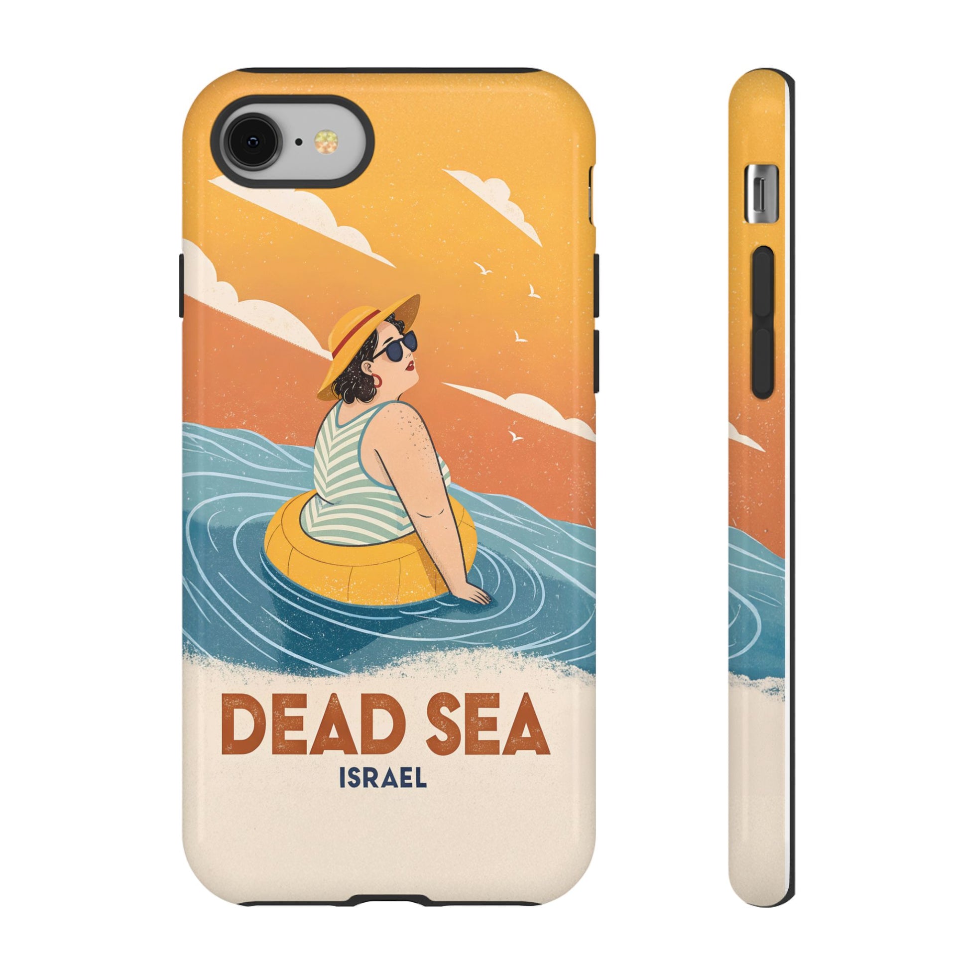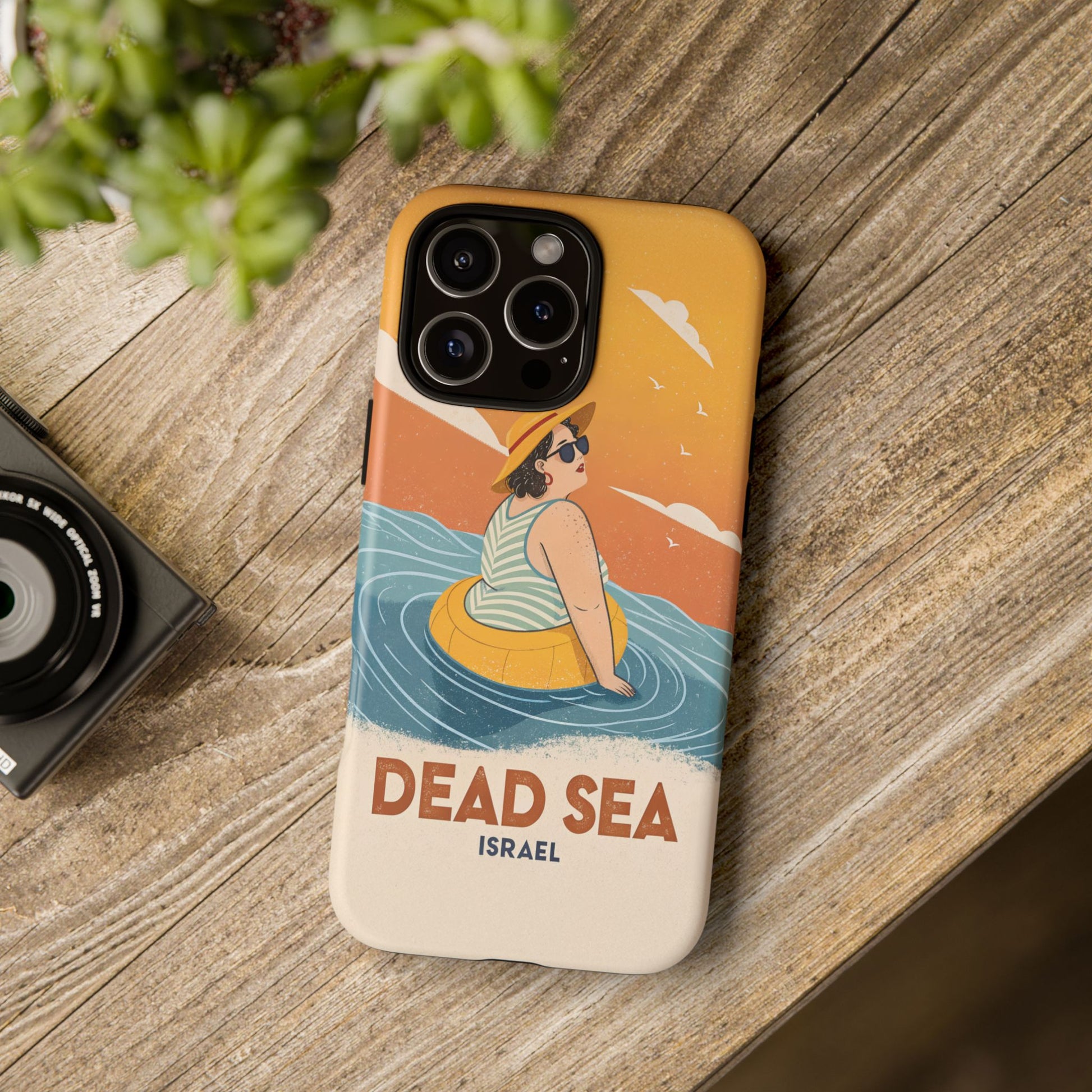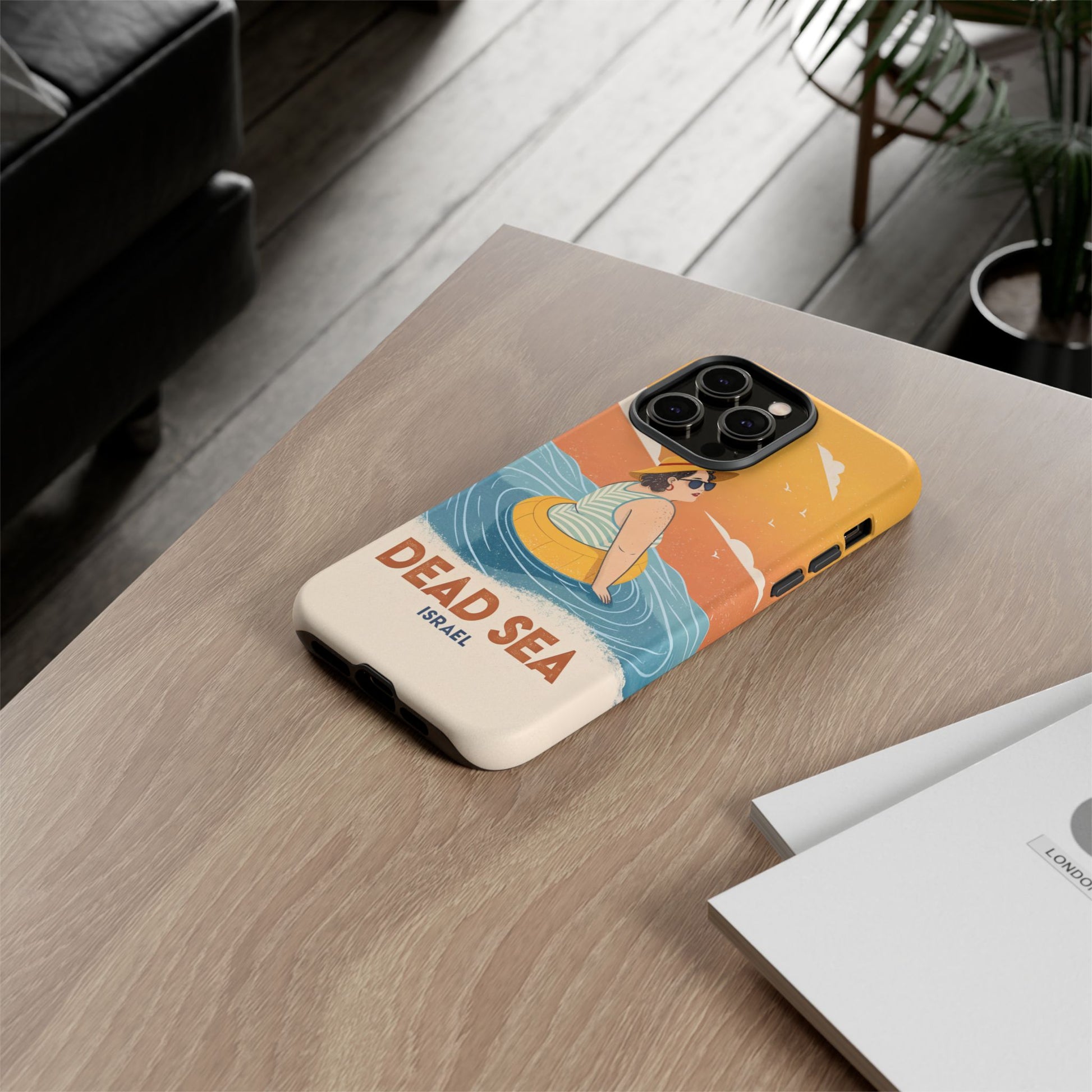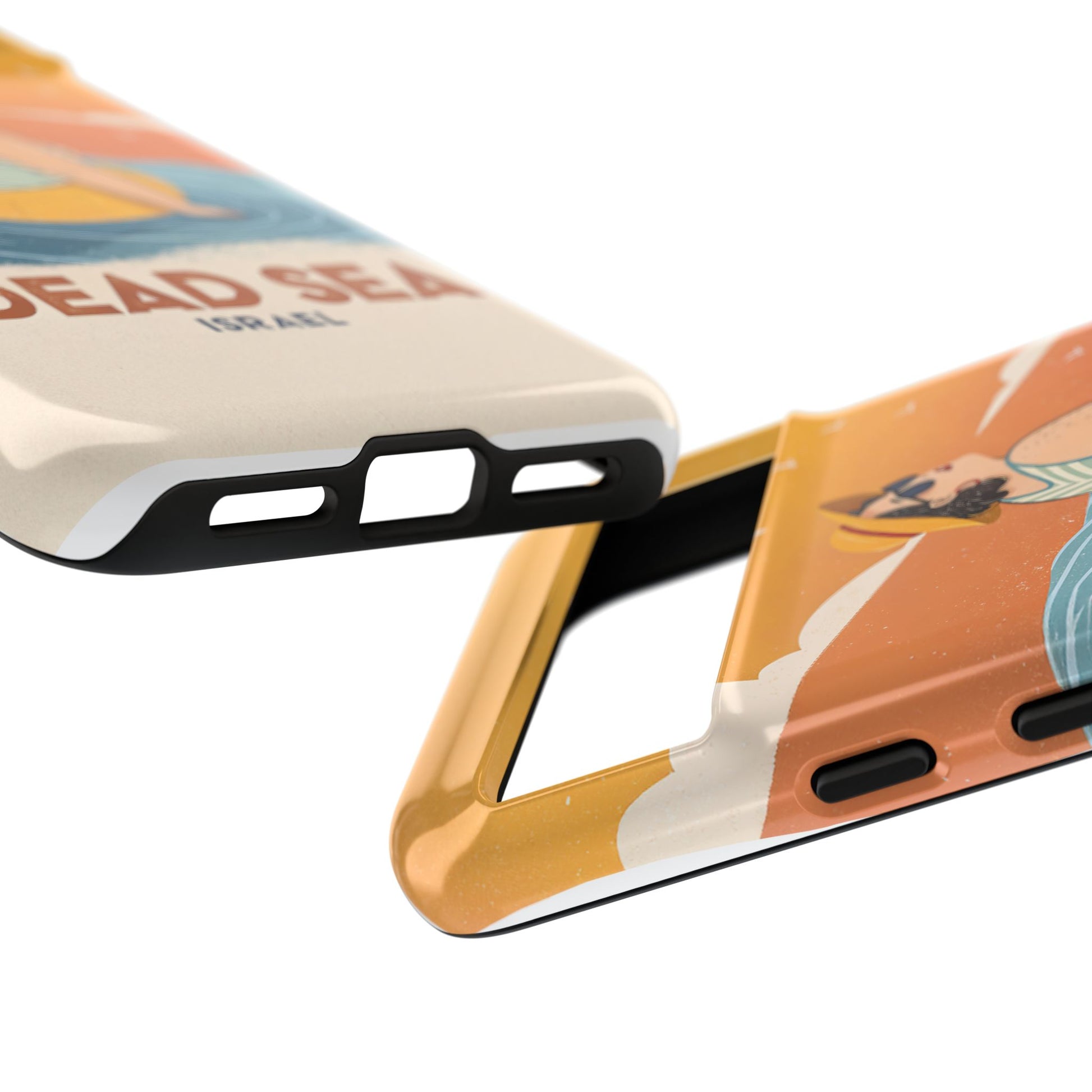 Ta med deg roen, magien og humoren fra Dødehavet med dette flotte retro-inspirerte mobildekselet. Designet viser en avslappet kvinne som flyter på det mineralrike vannet, omringet av myke blå bølger og en varm oransje himmel. Det kunstneriske uttrykket kombinerer vintage feriestemning med den ikoniske opplevelsen av å sveve uten anstrengelse på verdens salteste sjø.