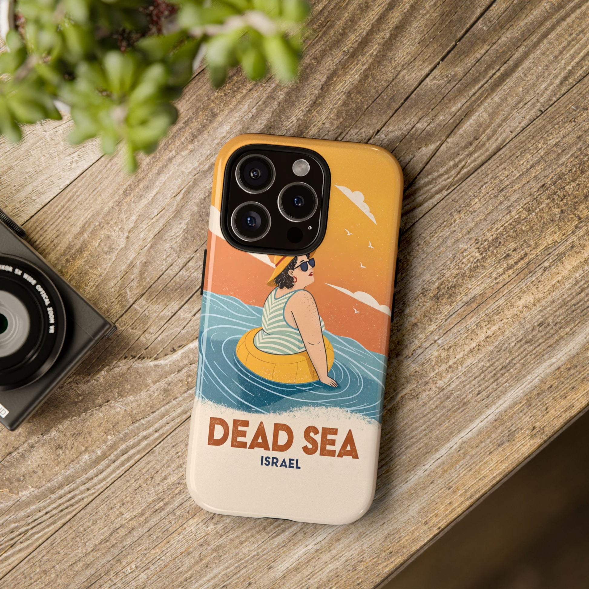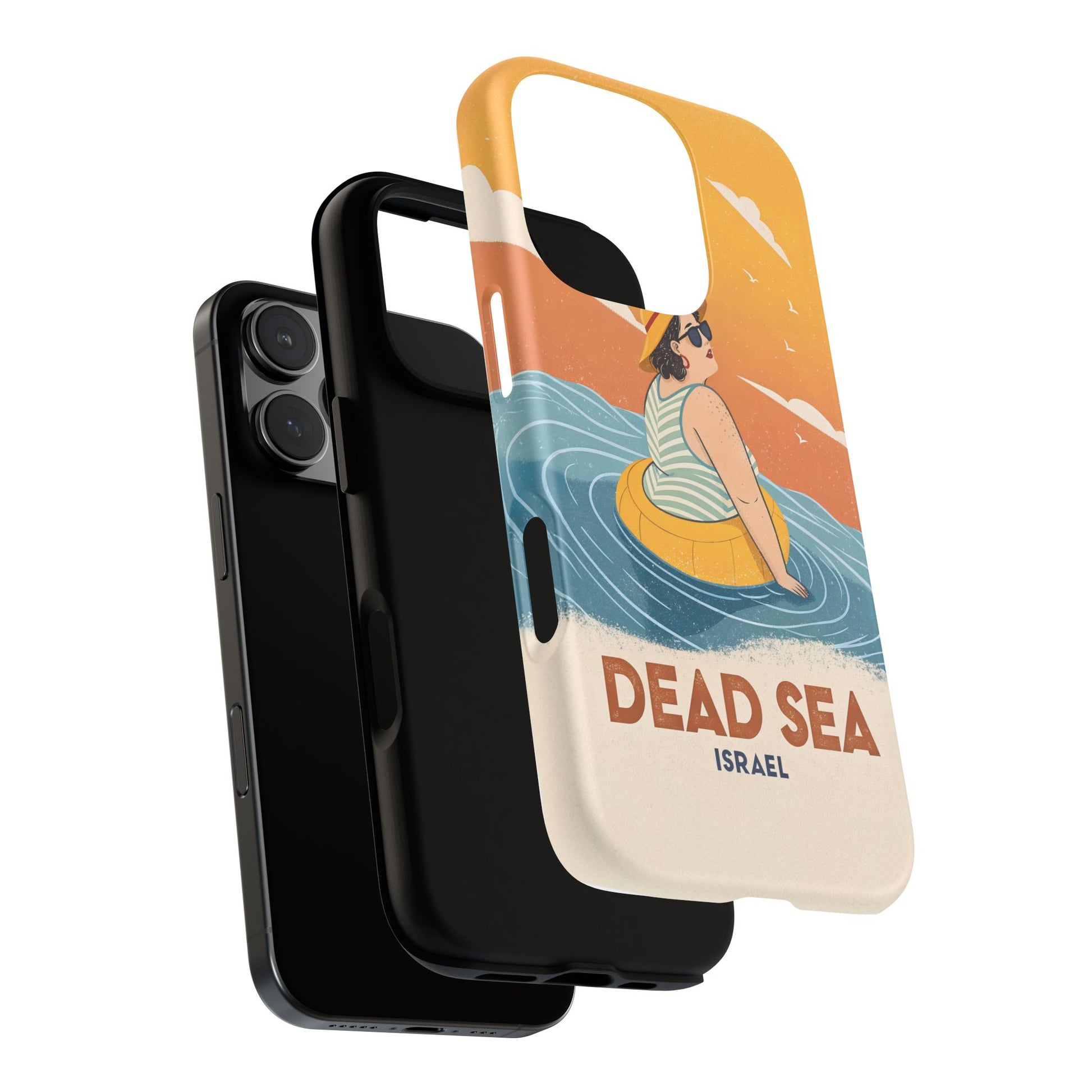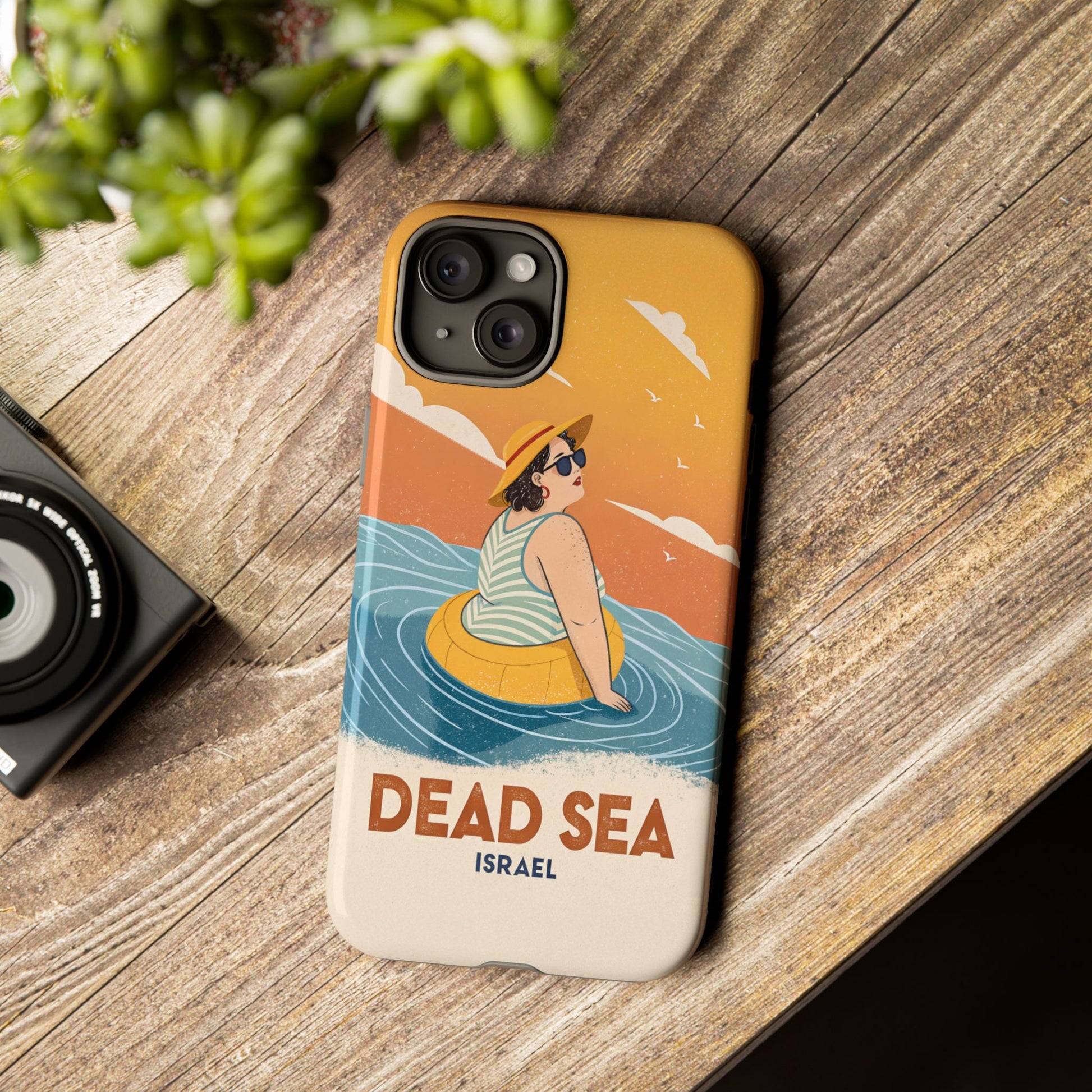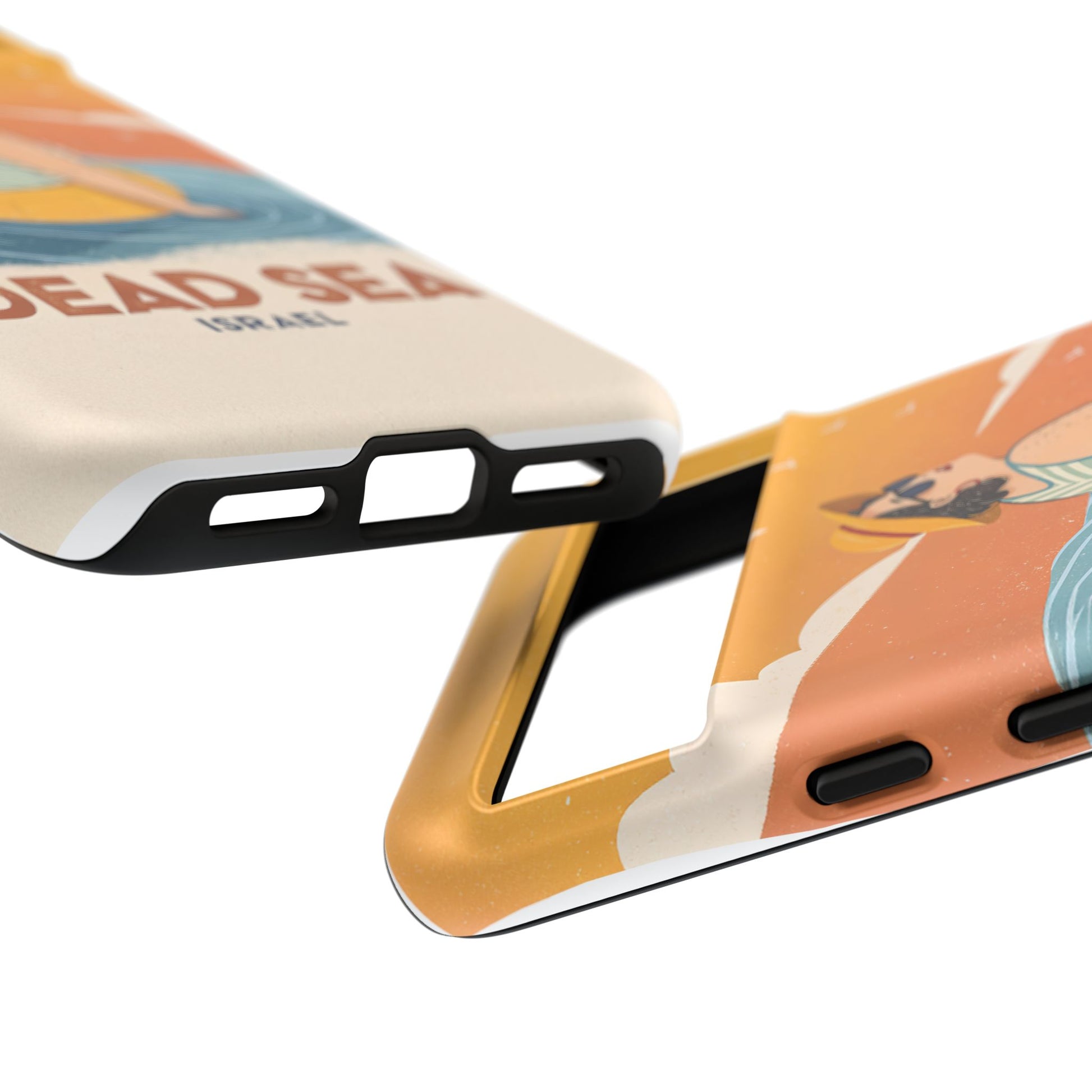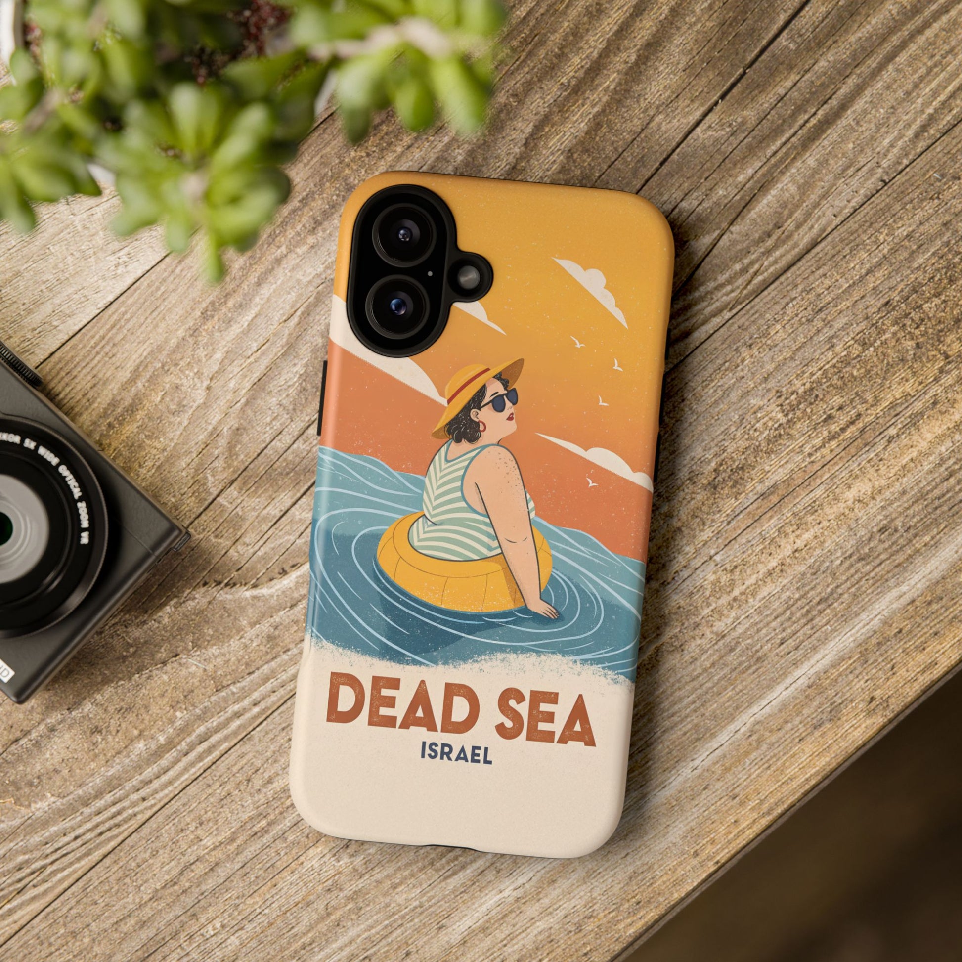 Ta med deg roen, magien og humoren fra Dødehavet med dette flotte retro-inspirerte mobildekselet. Designet viser en avslappet kvinne som flyter på det mineralrike vannet, omringet av myke blå bølger og en varm oransje himmel. Det kunstneriske uttrykket kombinerer vintage feriestemning med den ikoniske opplevelsen av å sveve uten anstrengelse på verdens salteste sjø.