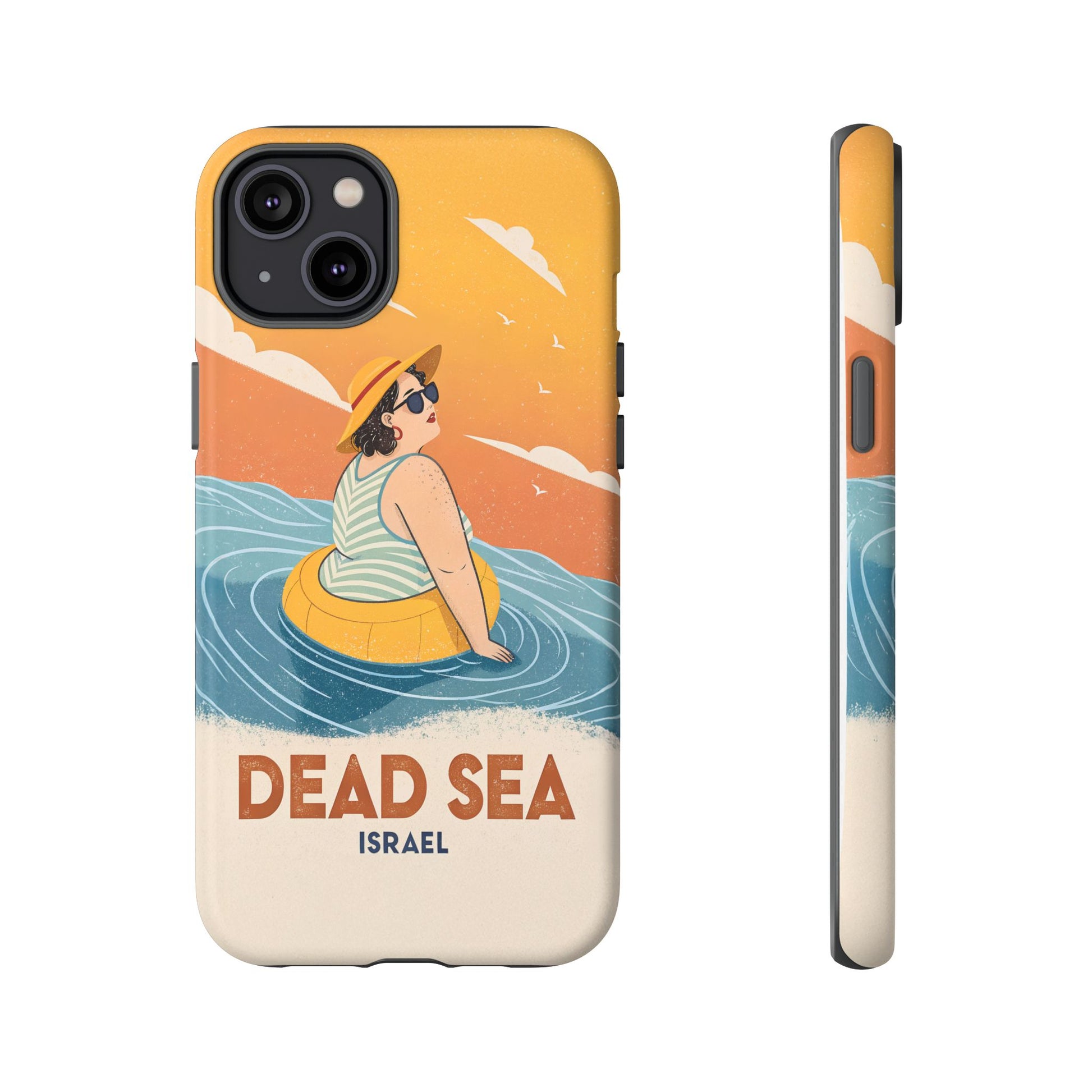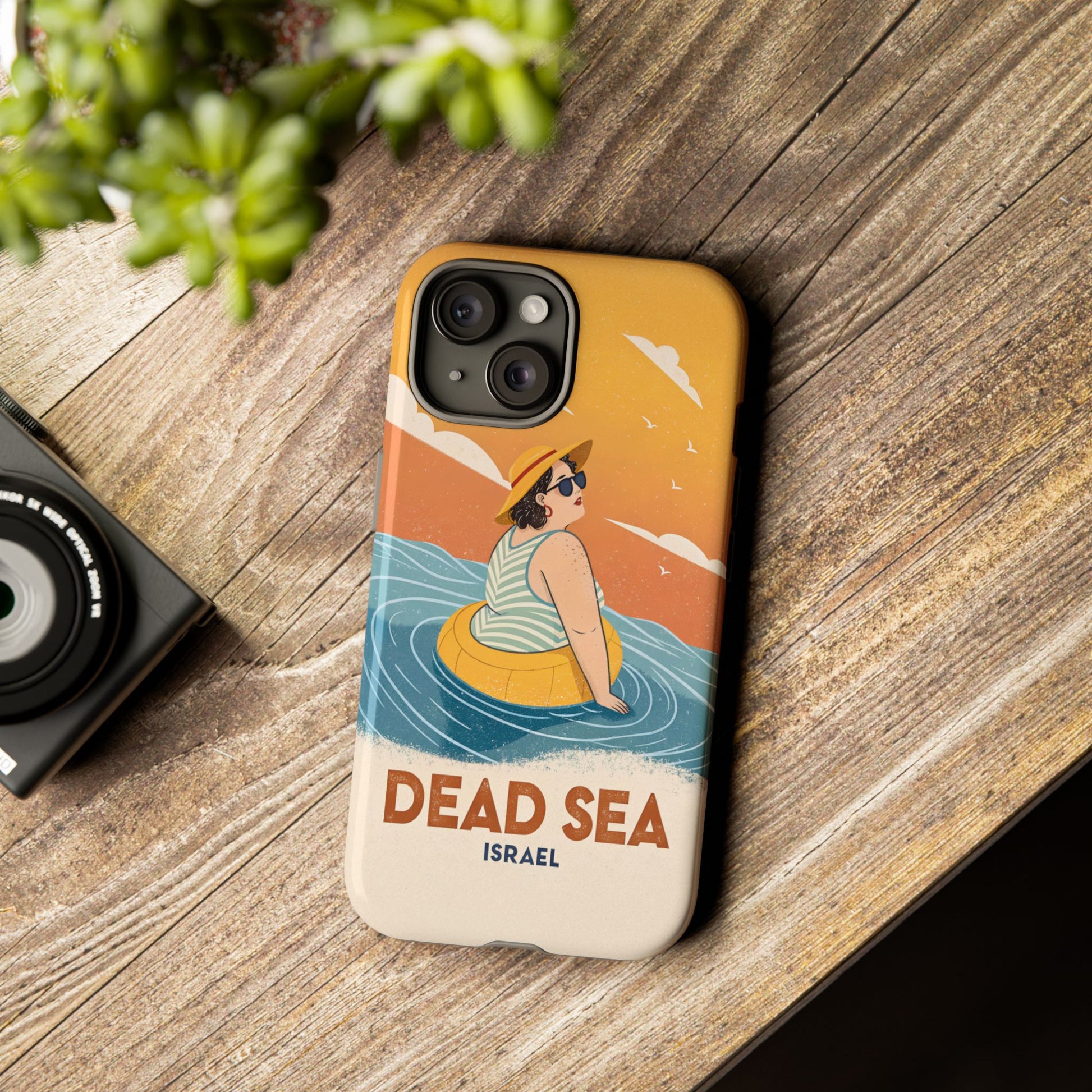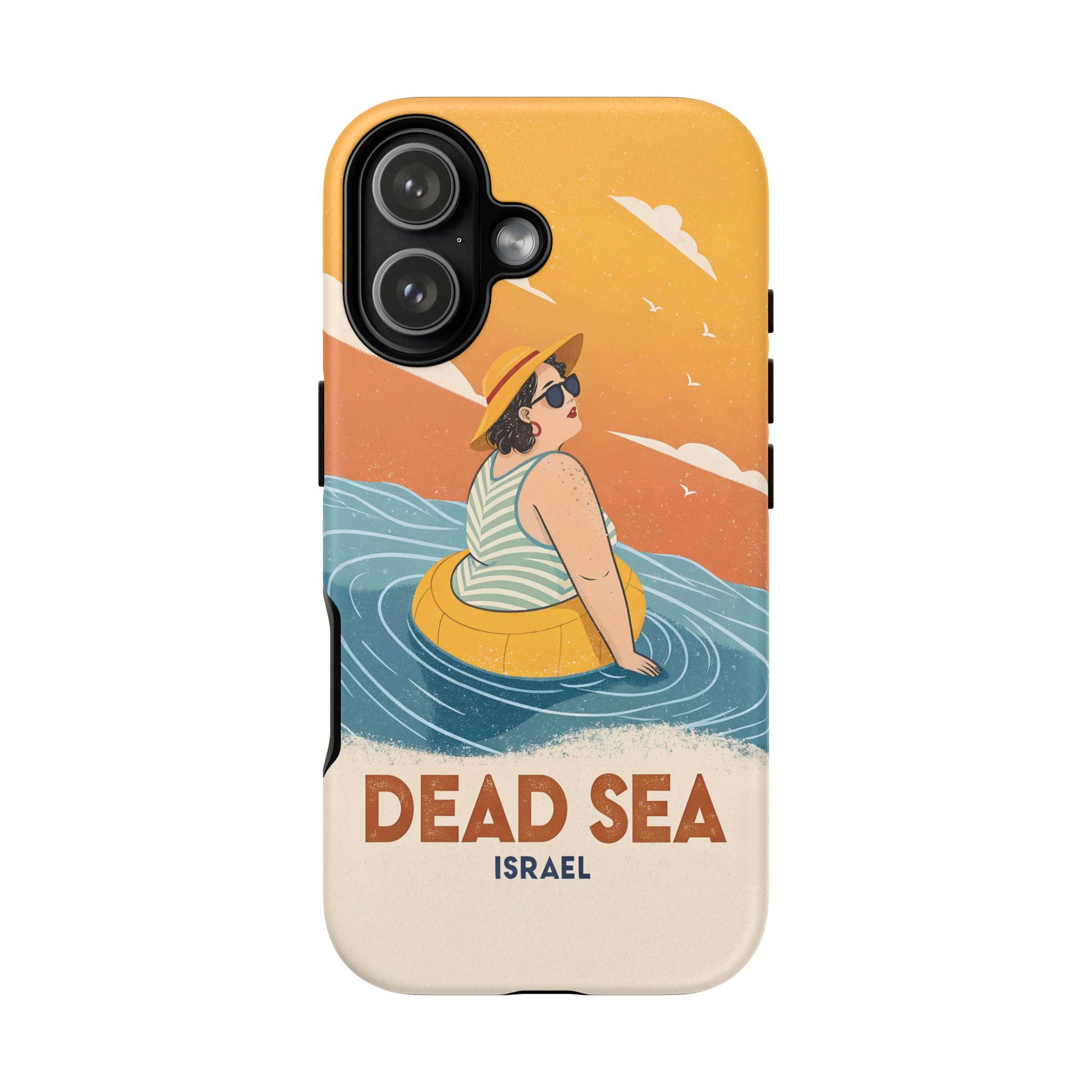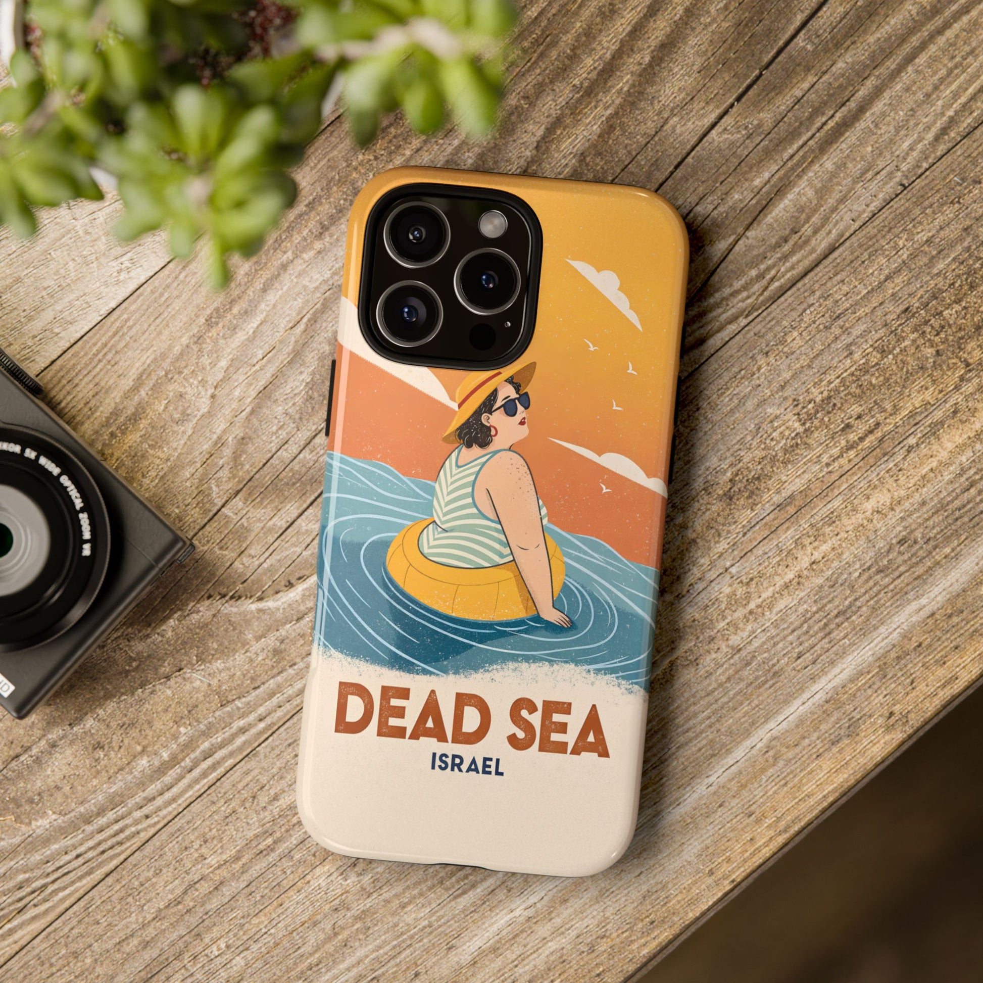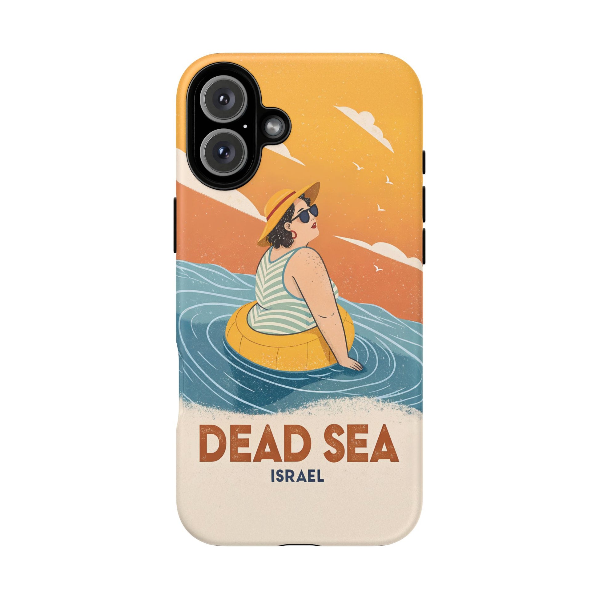 Ta med deg roen, magien og humoren fra Dødehavet med dette flotte retro-inspirerte mobildekselet. Designet viser en avslappet kvinne som flyter på det mineralrike vannet, omringet av myke blå bølger og en varm oransje himmel. Det kunstneriske uttrykket kombinerer vintage feriestemning med den ikoniske opplevelsen av å sveve uten anstrengelse på verdens salteste sjø.