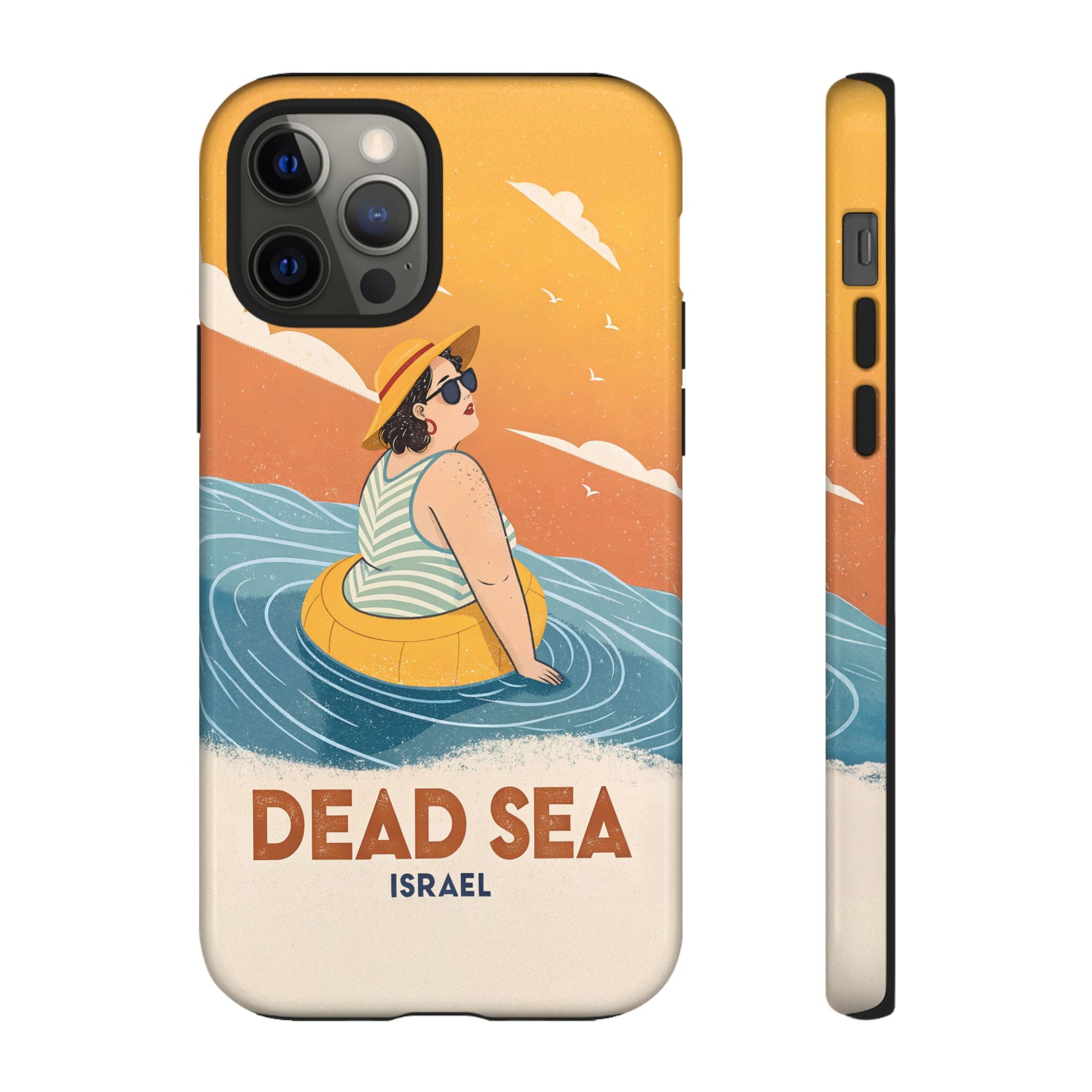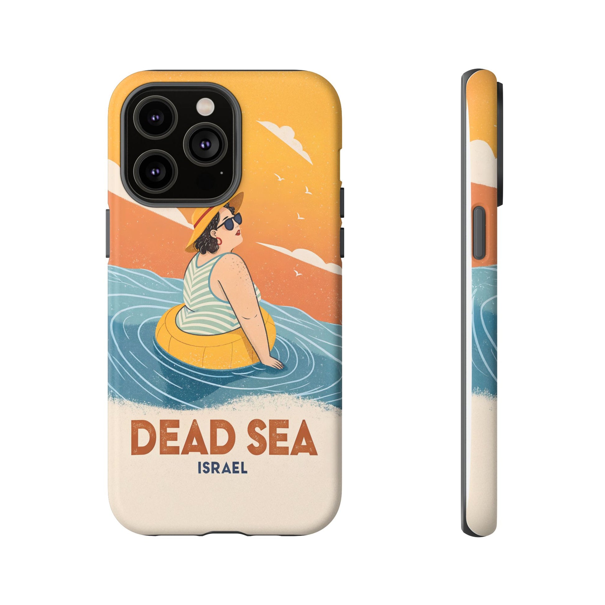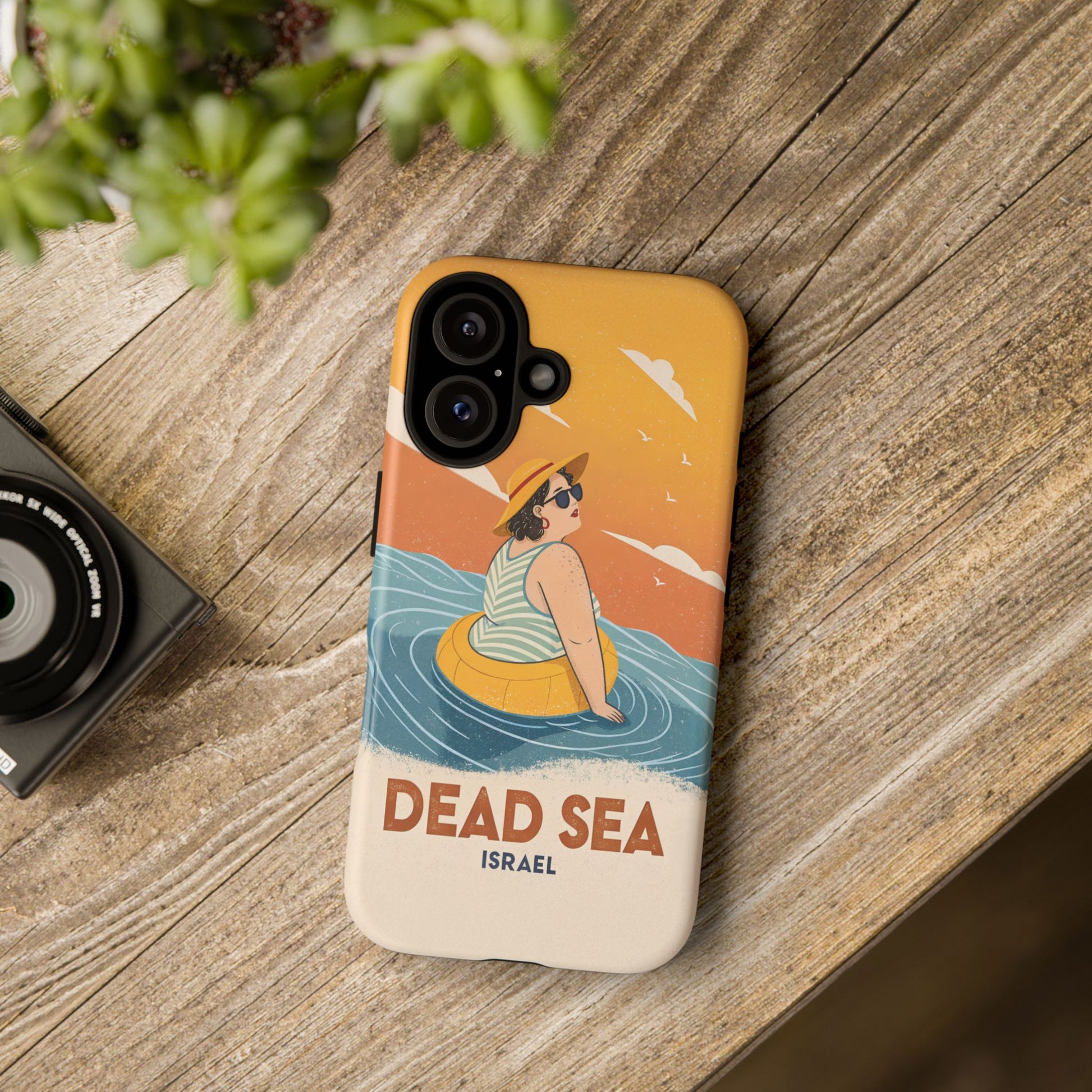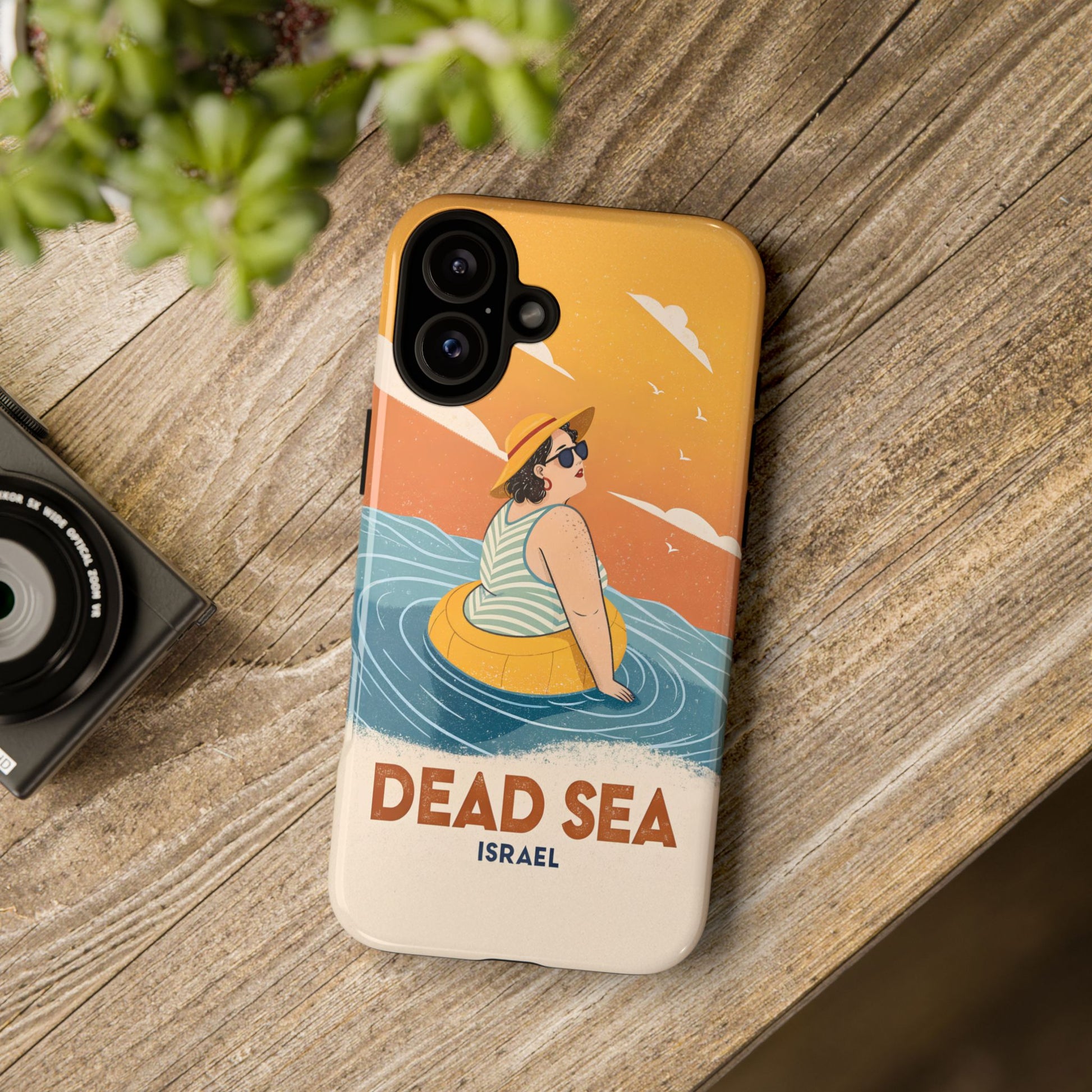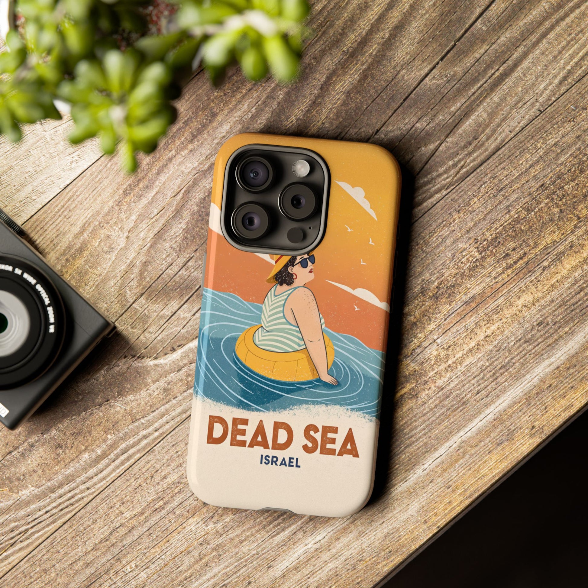 Ta med deg roen, magien og humoren fra Dødehavet med dette flotte retro-inspirerte mobildekselet. Designet viser en avslappet kvinne som flyter på det mineralrike vannet, omringet av myke blå bølger og en varm oransje himmel. Det kunstneriske uttrykket kombinerer vintage feriestemning med den ikoniske opplevelsen av å sveve uten anstrengelse på verdens salteste sjø.