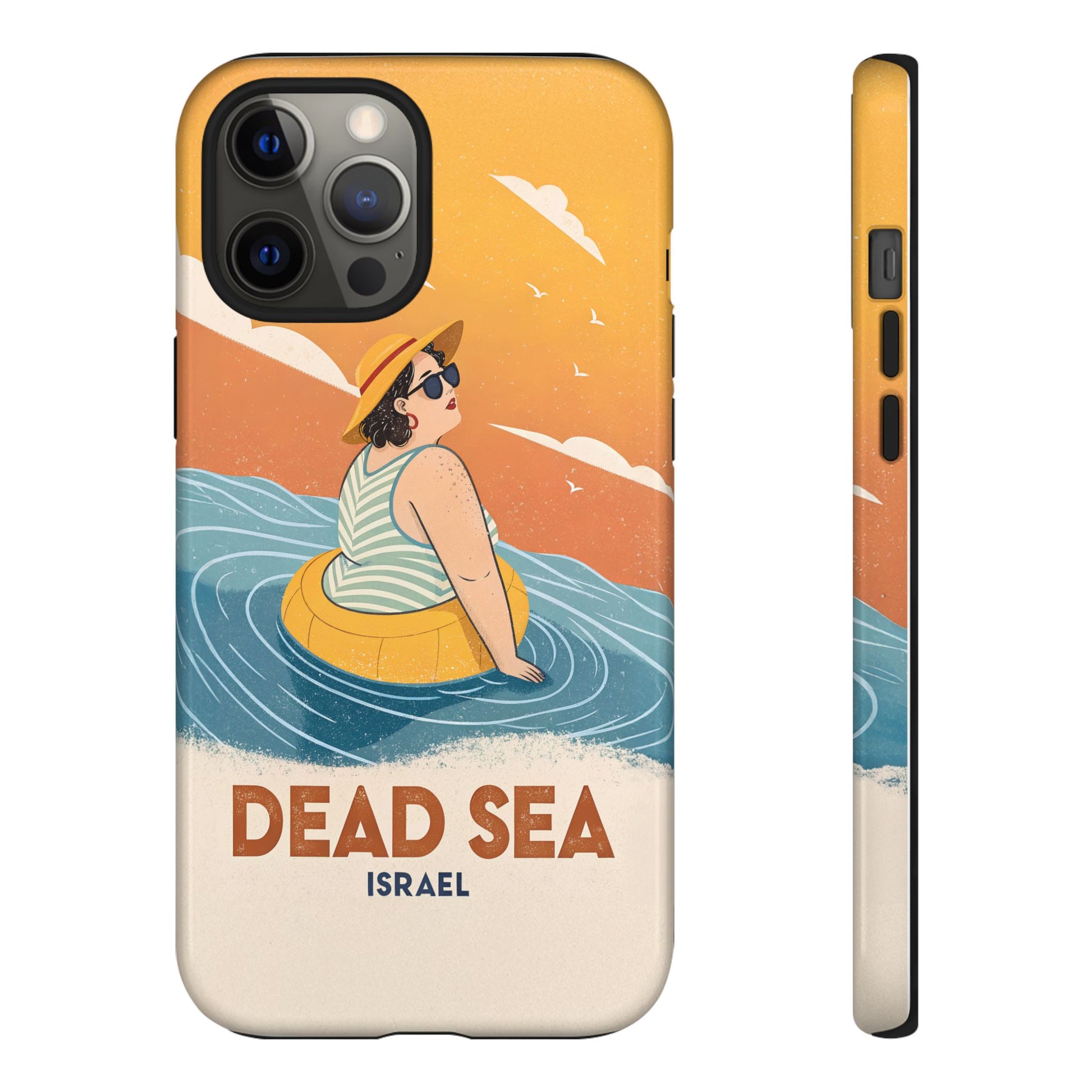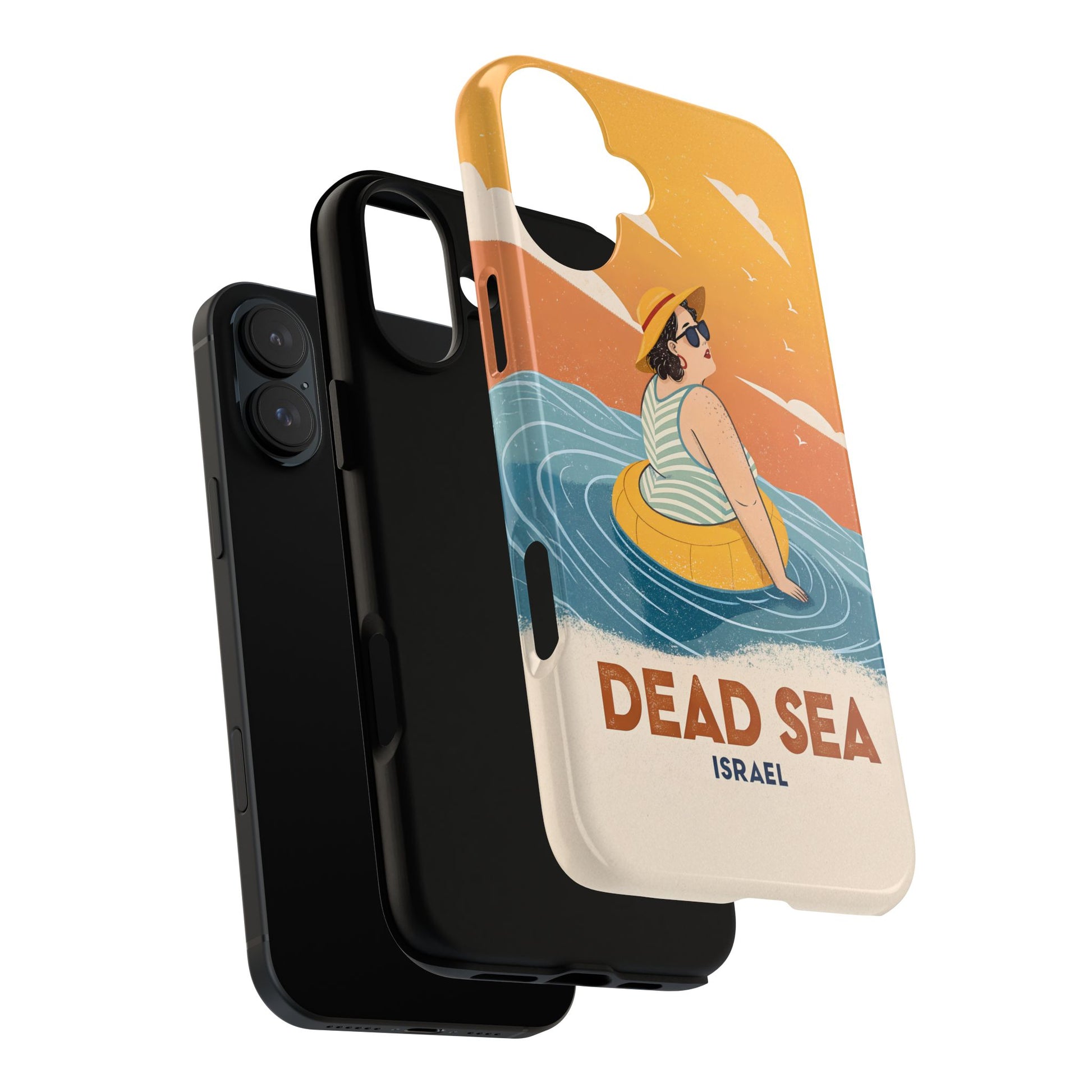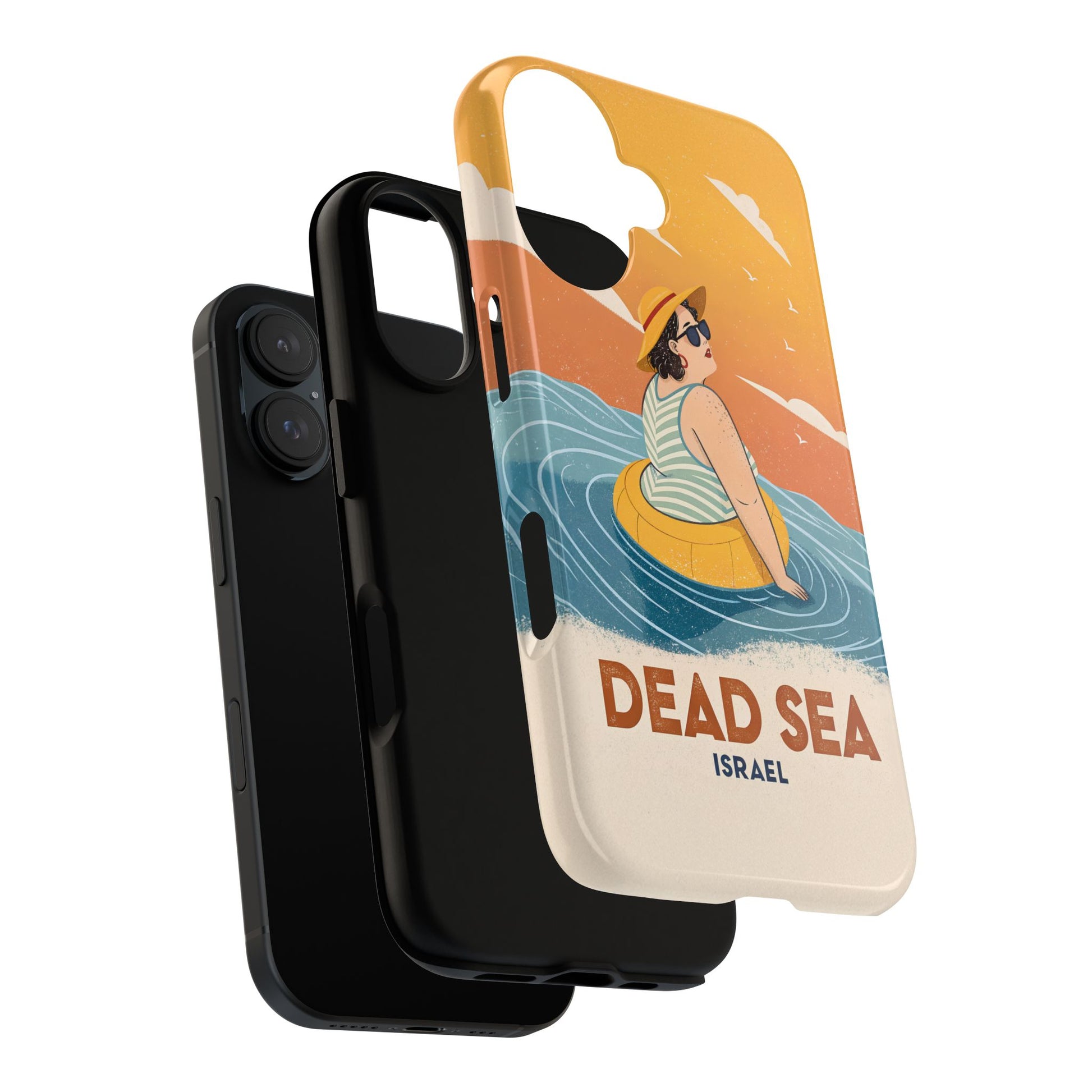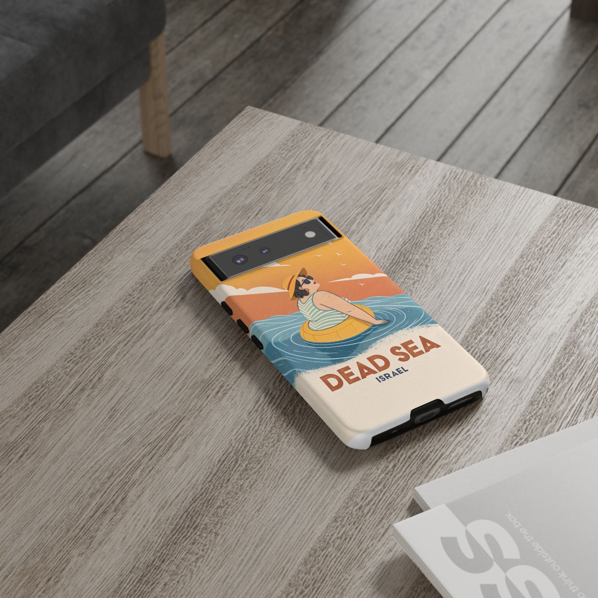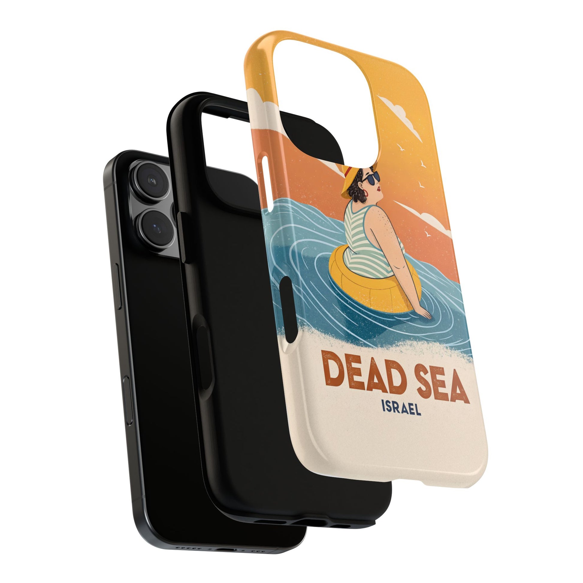 Ta med deg roen, magien og humoren fra Dødehavet med dette flotte retro-inspirerte mobildekselet. Designet viser en avslappet kvinne som flyter på det mineralrike vannet, omringet av myke blå bølger og en varm oransje himmel. Det kunstneriske uttrykket kombinerer vintage feriestemning med den ikoniske opplevelsen av å sveve uten anstrengelse på verdens salteste sjø.