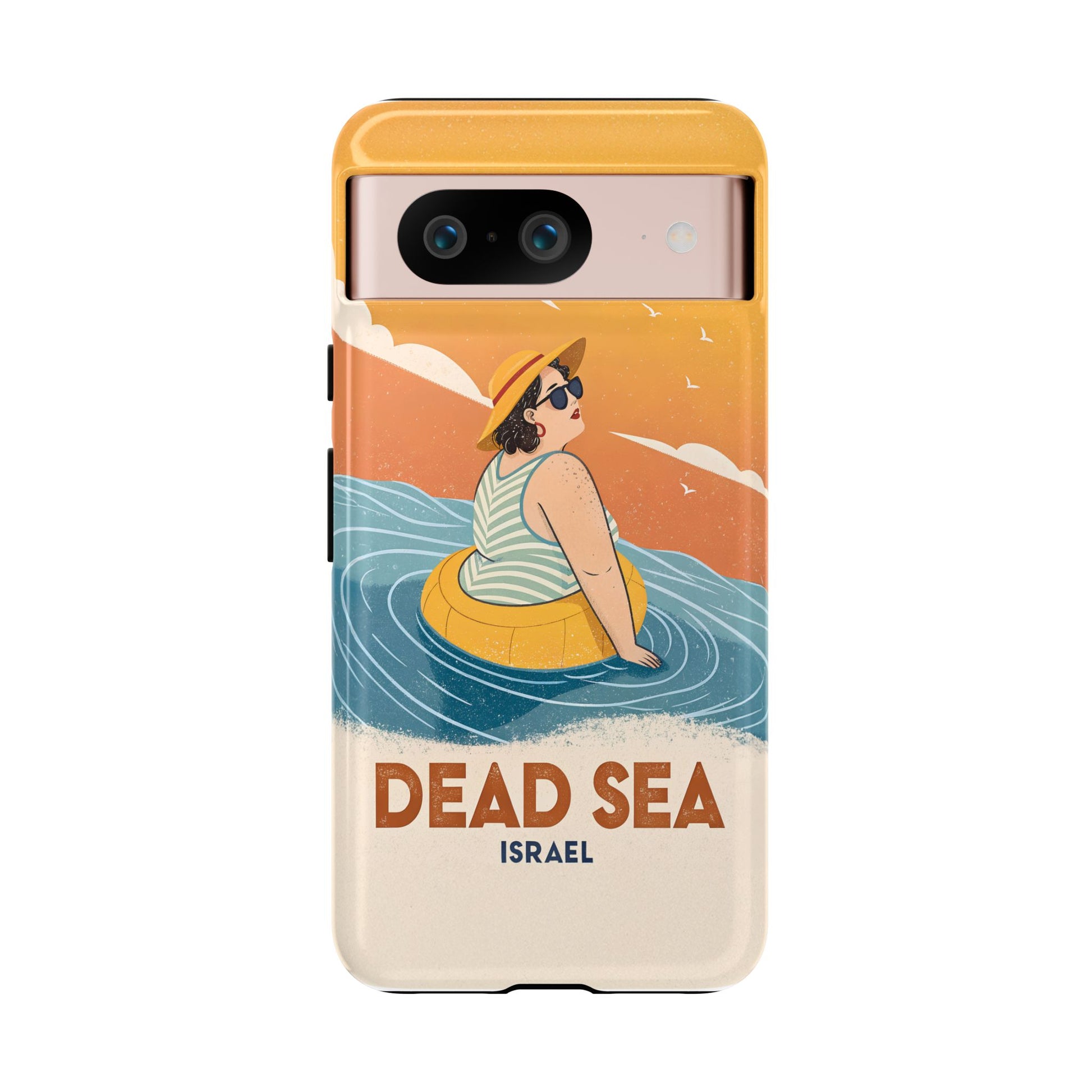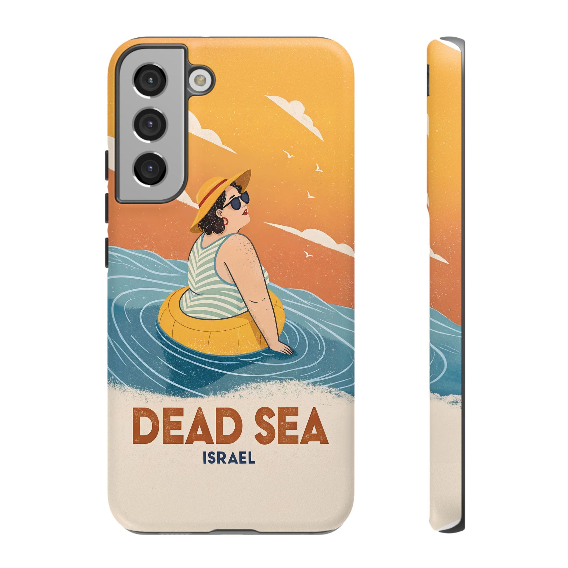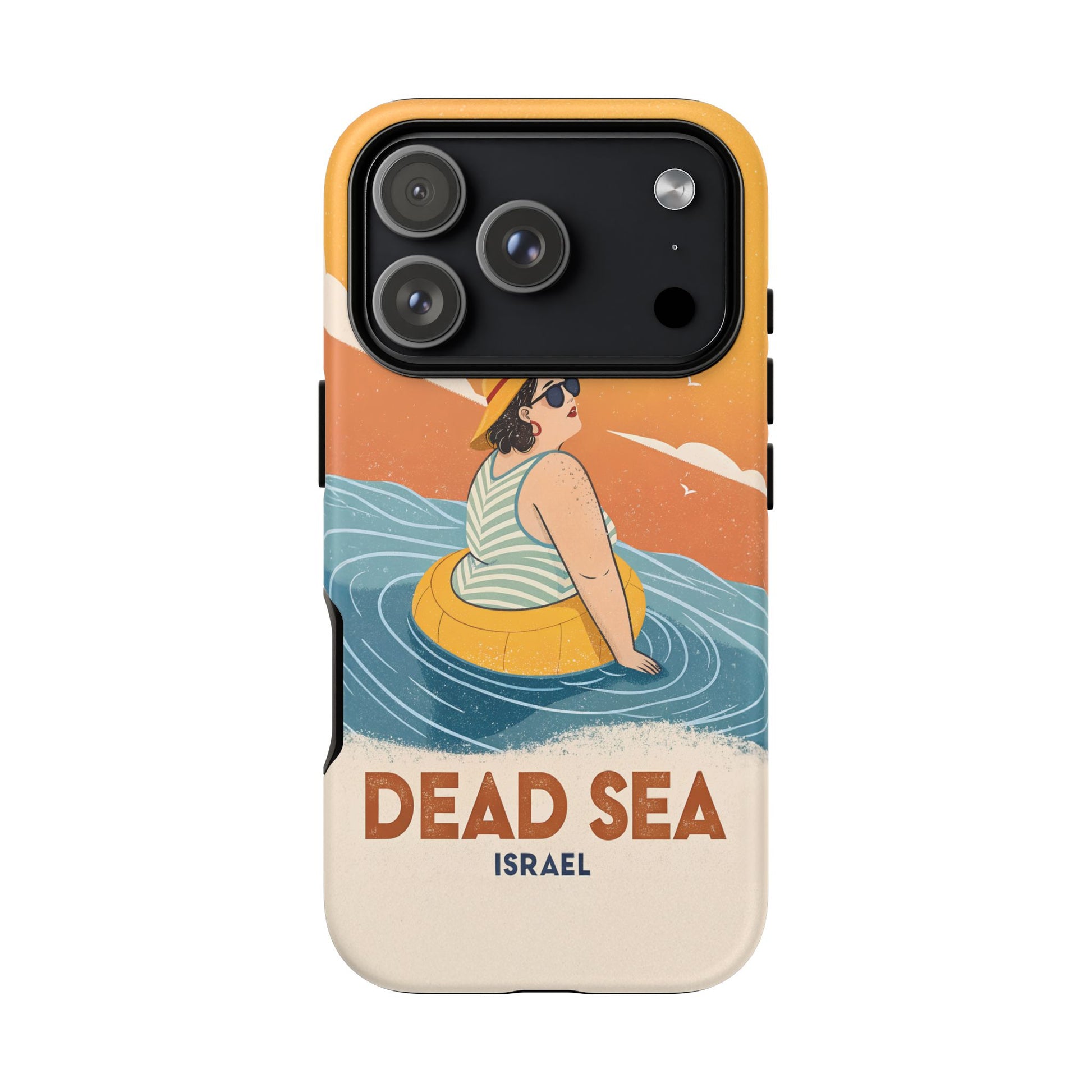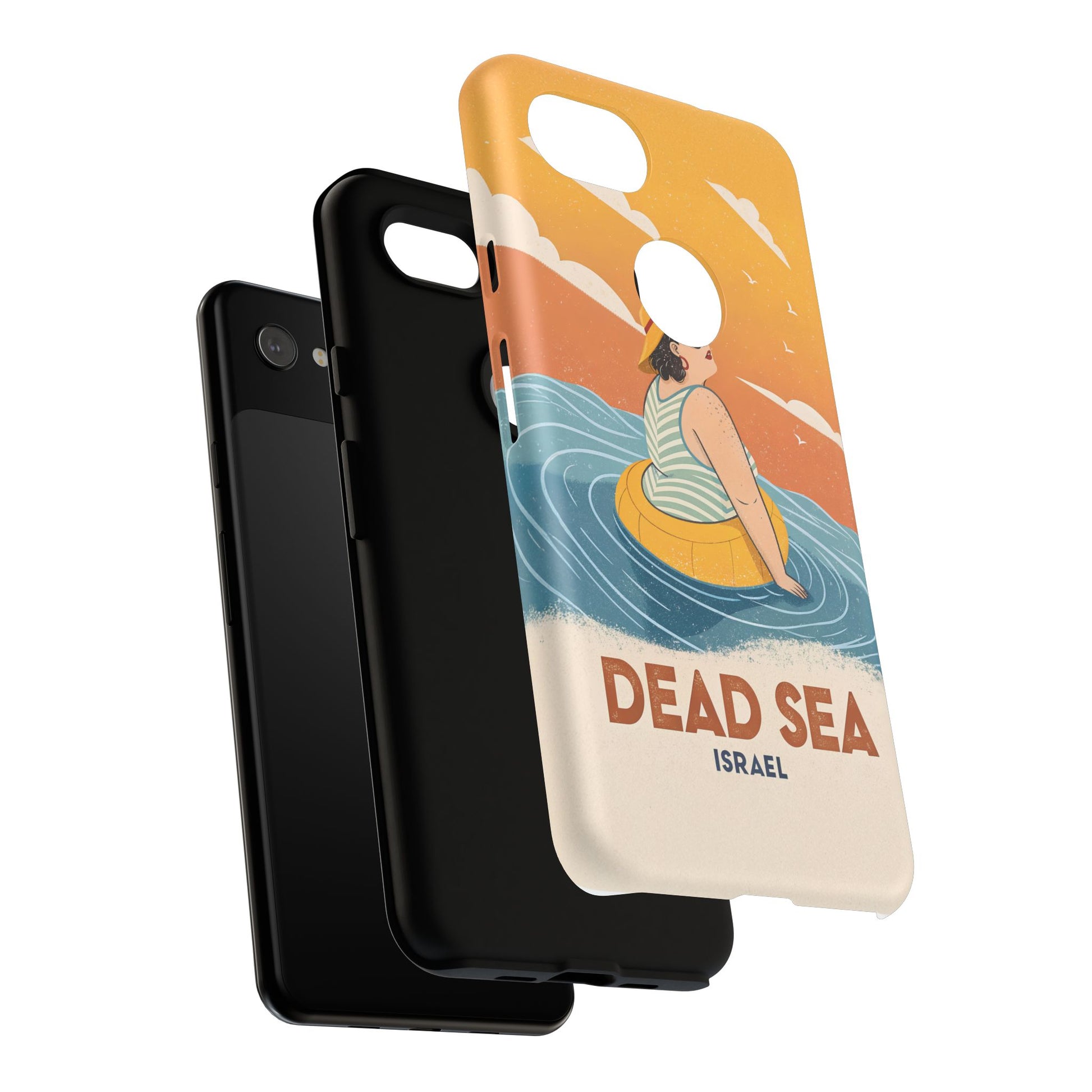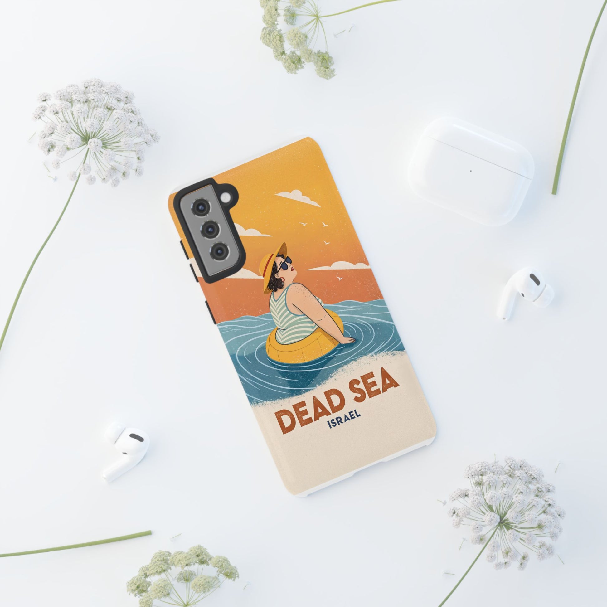 Ta med deg roen, magien og humoren fra Dødehavet med dette flotte retro-inspirerte mobildekselet. Designet viser en avslappet kvinne som flyter på det mineralrike vannet, omringet av myke blå bølger og en varm oransje himmel. Det kunstneriske uttrykket kombinerer vintage feriestemning med den ikoniske opplevelsen av å sveve uten anstrengelse på verdens salteste sjø.