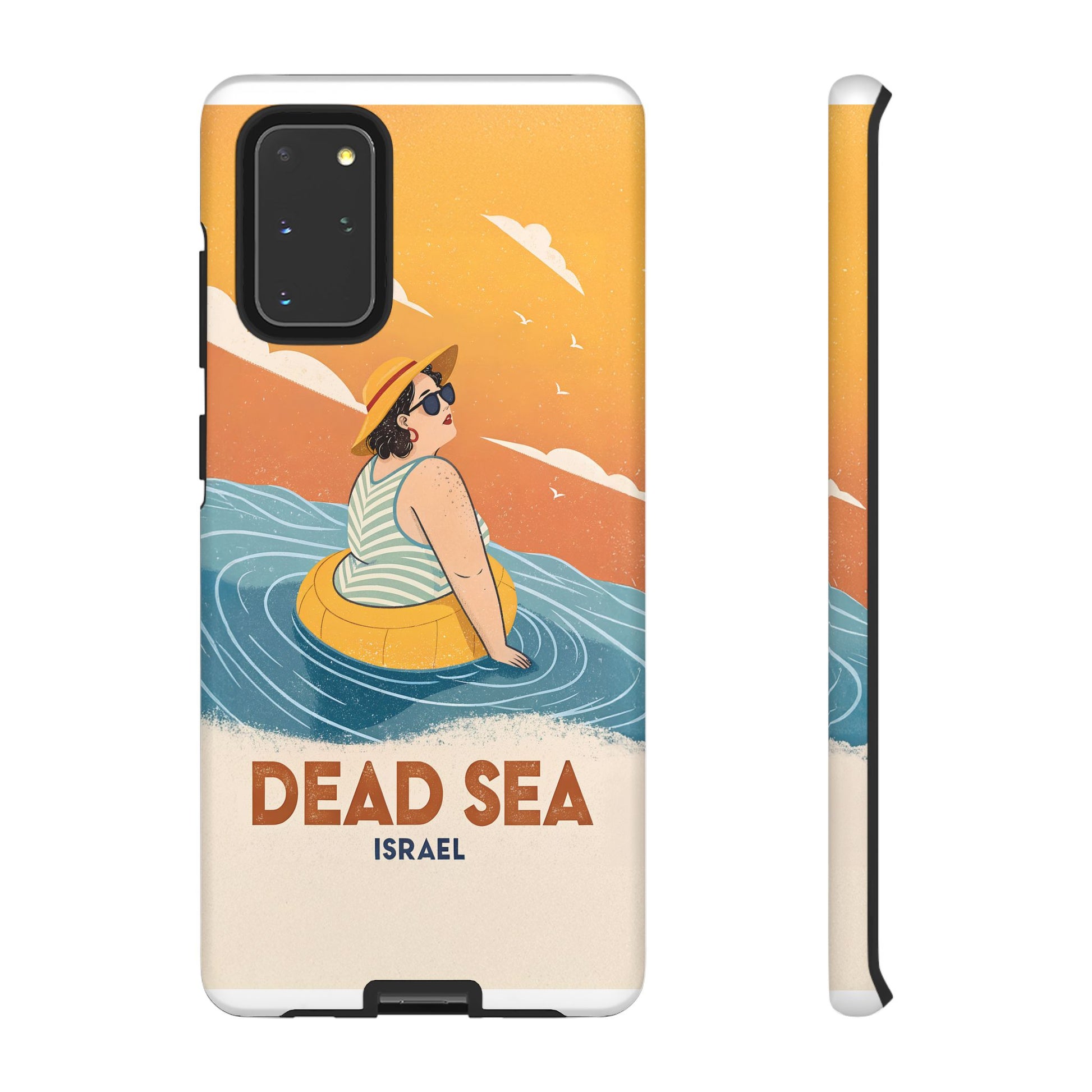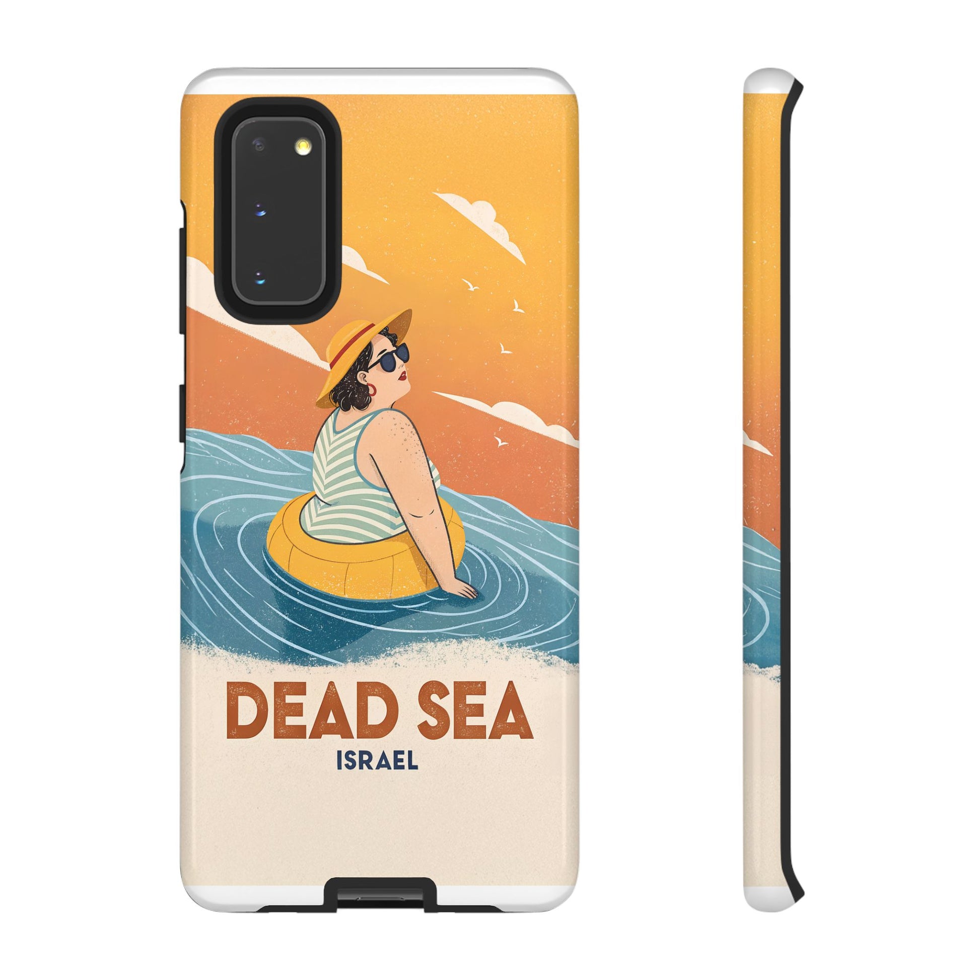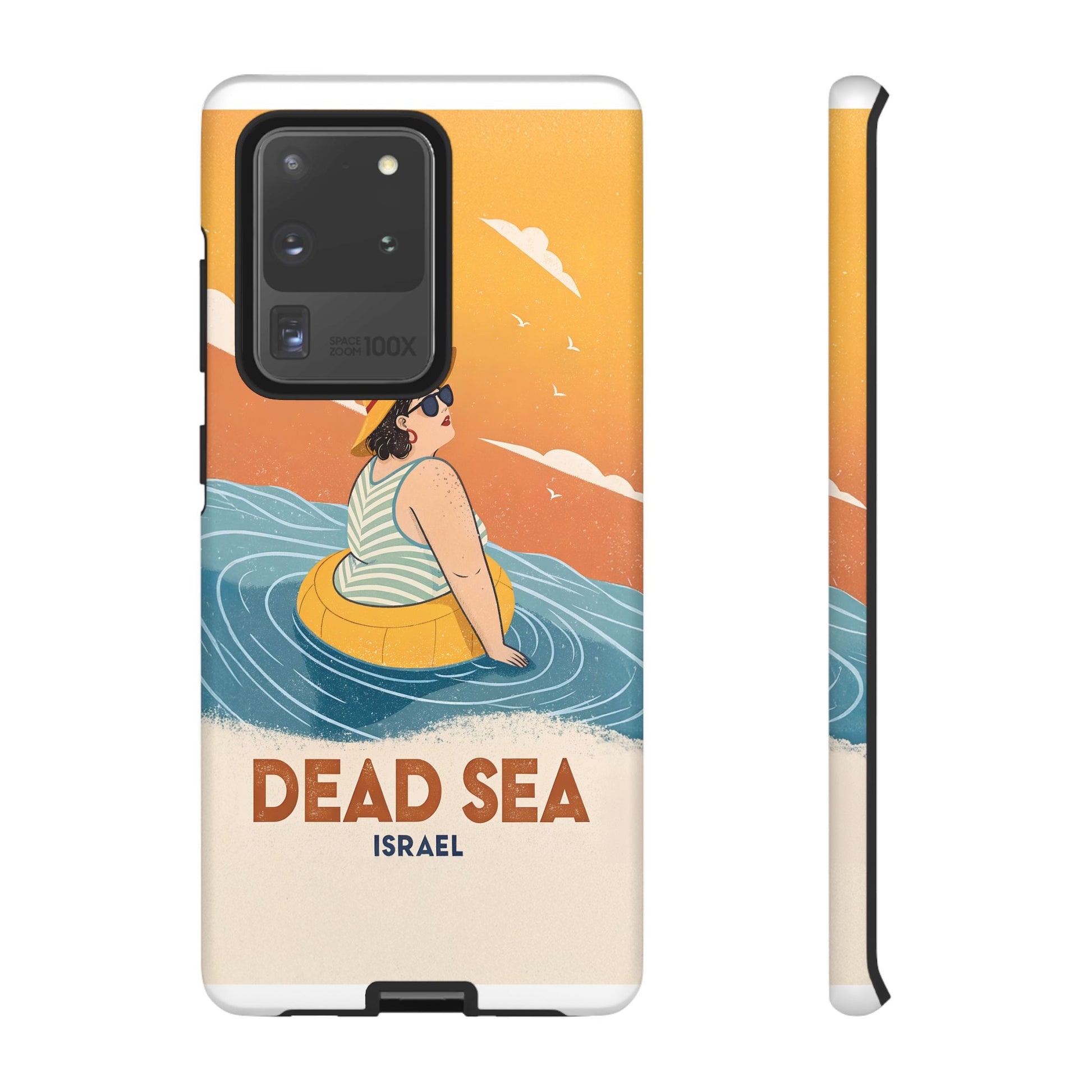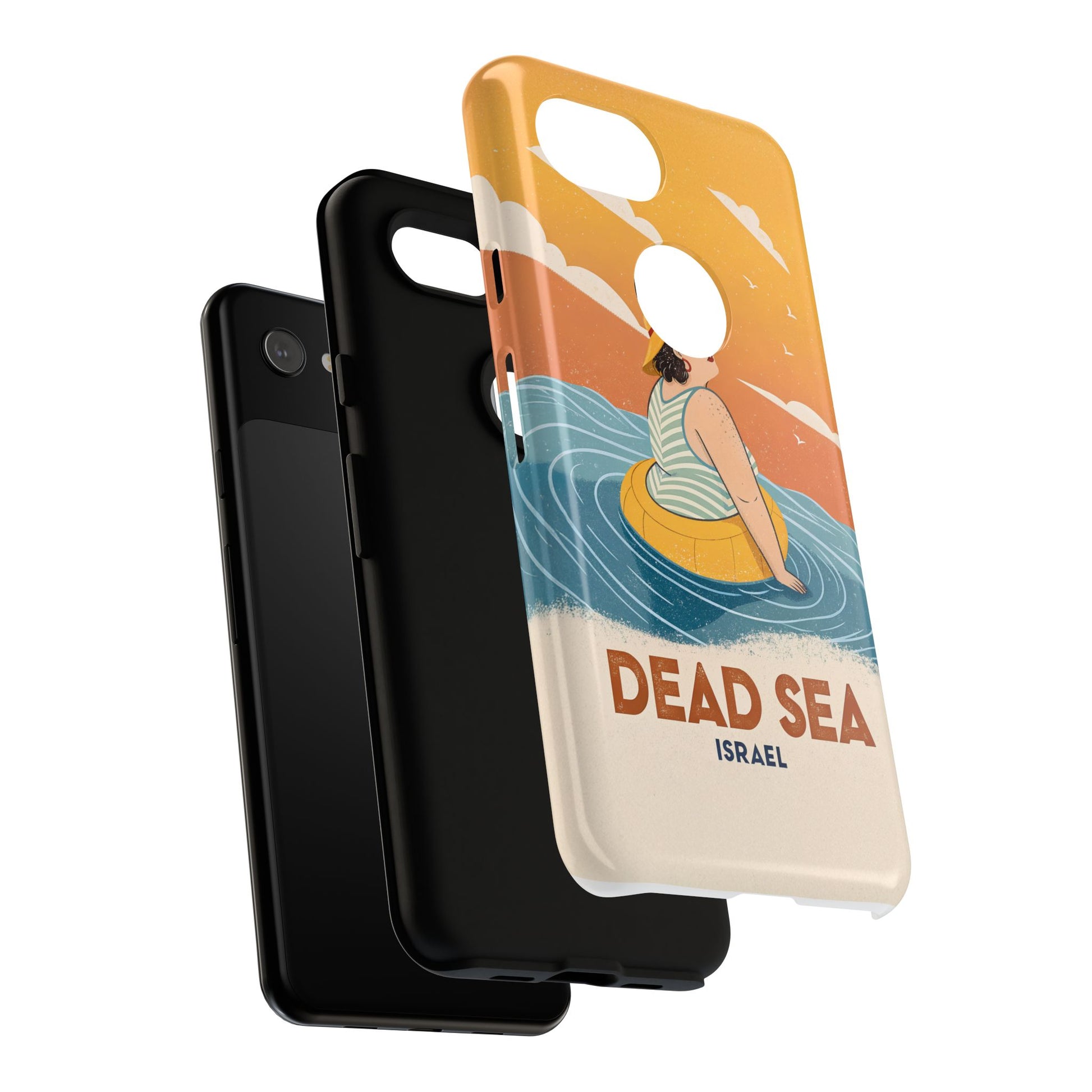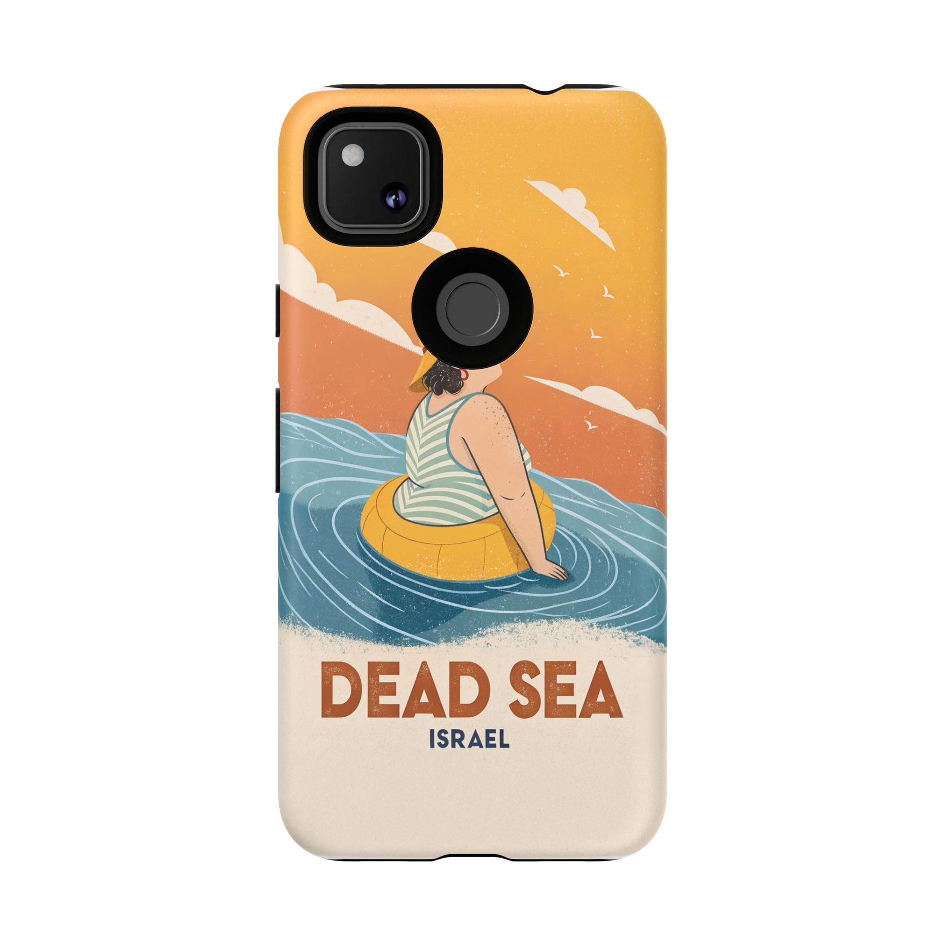 Ta med deg roen, magien og humoren fra Dødehavet med dette flotte retro-inspirerte mobildekselet. Designet viser en avslappet kvinne som flyter på det mineralrike vannet, omringet av myke blå bølger og en varm oransje himmel. Det kunstneriske uttrykket kombinerer vintage feriestemning med den ikoniske opplevelsen av å sveve uten anstrengelse på verdens salteste sjø.