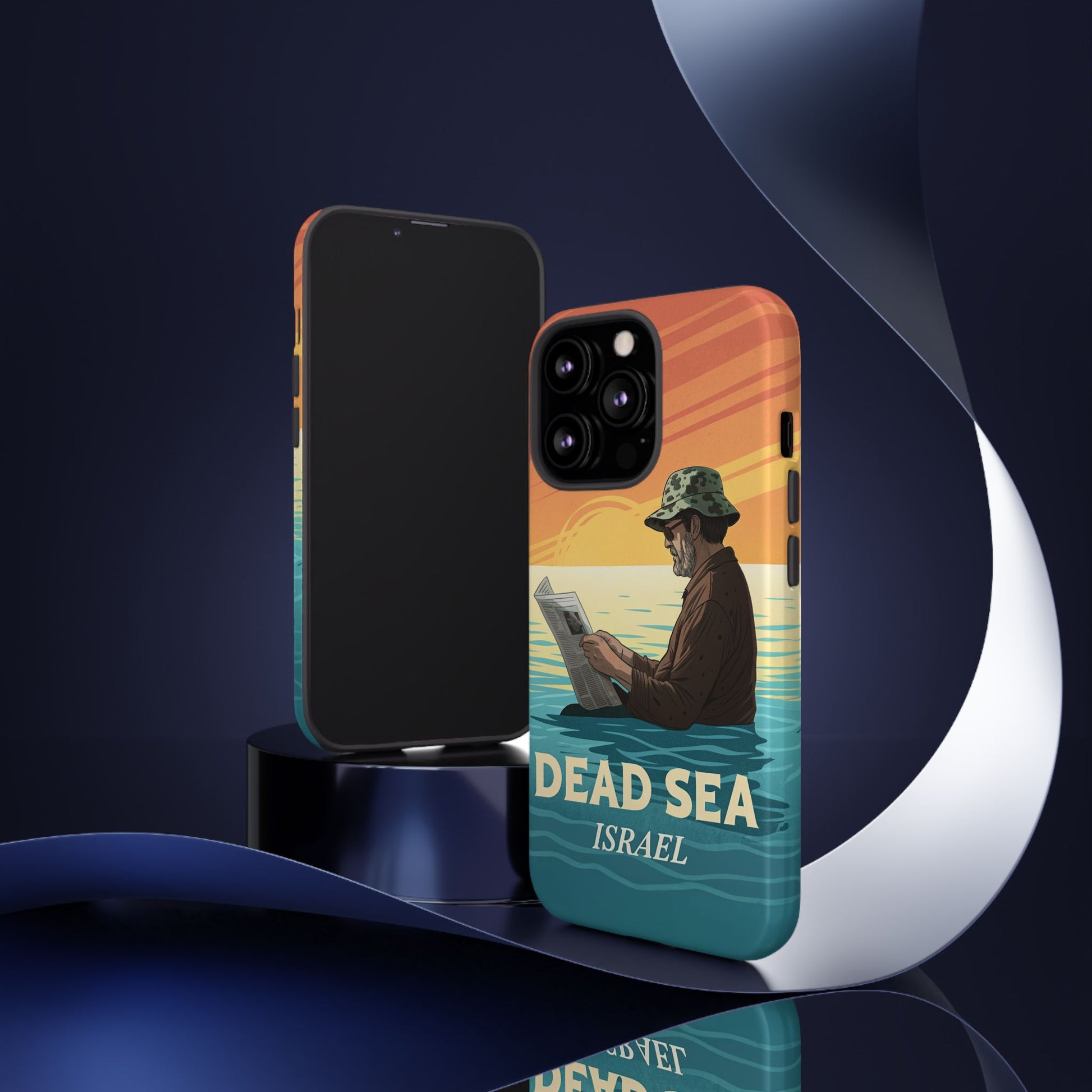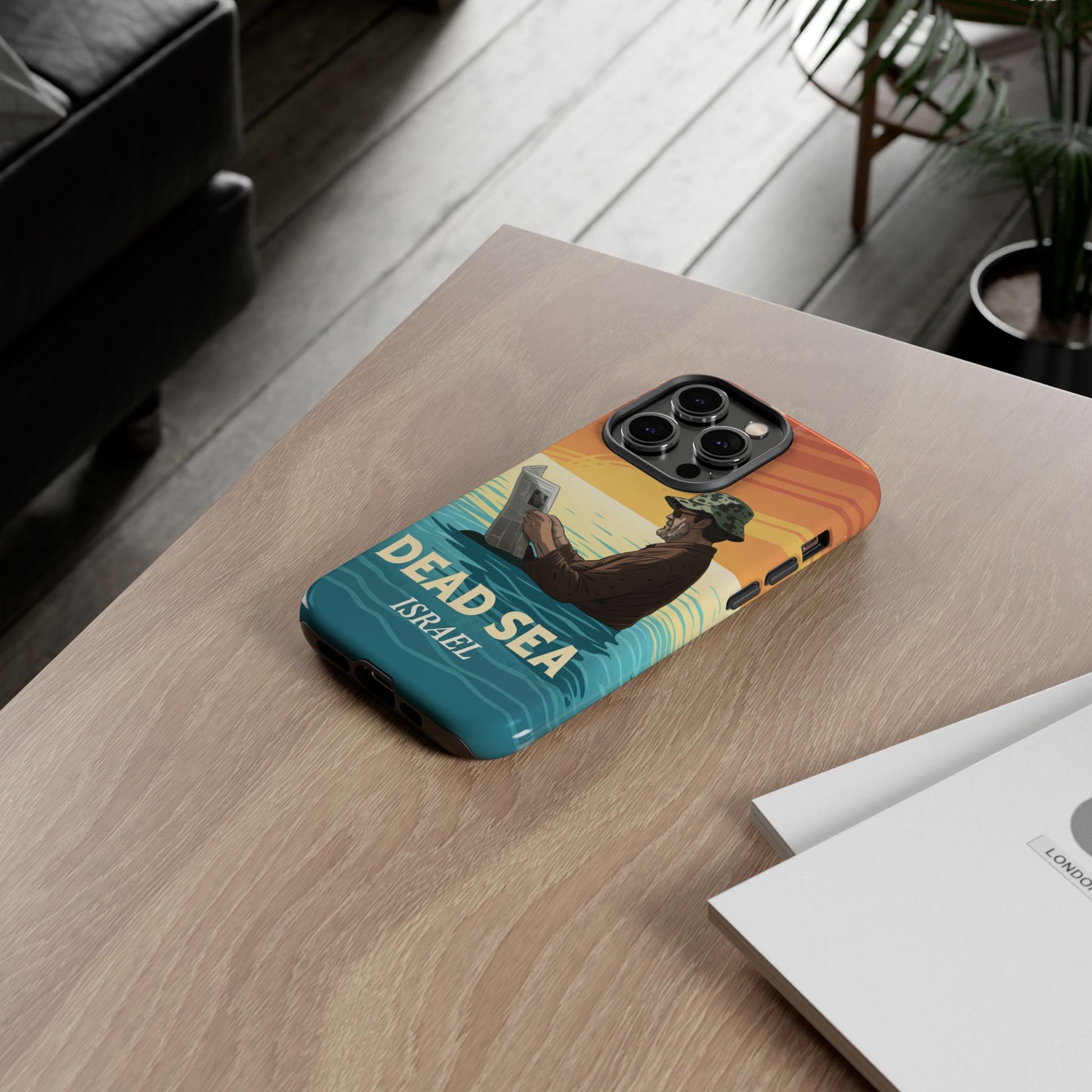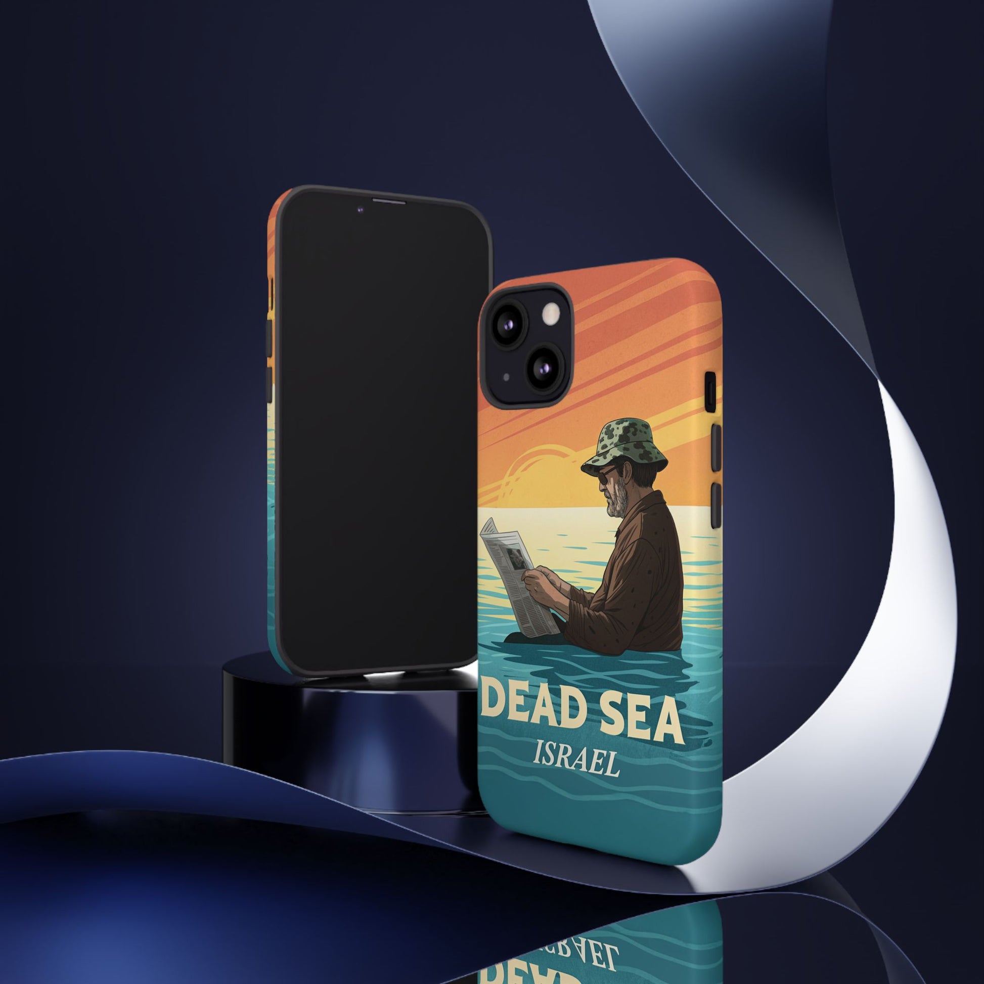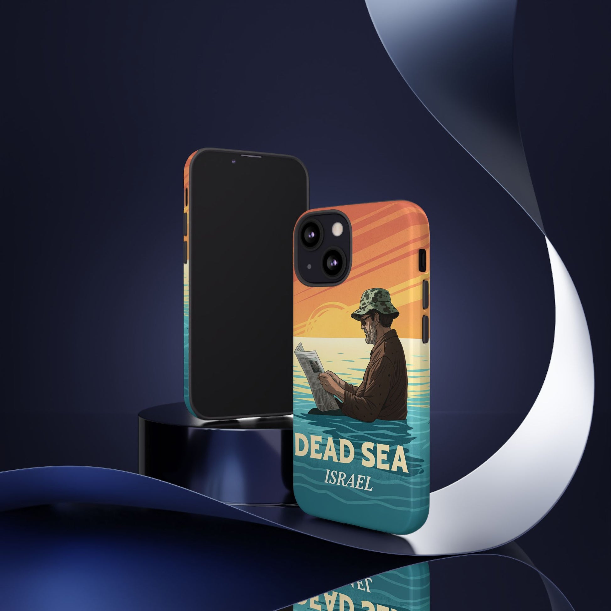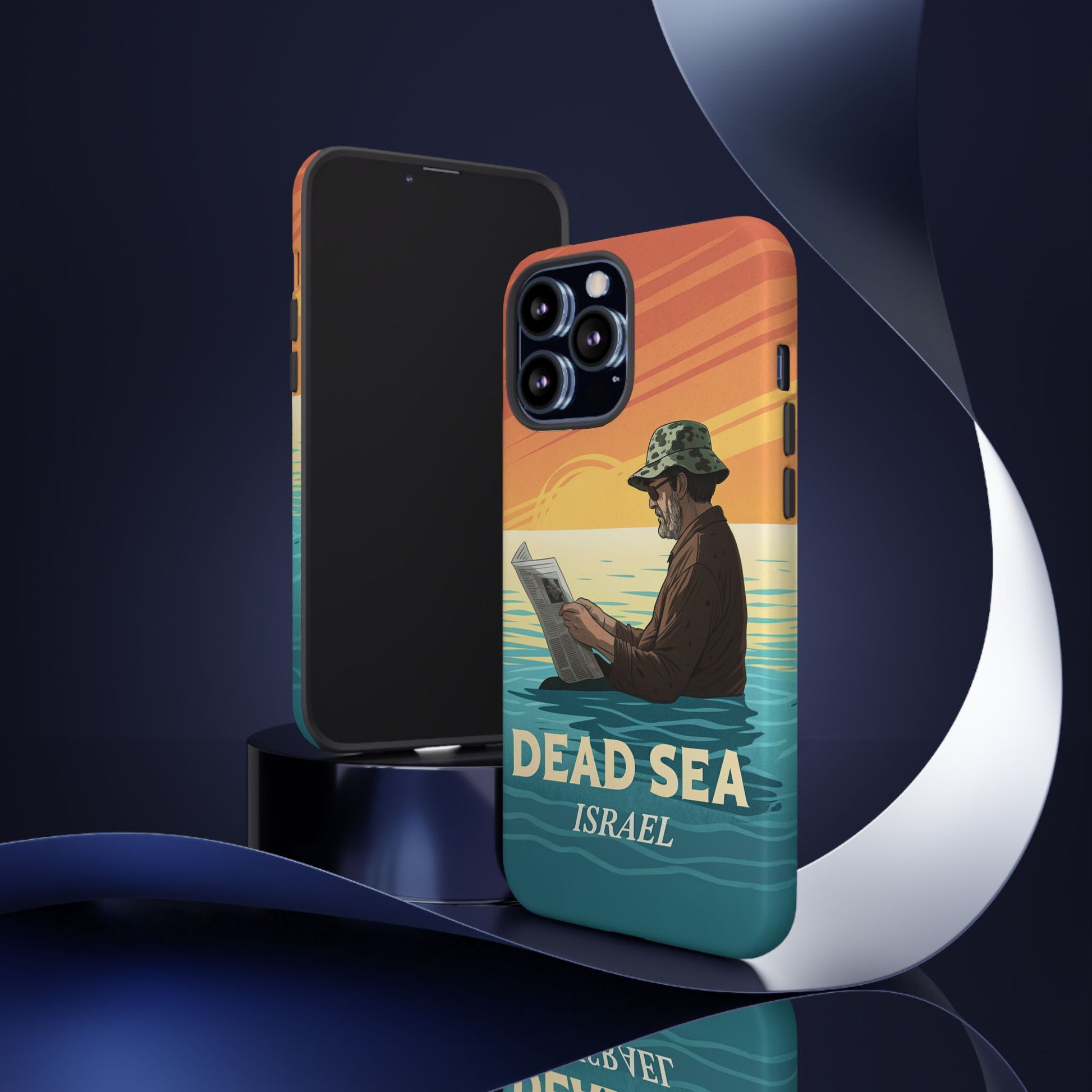 Ta med deg den rolige og ikoniske stemningen fra Dødehavet med dette kunstneriske mobildekselet. Designet viser en mann som sitter avslappet i det mineralrike vannet mens han leser avis – helt vektløs slik bare Dødehavet kan tilby. Den varme himmelen i oransje og gyldne toner gir motivet en vakker solnedgangsfølelse, mens de rolige blå bølgene skaper en perfekt kontrast. Et motiv som kombinerer humor, ro og tidløs reiselivssjarm fra Israel.