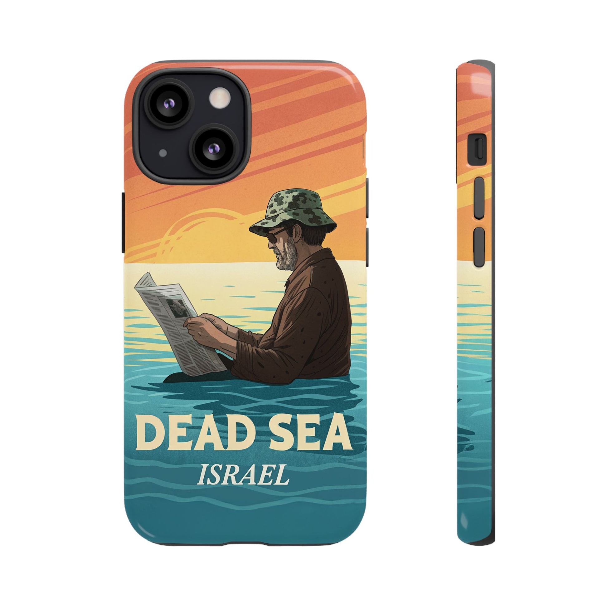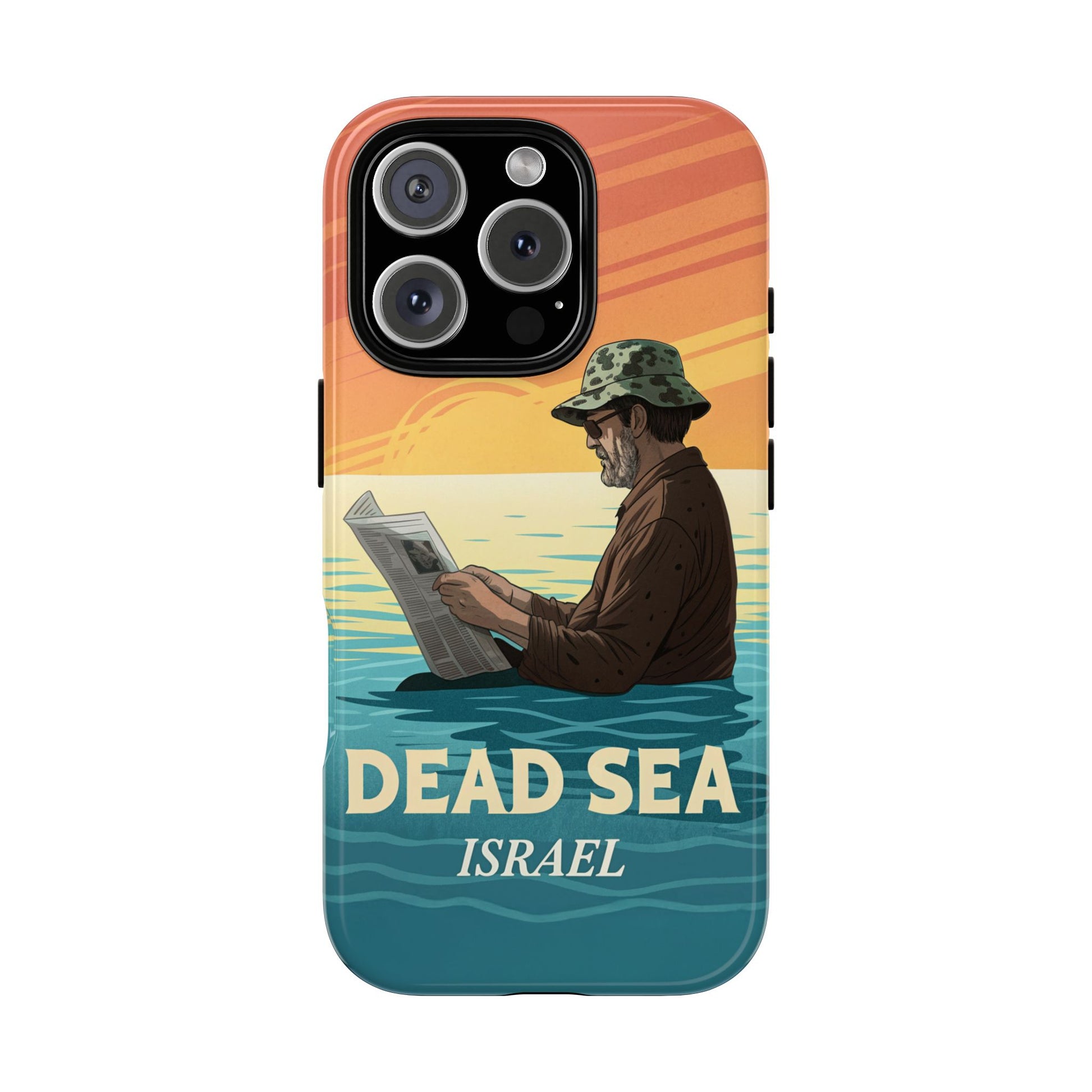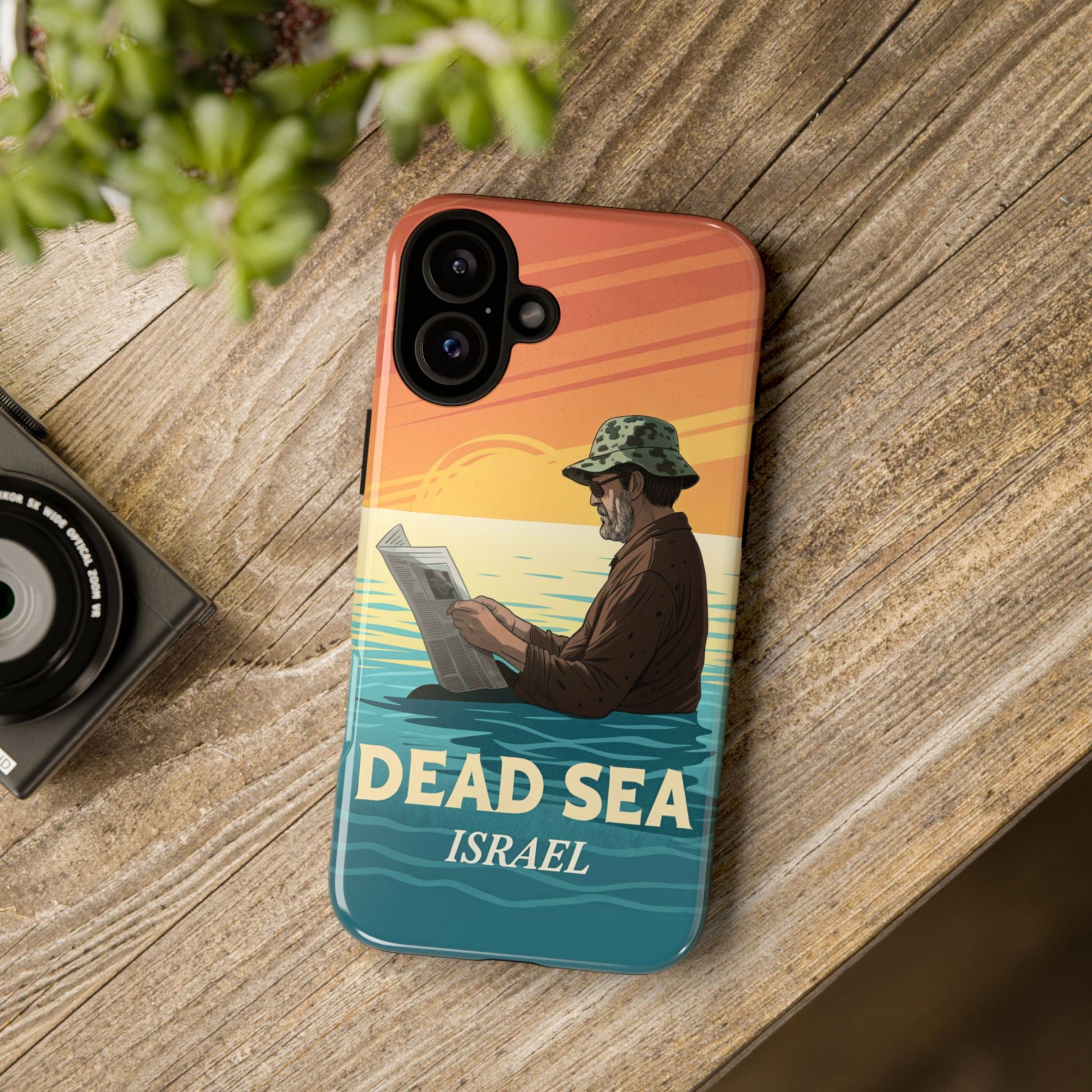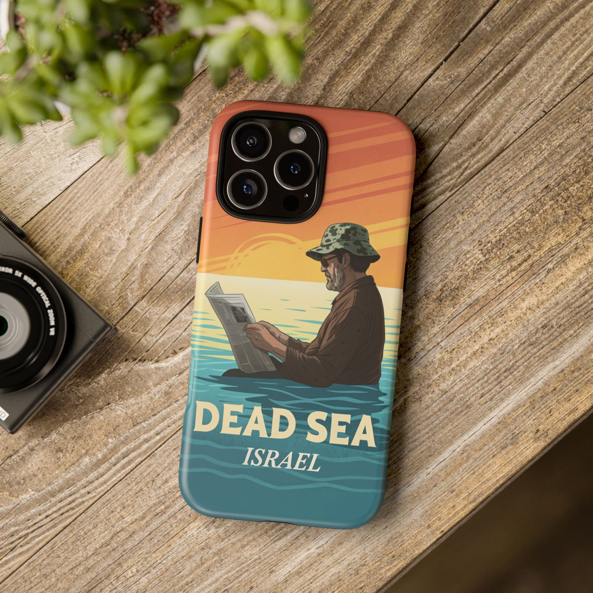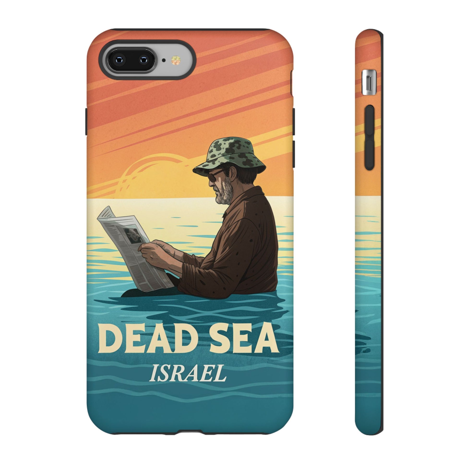 Ta med deg den rolige og ikoniske stemningen fra Dødehavet med dette kunstneriske mobildekselet. Designet viser en mann som sitter avslappet i det mineralrike vannet mens han leser avis – helt vektløs slik bare Dødehavet kan tilby. Den varme himmelen i oransje og gyldne toner gir motivet en vakker solnedgangsfølelse, mens de rolige blå bølgene skaper en perfekt kontrast. Et motiv som kombinerer humor, ro og tidløs reiselivssjarm fra Israel.