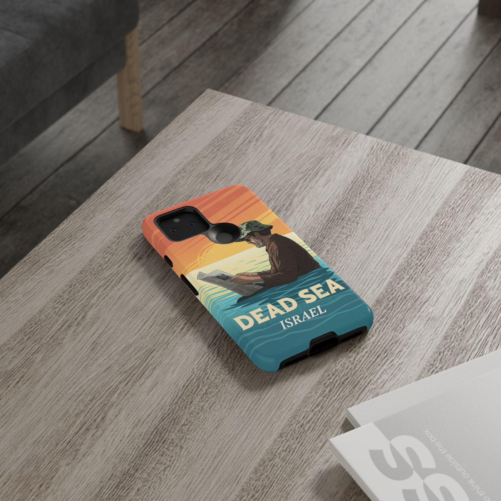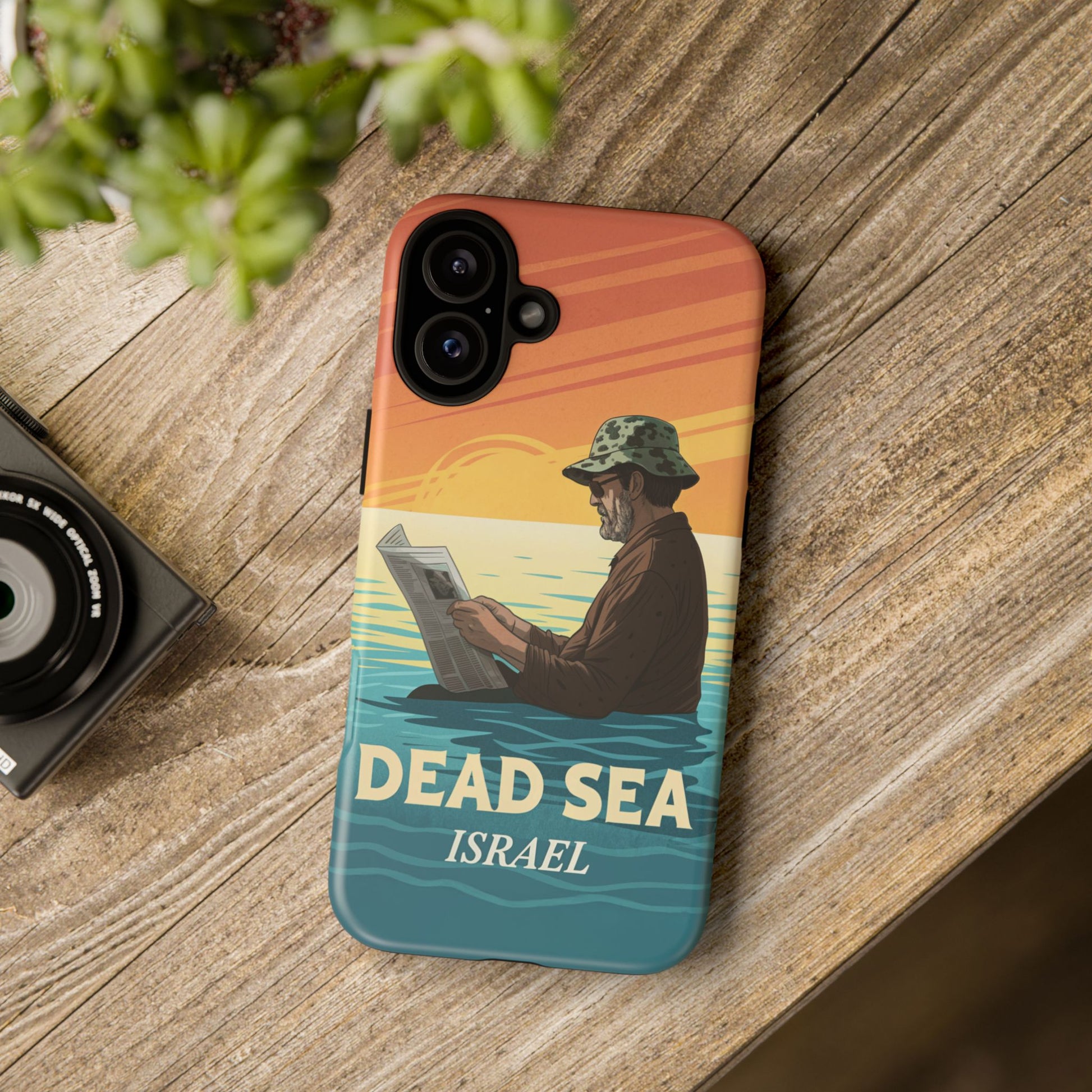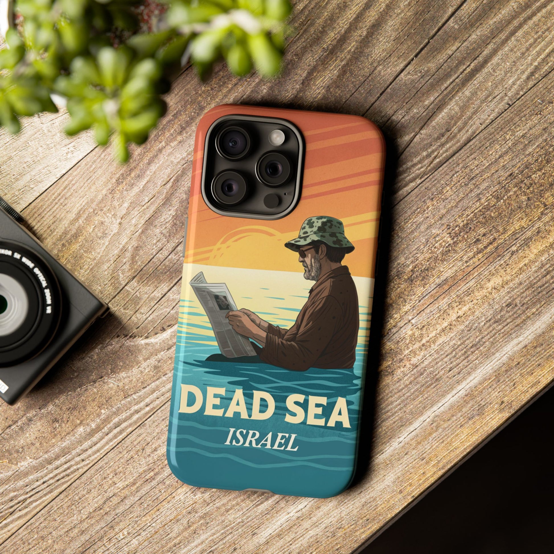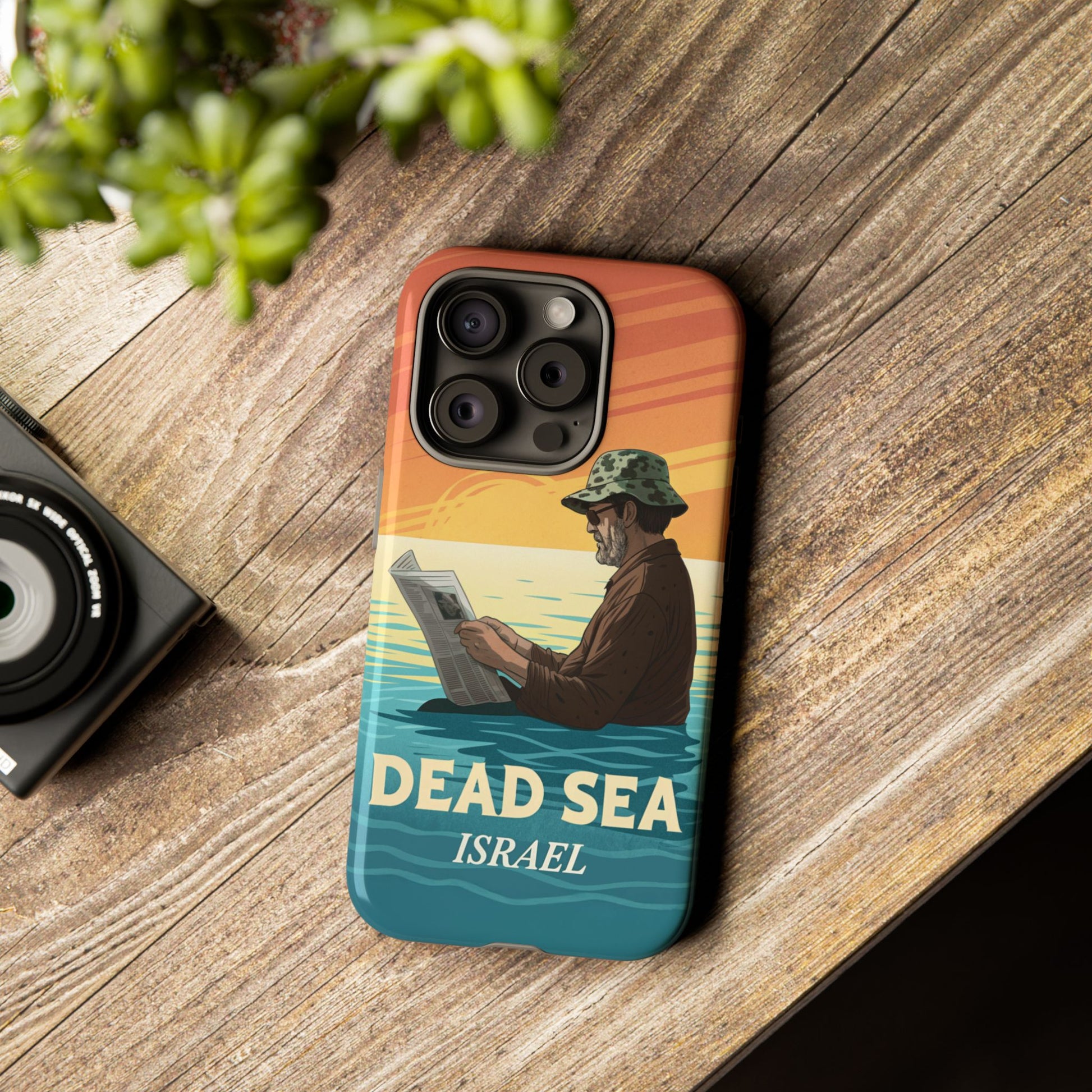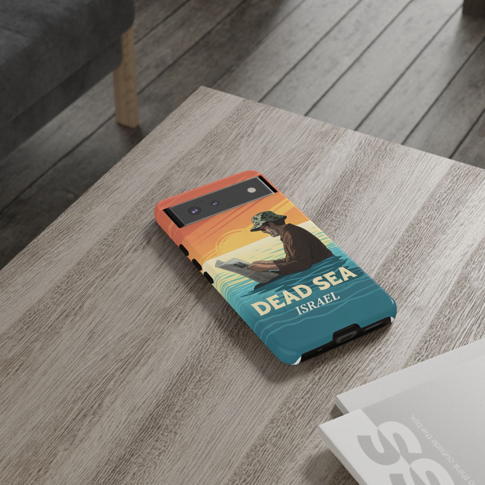 Ta med deg den rolige og ikoniske stemningen fra Dødehavet med dette kunstneriske mobildekselet. Designet viser en mann som sitter avslappet i det mineralrike vannet mens han leser avis – helt vektløs slik bare Dødehavet kan tilby. Den varme himmelen i oransje og gyldne toner gir motivet en vakker solnedgangsfølelse, mens de rolige blå bølgene skaper en perfekt kontrast. Et motiv som kombinerer humor, ro og tidløs reiselivssjarm fra Israel.