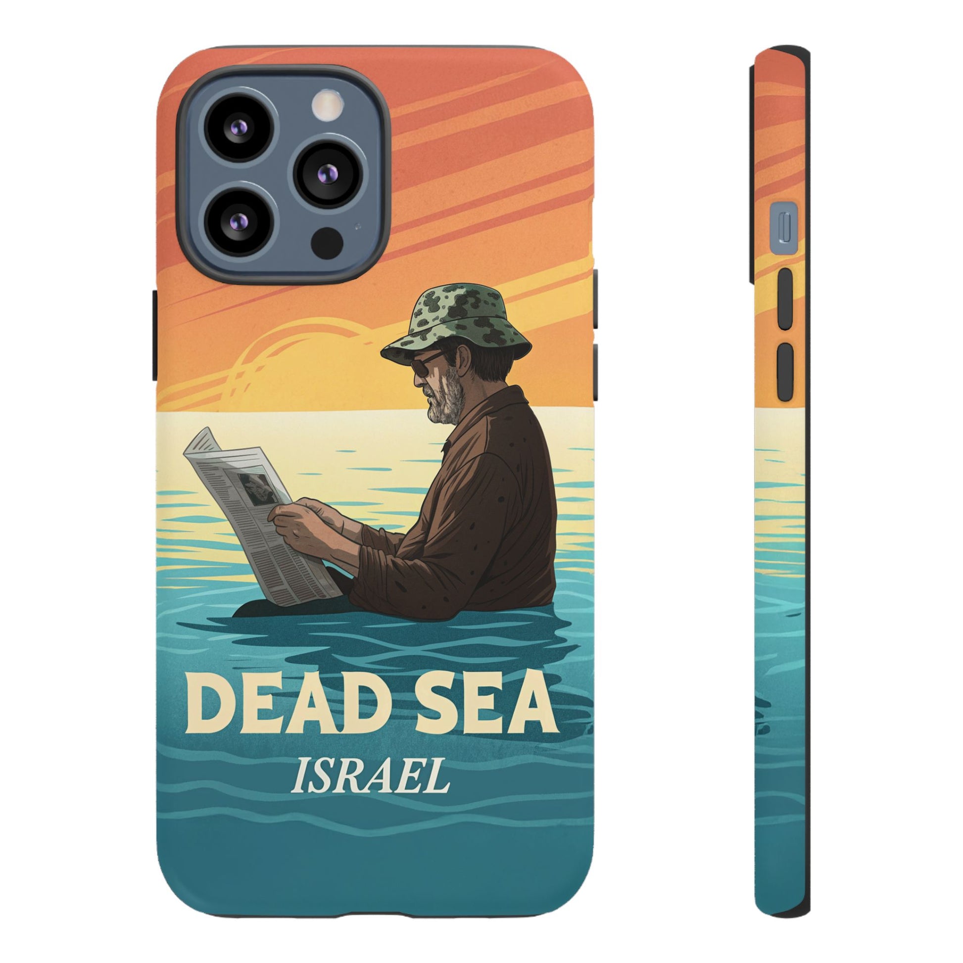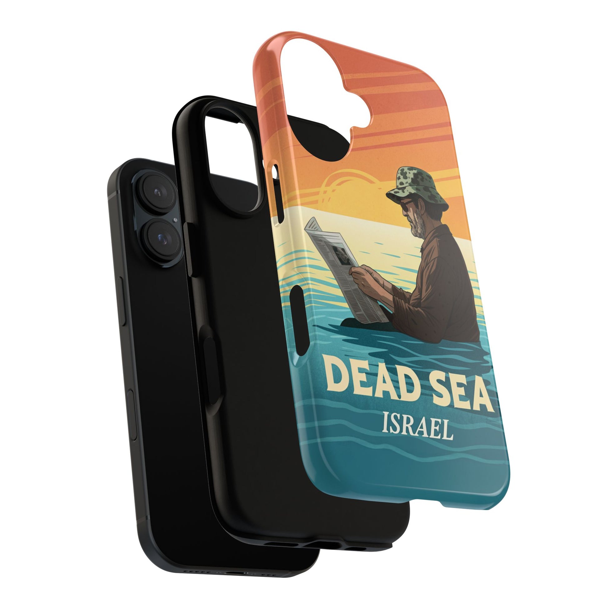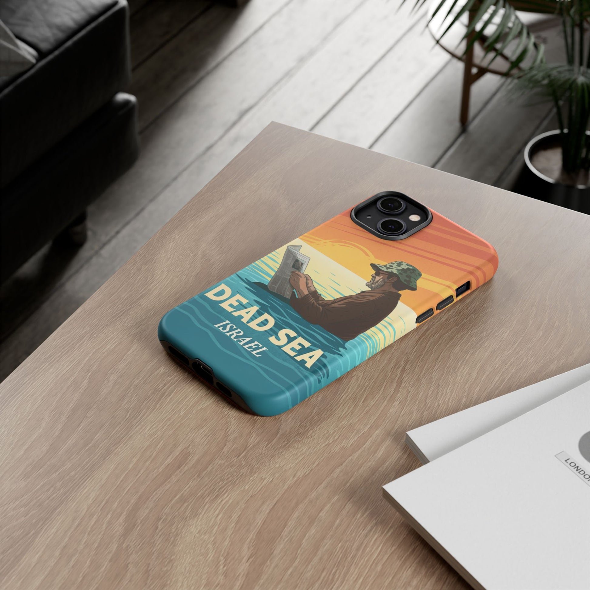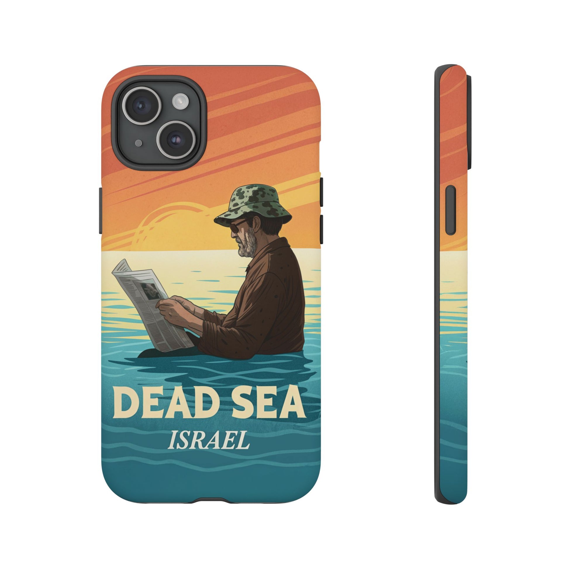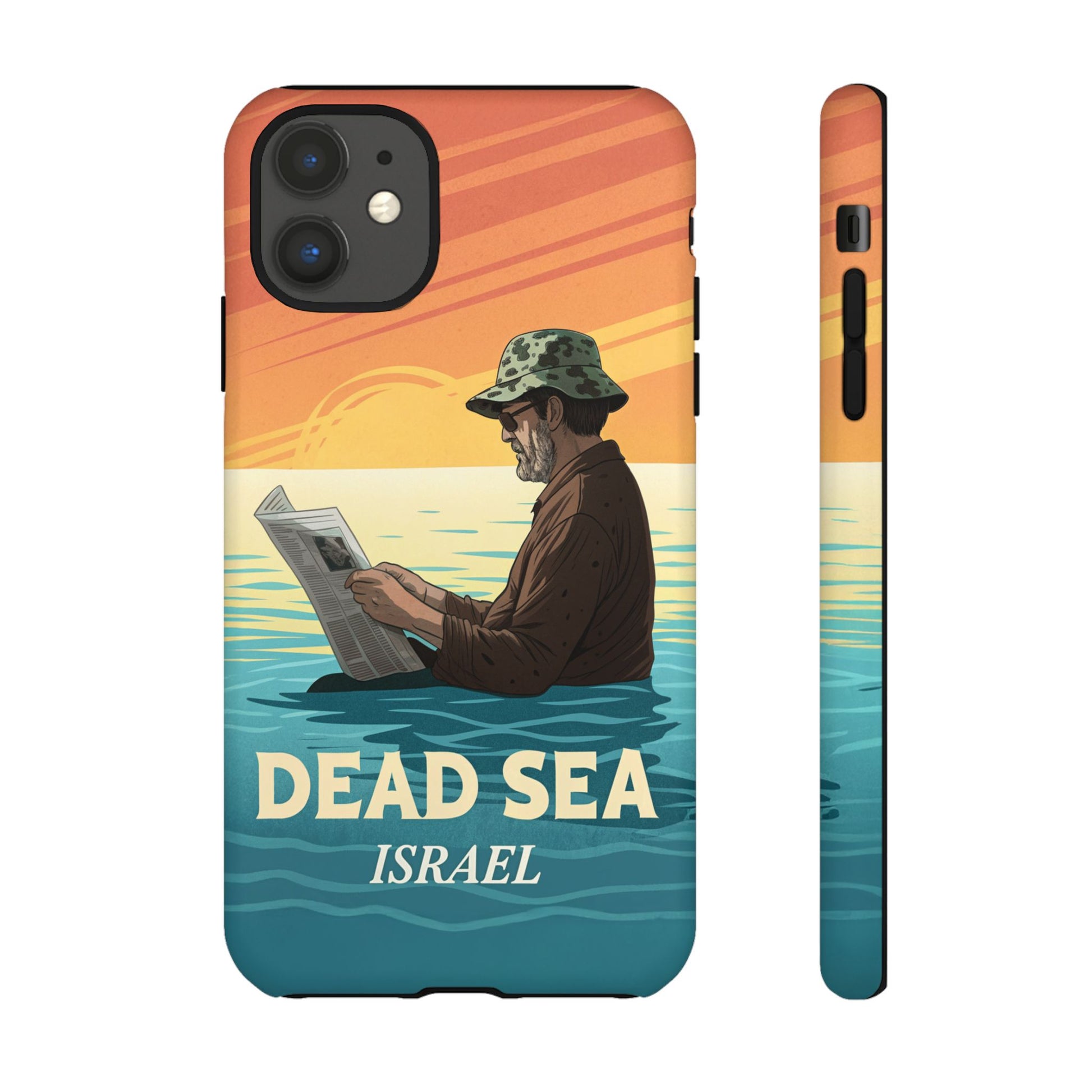 Ta med deg den rolige og ikoniske stemningen fra Dødehavet med dette kunstneriske mobildekselet. Designet viser en mann som sitter avslappet i det mineralrike vannet mens han leser avis – helt vektløs slik bare Dødehavet kan tilby. Den varme himmelen i oransje og gyldne toner gir motivet en vakker solnedgangsfølelse, mens de rolige blå bølgene skaper en perfekt kontrast. Et motiv som kombinerer humor, ro og tidløs reiselivssjarm fra Israel.