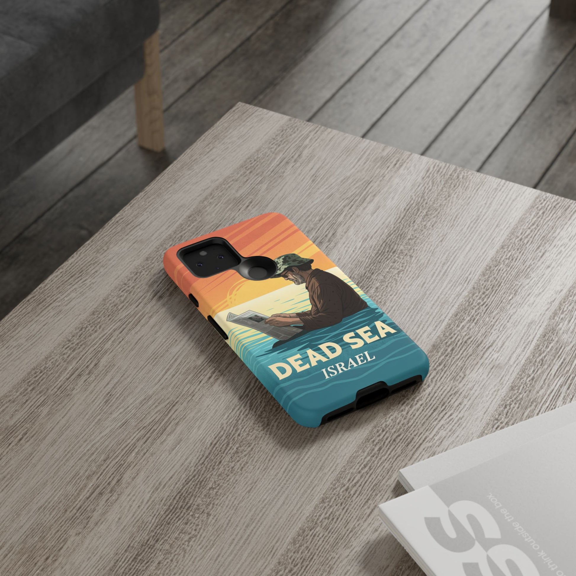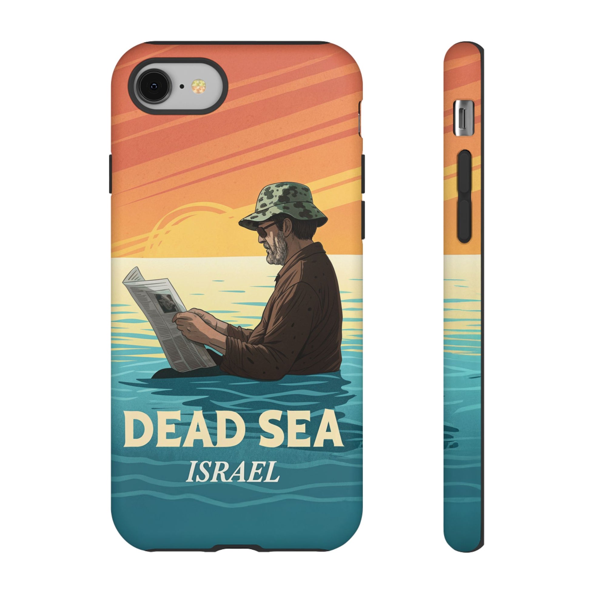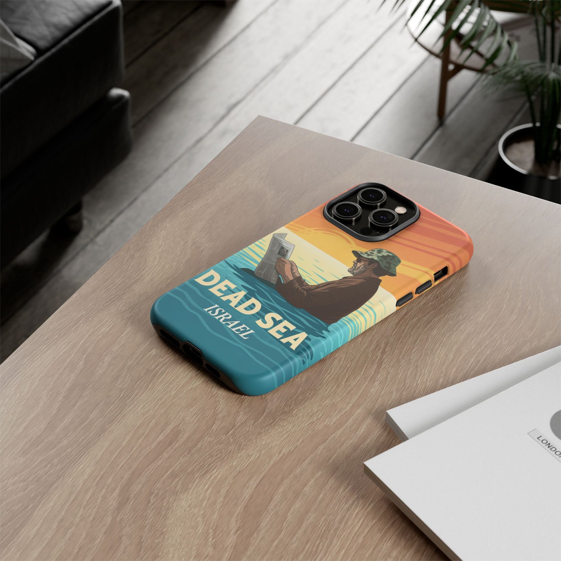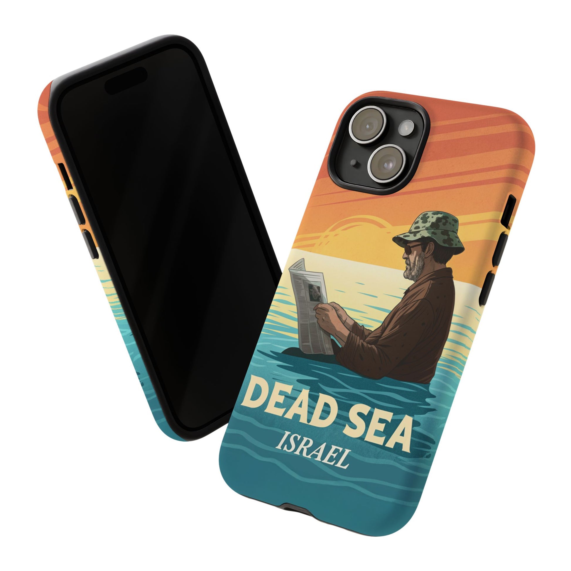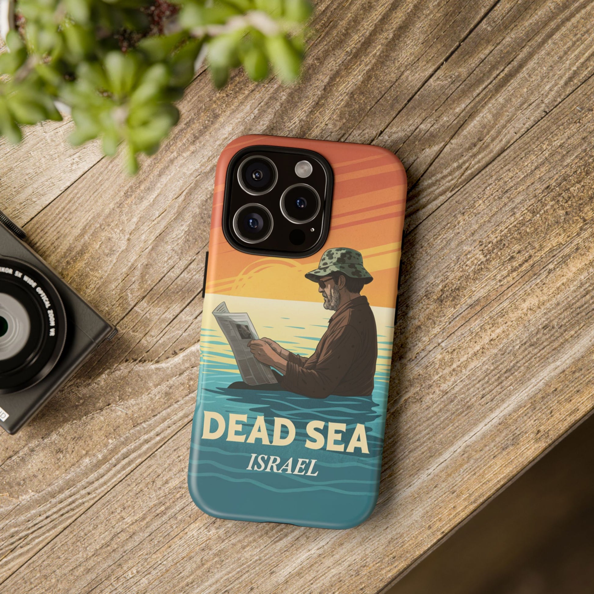 Ta med deg den rolige og ikoniske stemningen fra Dødehavet med dette kunstneriske mobildekselet. Designet viser en mann som sitter avslappet i det mineralrike vannet mens han leser avis – helt vektløs slik bare Dødehavet kan tilby. Den varme himmelen i oransje og gyldne toner gir motivet en vakker solnedgangsfølelse, mens de rolige blå bølgene skaper en perfekt kontrast. Et motiv som kombinerer humor, ro og tidløs reiselivssjarm fra Israel.