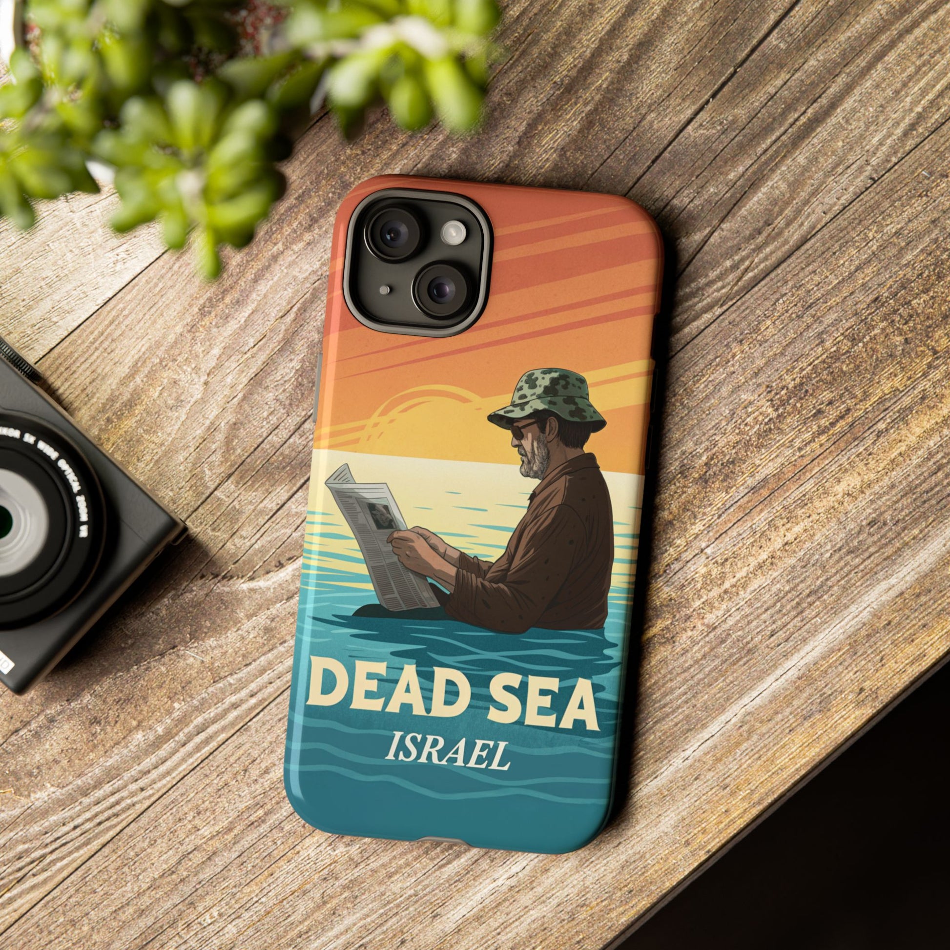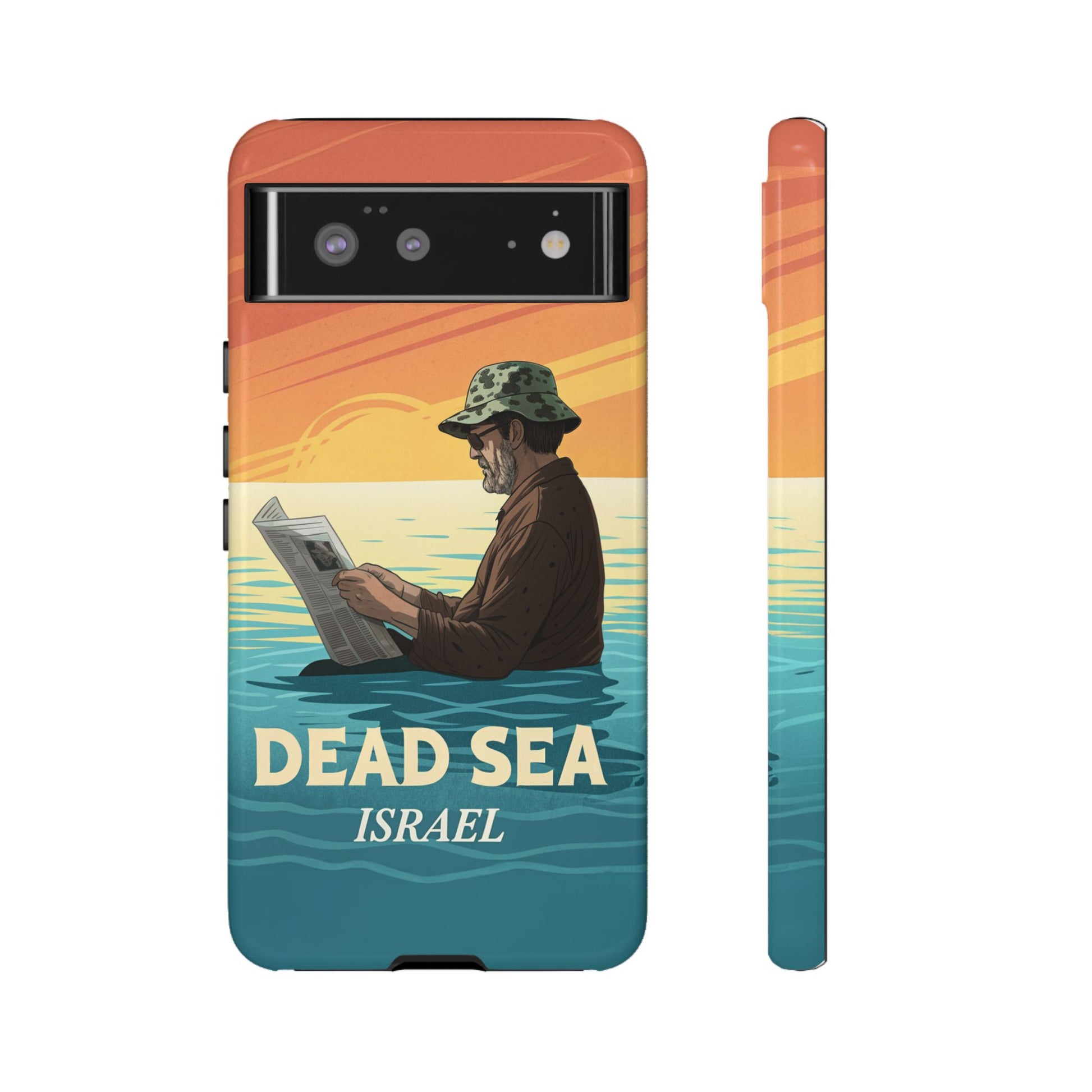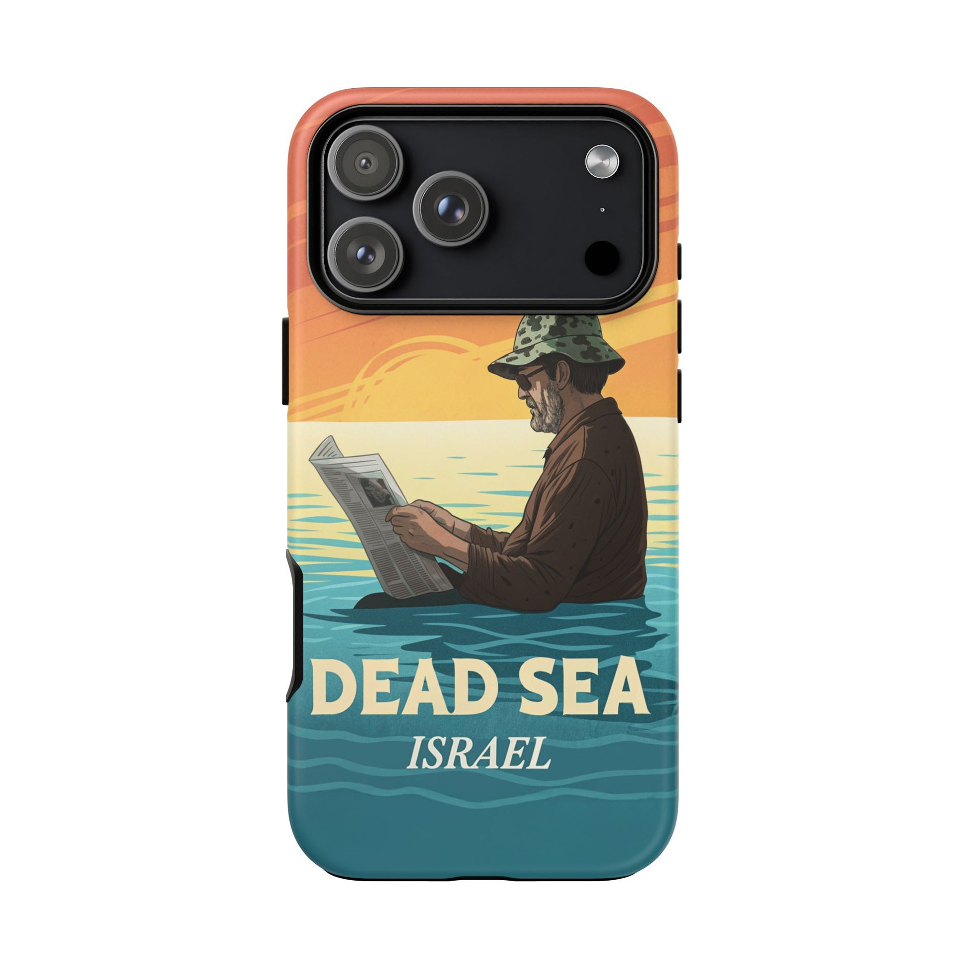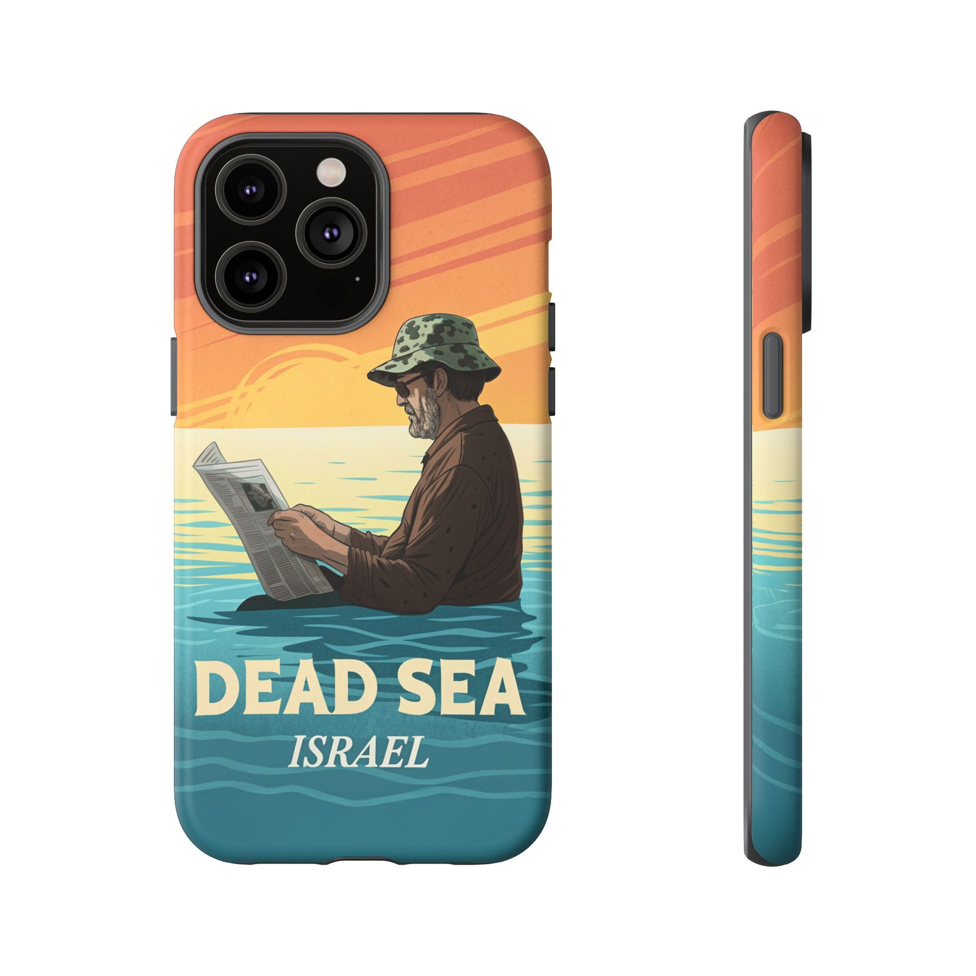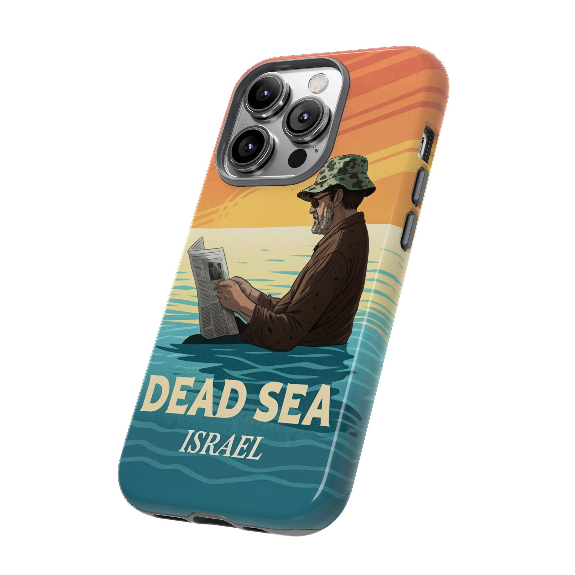 Ta med deg den rolige og ikoniske stemningen fra Dødehavet med dette kunstneriske mobildekselet. Designet viser en mann som sitter avslappet i det mineralrike vannet mens han leser avis – helt vektløs slik bare Dødehavet kan tilby. Den varme himmelen i oransje og gyldne toner gir motivet en vakker solnedgangsfølelse, mens de rolige blå bølgene skaper en perfekt kontrast. Et motiv som kombinerer humor, ro og tidløs reiselivssjarm fra Israel.
