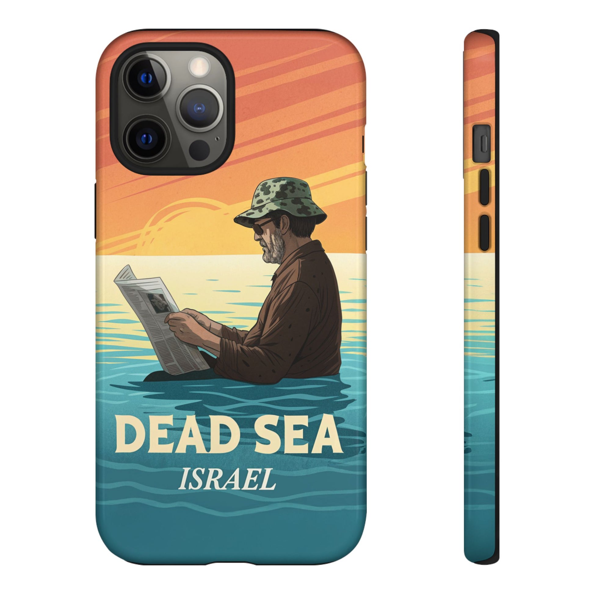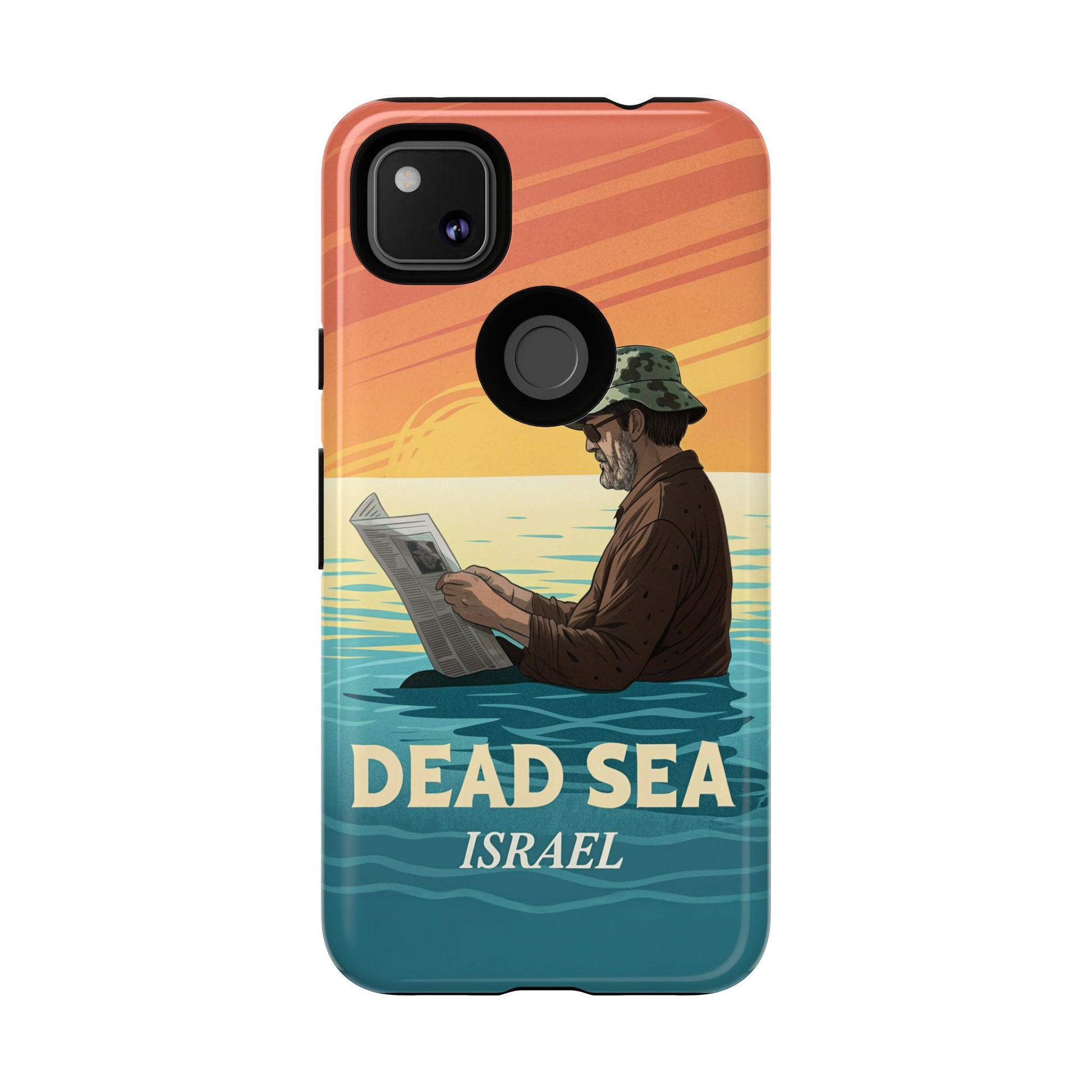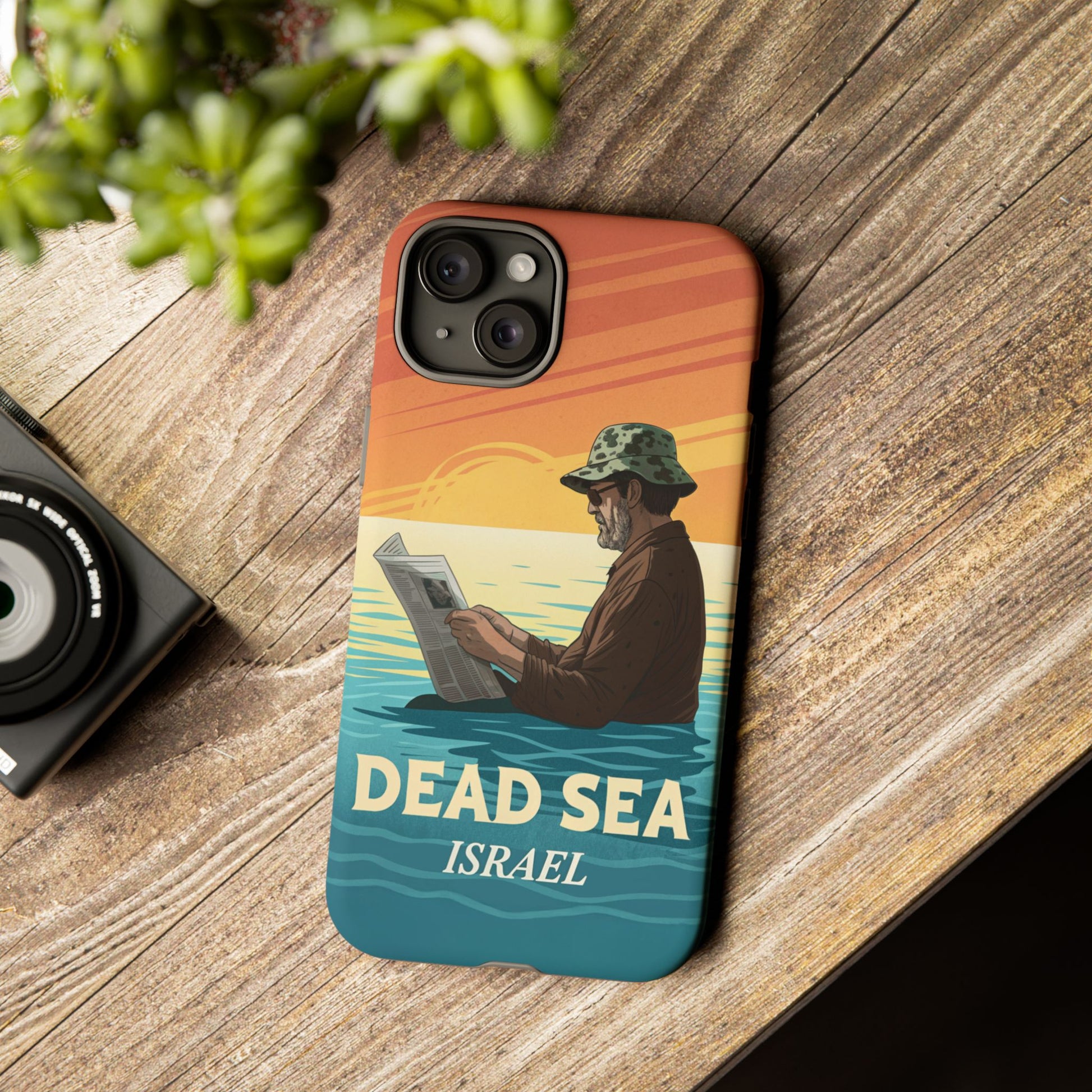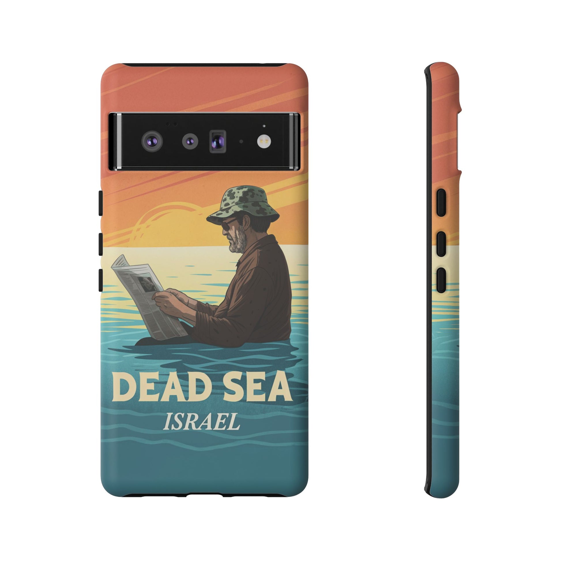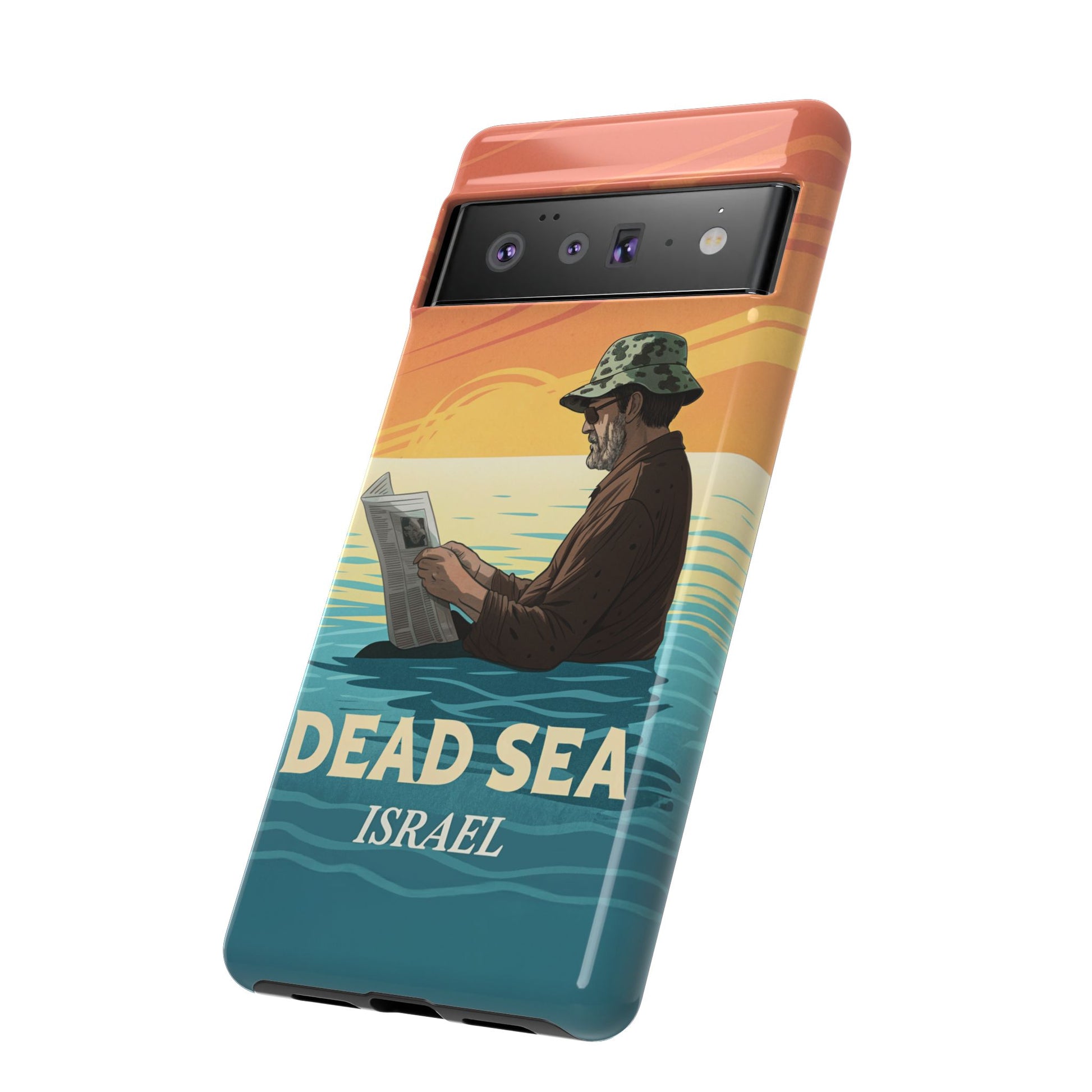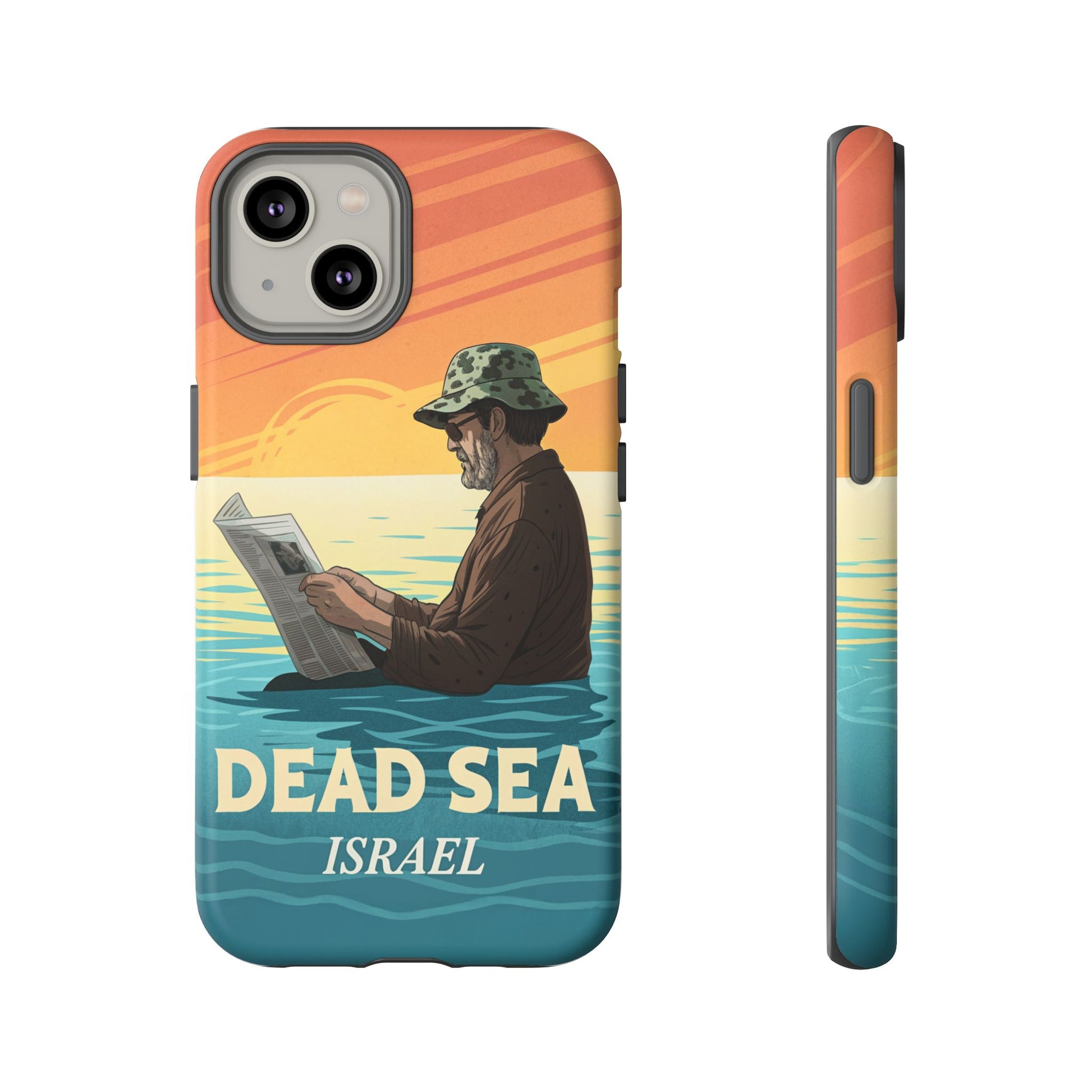 Ta med deg den rolige og ikoniske stemningen fra Dødehavet med dette kunstneriske mobildekselet. Designet viser en mann som sitter avslappet i det mineralrike vannet mens han leser avis – helt vektløs slik bare Dødehavet kan tilby. Den varme himmelen i oransje og gyldne toner gir motivet en vakker solnedgangsfølelse, mens de rolige blå bølgene skaper en perfekt kontrast. Et motiv som kombinerer humor, ro og tidløs reiselivssjarm fra Israel.