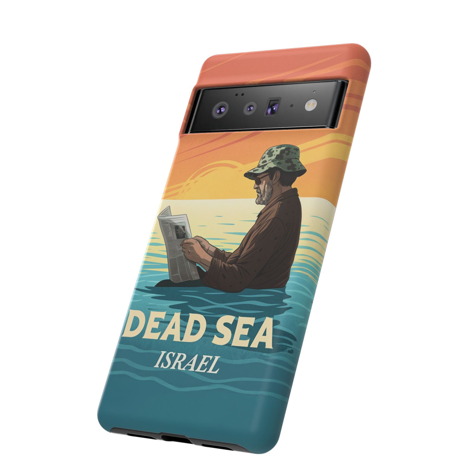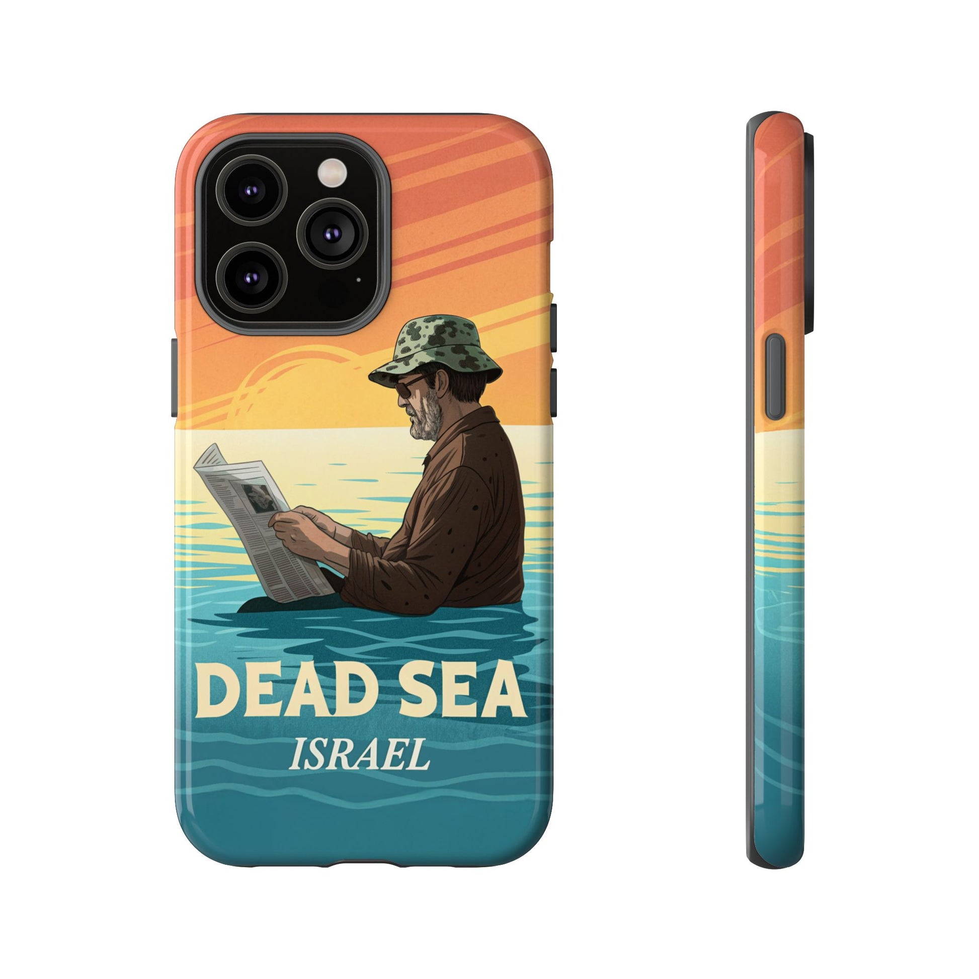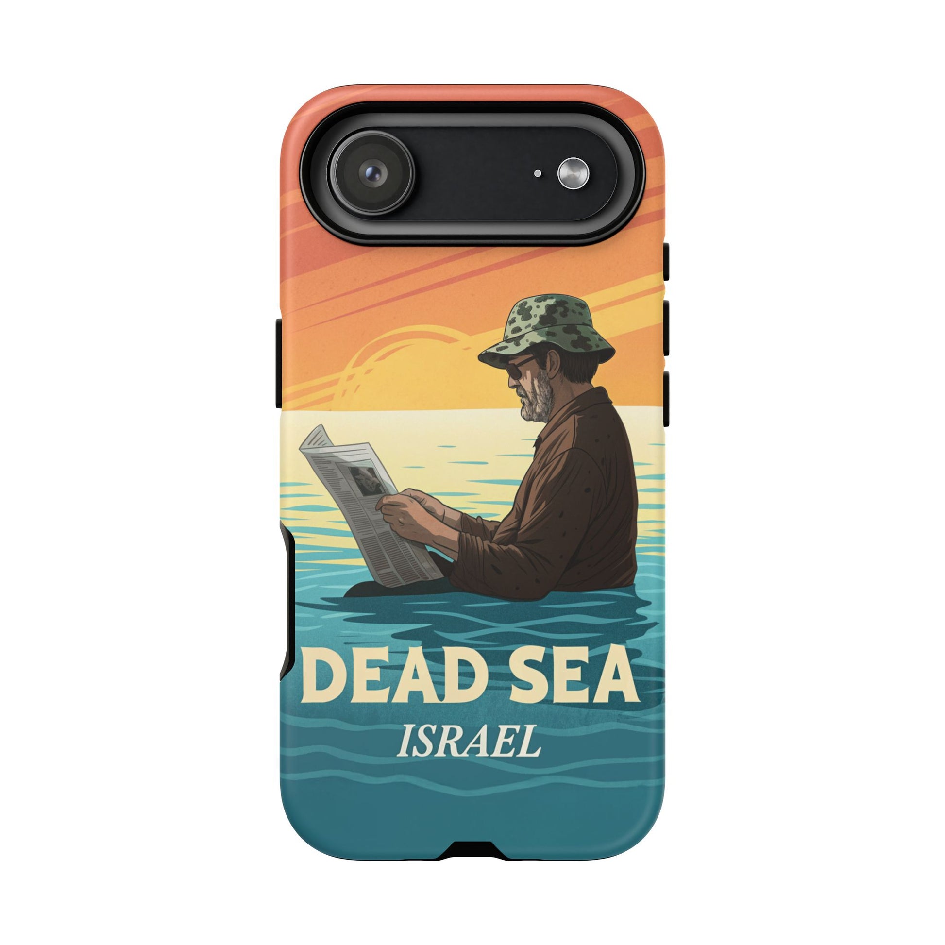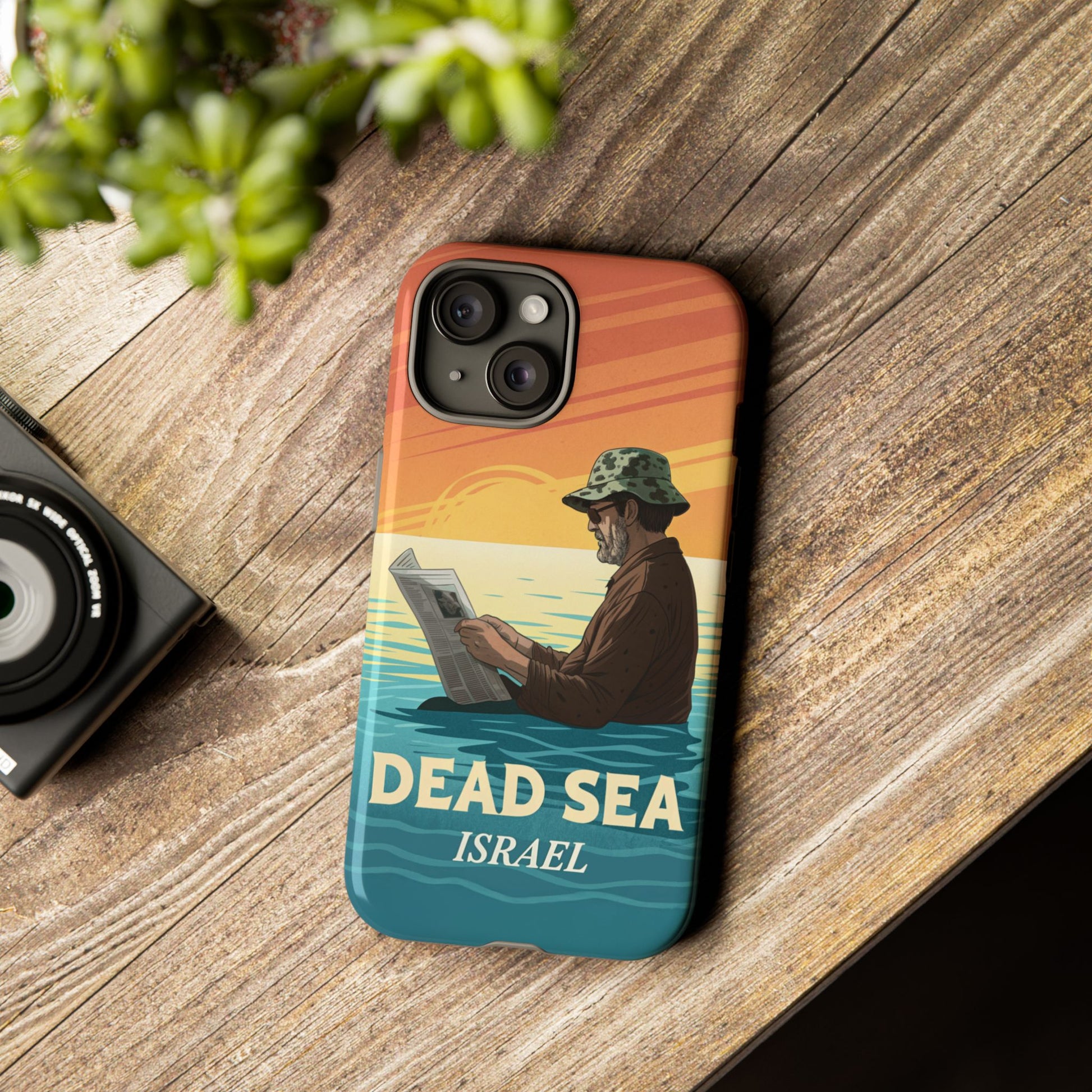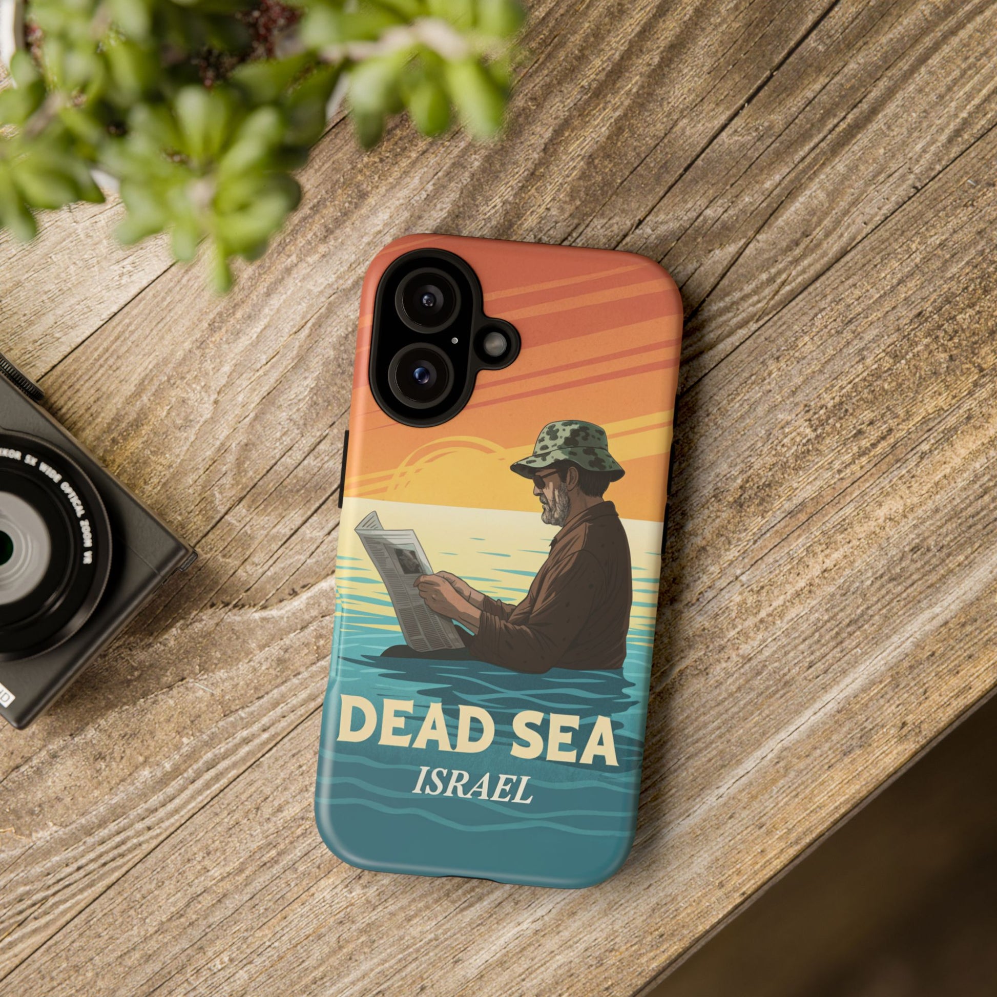 Ta med deg den rolige og ikoniske stemningen fra Dødehavet med dette kunstneriske mobildekselet. Designet viser en mann som sitter avslappet i det mineralrike vannet mens han leser avis – helt vektløs slik bare Dødehavet kan tilby. Den varme himmelen i oransje og gyldne toner gir motivet en vakker solnedgangsfølelse, mens de rolige blå bølgene skaper en perfekt kontrast. Et motiv som kombinerer humor, ro og tidløs reiselivssjarm fra Israel.