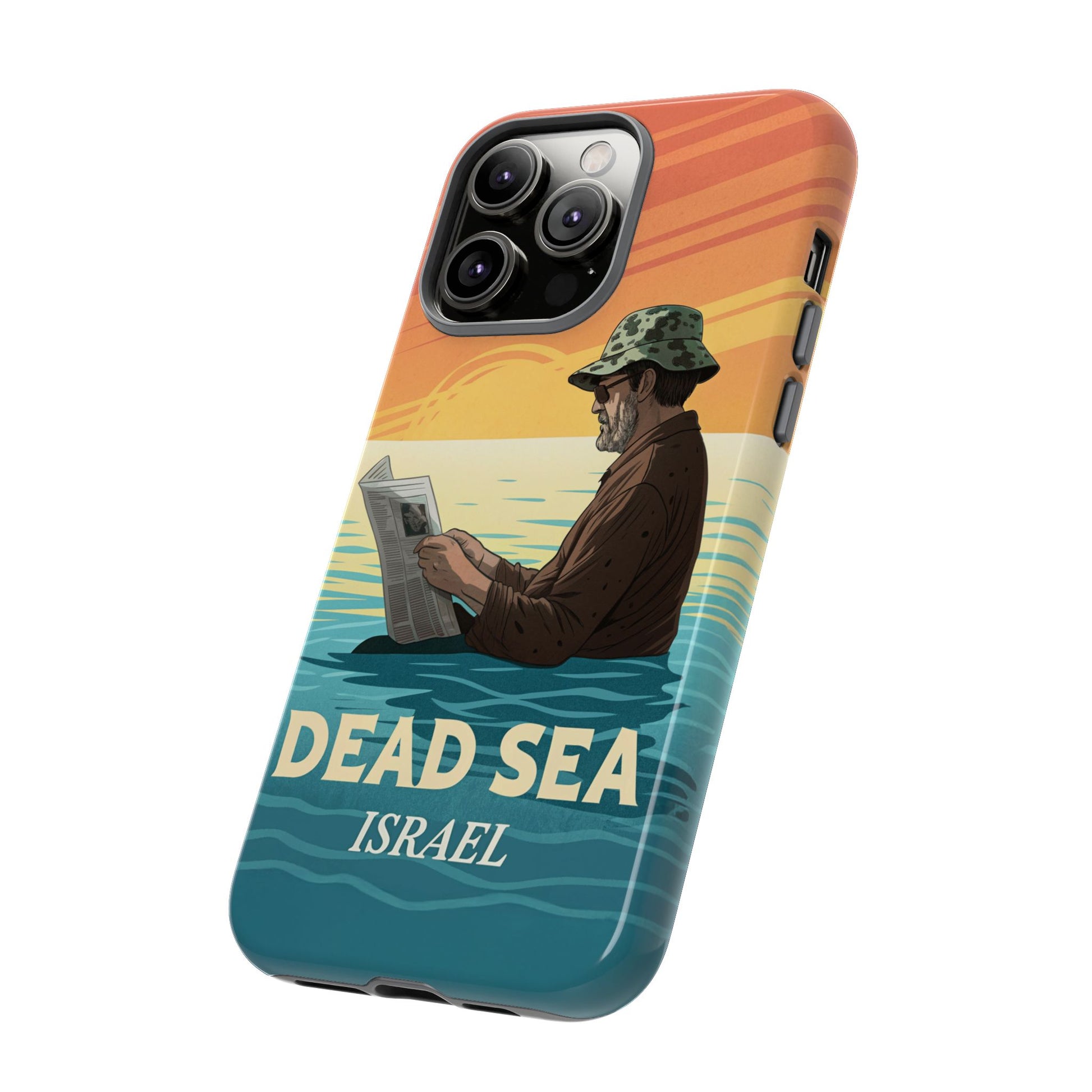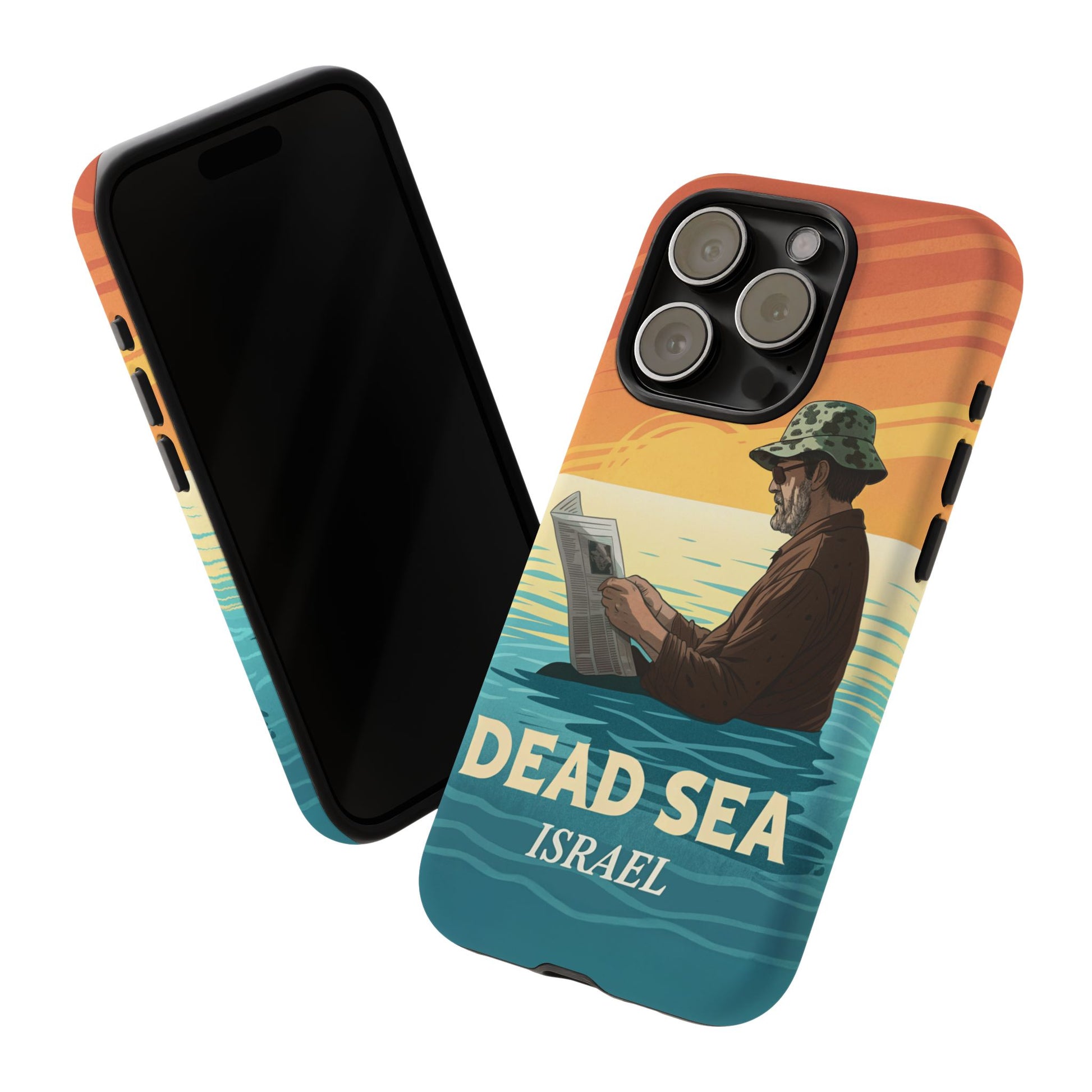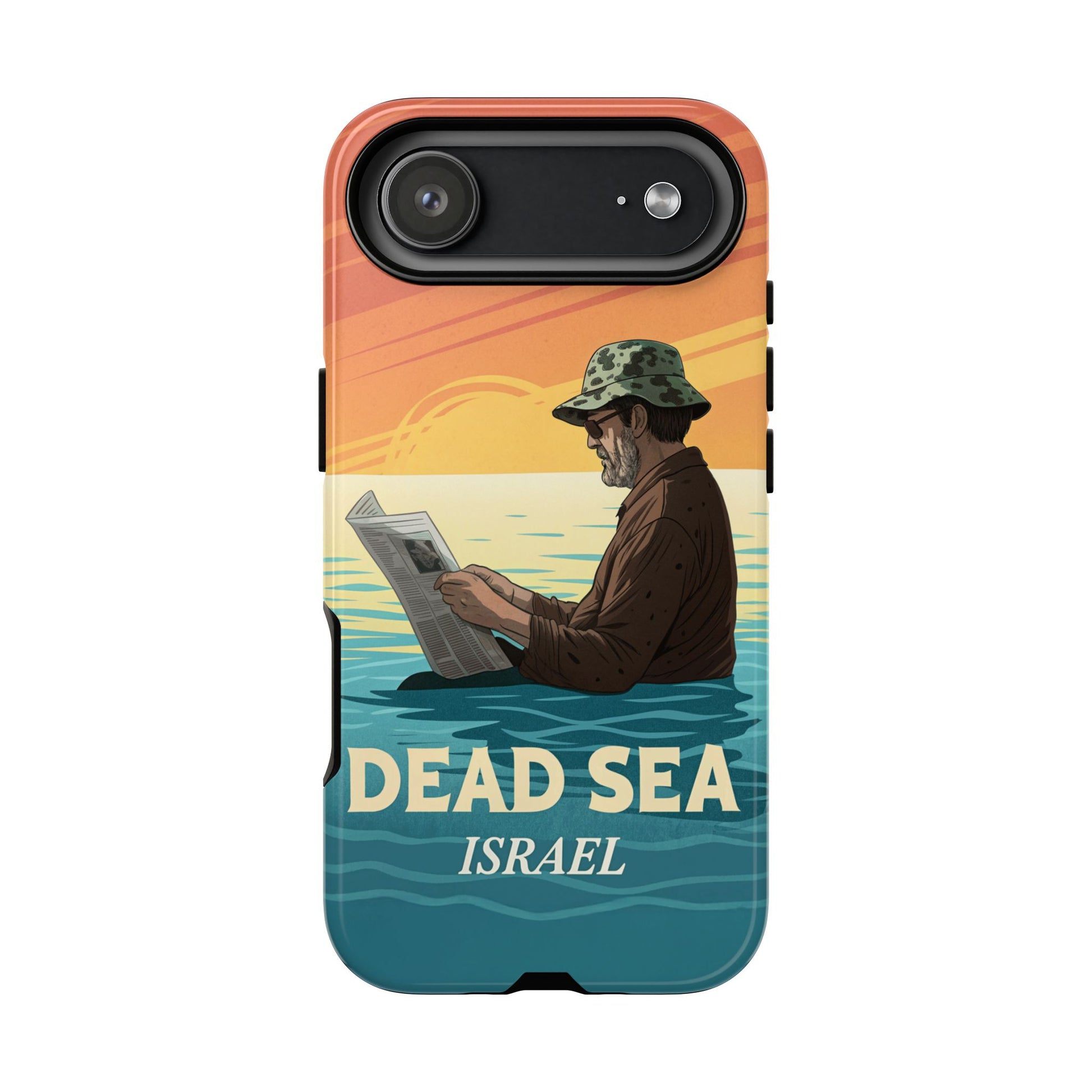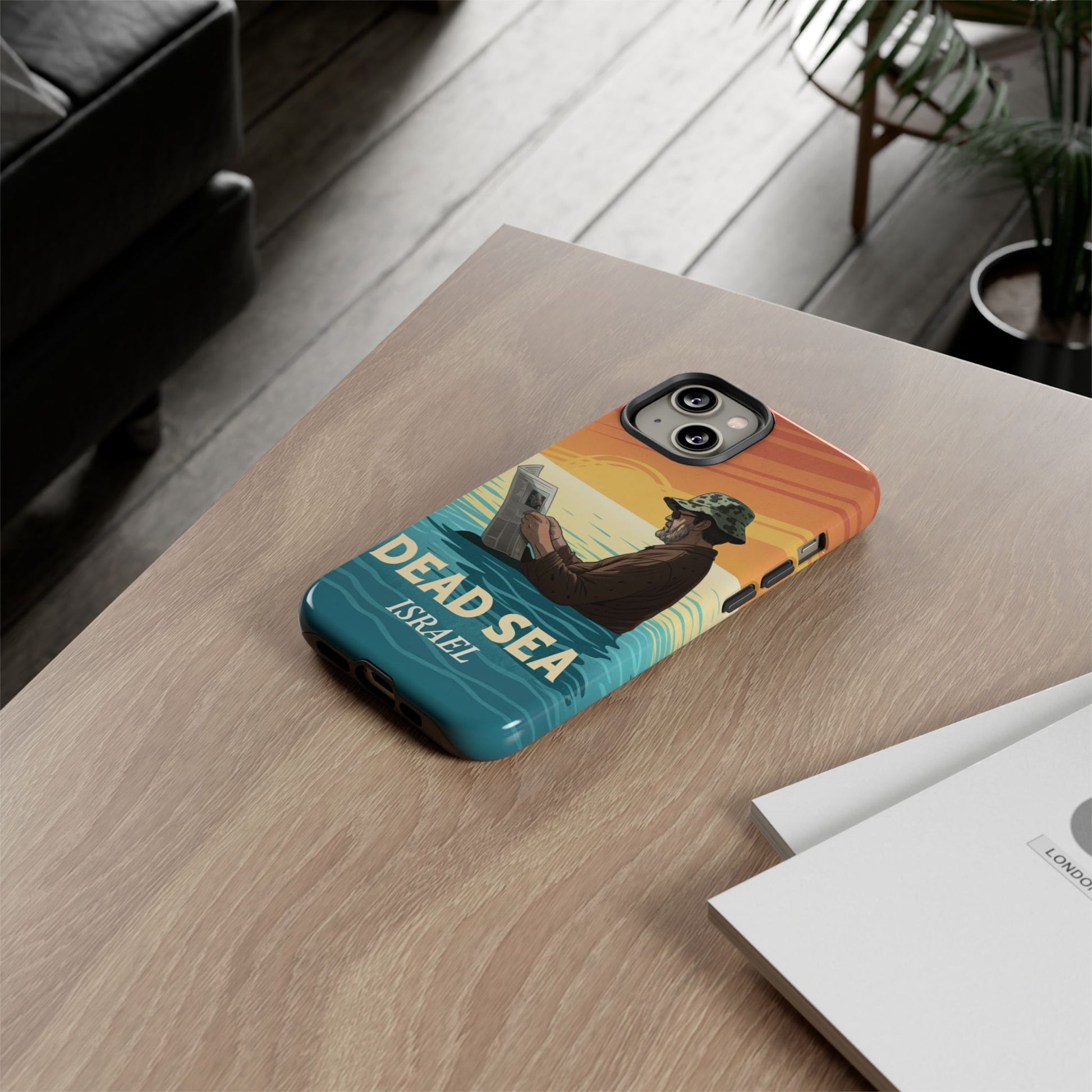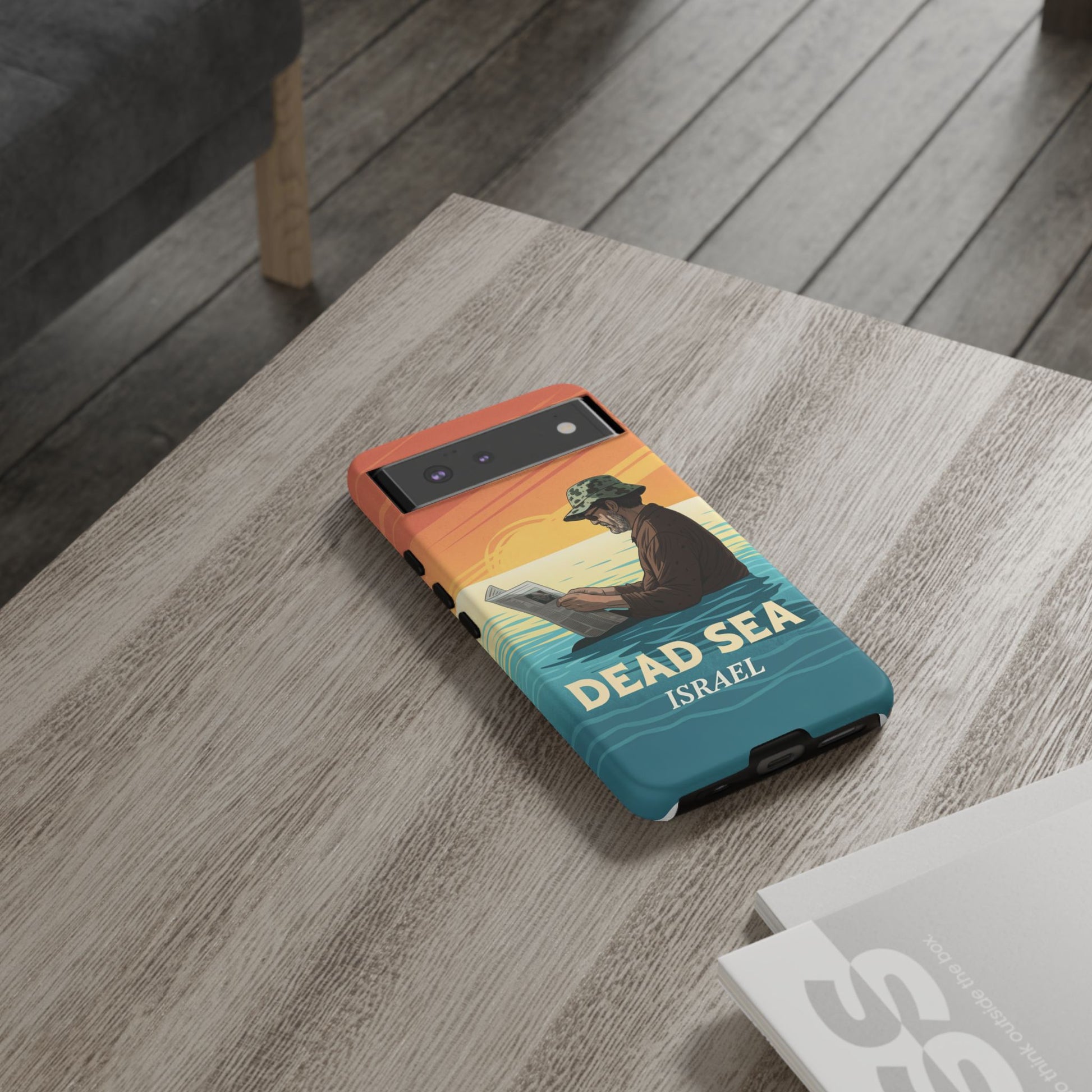 Ta med deg den rolige og ikoniske stemningen fra Dødehavet med dette kunstneriske mobildekselet. Designet viser en mann som sitter avslappet i det mineralrike vannet mens han leser avis – helt vektløs slik bare Dødehavet kan tilby. Den varme himmelen i oransje og gyldne toner gir motivet en vakker solnedgangsfølelse, mens de rolige blå bølgene skaper en perfekt kontrast. Et motiv som kombinerer humor, ro og tidløs reiselivssjarm fra Israel.