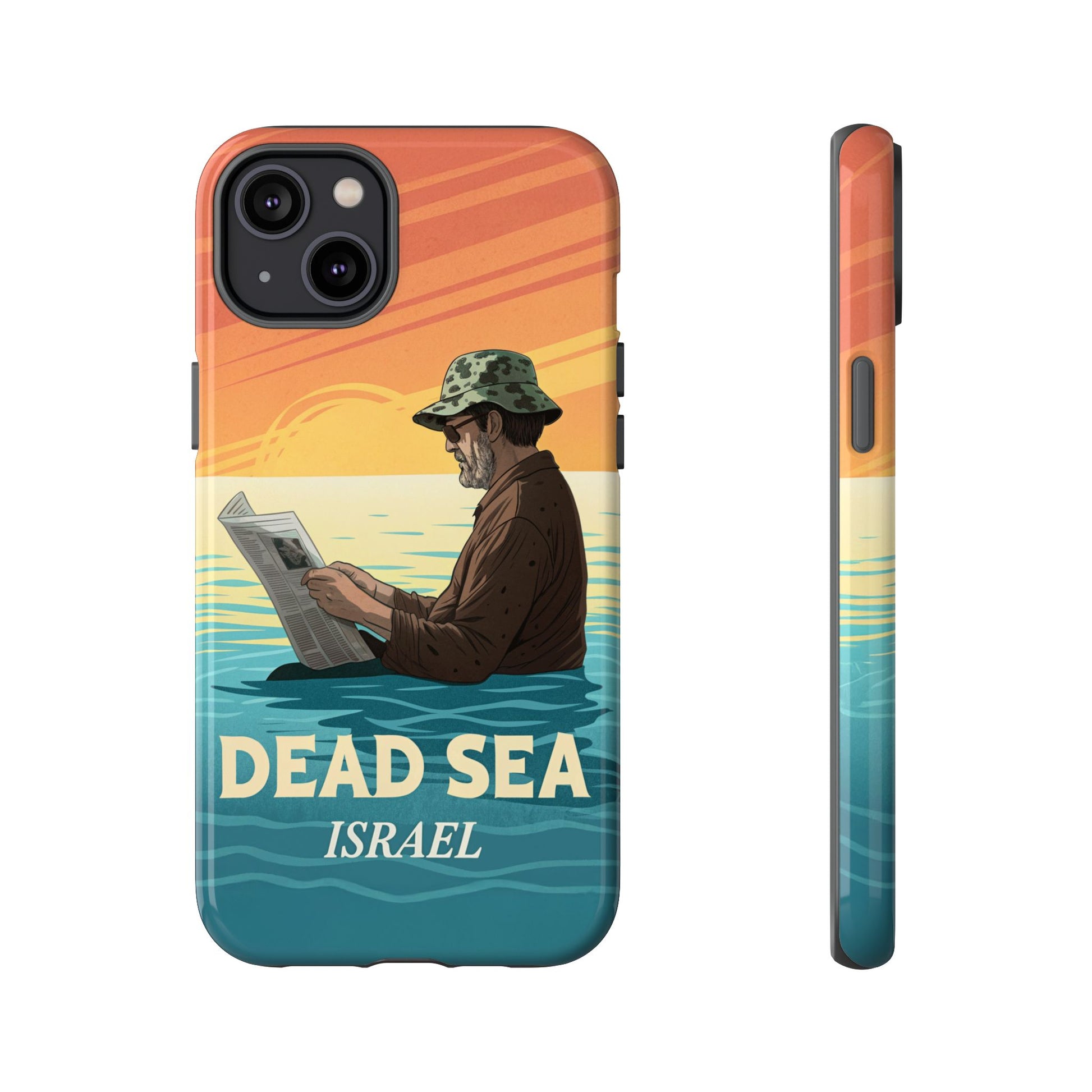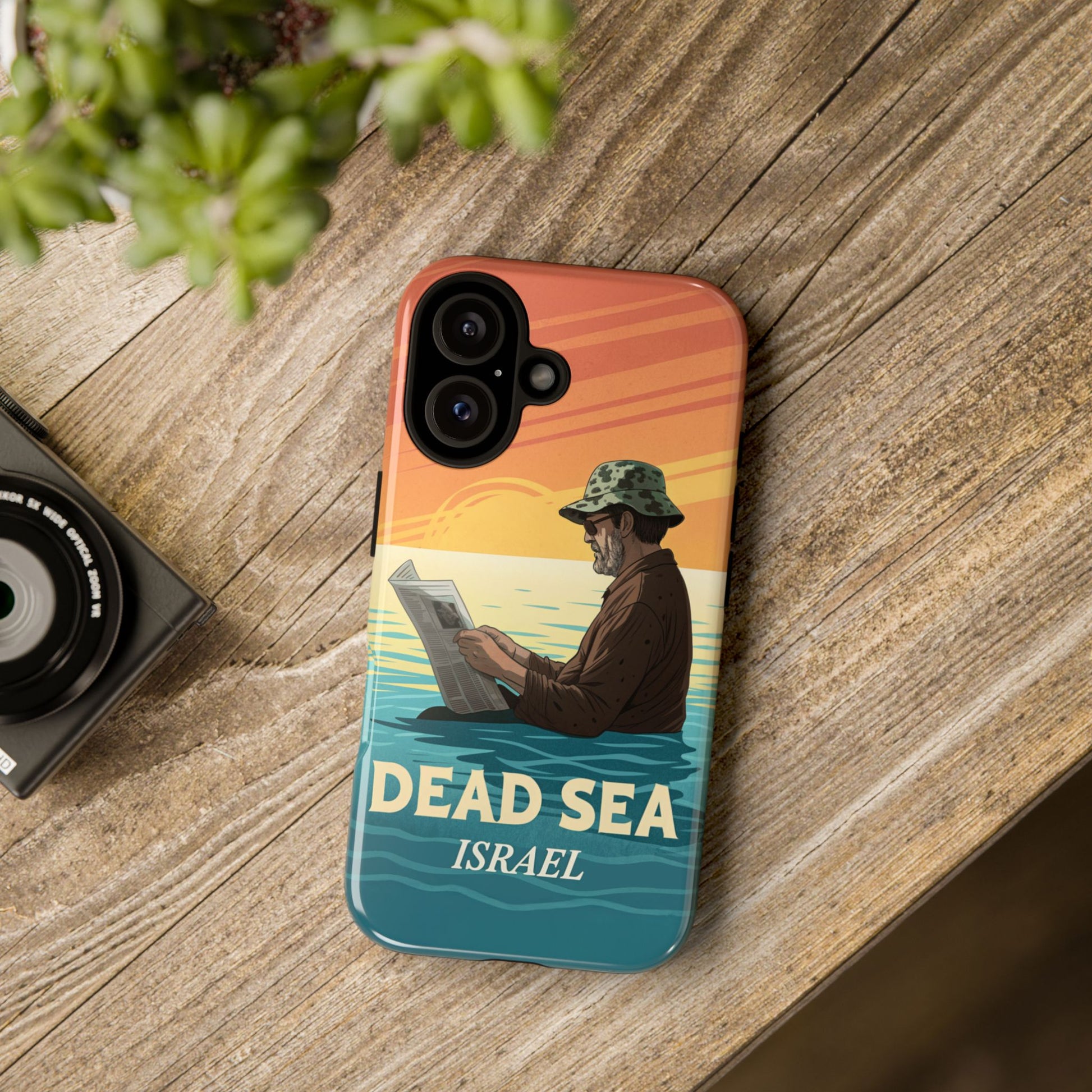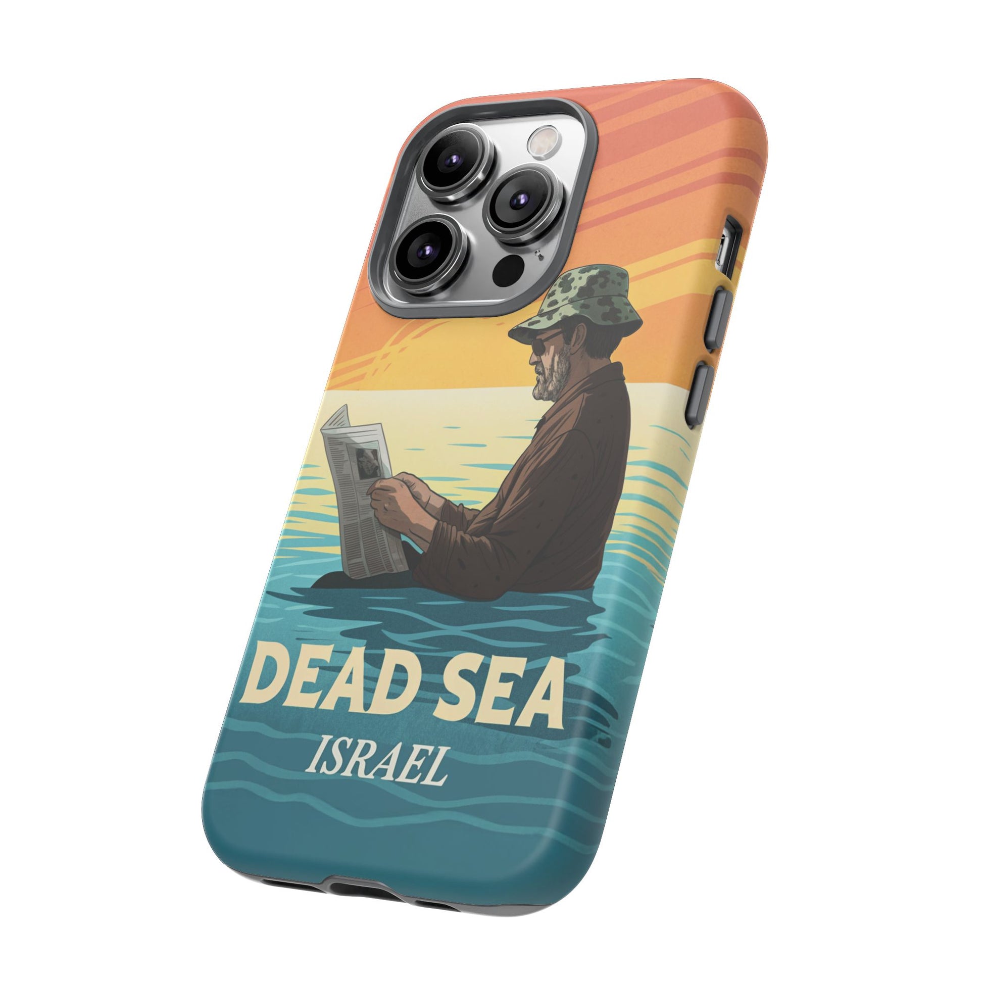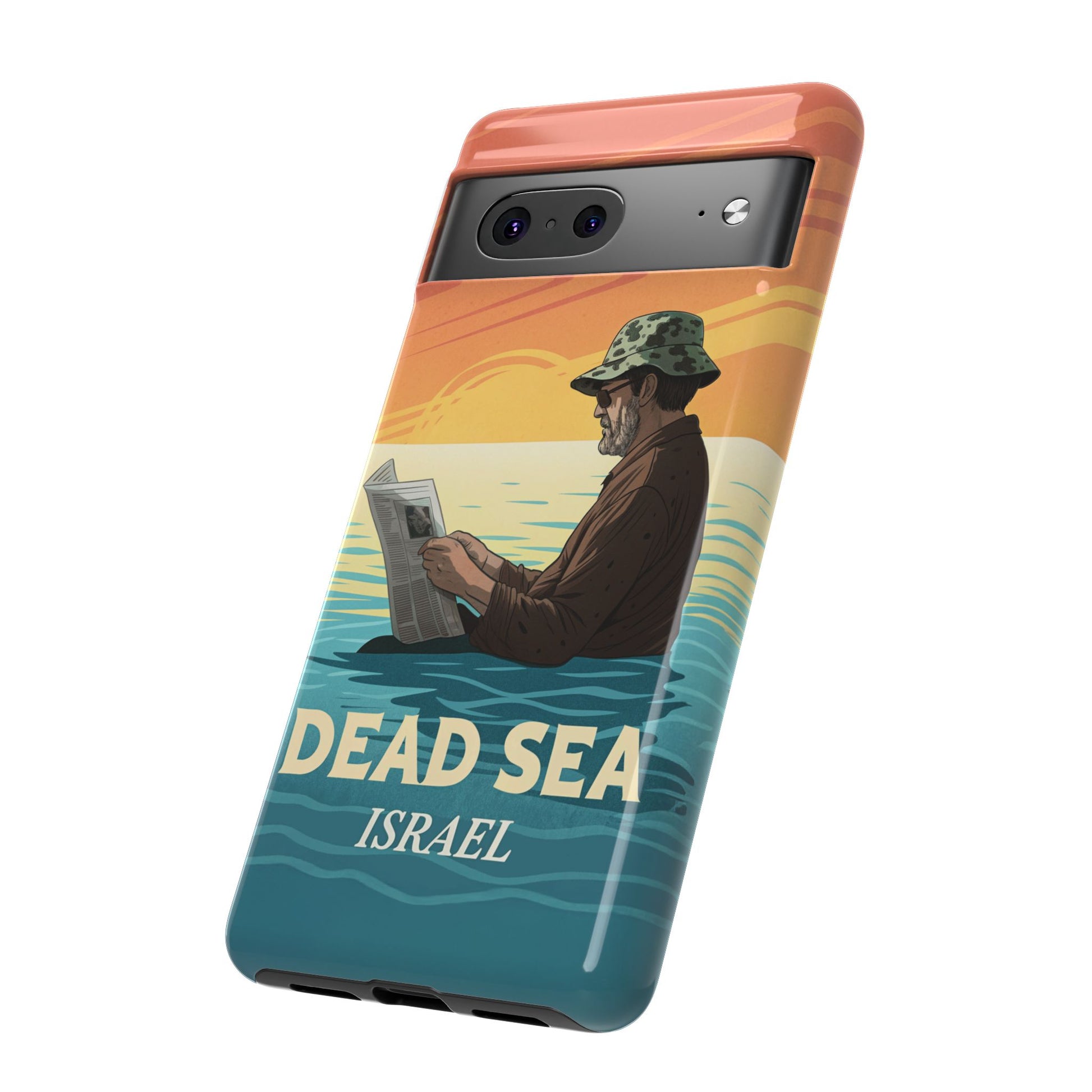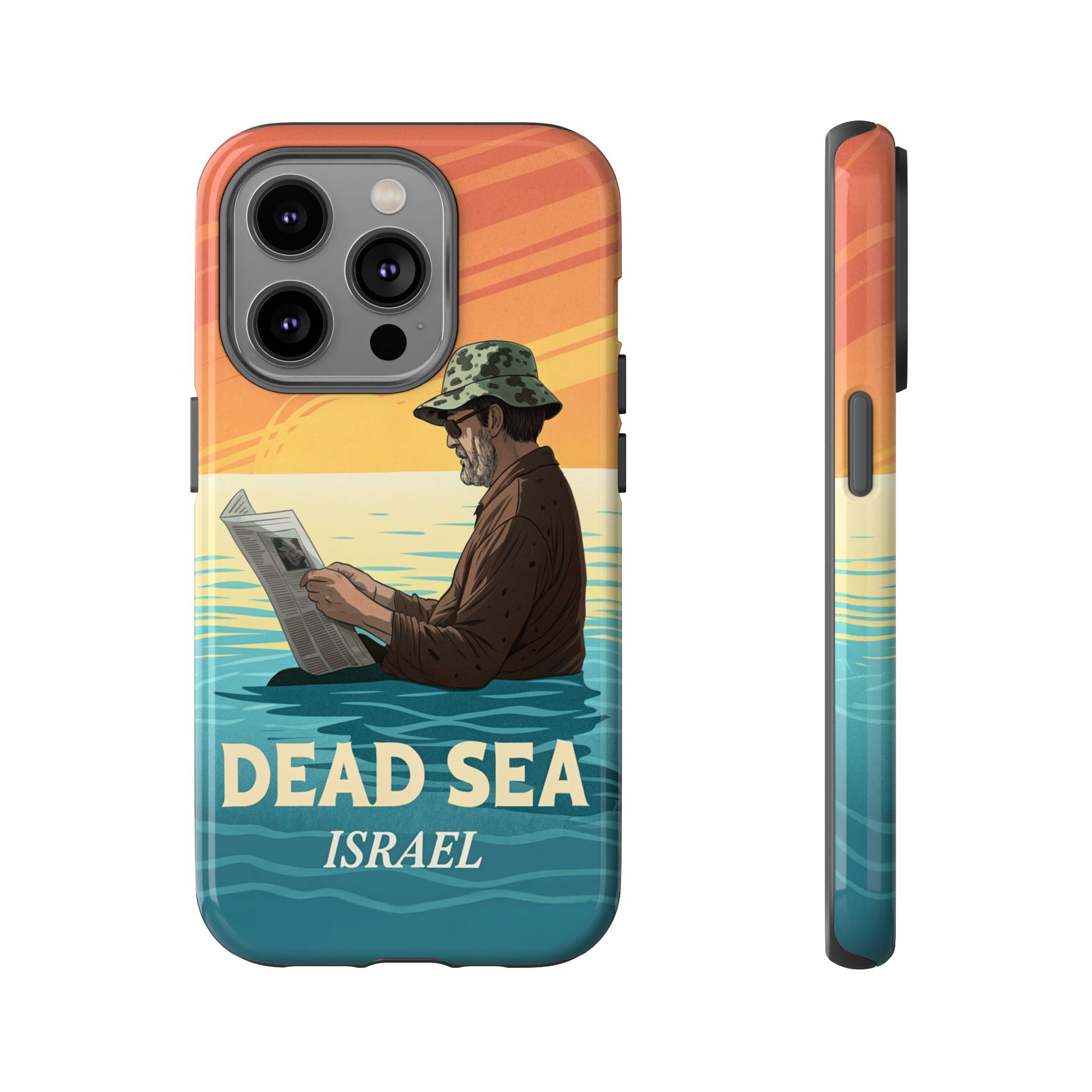 Ta med deg den rolige og ikoniske stemningen fra Dødehavet med dette kunstneriske mobildekselet. Designet viser en mann som sitter avslappet i det mineralrike vannet mens han leser avis – helt vektløs slik bare Dødehavet kan tilby. Den varme himmelen i oransje og gyldne toner gir motivet en vakker solnedgangsfølelse, mens de rolige blå bølgene skaper en perfekt kontrast. Et motiv som kombinerer humor, ro og tidløs reiselivssjarm fra Israel.