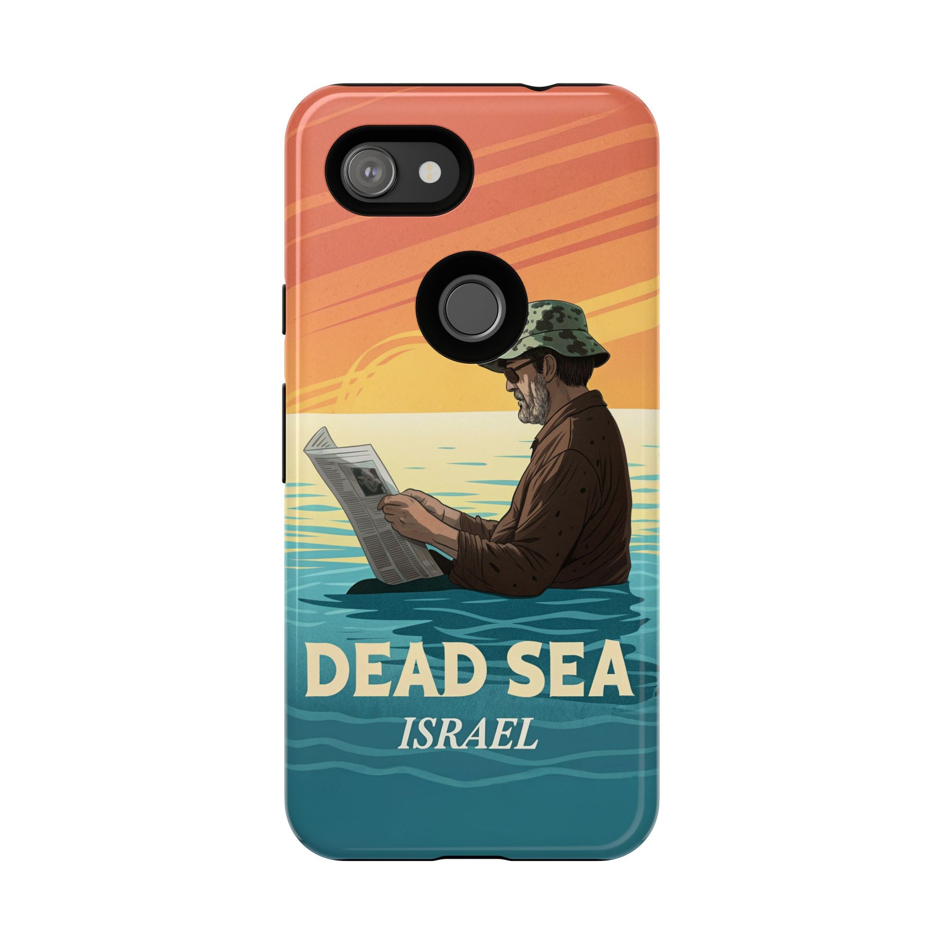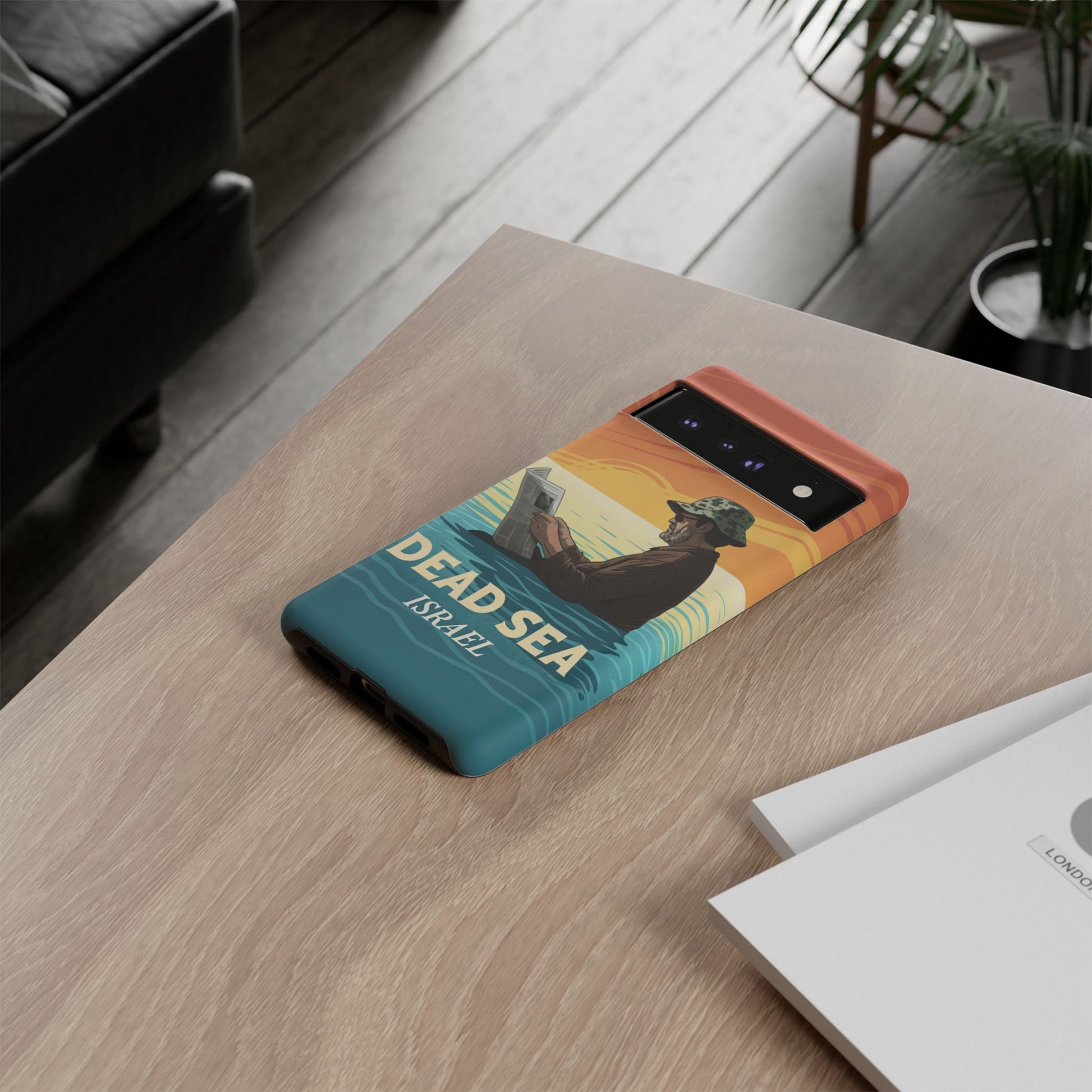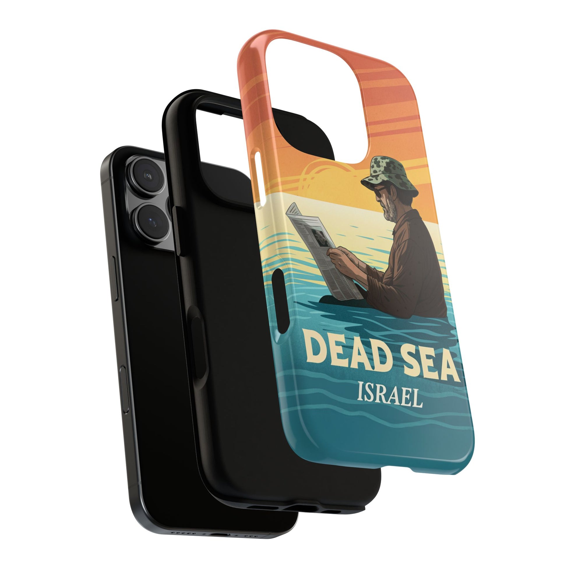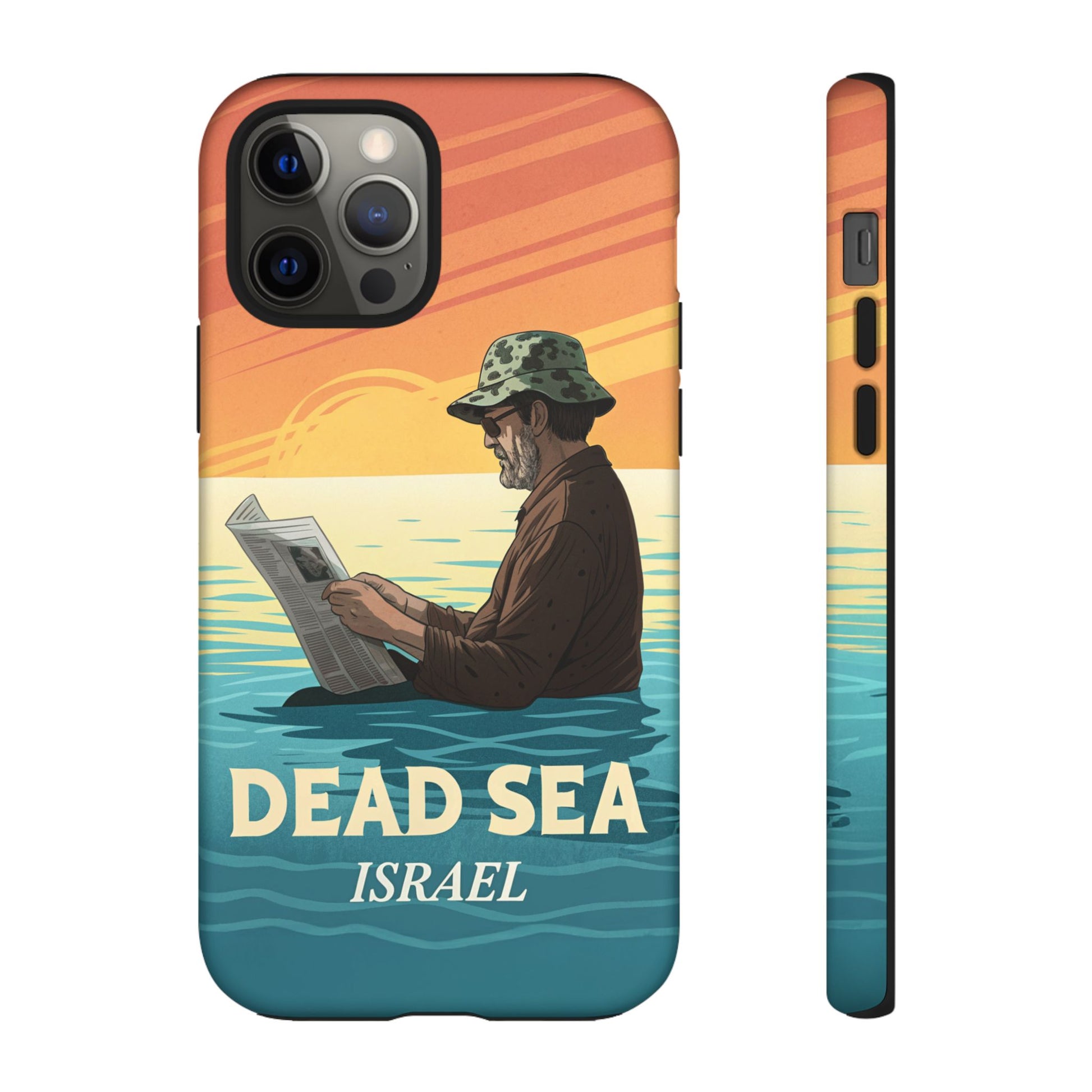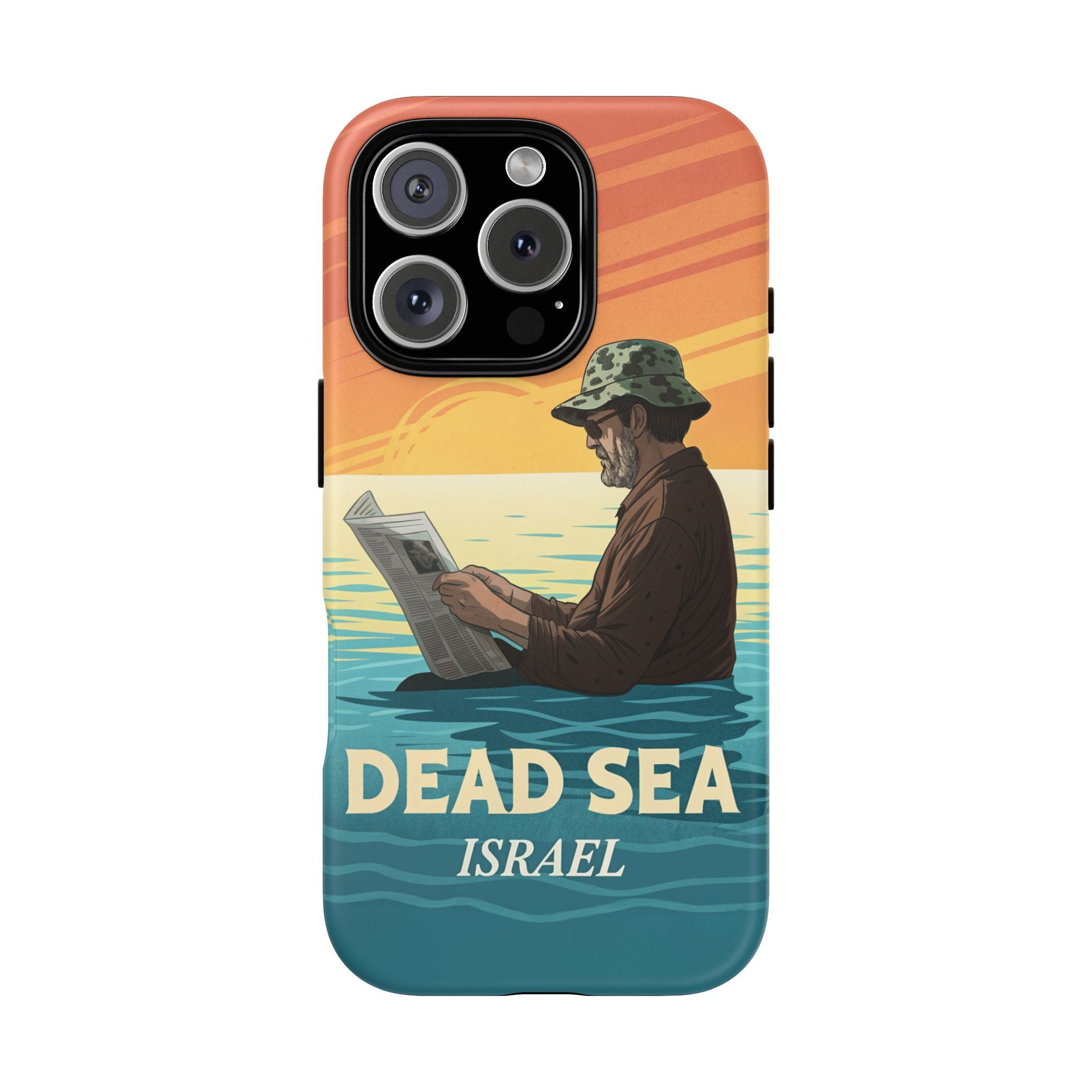 Ta med deg den rolige og ikoniske stemningen fra Dødehavet med dette kunstneriske mobildekselet. Designet viser en mann som sitter avslappet i det mineralrike vannet mens han leser avis – helt vektløs slik bare Dødehavet kan tilby. Den varme himmelen i oransje og gyldne toner gir motivet en vakker solnedgangsfølelse, mens de rolige blå bølgene skaper en perfekt kontrast. Et motiv som kombinerer humor, ro og tidløs reiselivssjarm fra Israel.