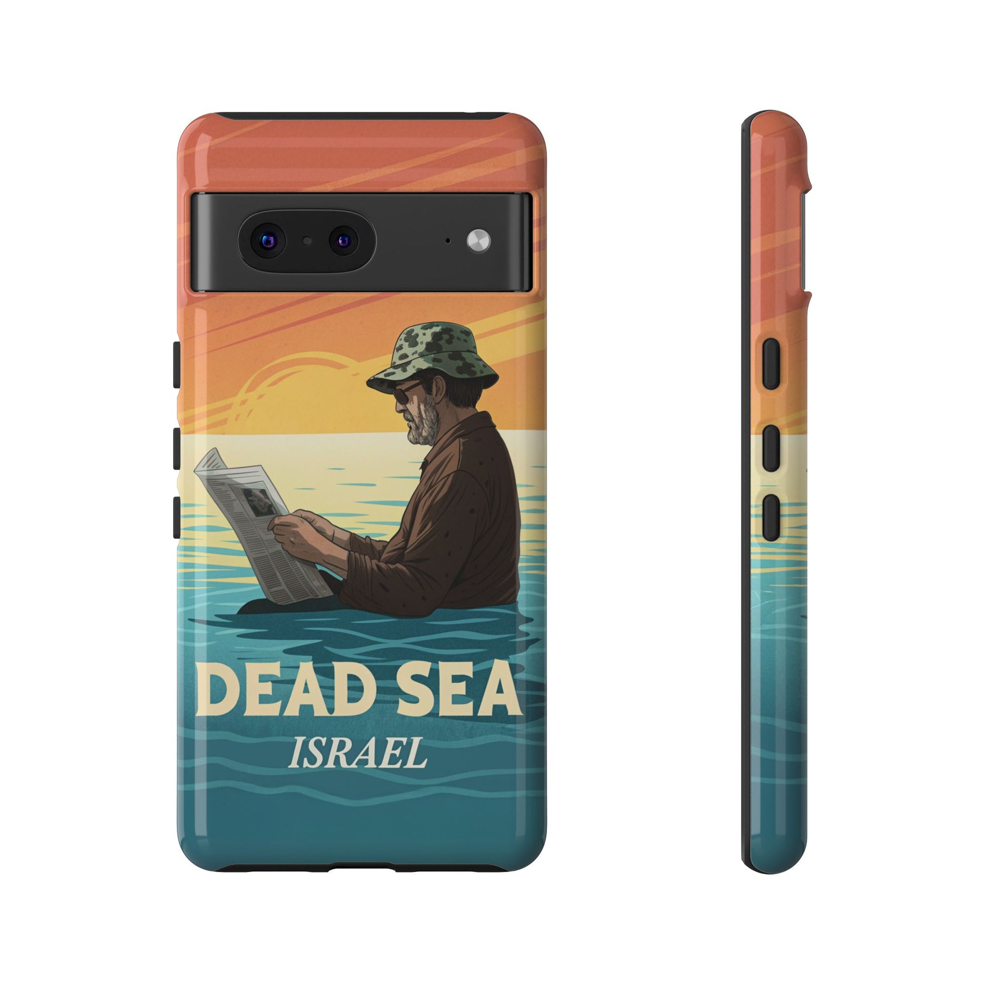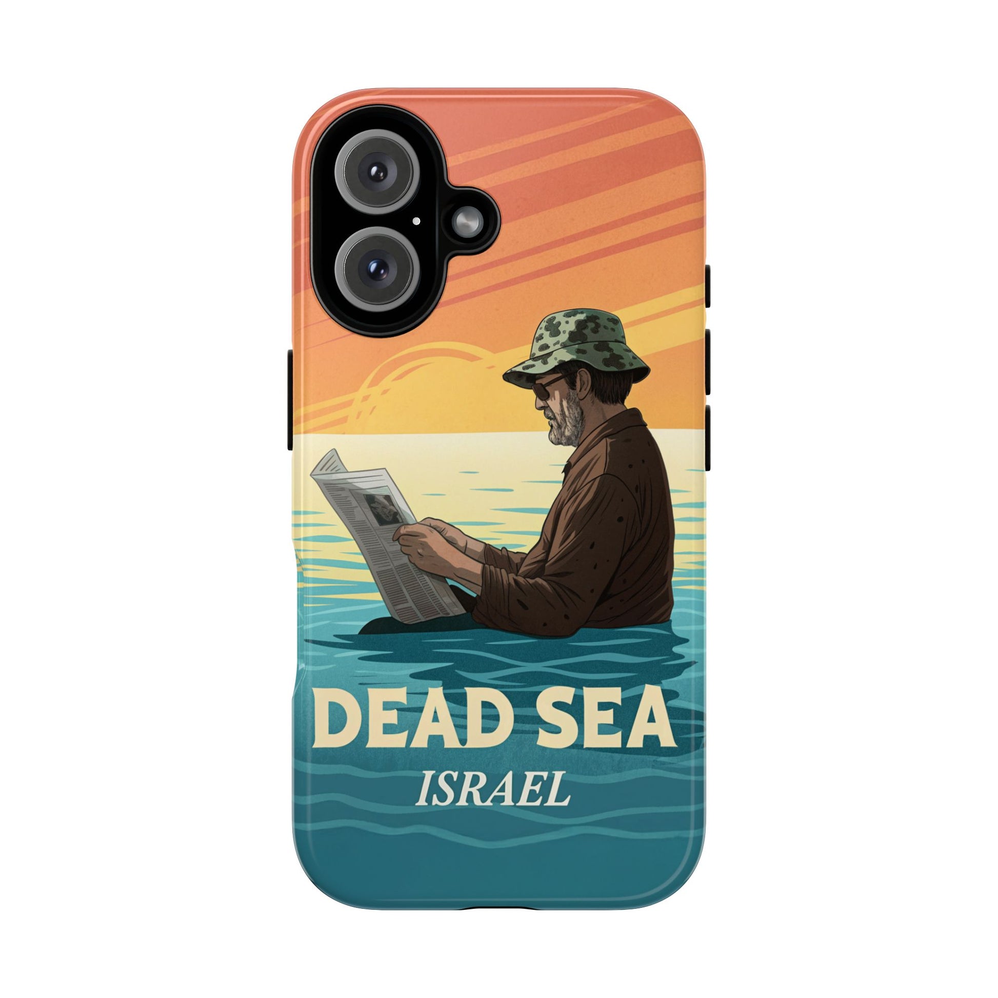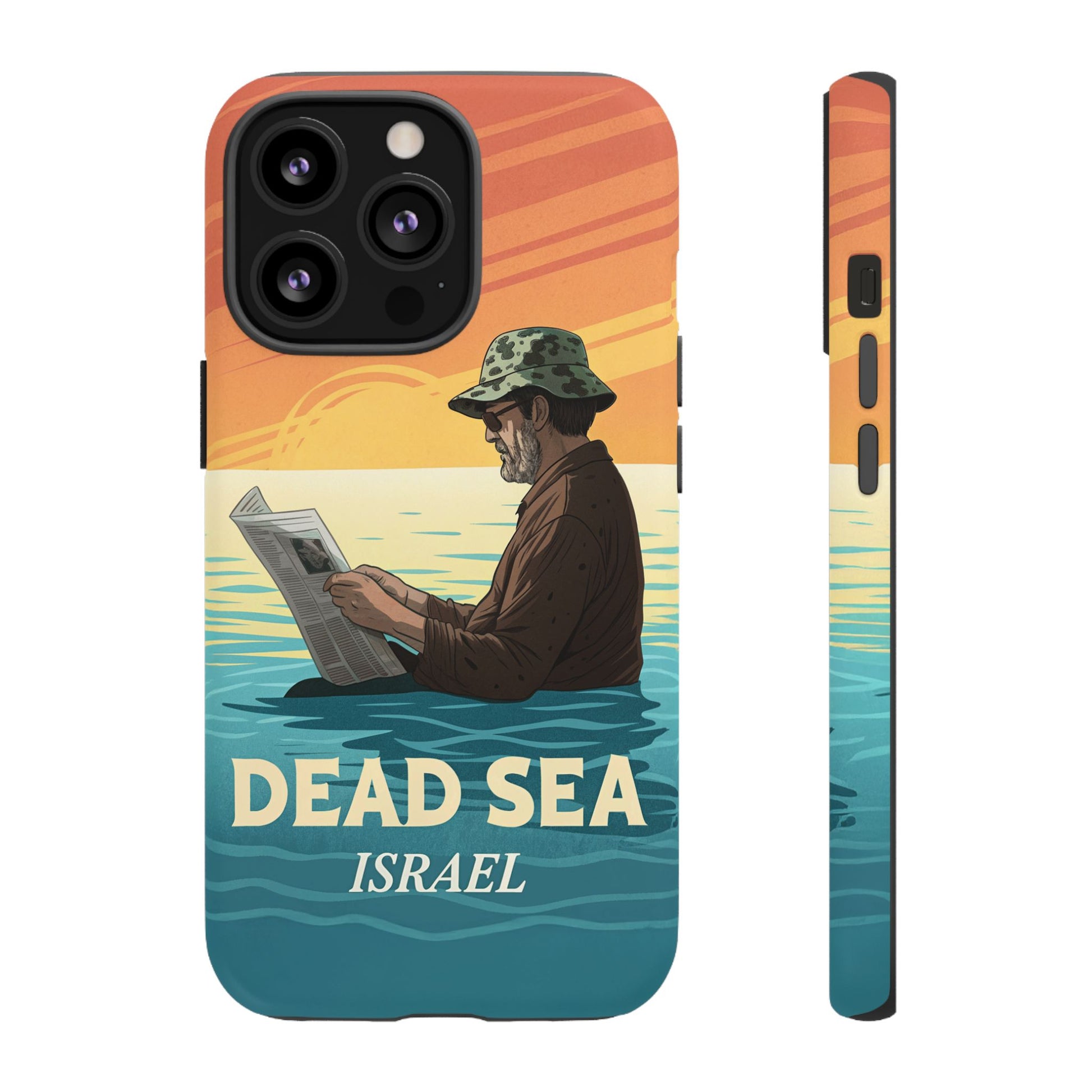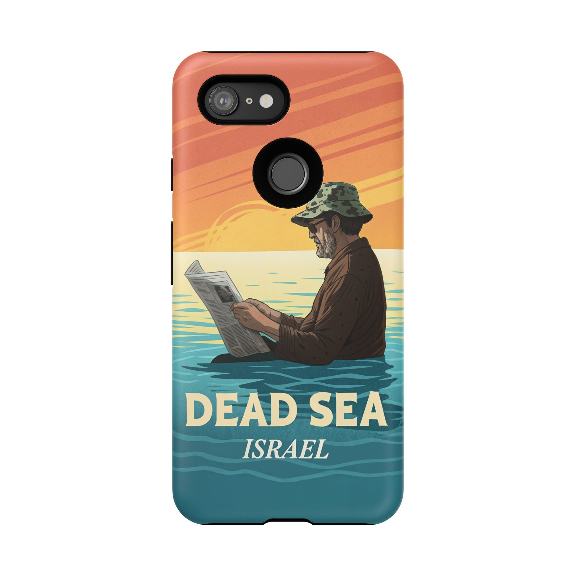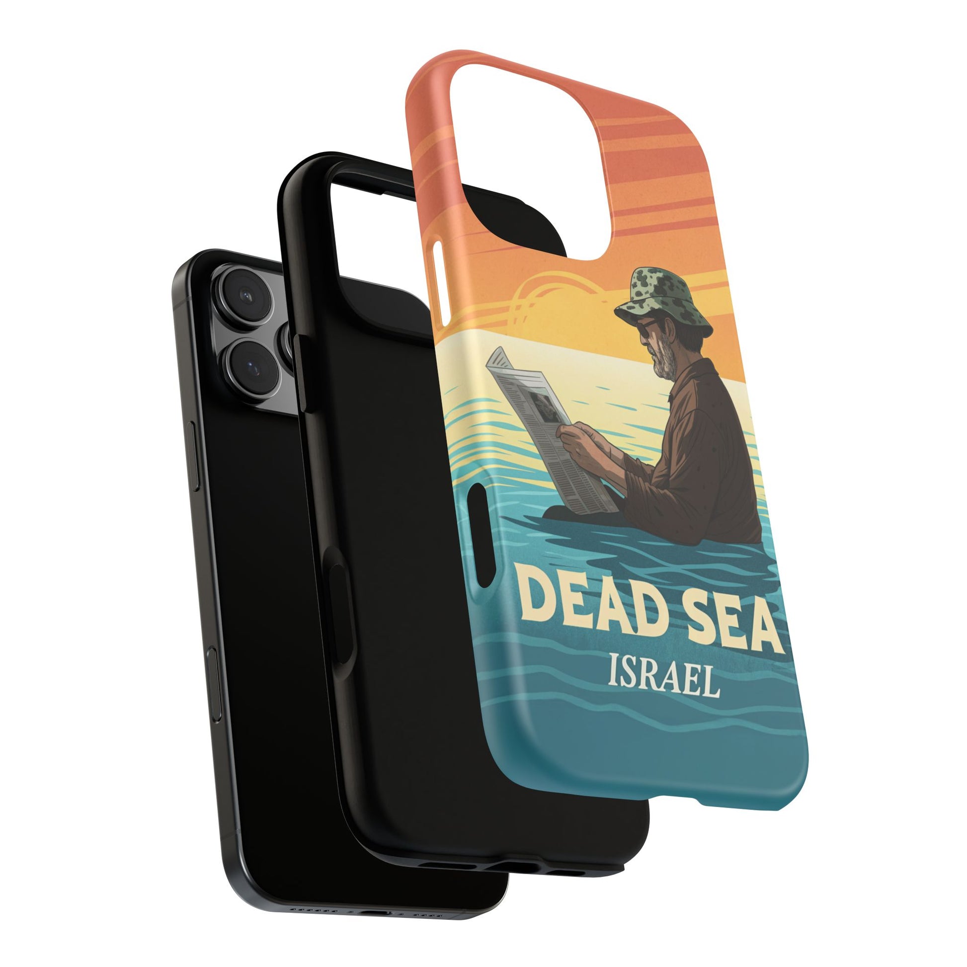 Ta med deg den rolige og ikoniske stemningen fra Dødehavet med dette kunstneriske mobildekselet. Designet viser en mann som sitter avslappet i det mineralrike vannet mens han leser avis – helt vektløs slik bare Dødehavet kan tilby. Den varme himmelen i oransje og gyldne toner gir motivet en vakker solnedgangsfølelse, mens de rolige blå bølgene skaper en perfekt kontrast. Et motiv som kombinerer humor, ro og tidløs reiselivssjarm fra Israel.