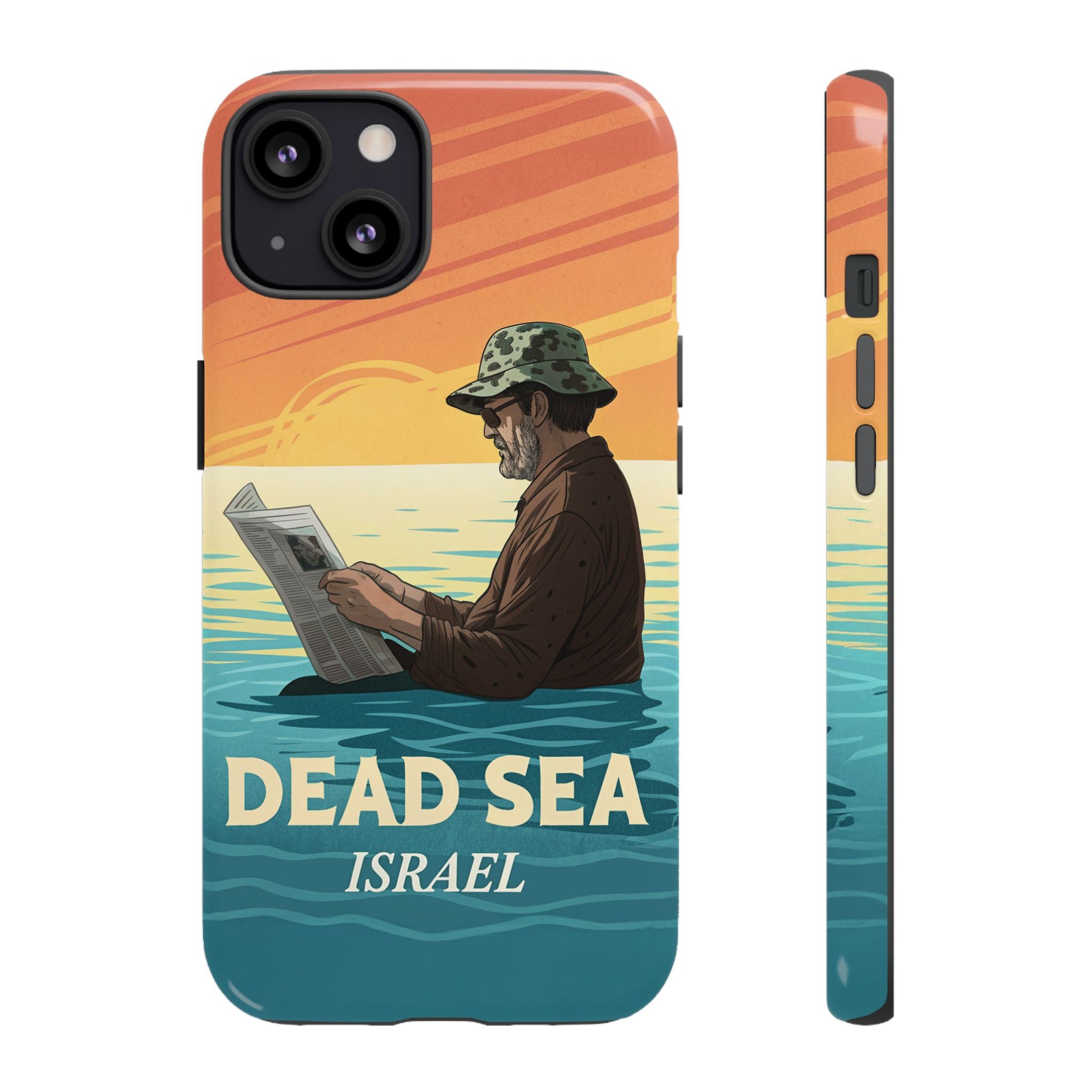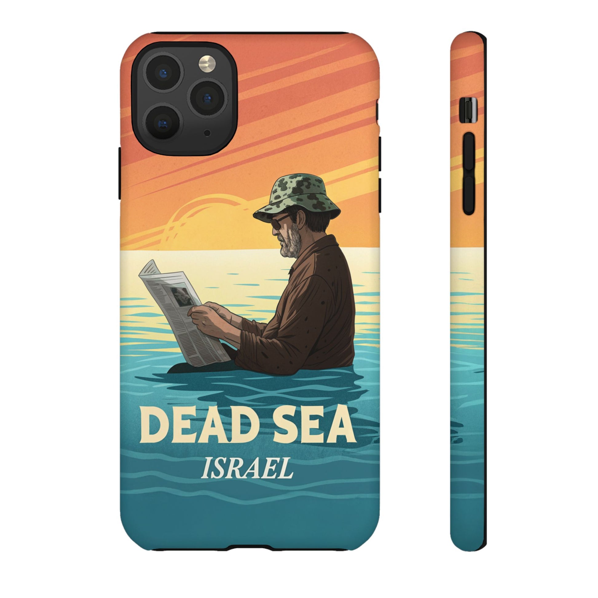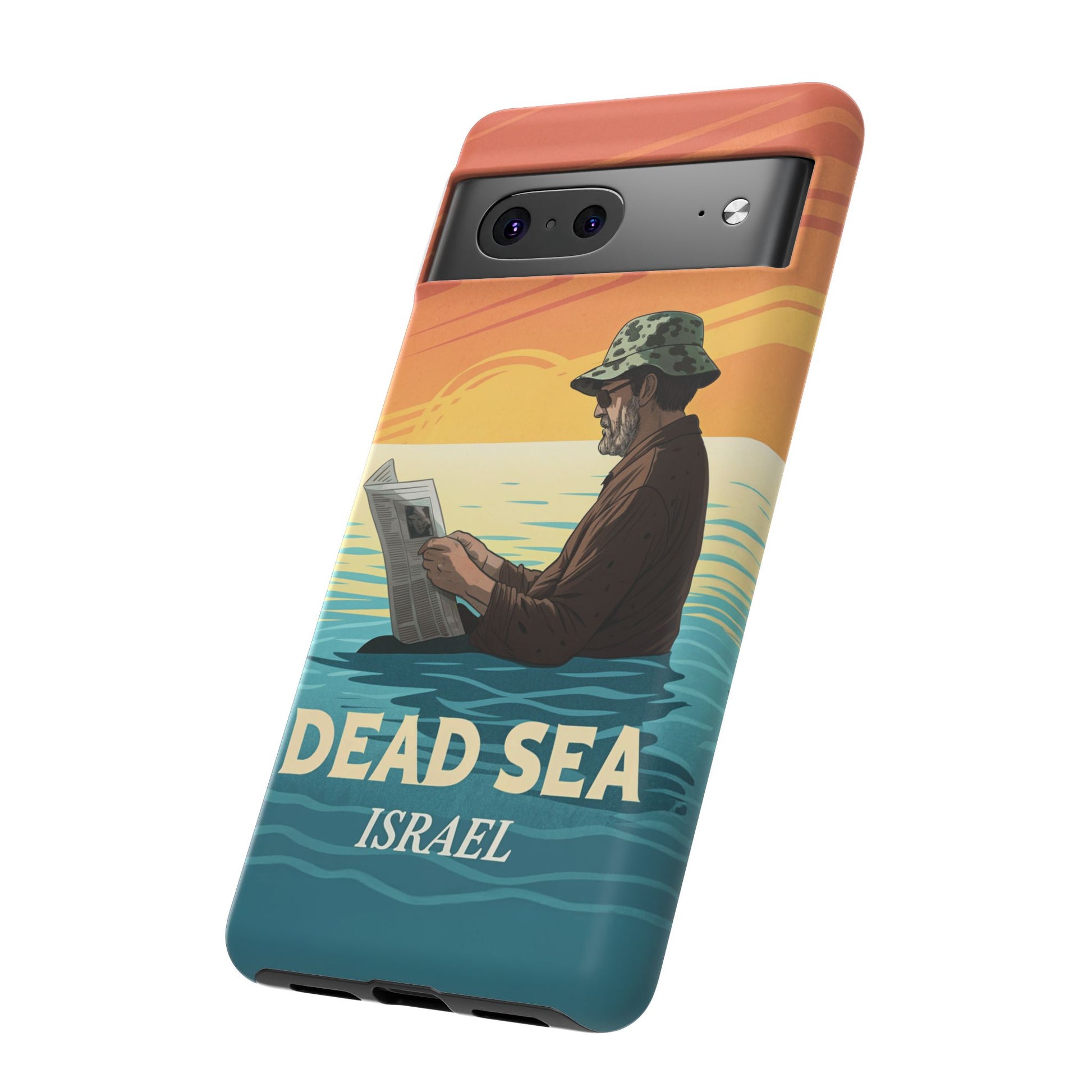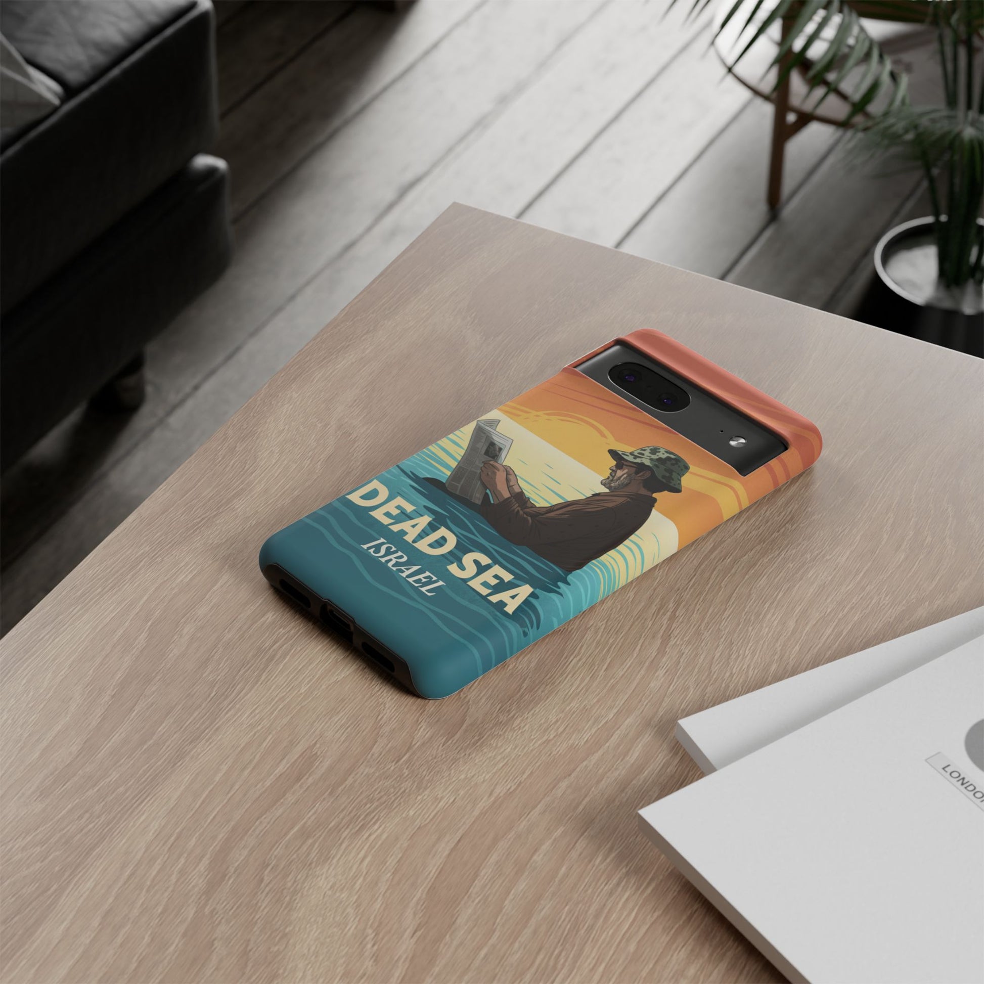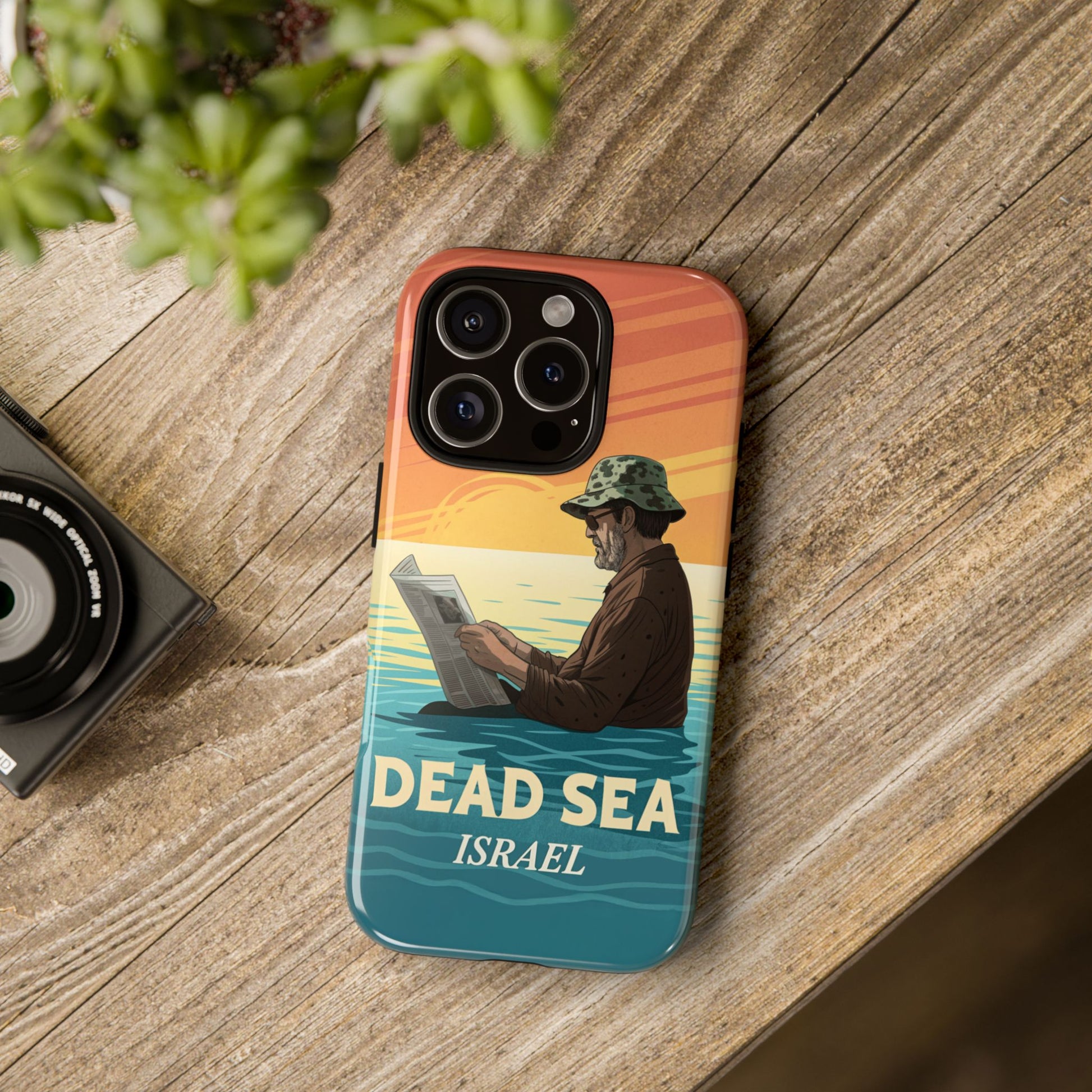 Ta med deg den rolige og ikoniske stemningen fra Dødehavet med dette kunstneriske mobildekselet. Designet viser en mann som sitter avslappet i det mineralrike vannet mens han leser avis – helt vektløs slik bare Dødehavet kan tilby. Den varme himmelen i oransje og gyldne toner gir motivet en vakker solnedgangsfølelse, mens de rolige blå bølgene skaper en perfekt kontrast. Et motiv som kombinerer humor, ro og tidløs reiselivssjarm fra Israel.
