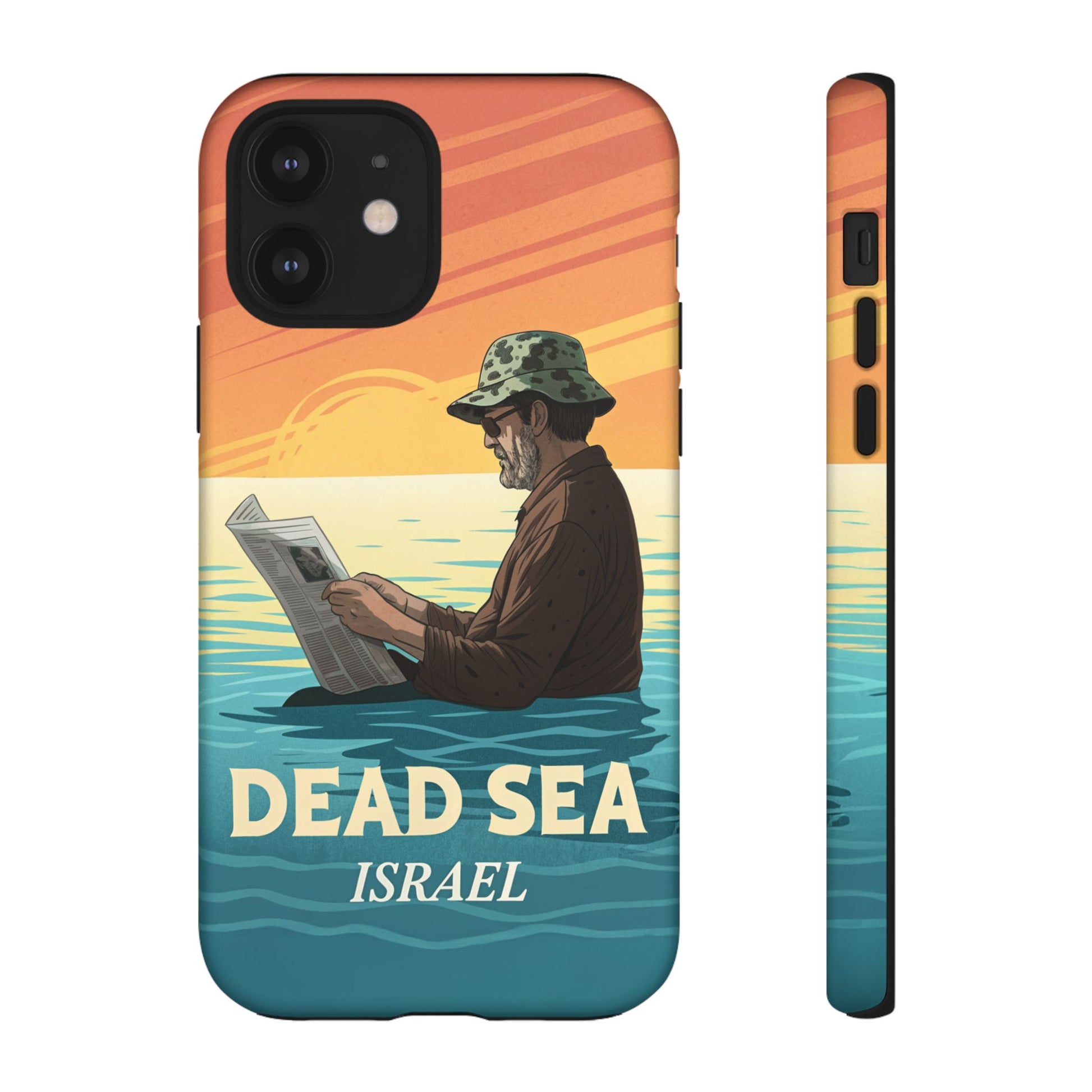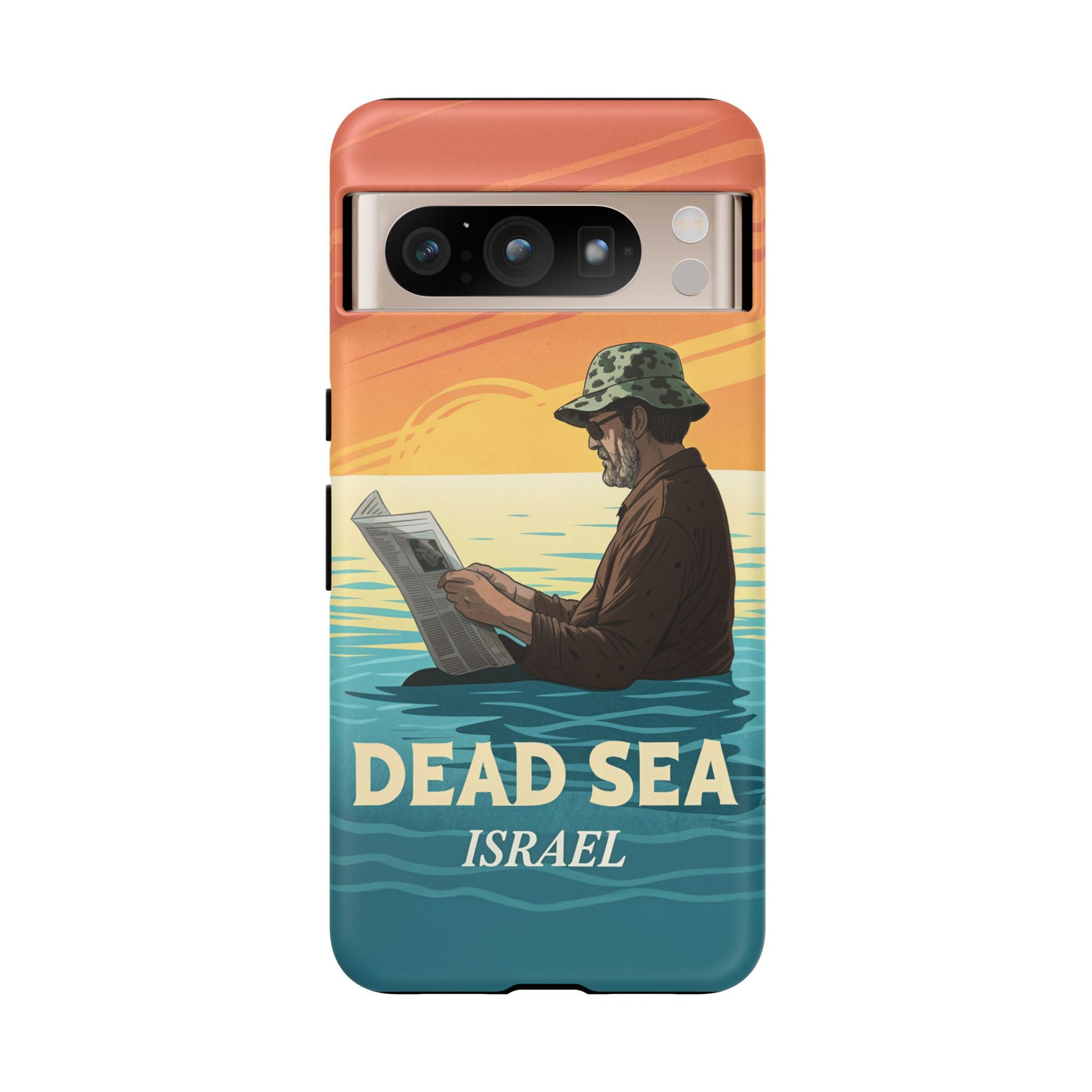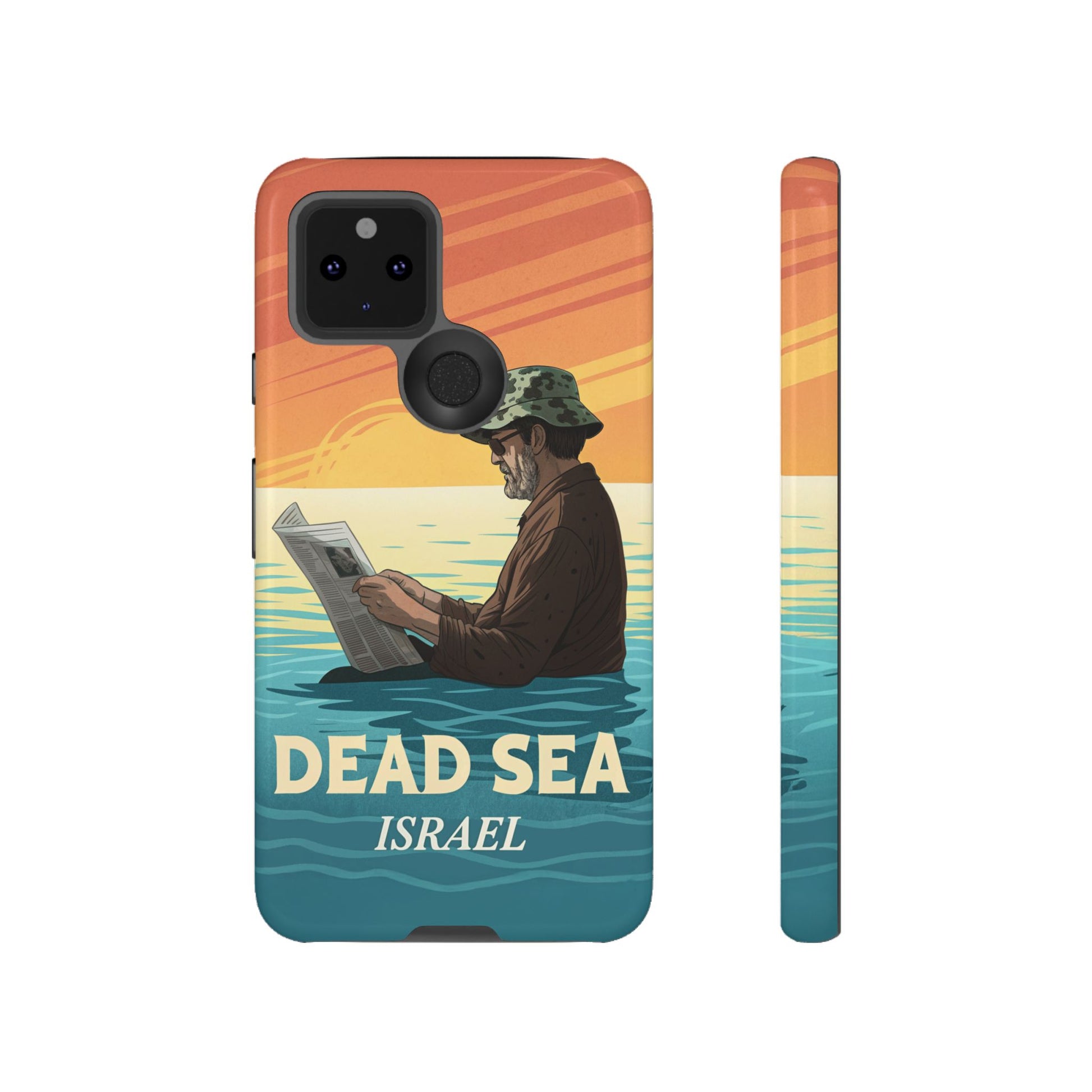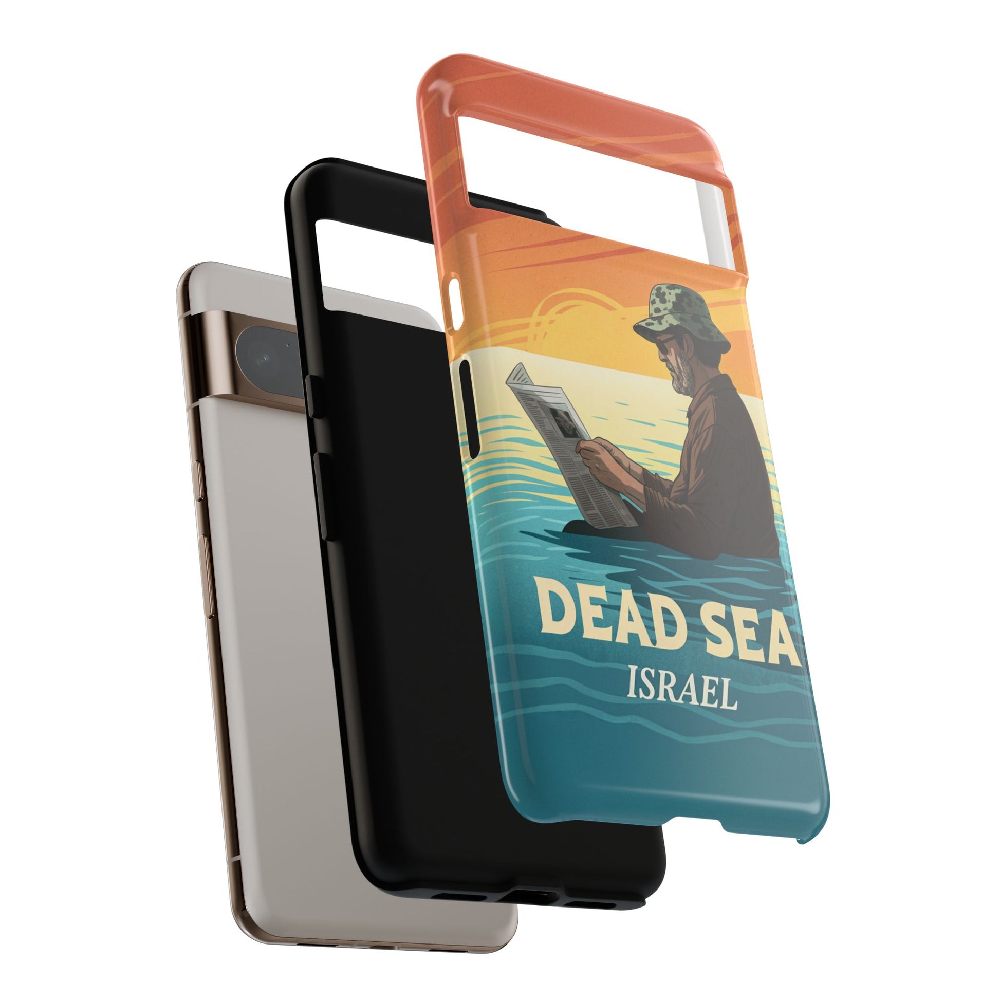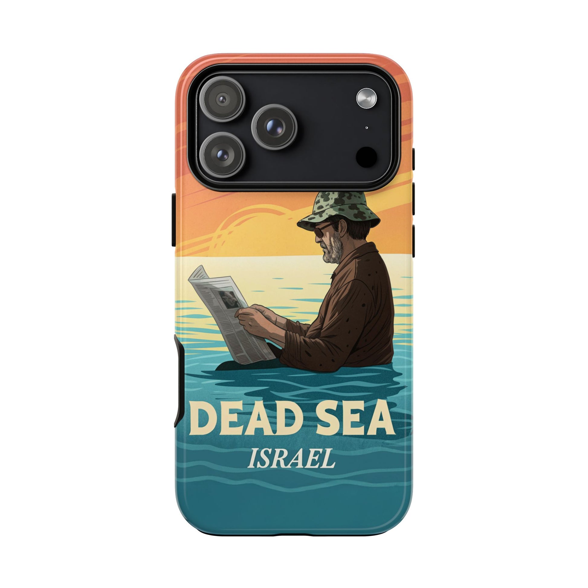 Ta med deg den rolige og ikoniske stemningen fra Dødehavet med dette kunstneriske mobildekselet. Designet viser en mann som sitter avslappet i det mineralrike vannet mens han leser avis – helt vektløs slik bare Dødehavet kan tilby. Den varme himmelen i oransje og gyldne toner gir motivet en vakker solnedgangsfølelse, mens de rolige blå bølgene skaper en perfekt kontrast. Et motiv som kombinerer humor, ro og tidløs reiselivssjarm fra Israel.