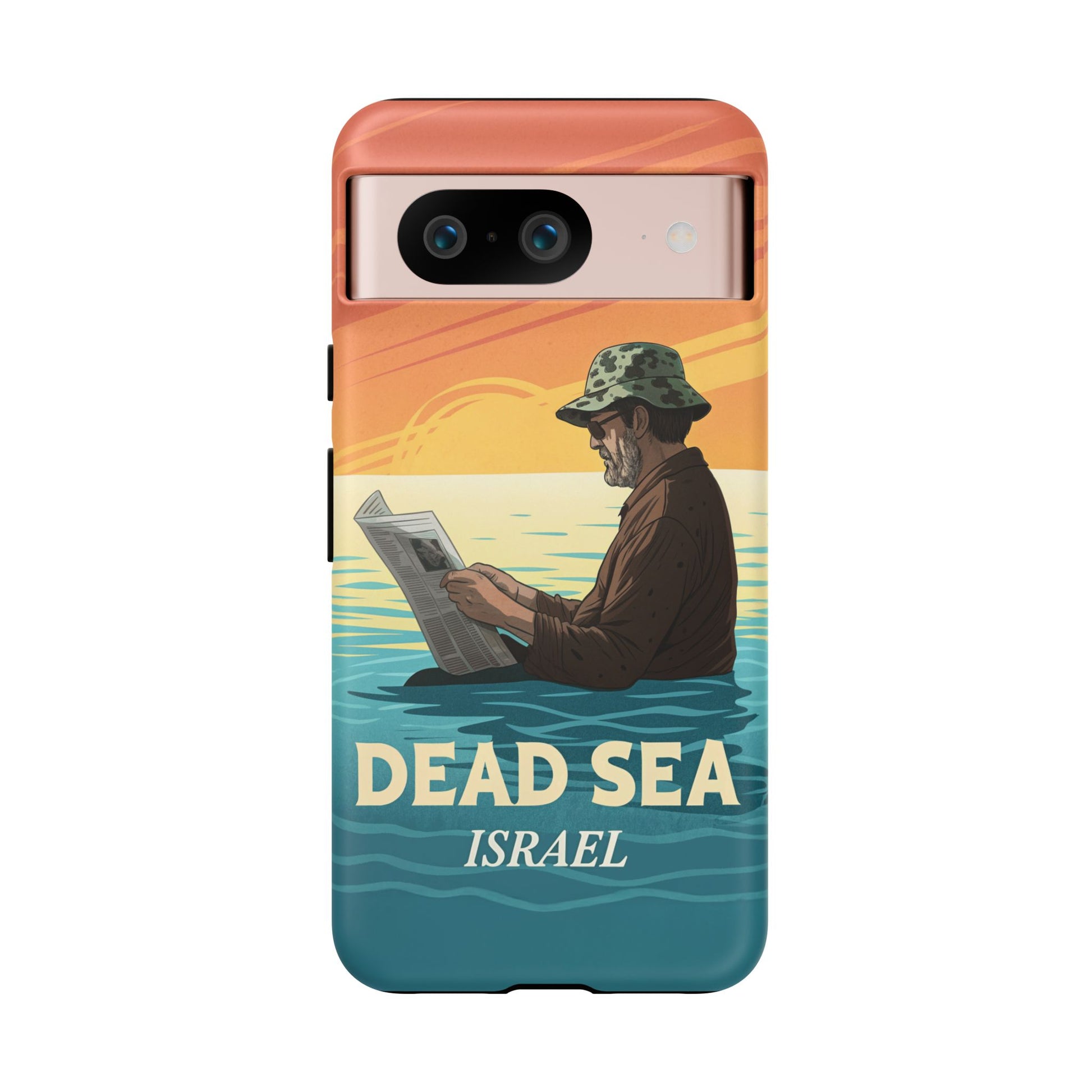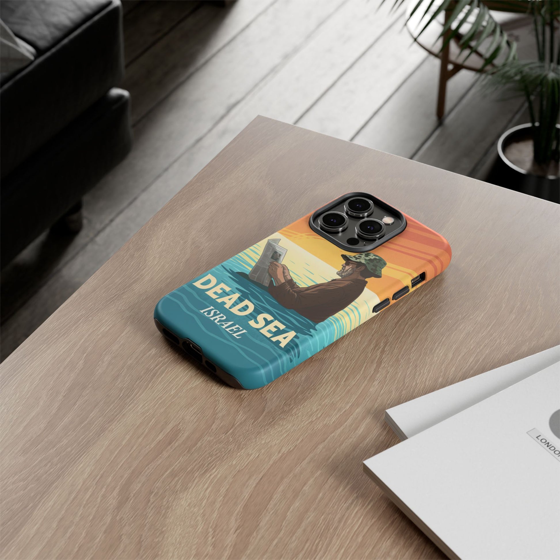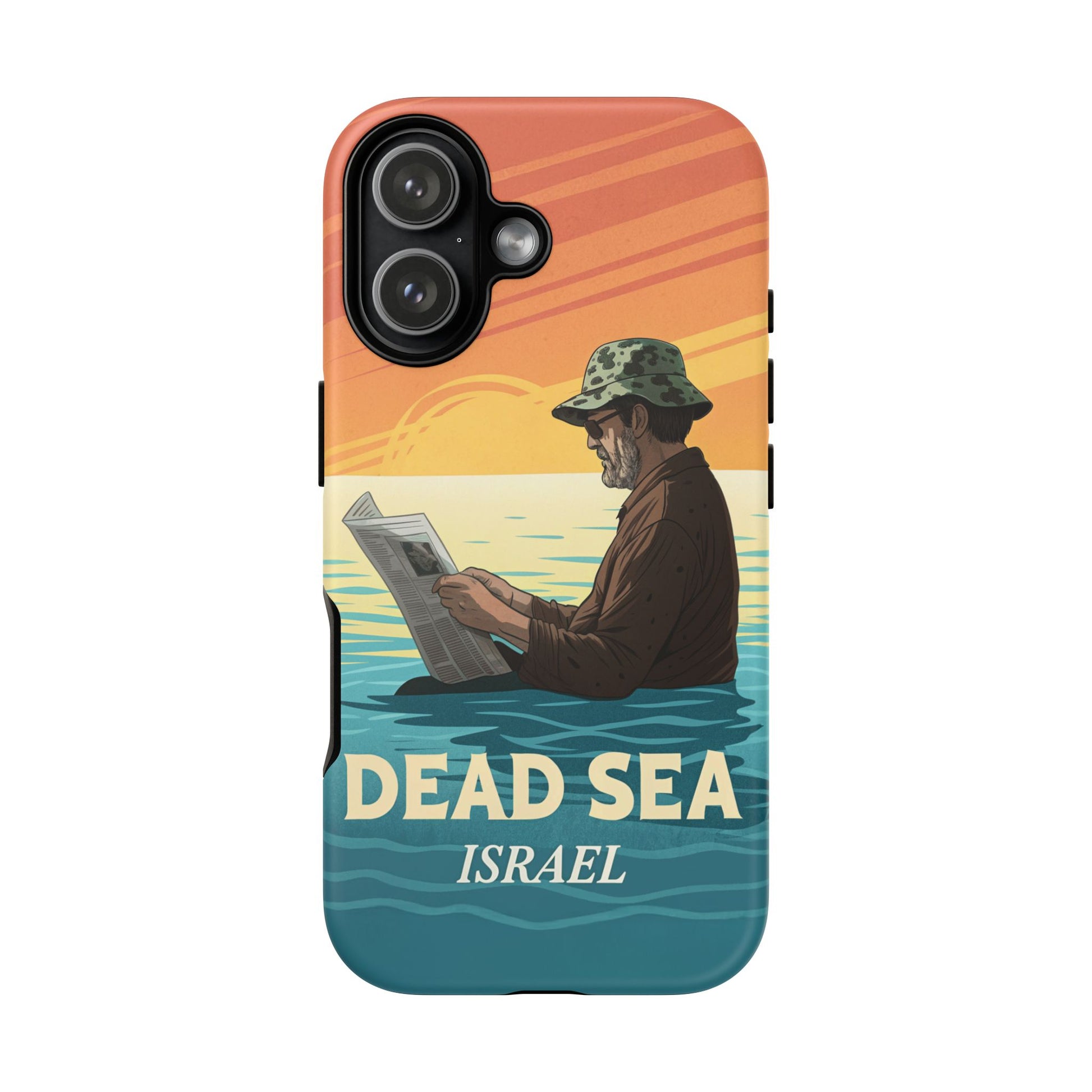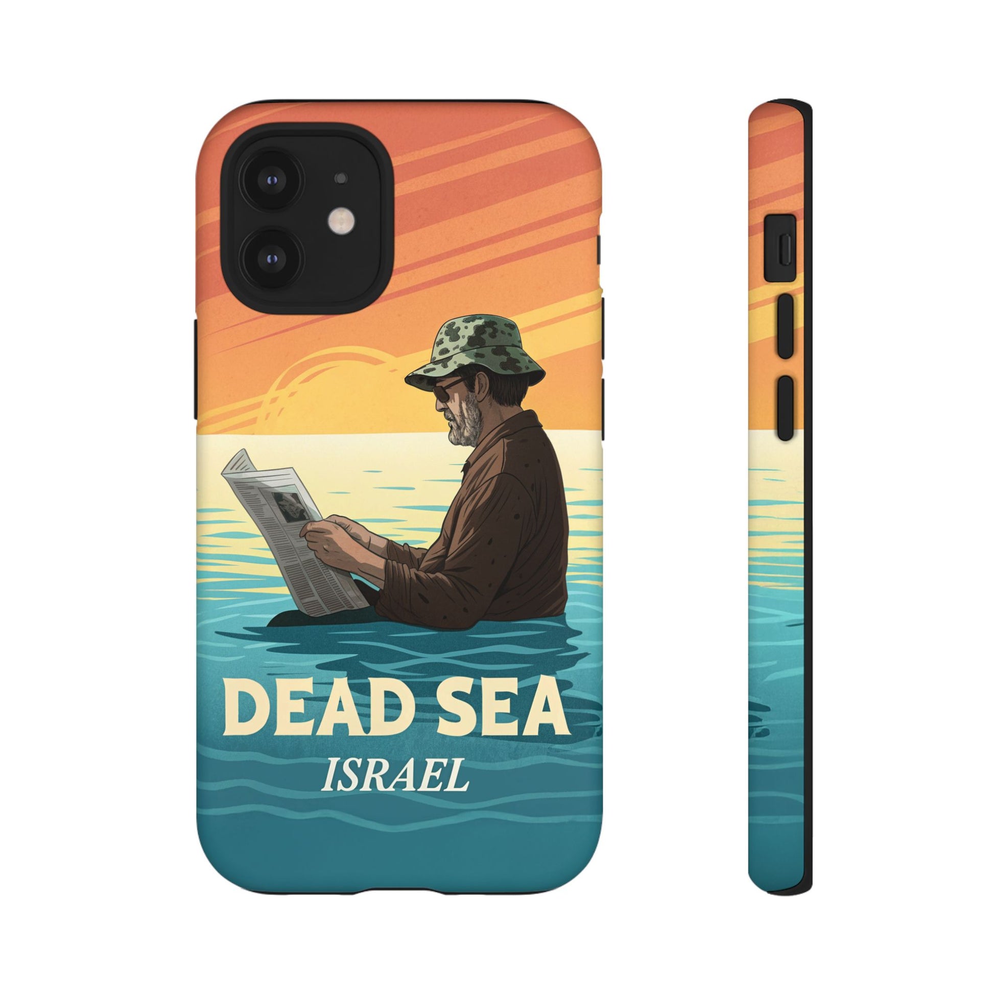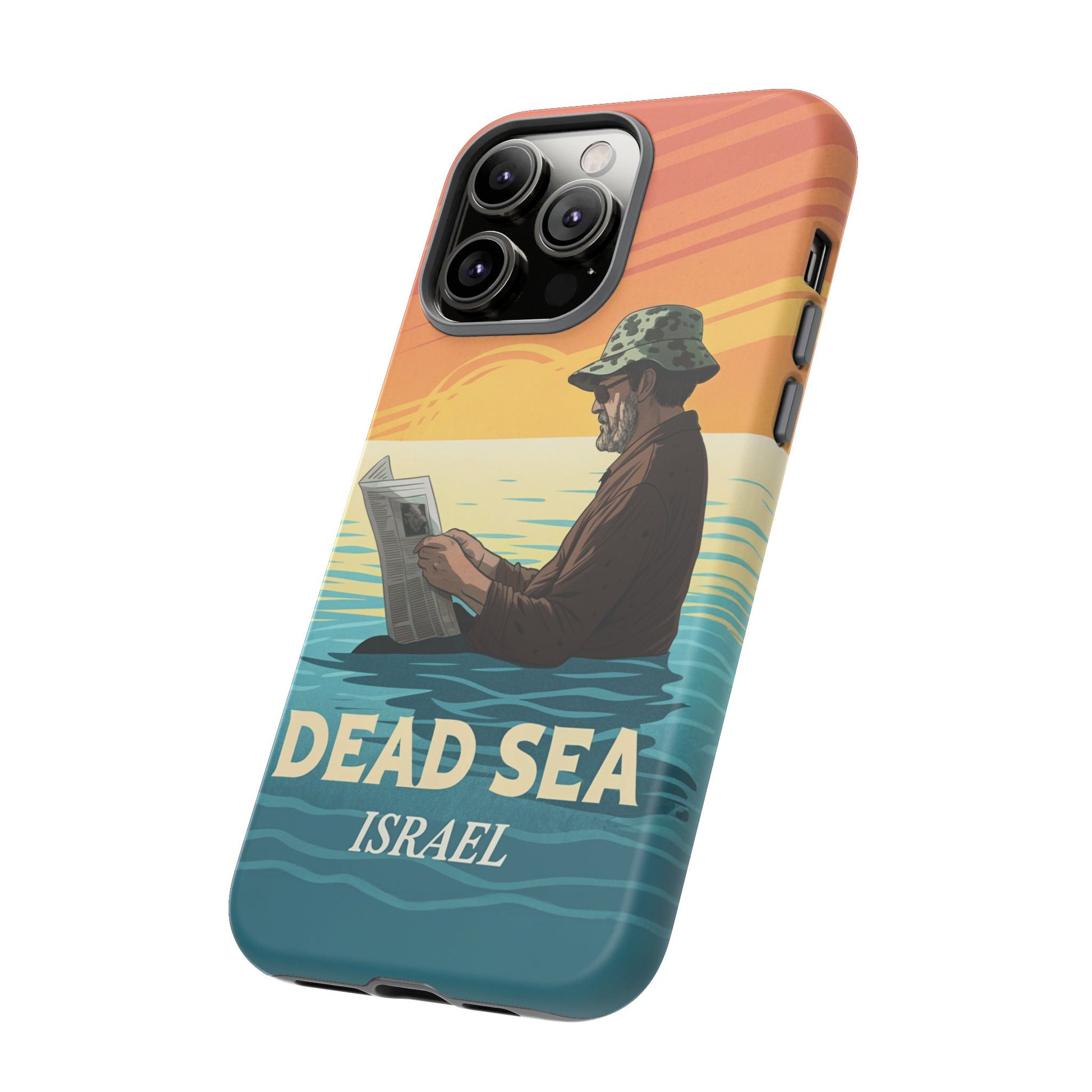 Ta med deg den rolige og ikoniske stemningen fra Dødehavet med dette kunstneriske mobildekselet. Designet viser en mann som sitter avslappet i det mineralrike vannet mens han leser avis – helt vektløs slik bare Dødehavet kan tilby. Den varme himmelen i oransje og gyldne toner gir motivet en vakker solnedgangsfølelse, mens de rolige blå bølgene skaper en perfekt kontrast. Et motiv som kombinerer humor, ro og tidløs reiselivssjarm fra Israel.
