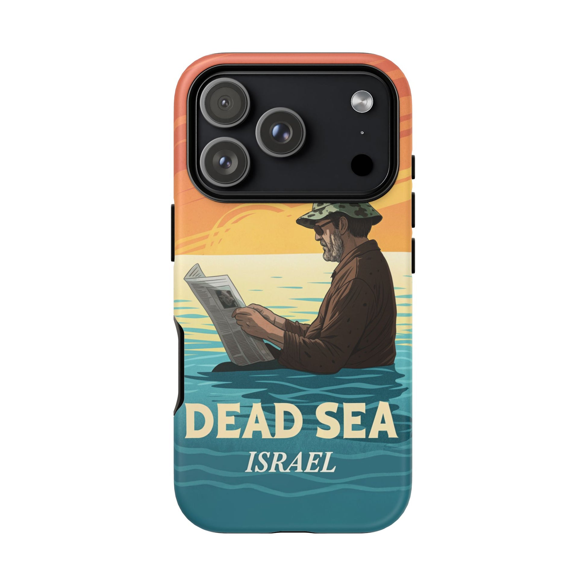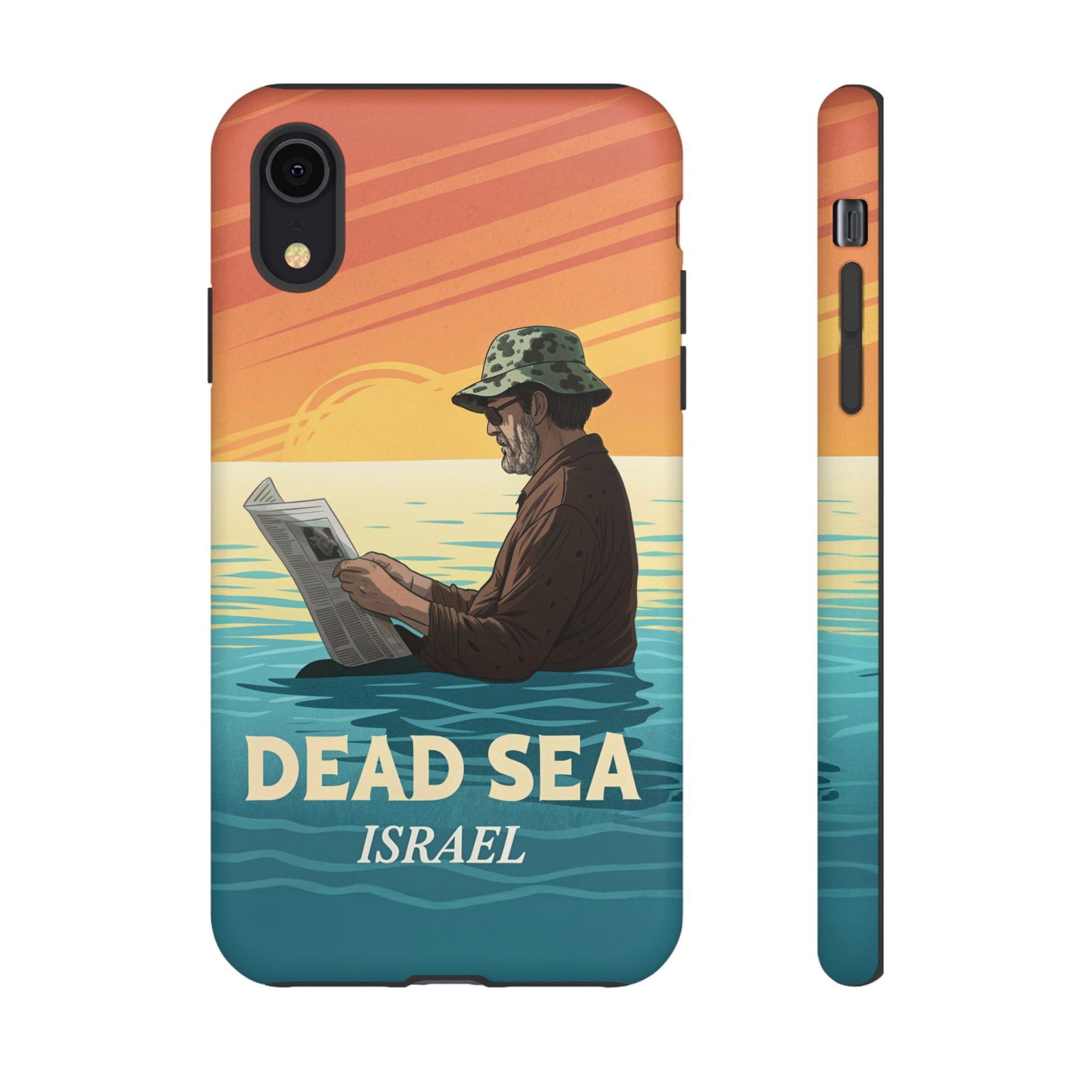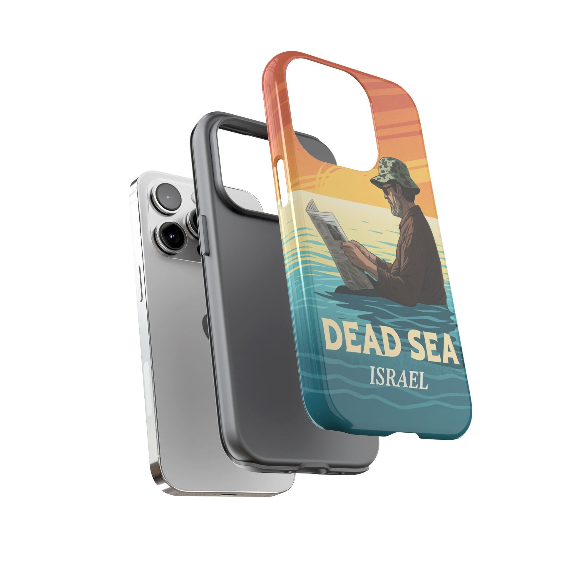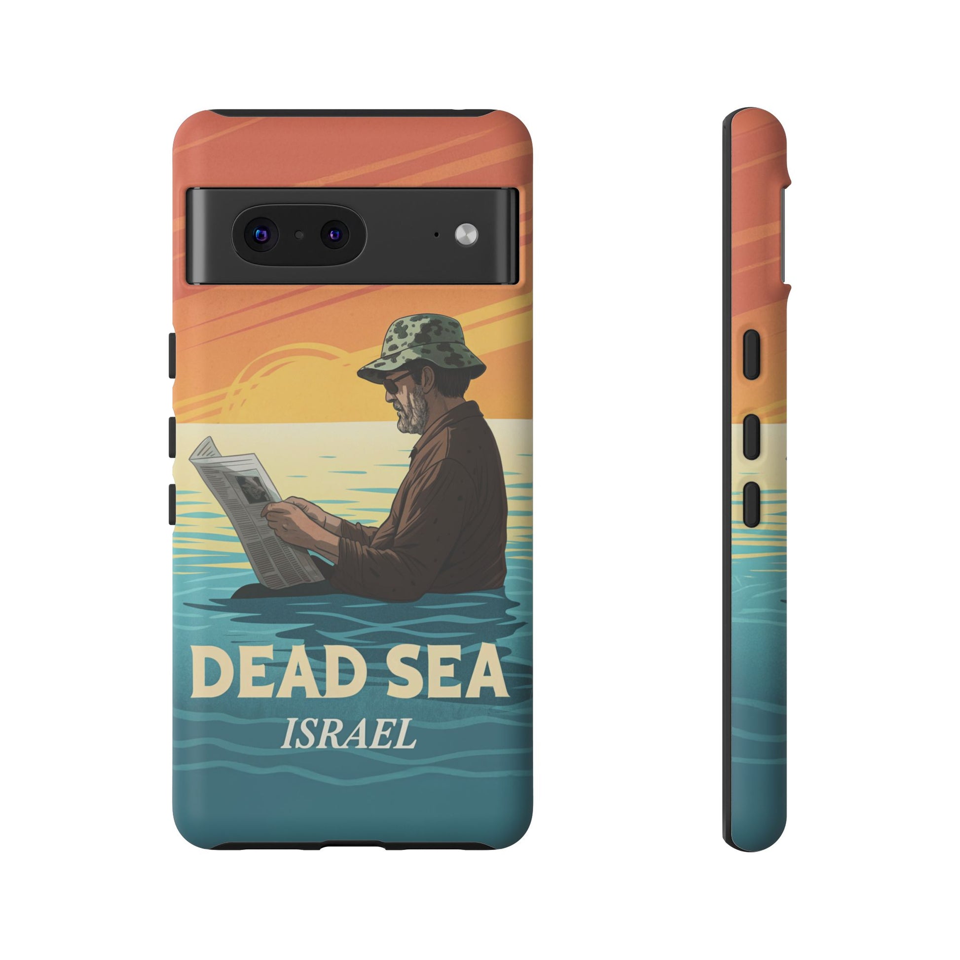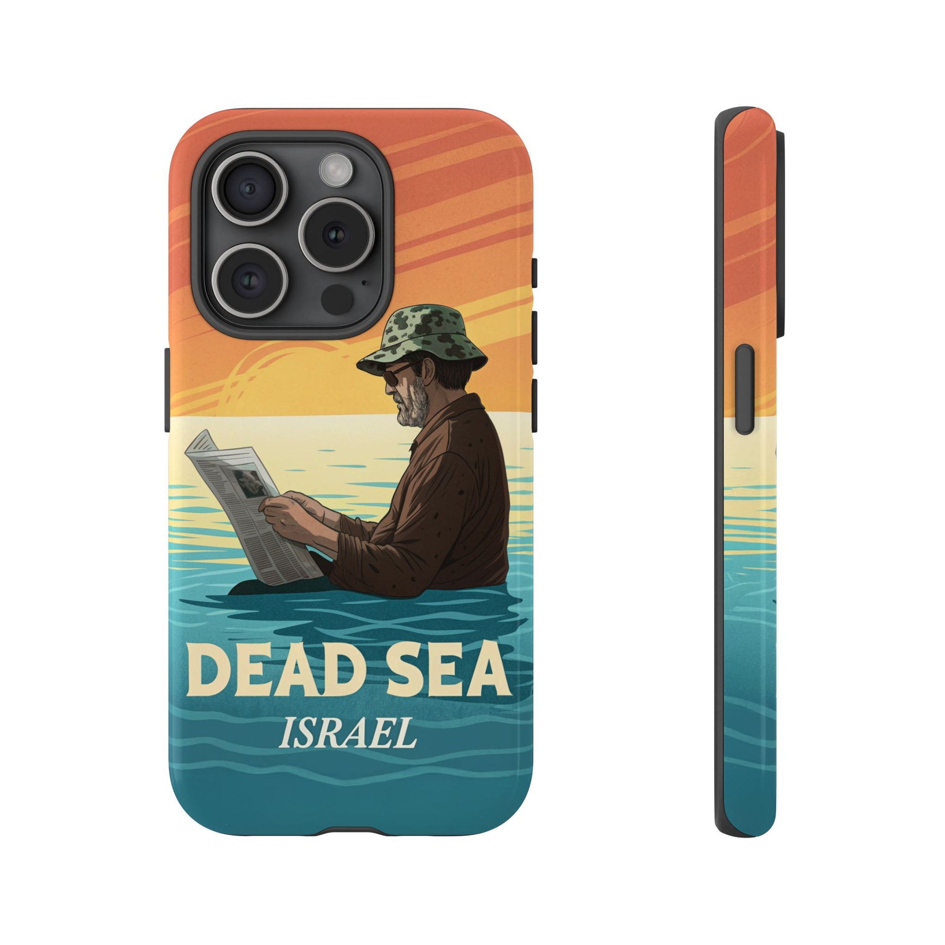 Ta med deg den rolige og ikoniske stemningen fra Dødehavet med dette kunstneriske mobildekselet. Designet viser en mann som sitter avslappet i det mineralrike vannet mens han leser avis – helt vektløs slik bare Dødehavet kan tilby. Den varme himmelen i oransje og gyldne toner gir motivet en vakker solnedgangsfølelse, mens de rolige blå bølgene skaper en perfekt kontrast. Et motiv som kombinerer humor, ro og tidløs reiselivssjarm fra Israel.