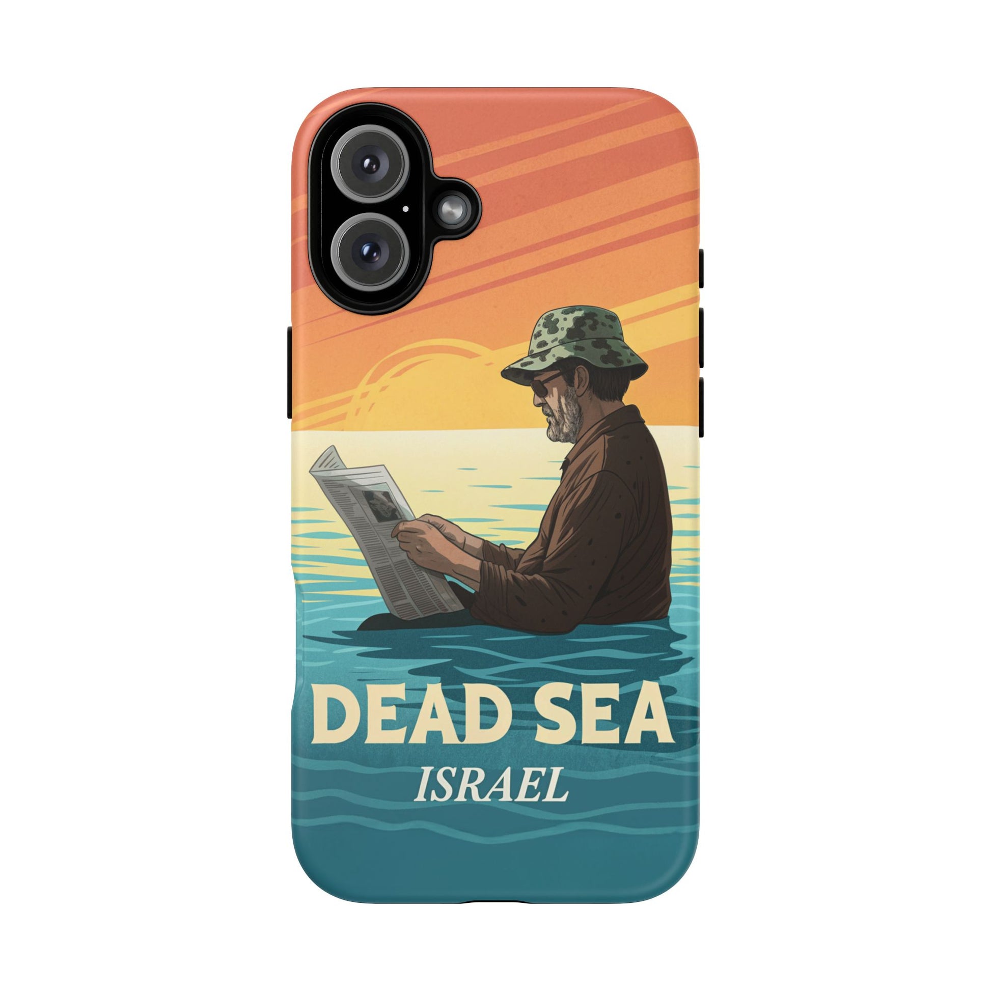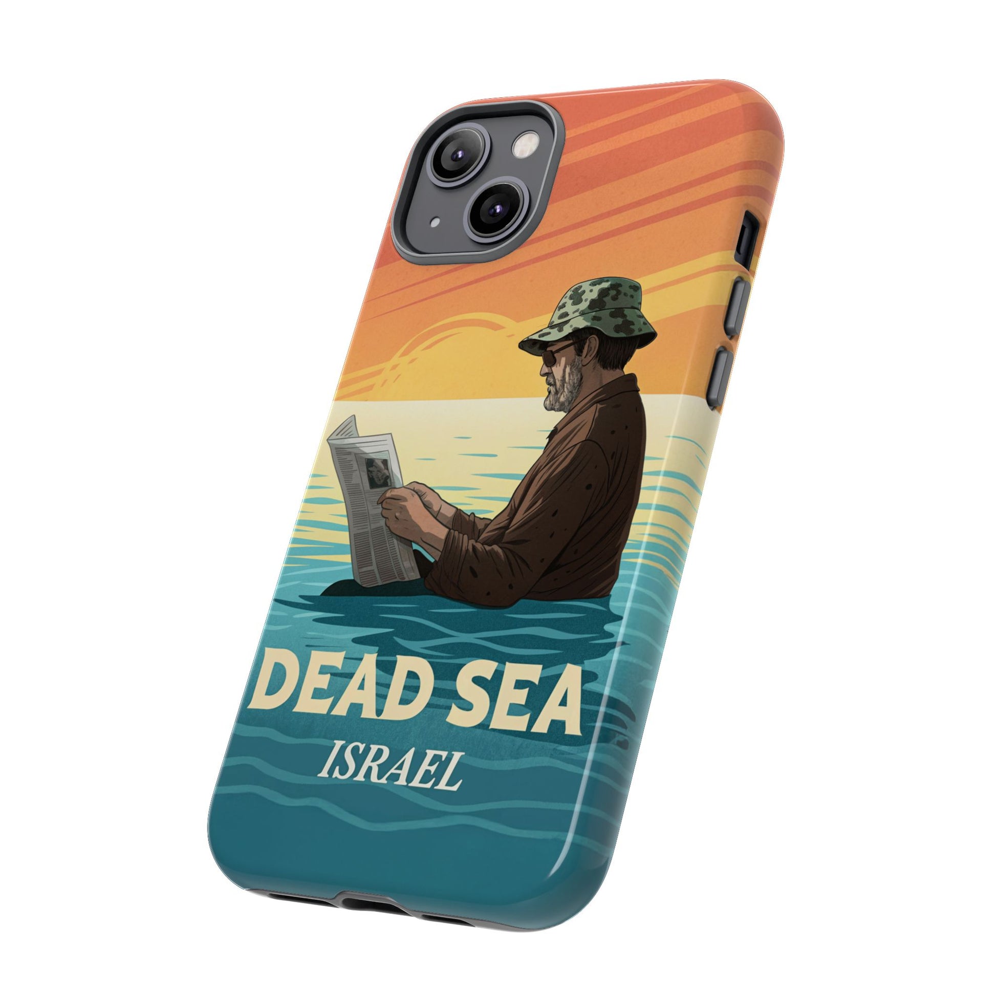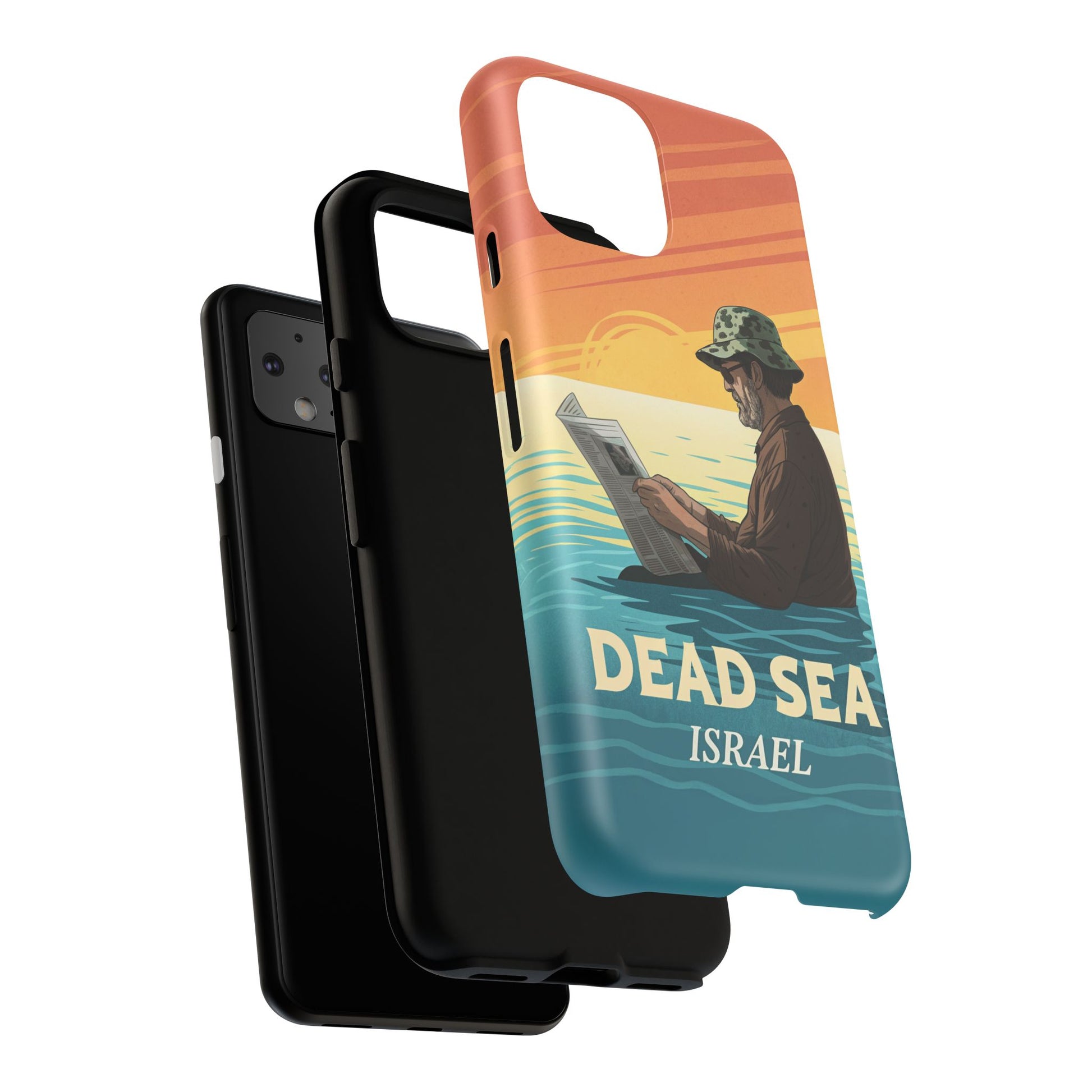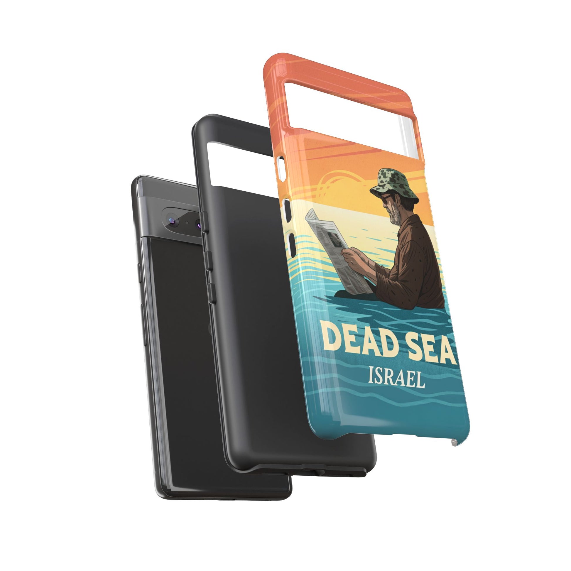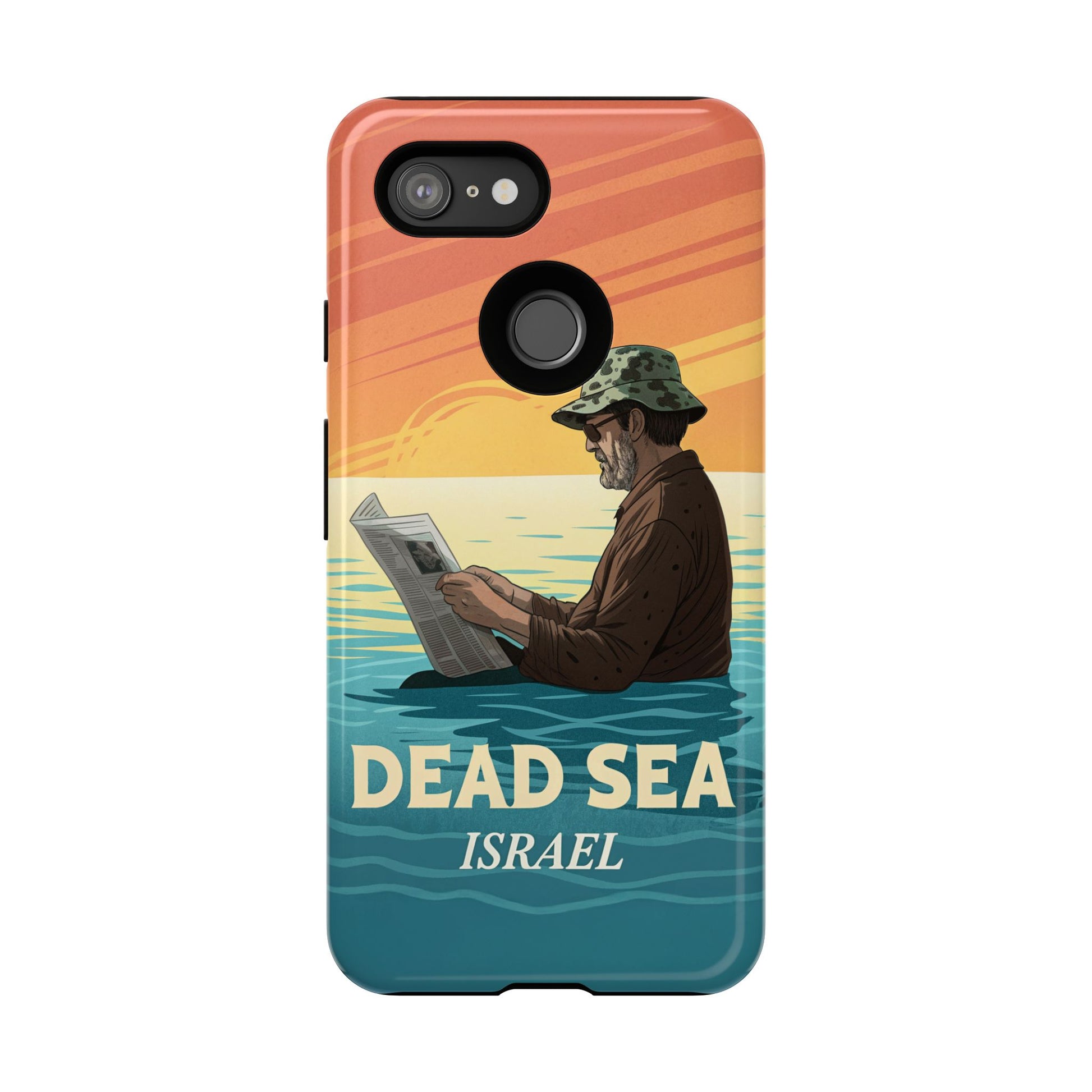 Ta med deg den rolige og ikoniske stemningen fra Dødehavet med dette kunstneriske mobildekselet. Designet viser en mann som sitter avslappet i det mineralrike vannet mens han leser avis – helt vektløs slik bare Dødehavet kan tilby. Den varme himmelen i oransje og gyldne toner gir motivet en vakker solnedgangsfølelse, mens de rolige blå bølgene skaper en perfekt kontrast. Et motiv som kombinerer humor, ro og tidløs reiselivssjarm fra Israel.
