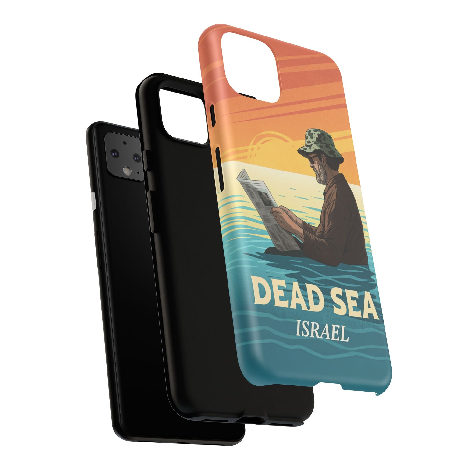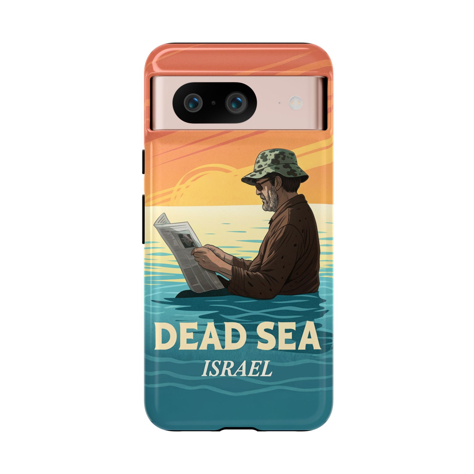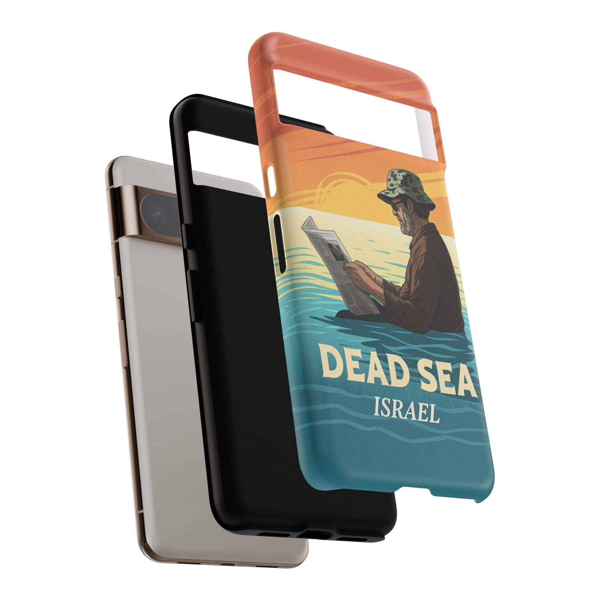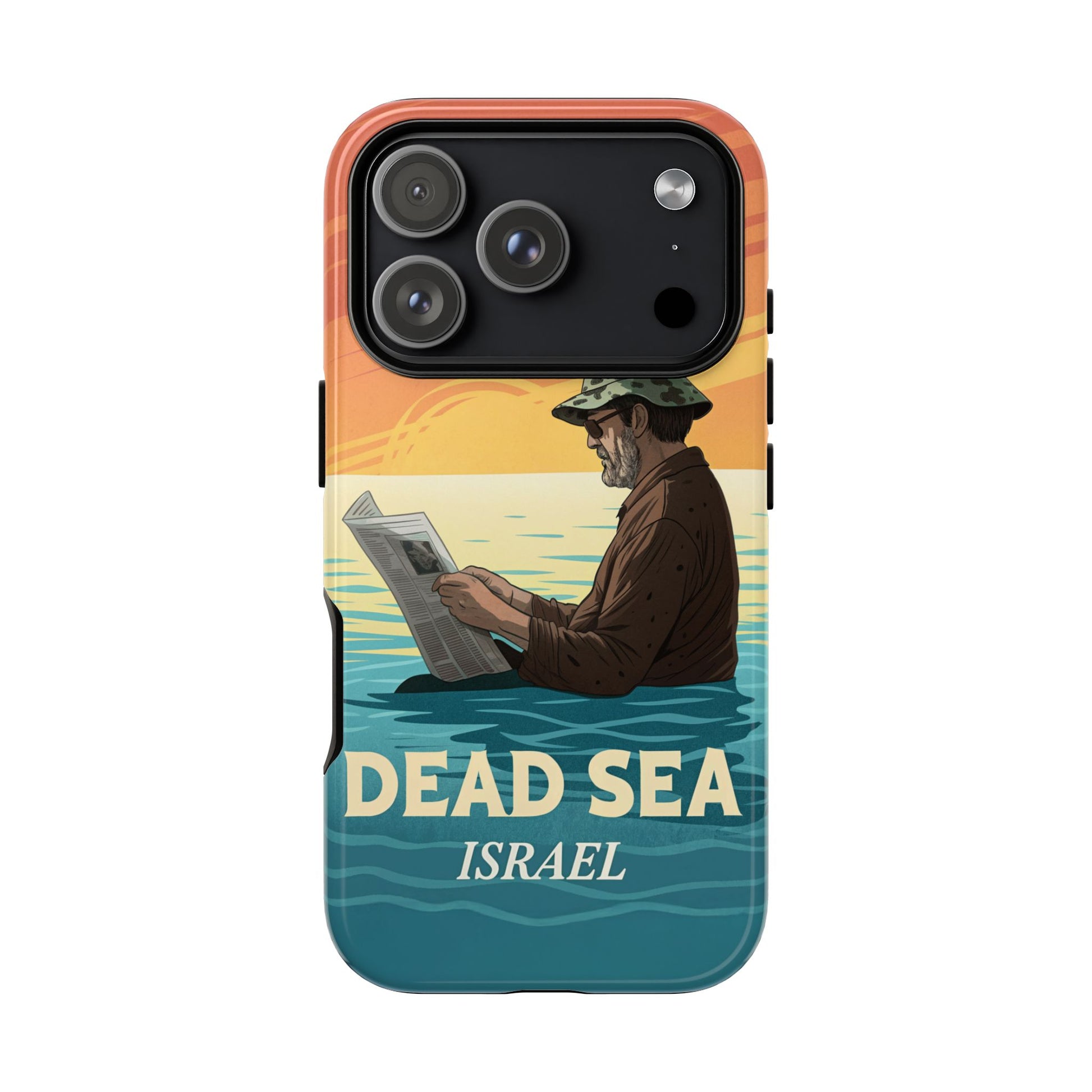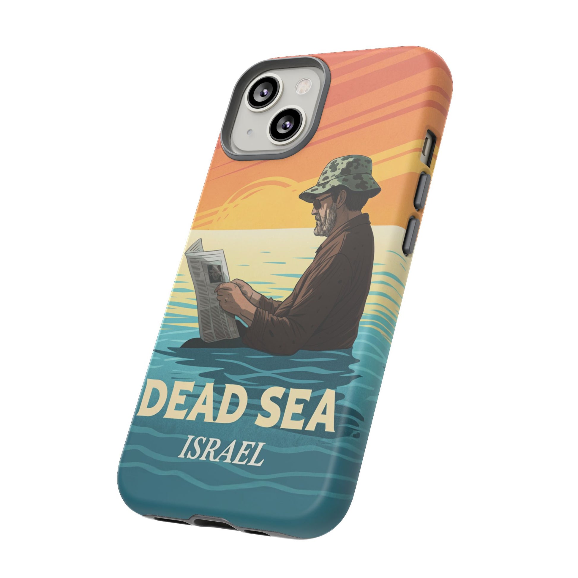 Ta med deg den rolige og ikoniske stemningen fra Dødehavet med dette kunstneriske mobildekselet. Designet viser en mann som sitter avslappet i det mineralrike vannet mens han leser avis – helt vektløs slik bare Dødehavet kan tilby. Den varme himmelen i oransje og gyldne toner gir motivet en vakker solnedgangsfølelse, mens de rolige blå bølgene skaper en perfekt kontrast. Et motiv som kombinerer humor, ro og tidløs reiselivssjarm fra Israel.