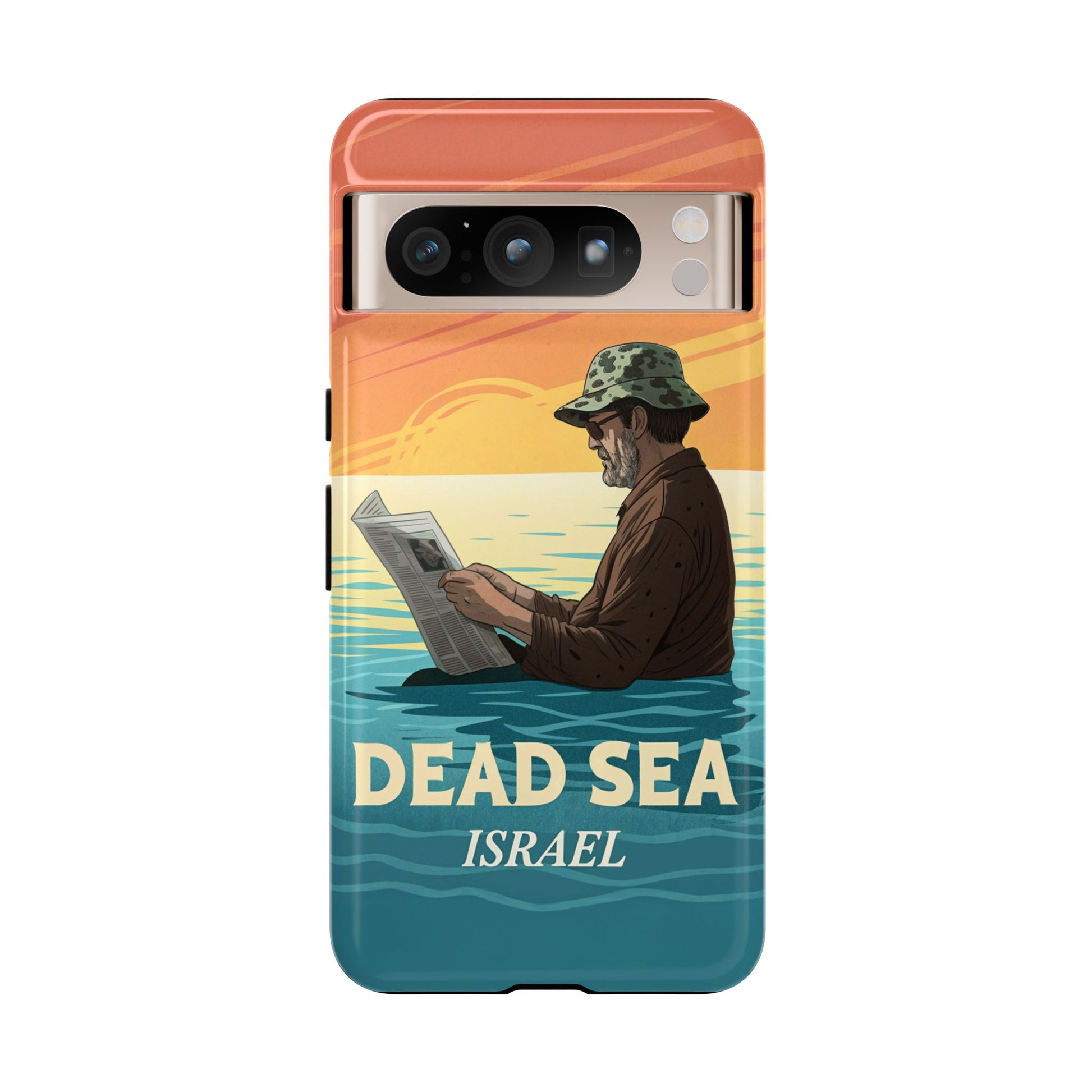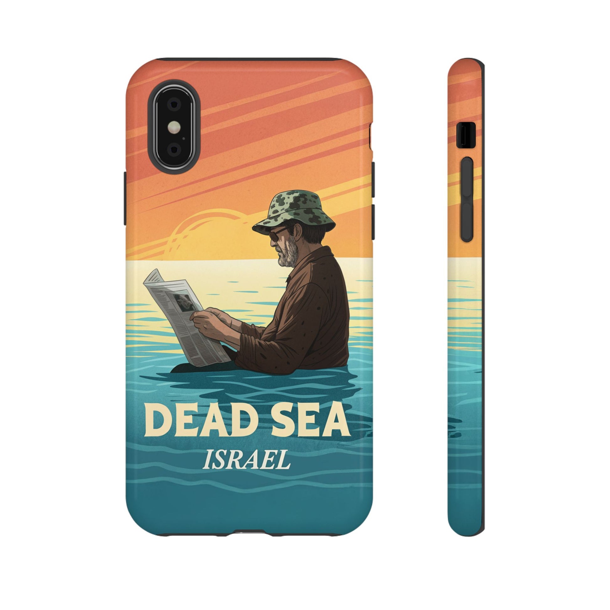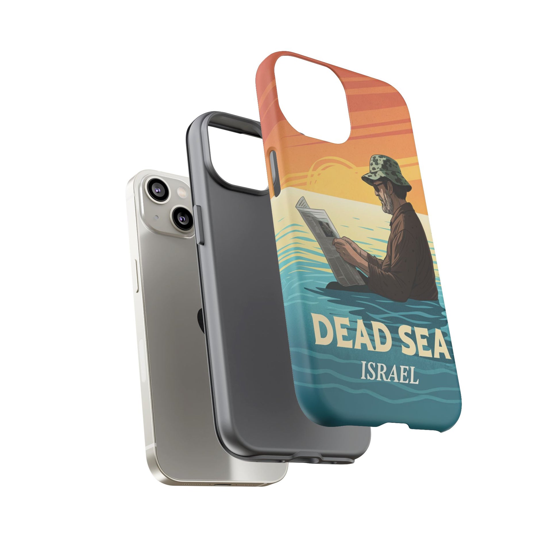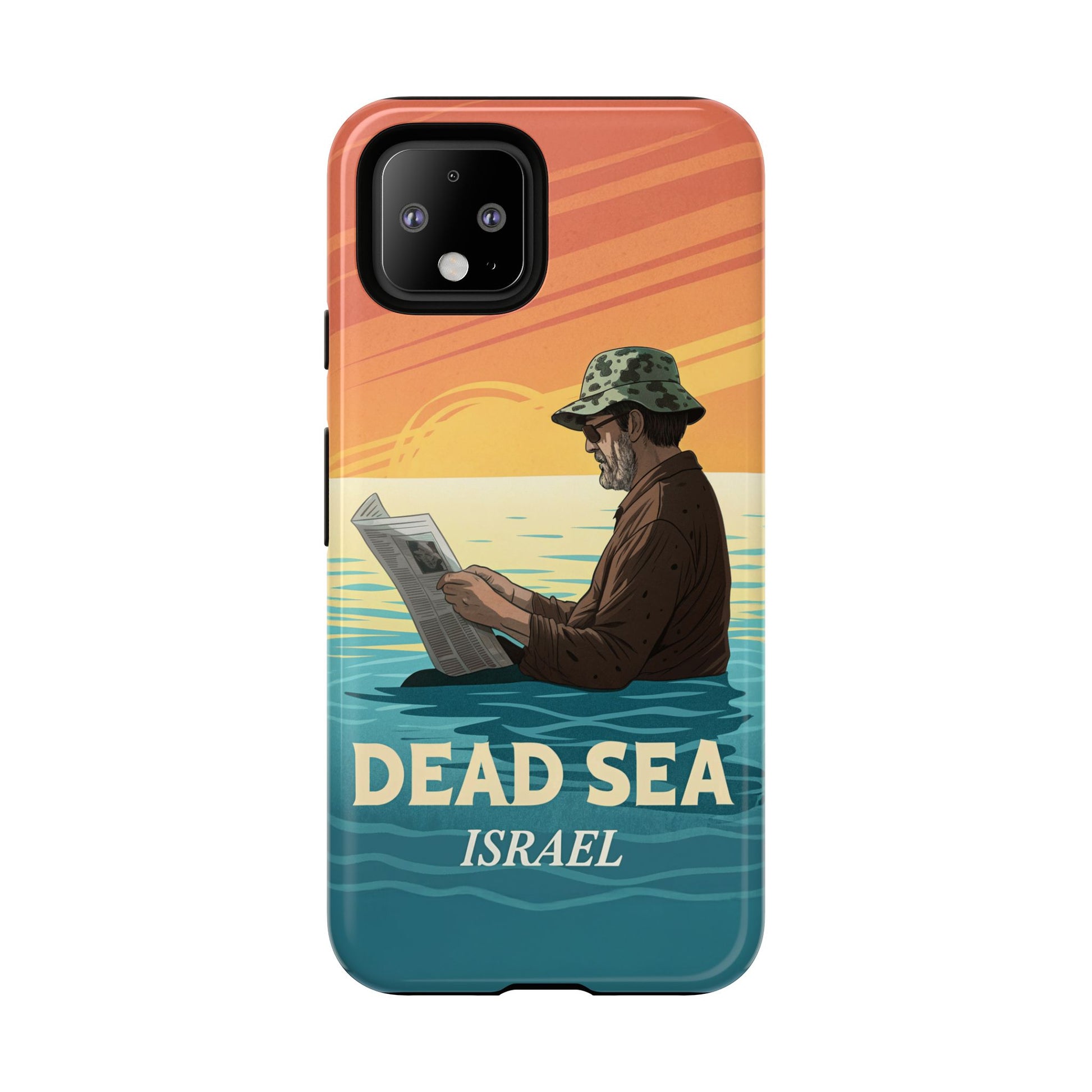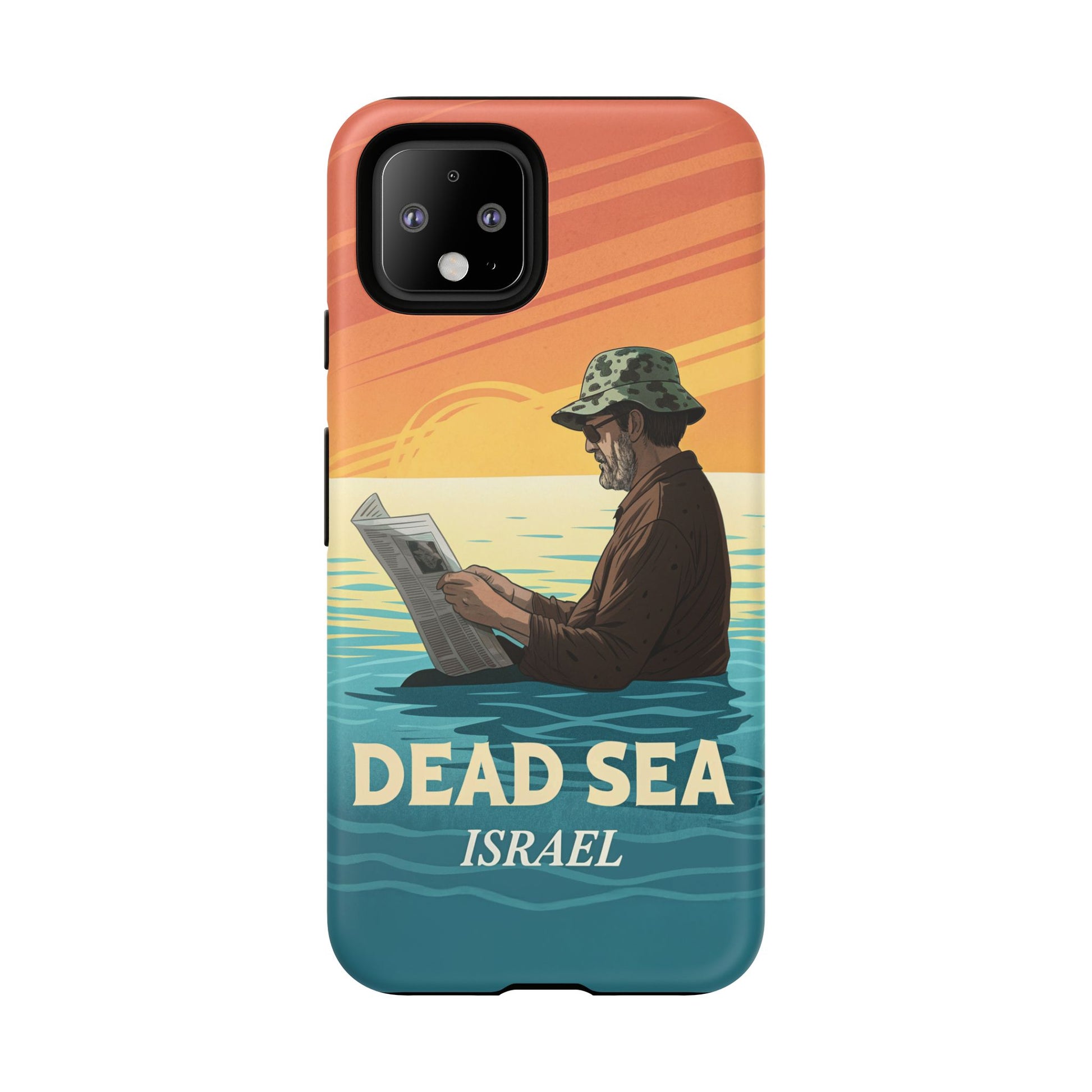 Ta med deg den rolige og ikoniske stemningen fra Dødehavet med dette kunstneriske mobildekselet. Designet viser en mann som sitter avslappet i det mineralrike vannet mens han leser avis – helt vektløs slik bare Dødehavet kan tilby. Den varme himmelen i oransje og gyldne toner gir motivet en vakker solnedgangsfølelse, mens de rolige blå bølgene skaper en perfekt kontrast. Et motiv som kombinerer humor, ro og tidløs reiselivssjarm fra Israel.