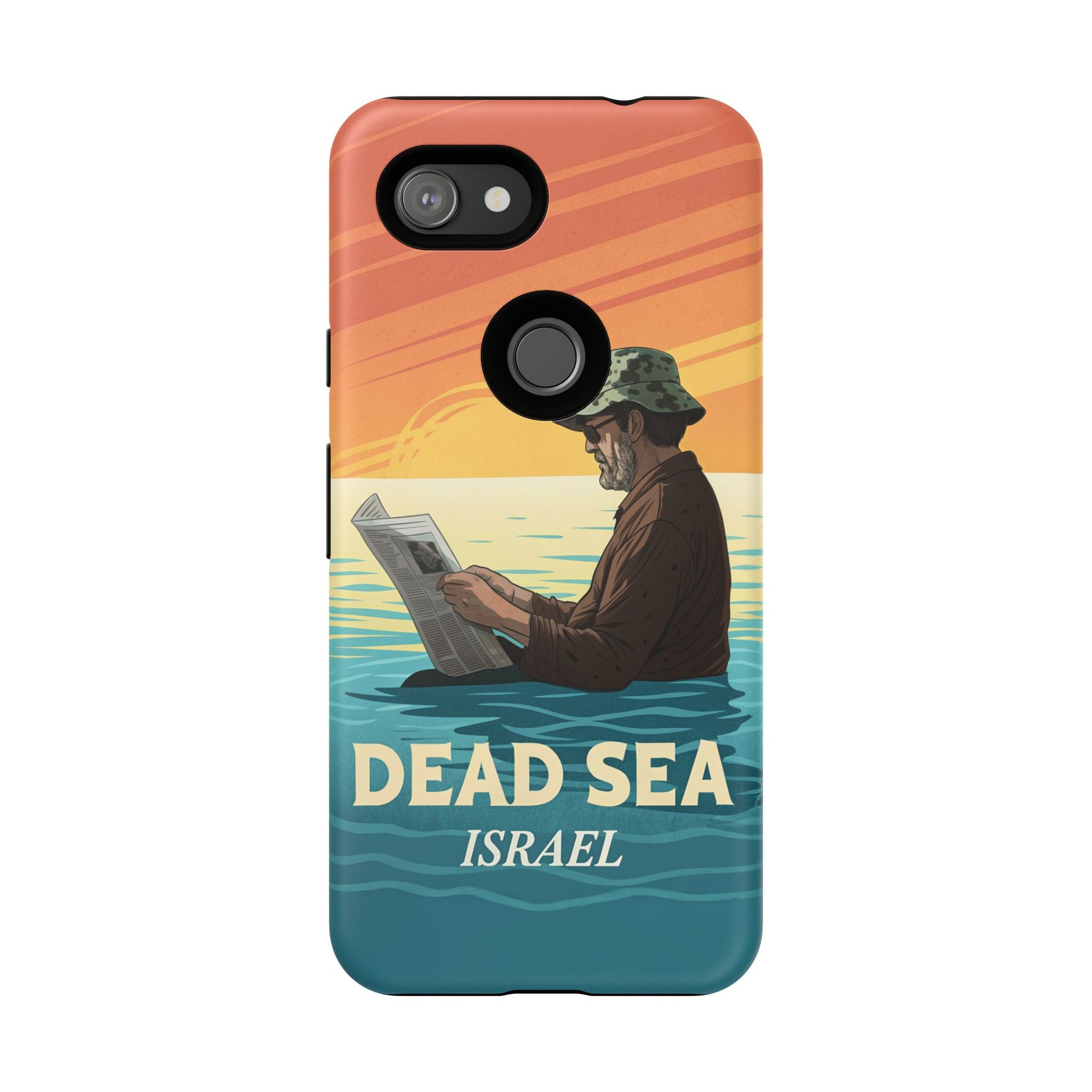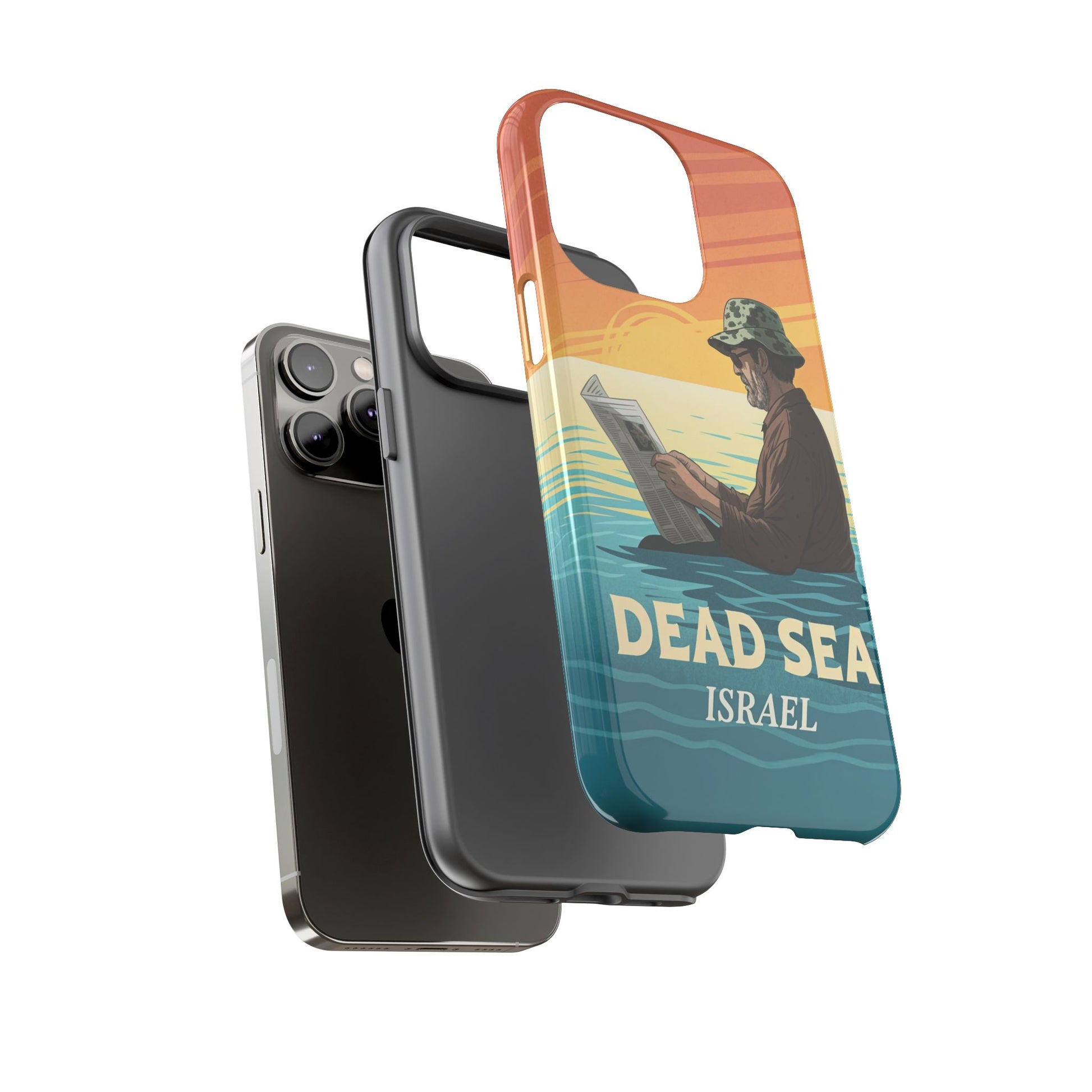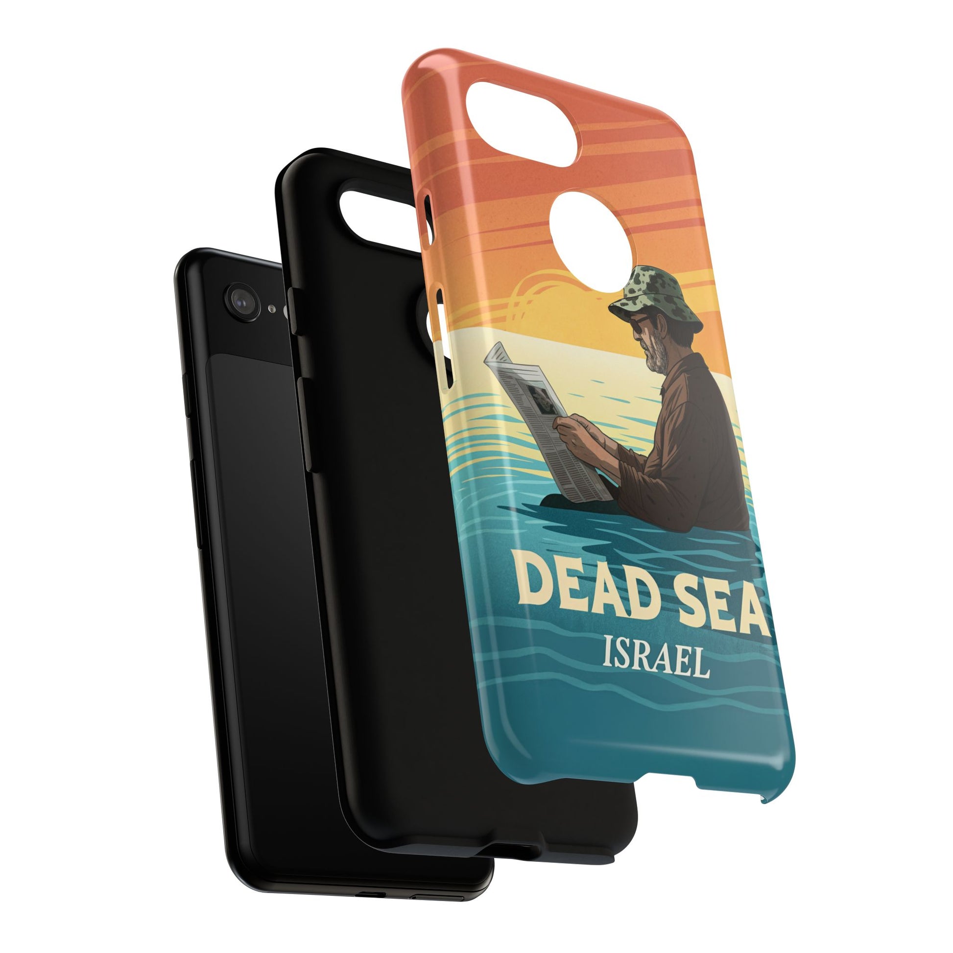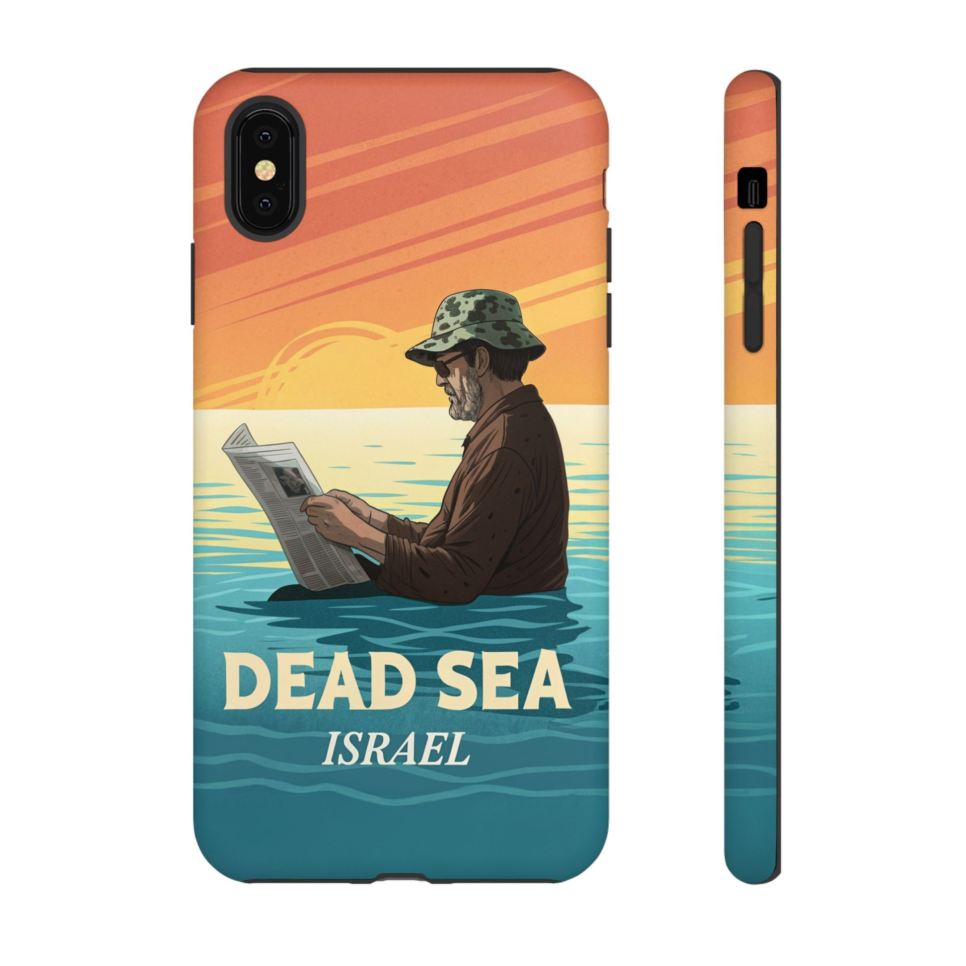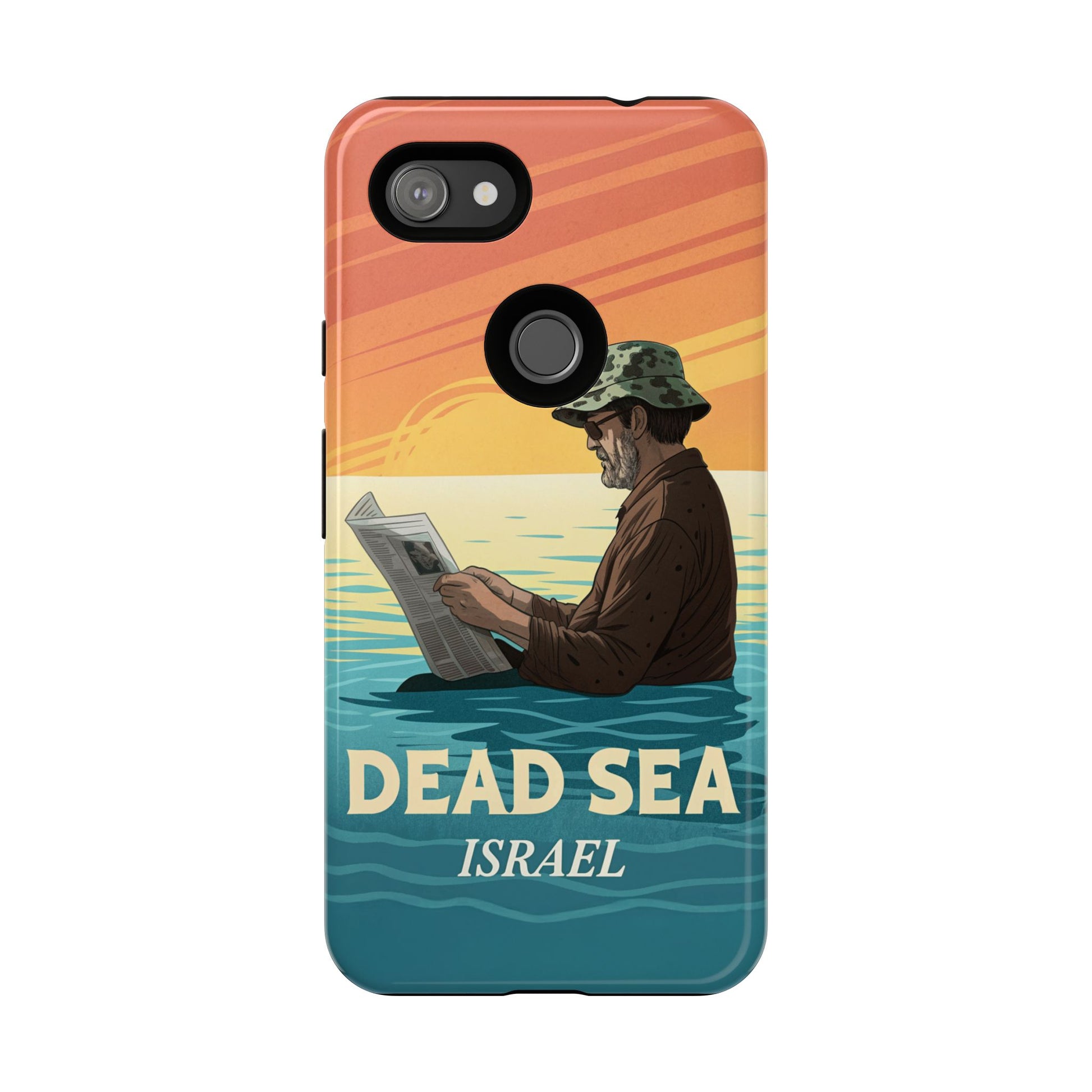 Ta med deg den rolige og ikoniske stemningen fra Dødehavet med dette kunstneriske mobildekselet. Designet viser en mann som sitter avslappet i det mineralrike vannet mens han leser avis – helt vektløs slik bare Dødehavet kan tilby. Den varme himmelen i oransje og gyldne toner gir motivet en vakker solnedgangsfølelse, mens de rolige blå bølgene skaper en perfekt kontrast. Et motiv som kombinerer humor, ro og tidløs reiselivssjarm fra Israel.