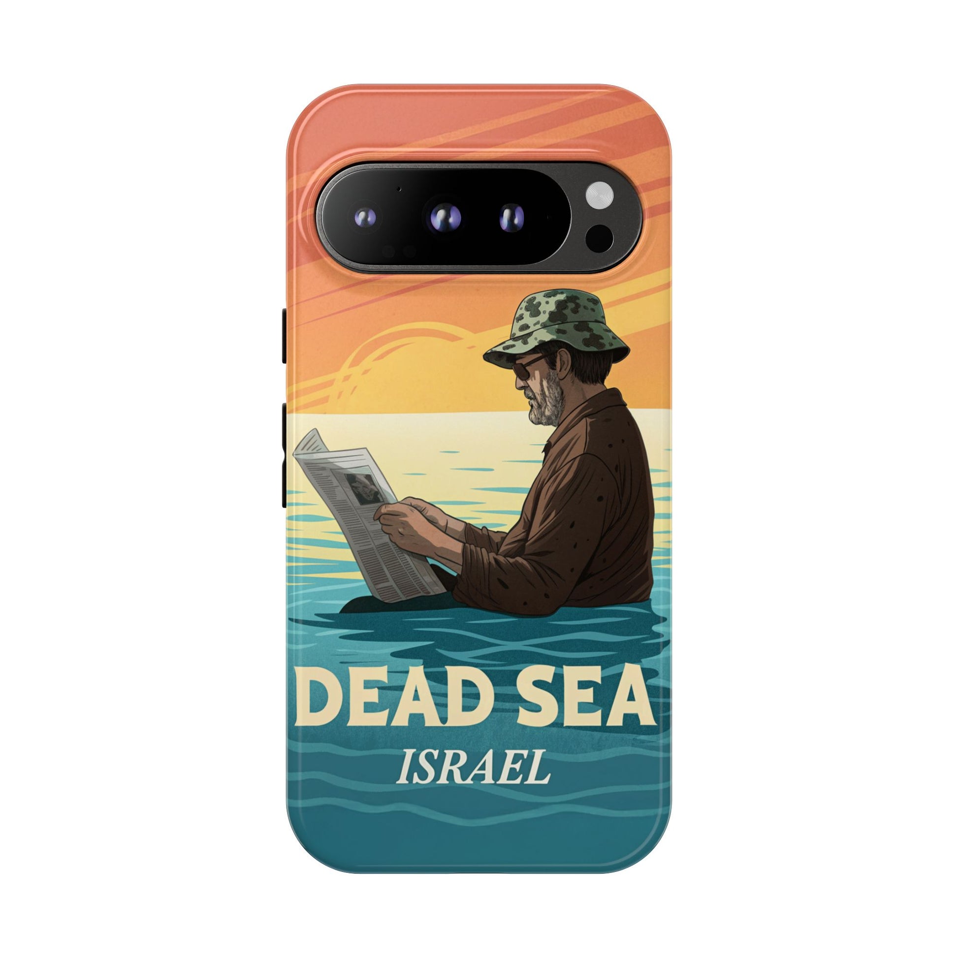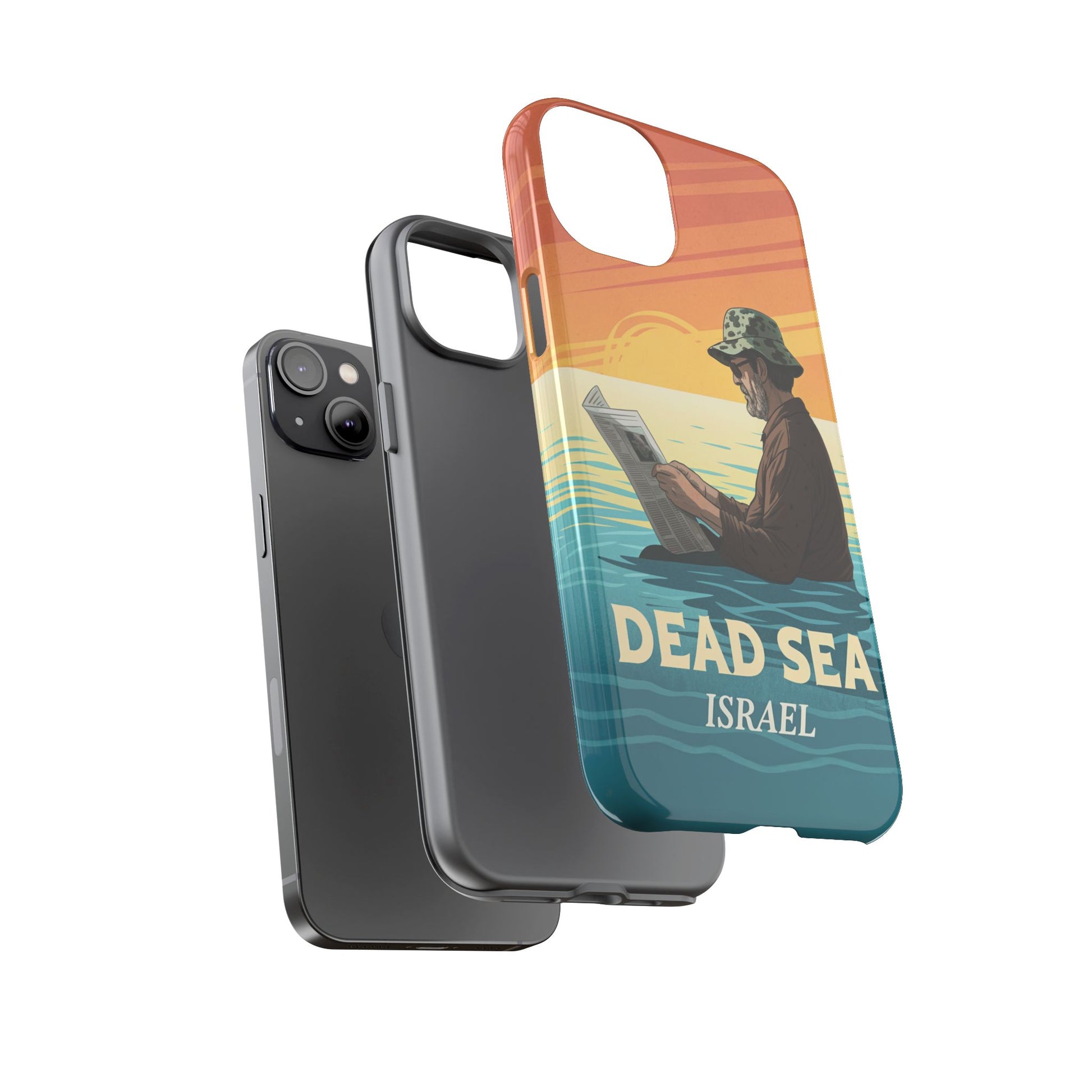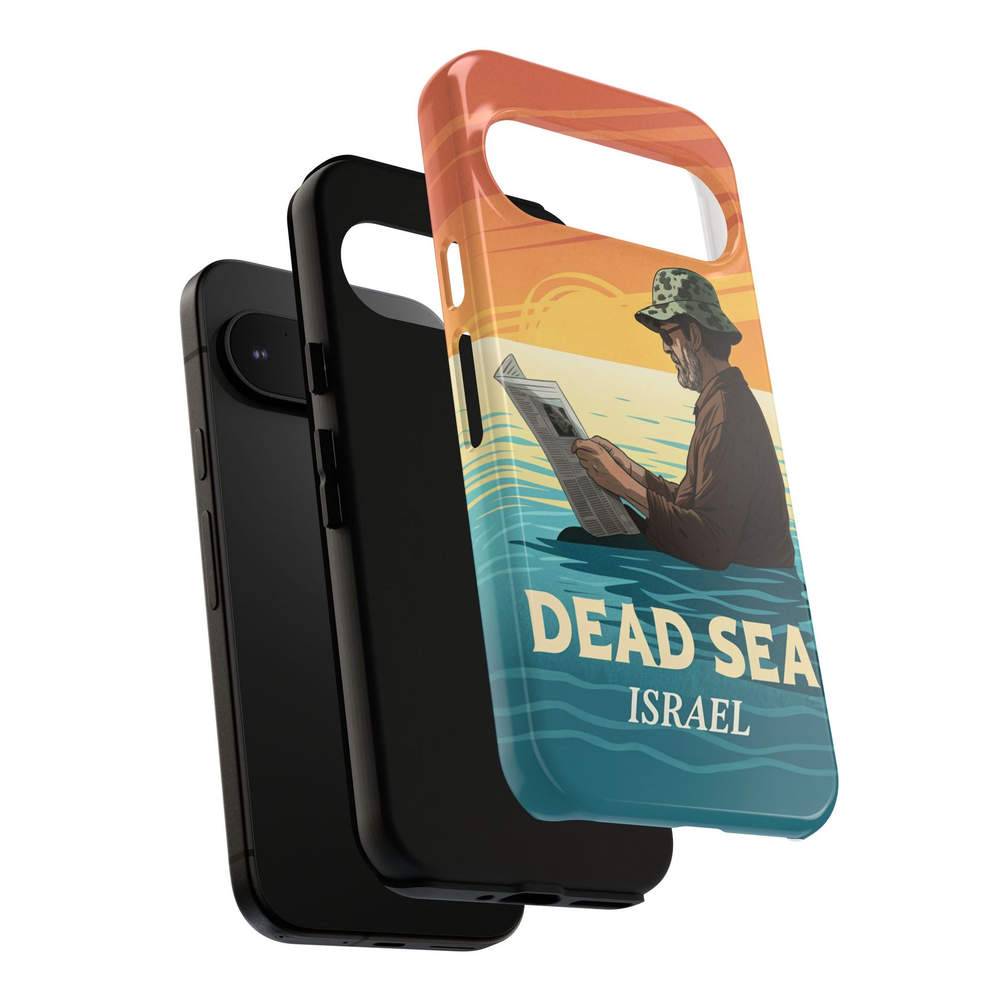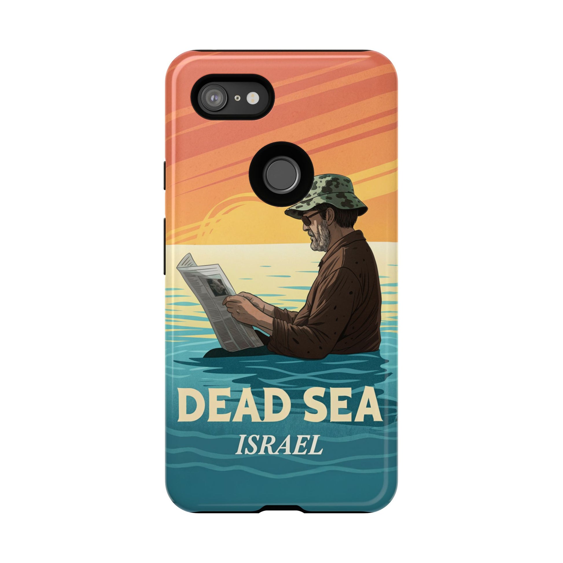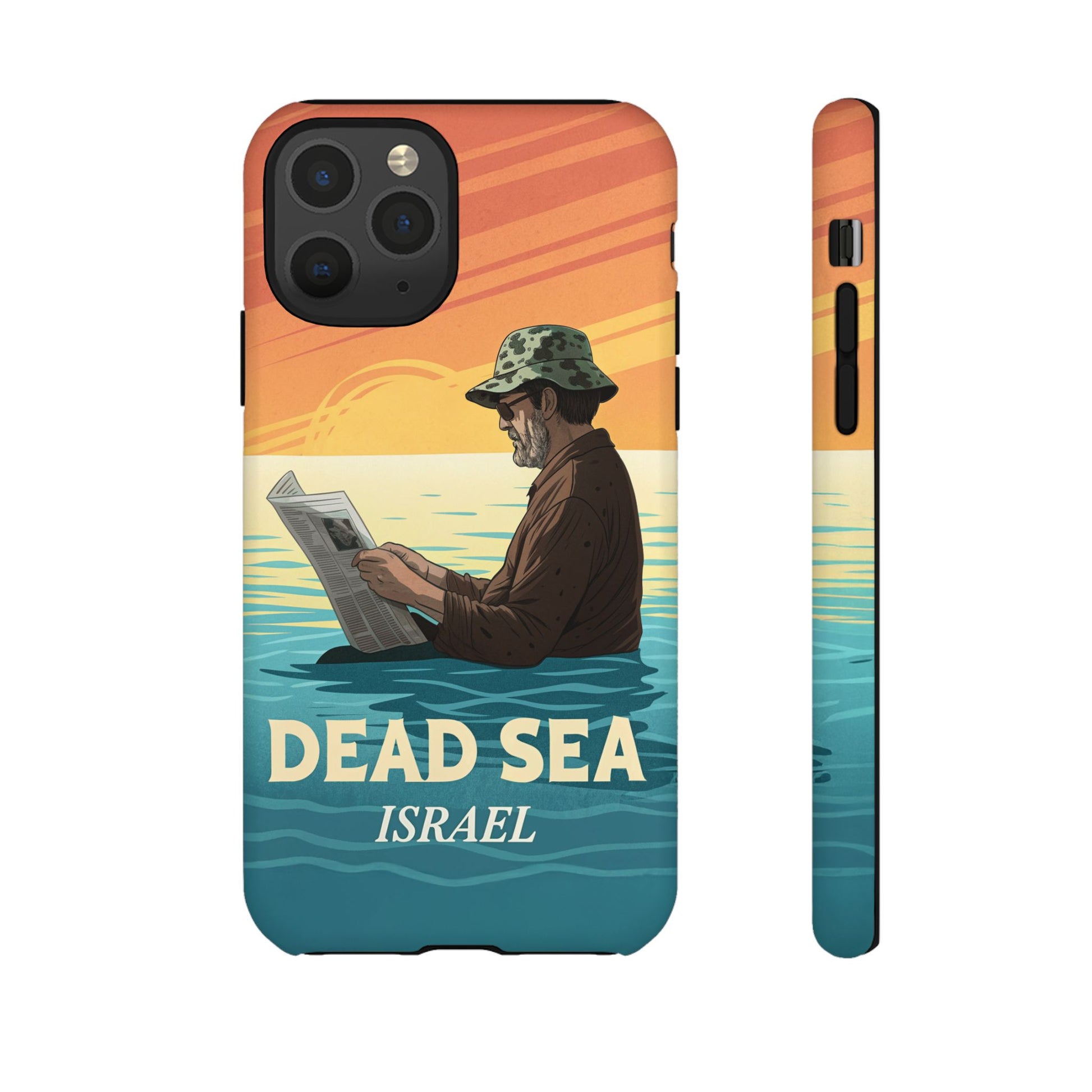 Ta med deg den rolige og ikoniske stemningen fra Dødehavet med dette kunstneriske mobildekselet. Designet viser en mann som sitter avslappet i det mineralrike vannet mens han leser avis – helt vektløs slik bare Dødehavet kan tilby. Den varme himmelen i oransje og gyldne toner gir motivet en vakker solnedgangsfølelse, mens de rolige blå bølgene skaper en perfekt kontrast. Et motiv som kombinerer humor, ro og tidløs reiselivssjarm fra Israel.