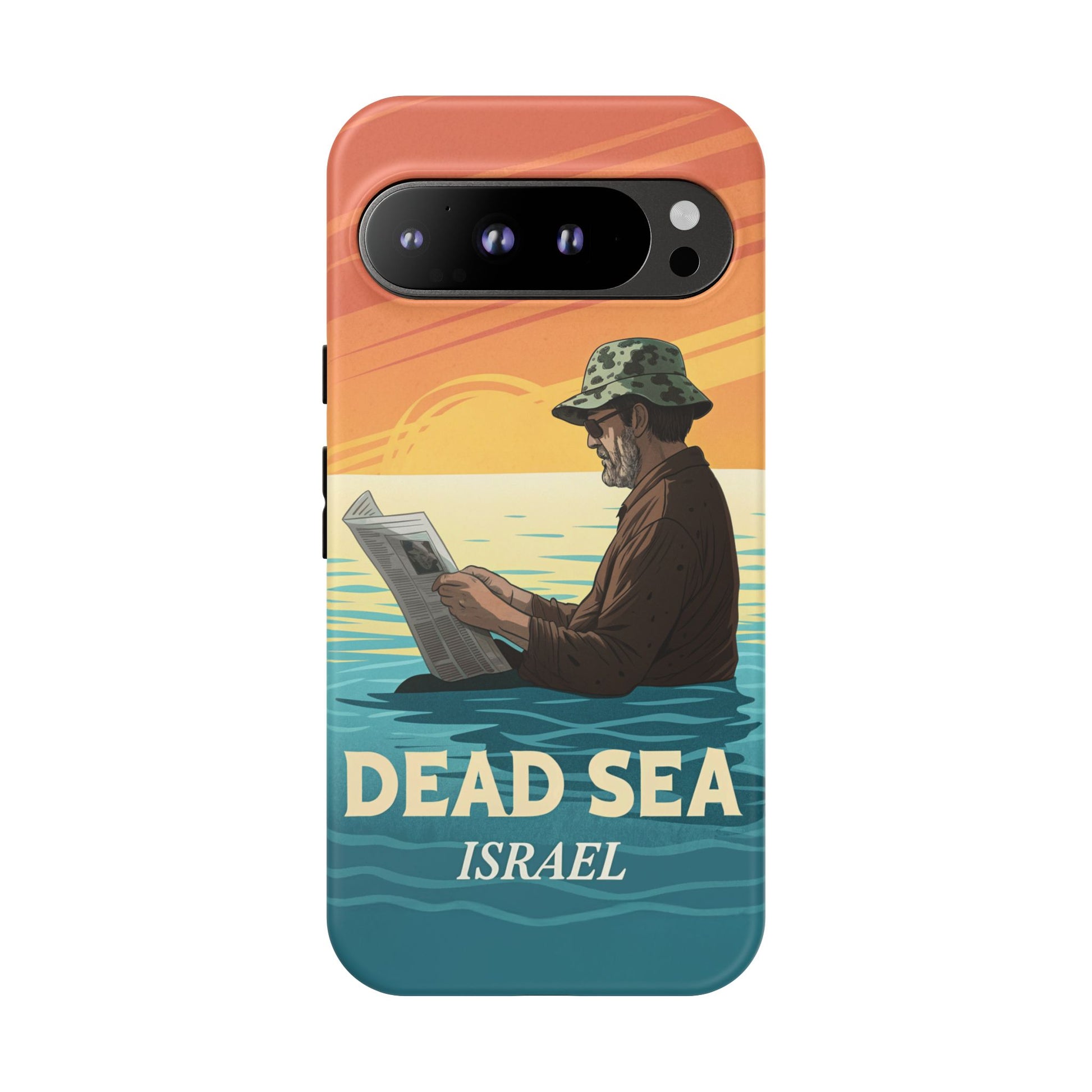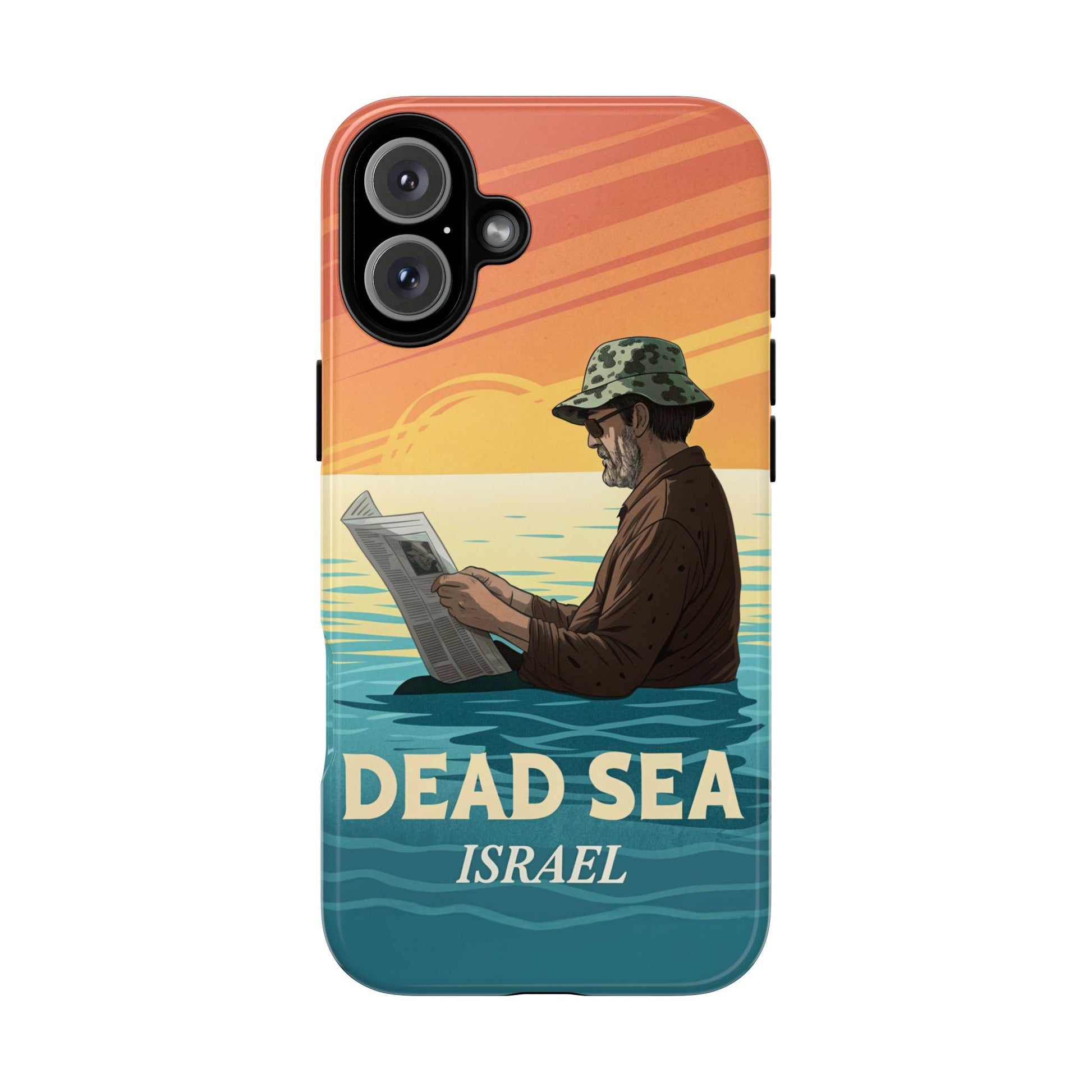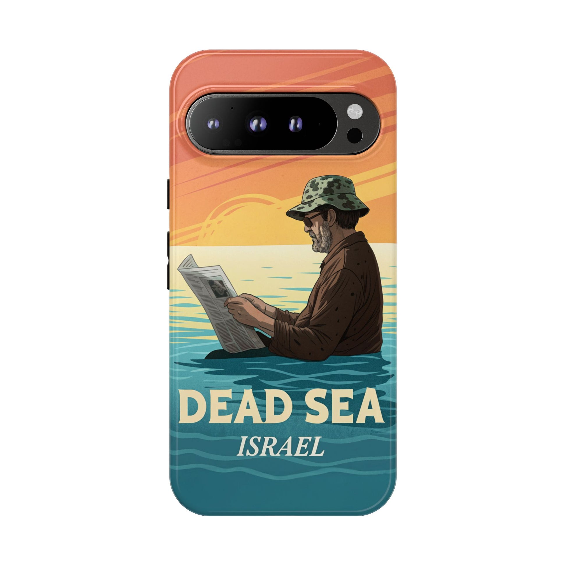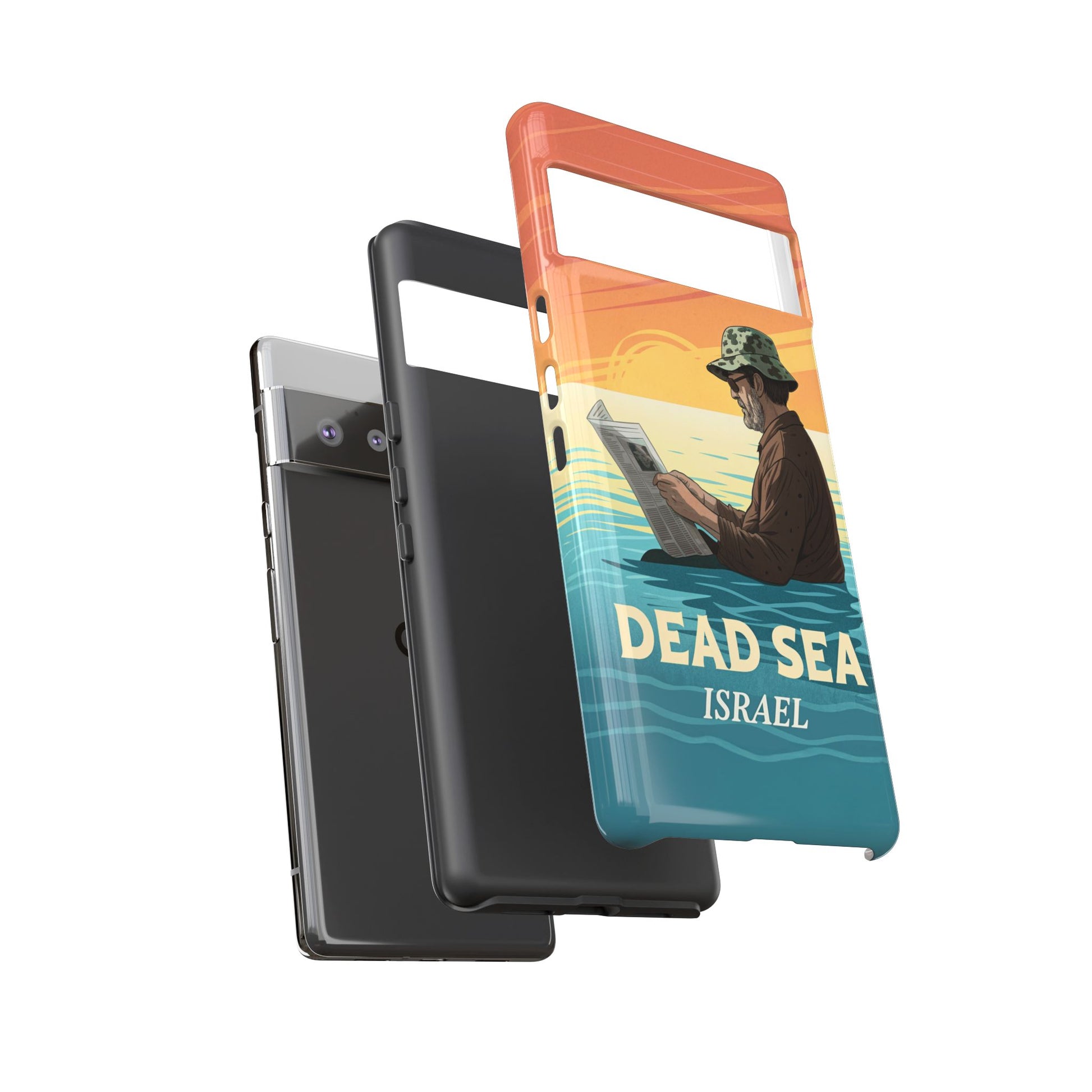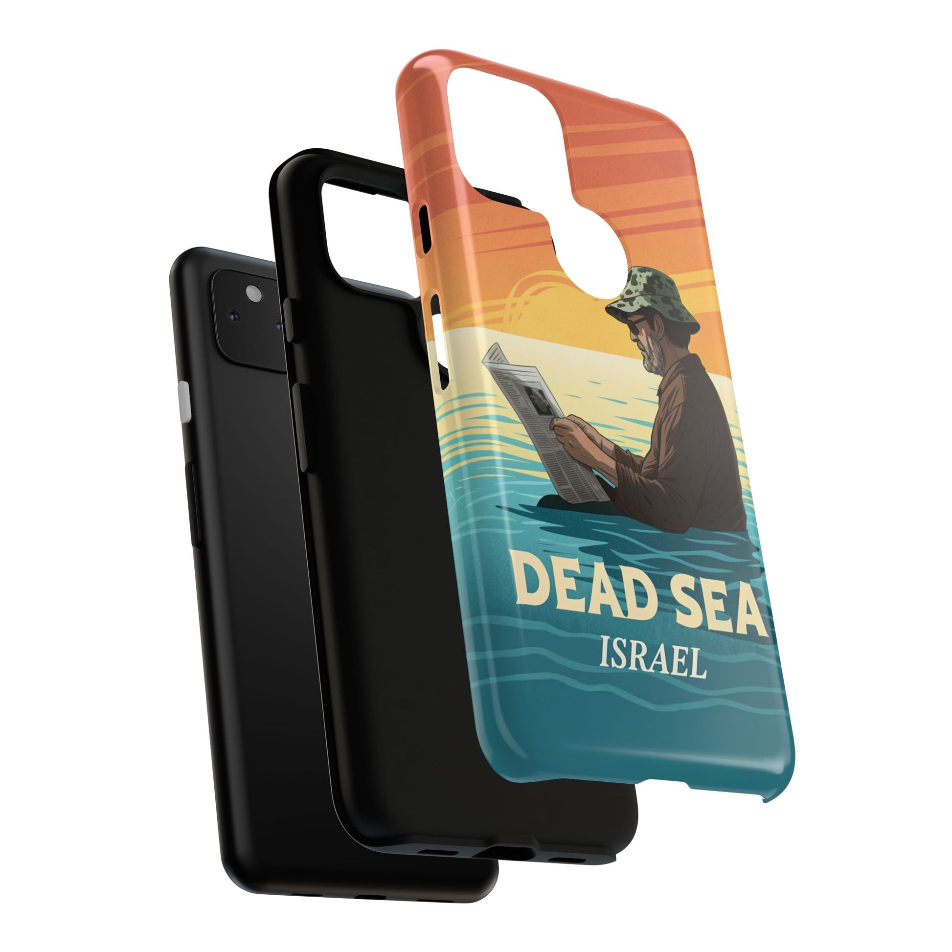 Ta med deg den rolige og ikoniske stemningen fra Dødehavet med dette kunstneriske mobildekselet. Designet viser en mann som sitter avslappet i det mineralrike vannet mens han leser avis – helt vektløs slik bare Dødehavet kan tilby. Den varme himmelen i oransje og gyldne toner gir motivet en vakker solnedgangsfølelse, mens de rolige blå bølgene skaper en perfekt kontrast. Et motiv som kombinerer humor, ro og tidløs reiselivssjarm fra Israel.