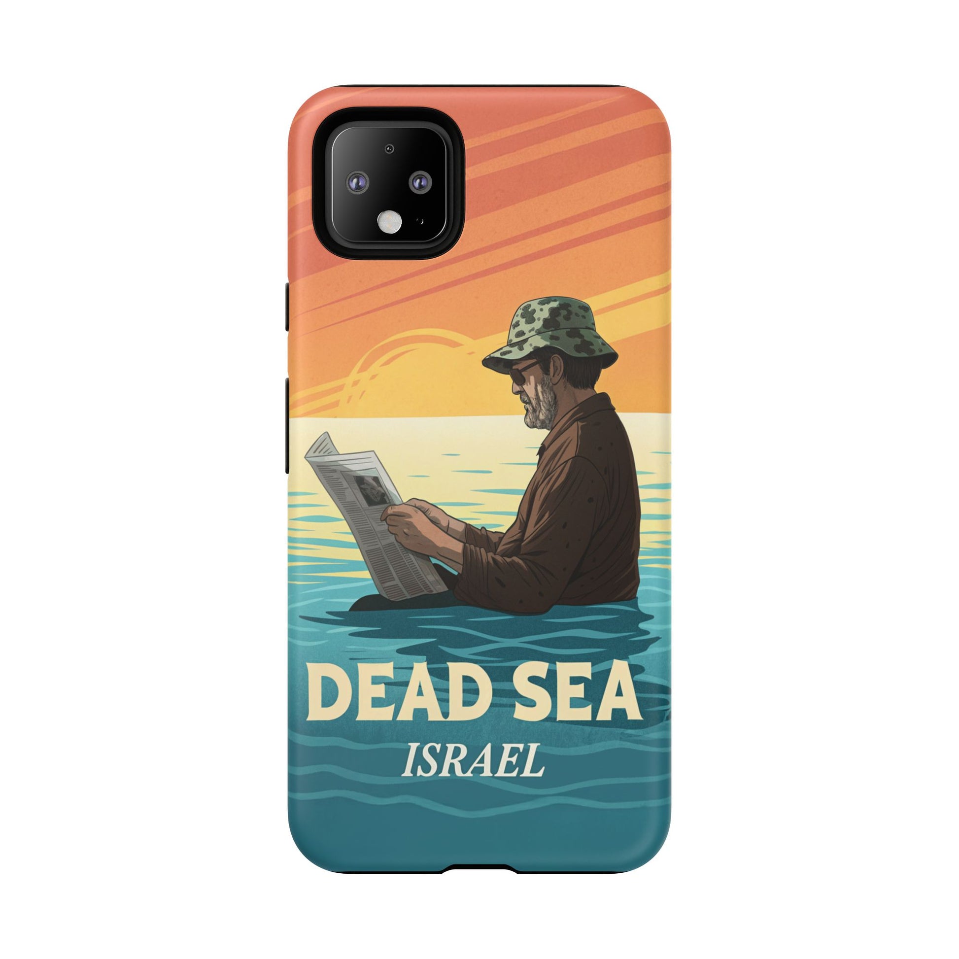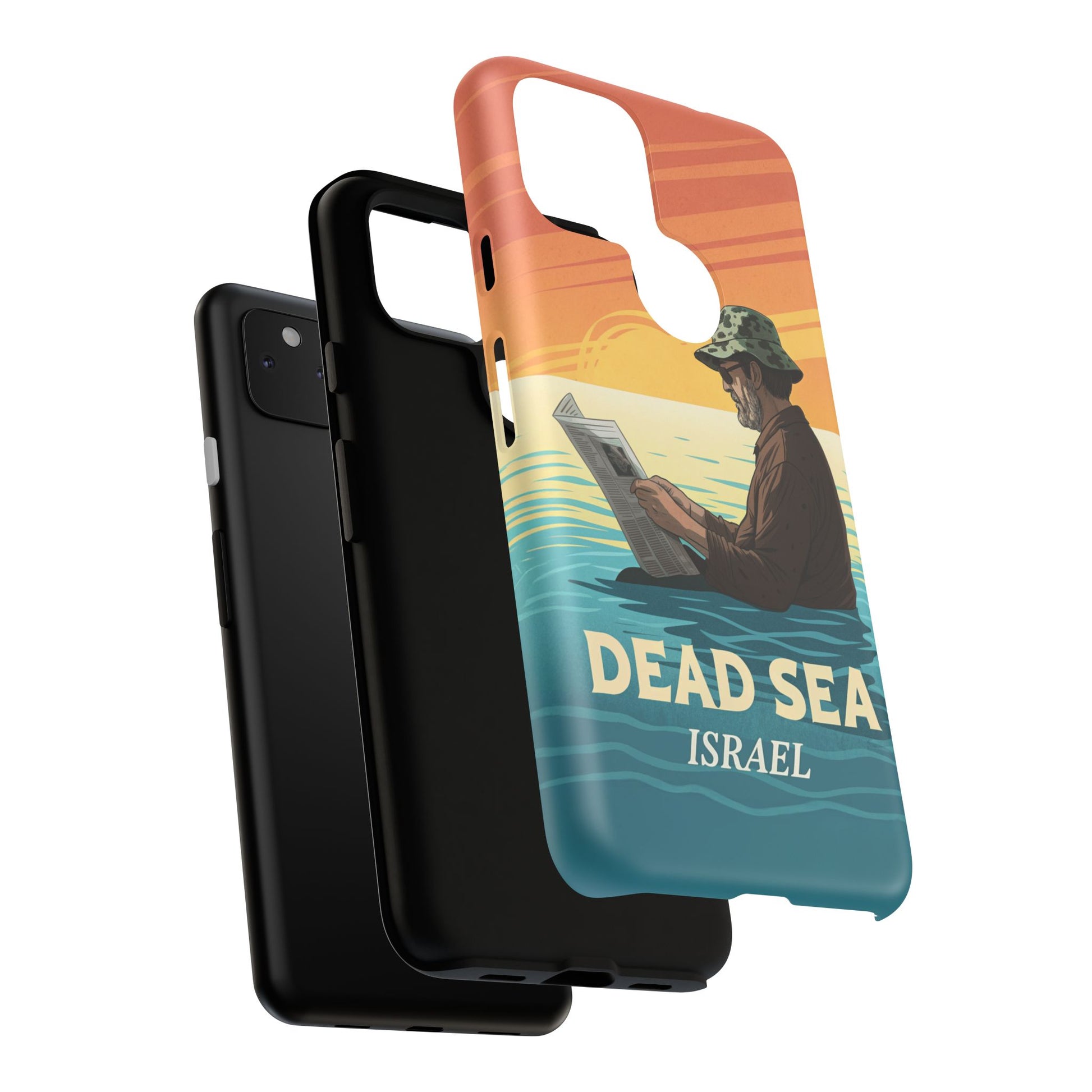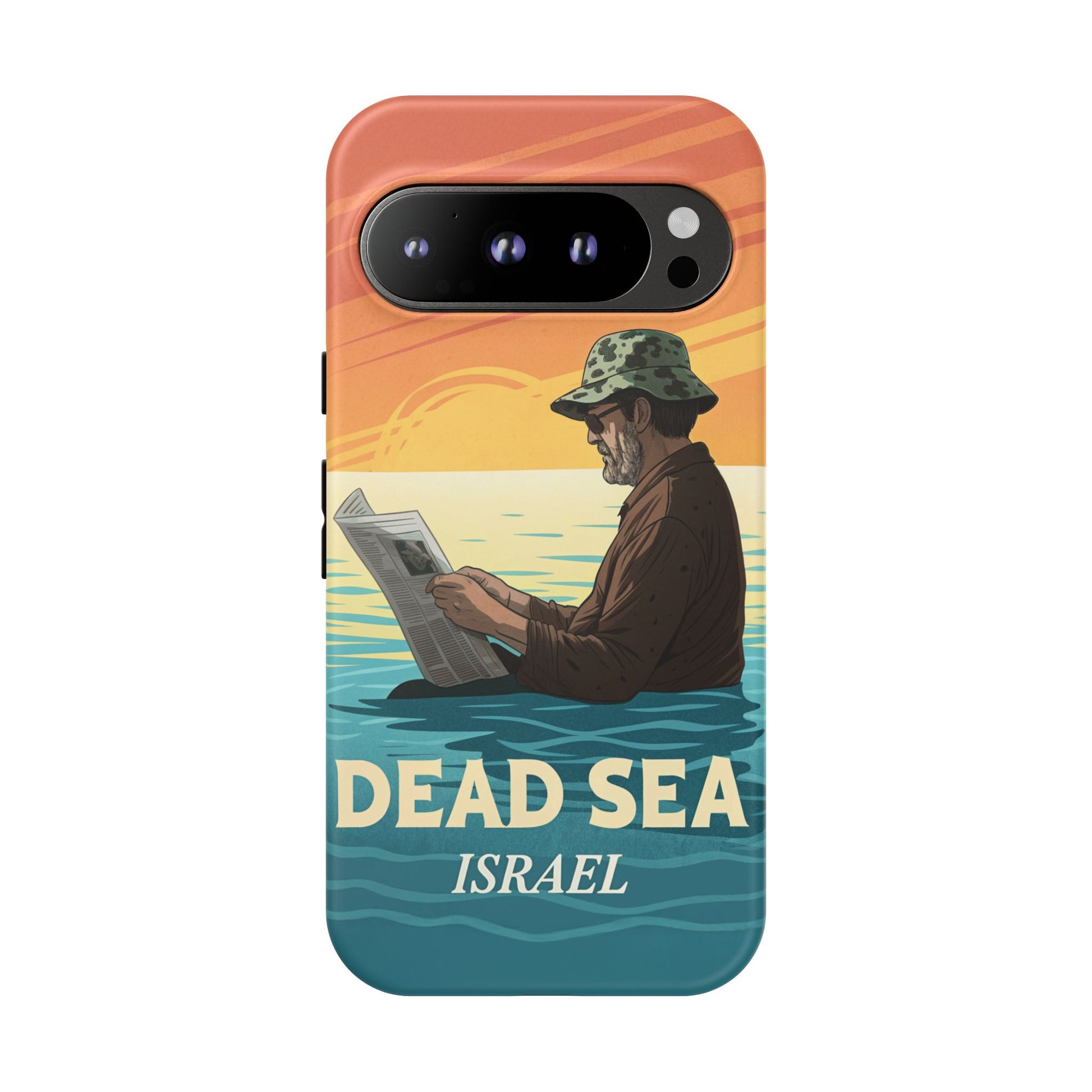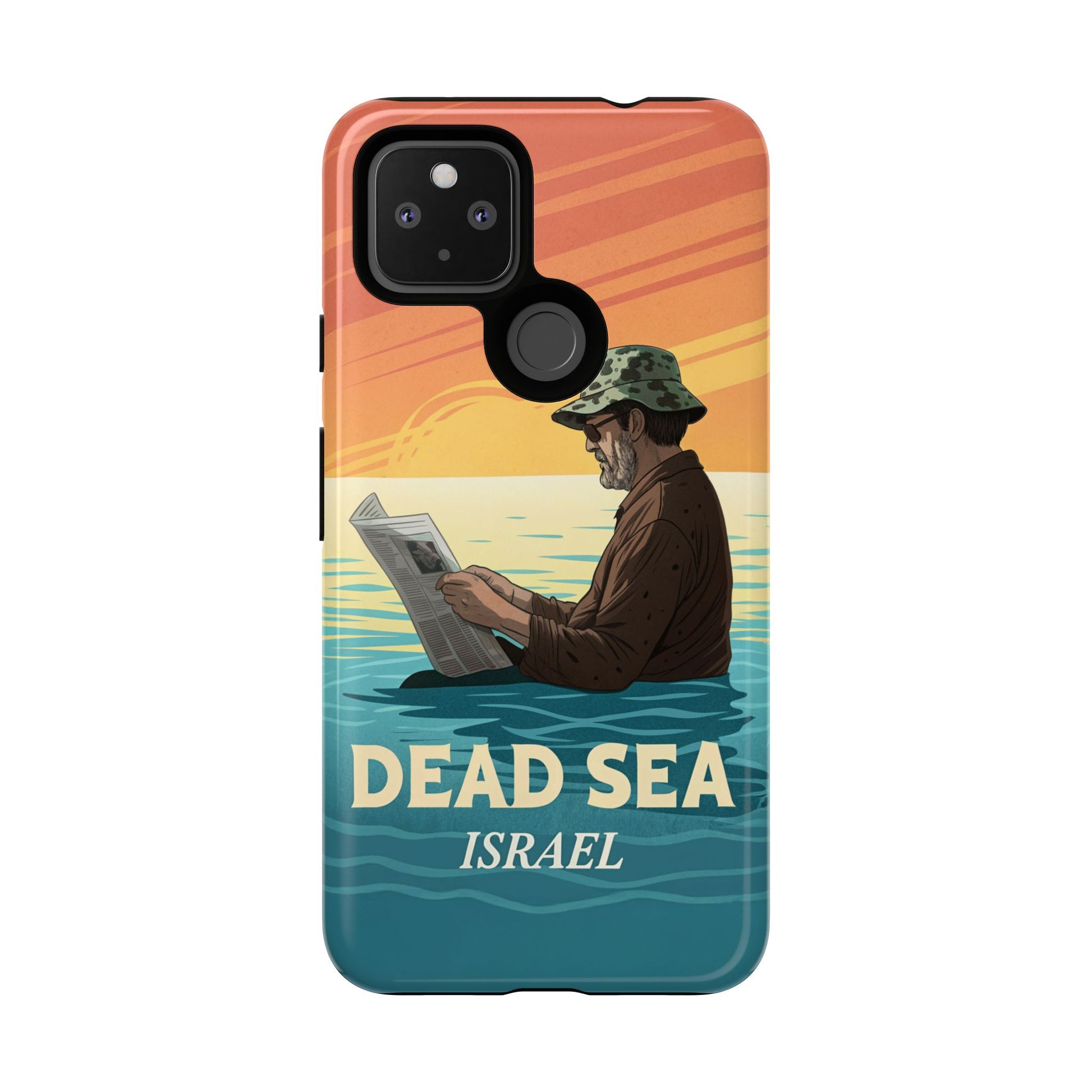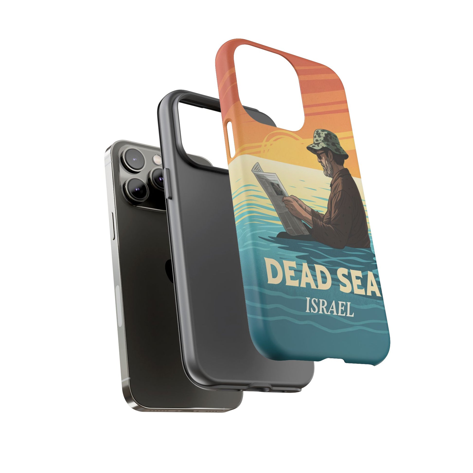 Ta med deg den rolige og ikoniske stemningen fra Dødehavet med dette kunstneriske mobildekselet. Designet viser en mann som sitter avslappet i det mineralrike vannet mens han leser avis – helt vektløs slik bare Dødehavet kan tilby. Den varme himmelen i oransje og gyldne toner gir motivet en vakker solnedgangsfølelse, mens de rolige blå bølgene skaper en perfekt kontrast. Et motiv som kombinerer humor, ro og tidløs reiselivssjarm fra Israel.