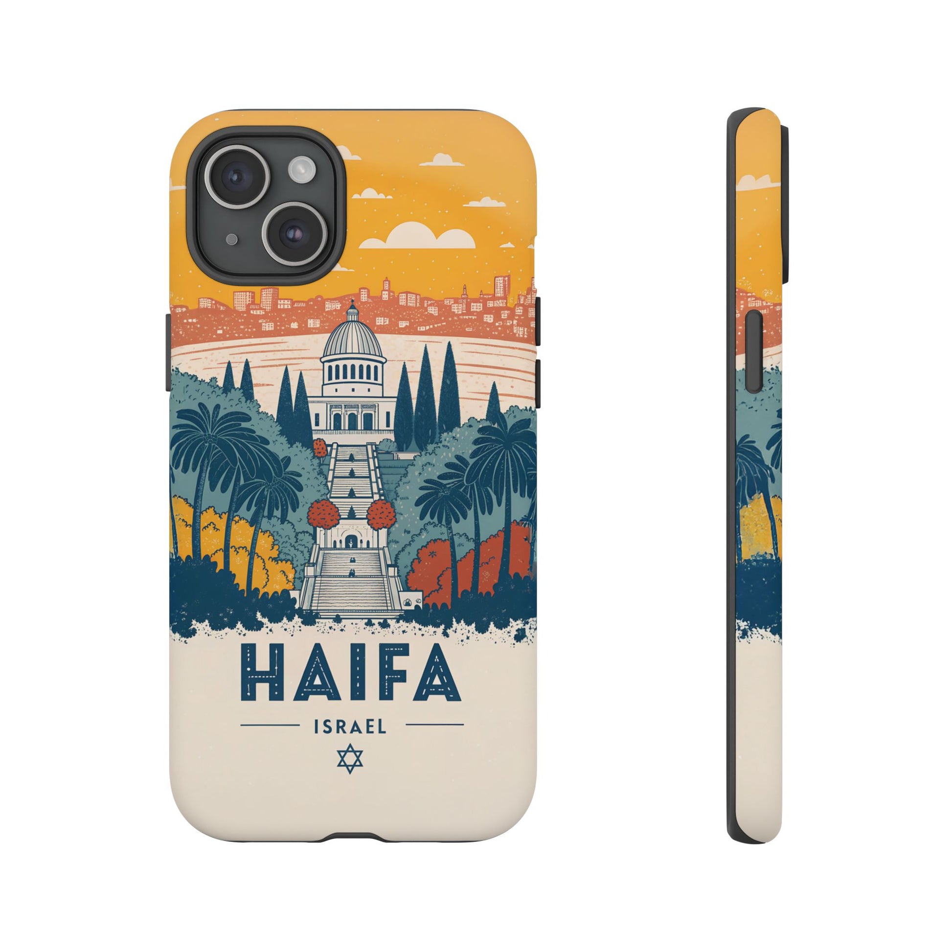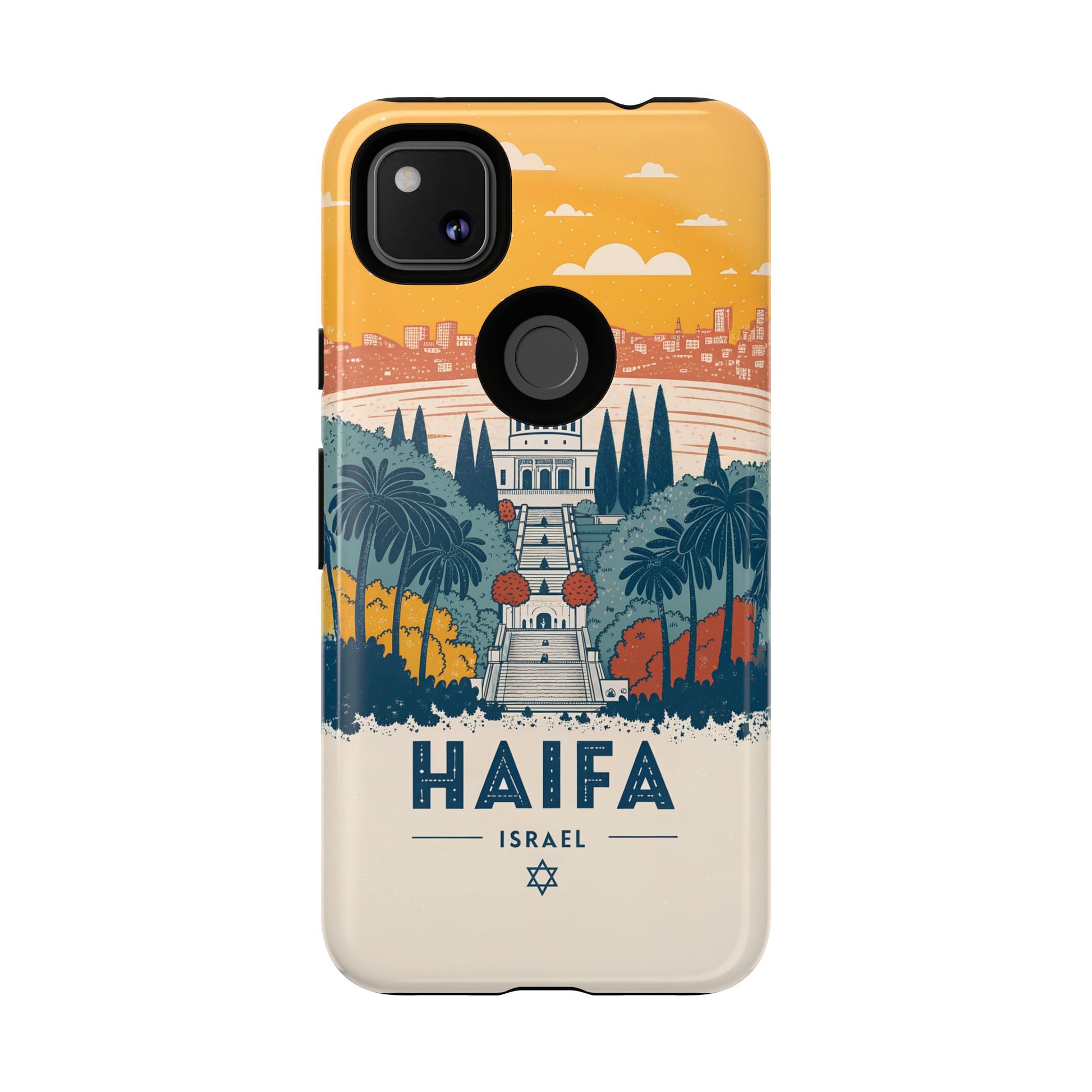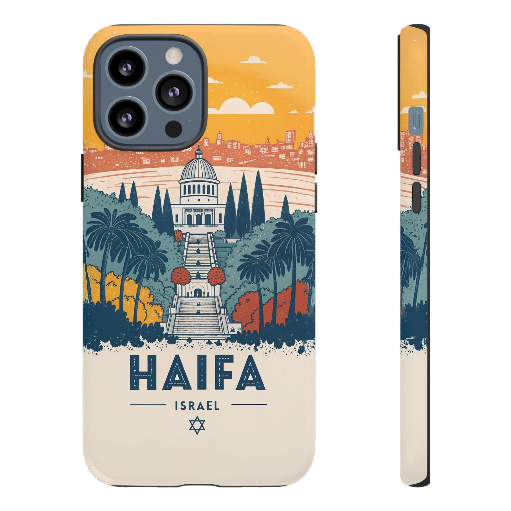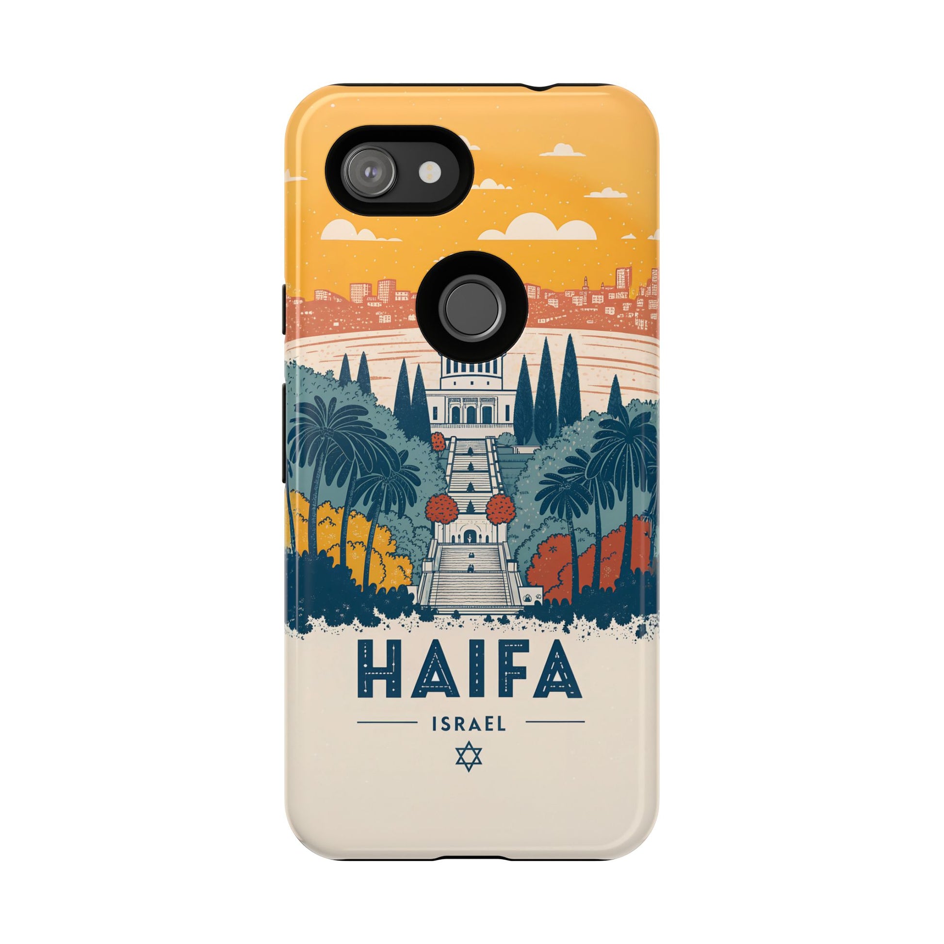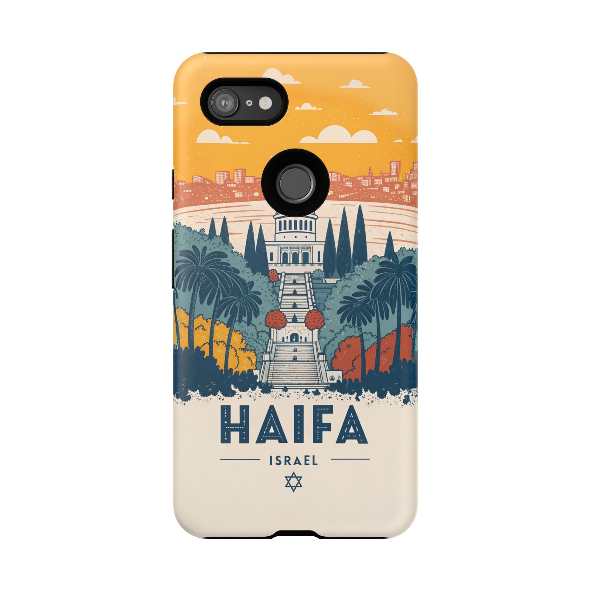 Oppdag Haifas tidløse skjønnhet med dette elegante mobildekselet inspirert av byens ikoniske terrasser og utsikt over Middelhavet. Designet viser den berømte hageaksen med symmetriske trapper, palmer og fargerike busker, alt satt mot en varm retro-himmel som skaper en kunstnerisk og nostalgisk plakatstil. Haifa kommer til live gjennom myke oransje- og blåtoner, rene linjer og et uttrykk som kombinerer ro, kultur og stolthet for Israel.