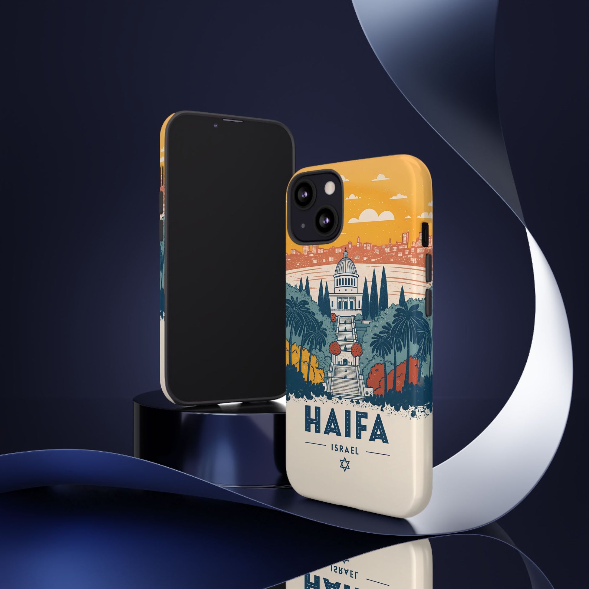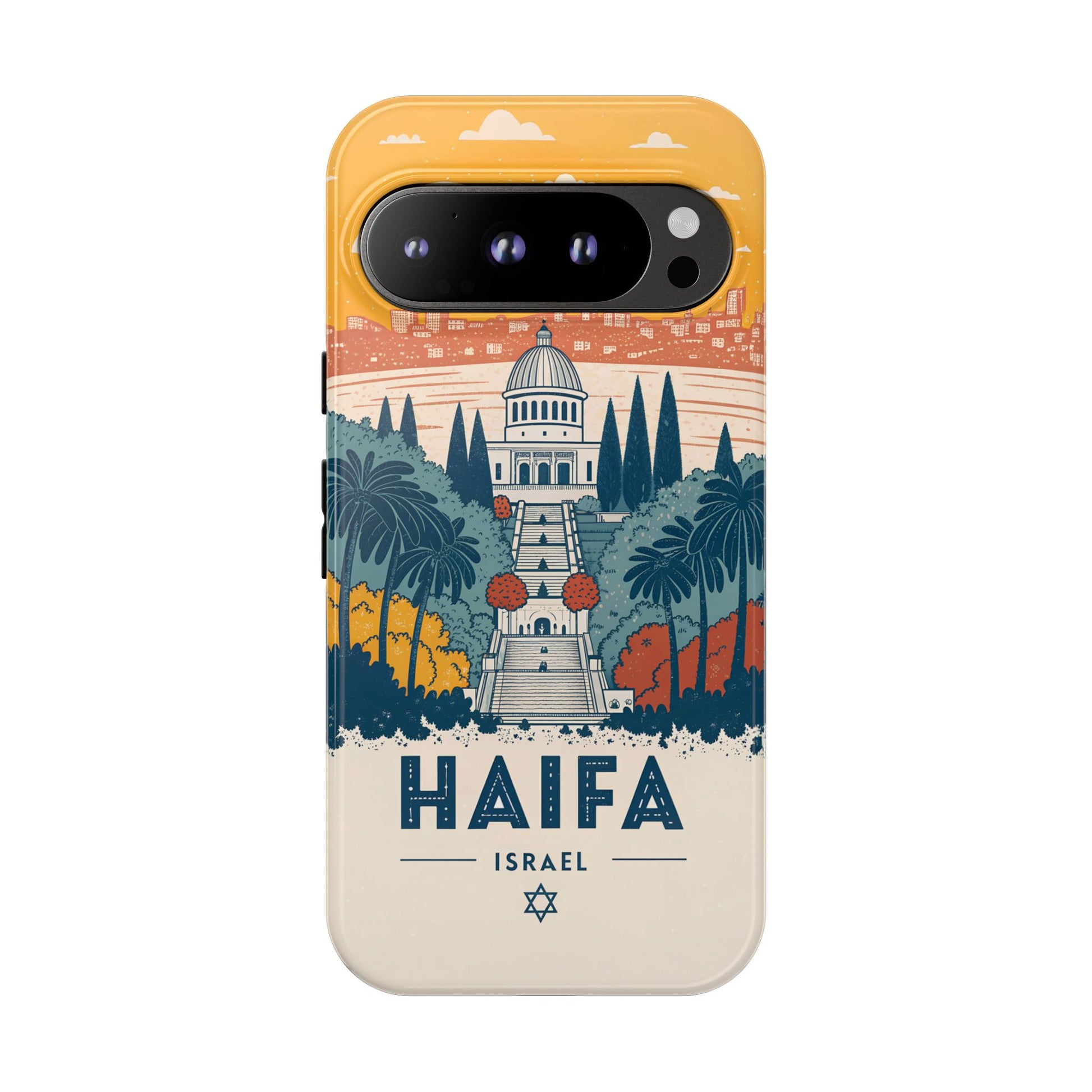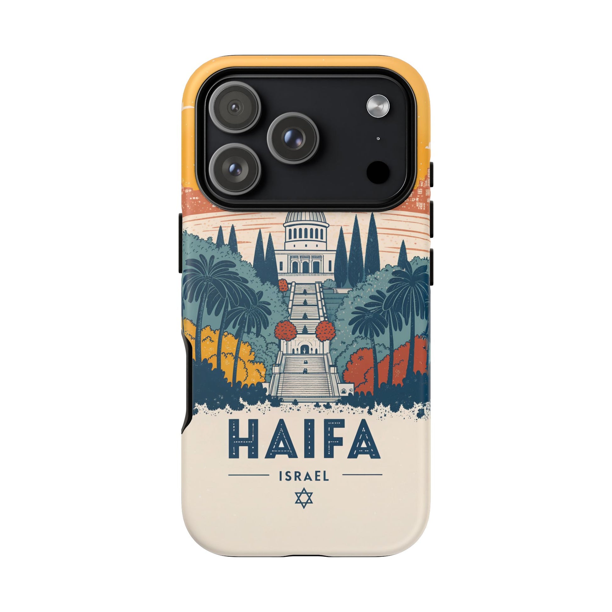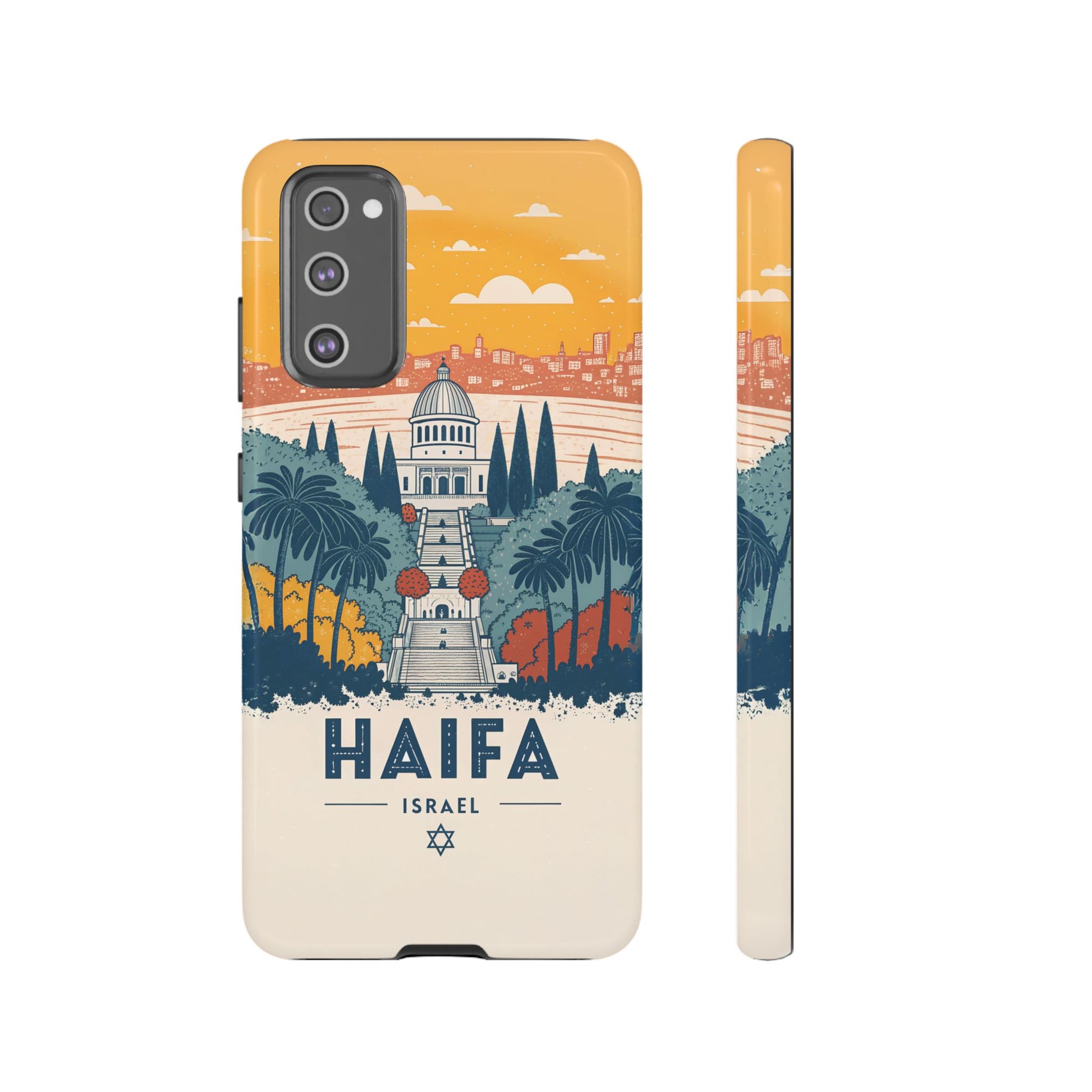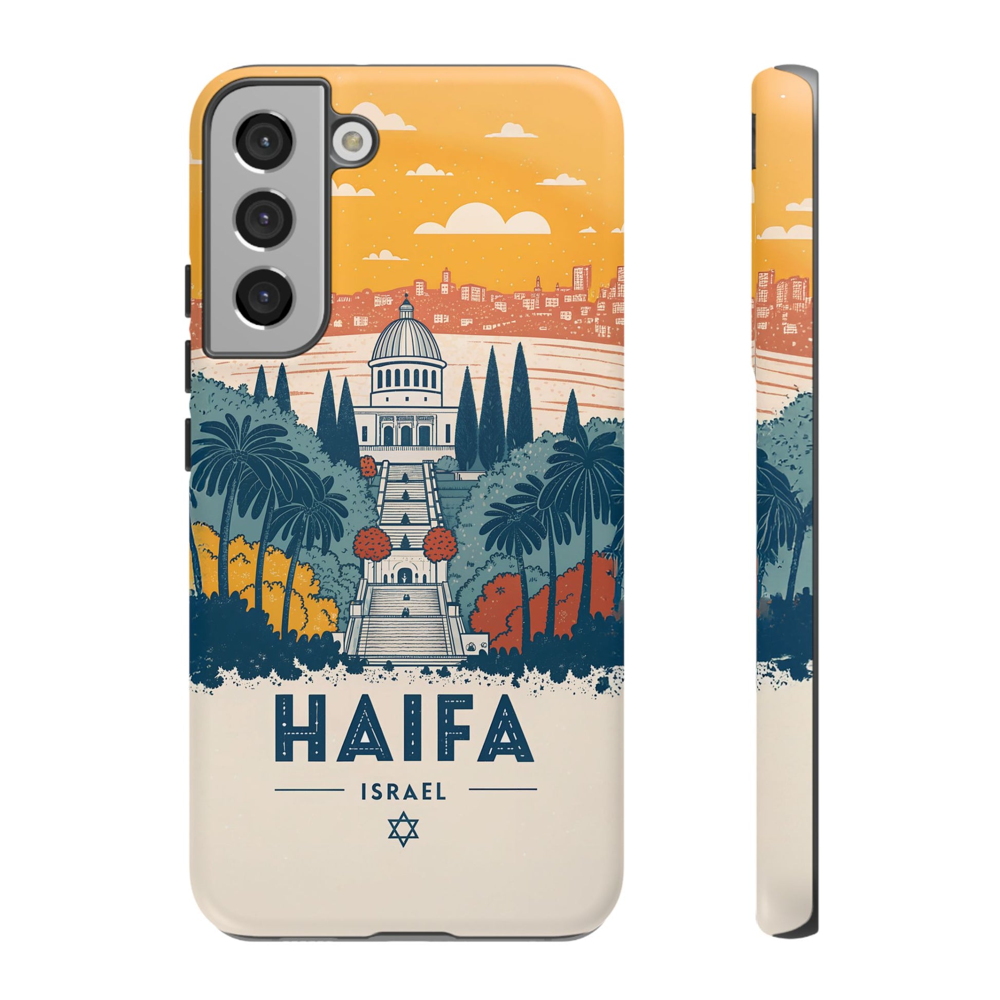 Oppdag Haifas tidløse skjønnhet med dette elegante mobildekselet inspirert av byens ikoniske terrasser og utsikt over Middelhavet. Designet viser den berømte hageaksen med symmetriske trapper, palmer og fargerike busker, alt satt mot en varm retro-himmel som skaper en kunstnerisk og nostalgisk plakatstil. Haifa kommer til live gjennom myke oransje- og blåtoner, rene linjer og et uttrykk som kombinerer ro, kultur og stolthet for Israel.