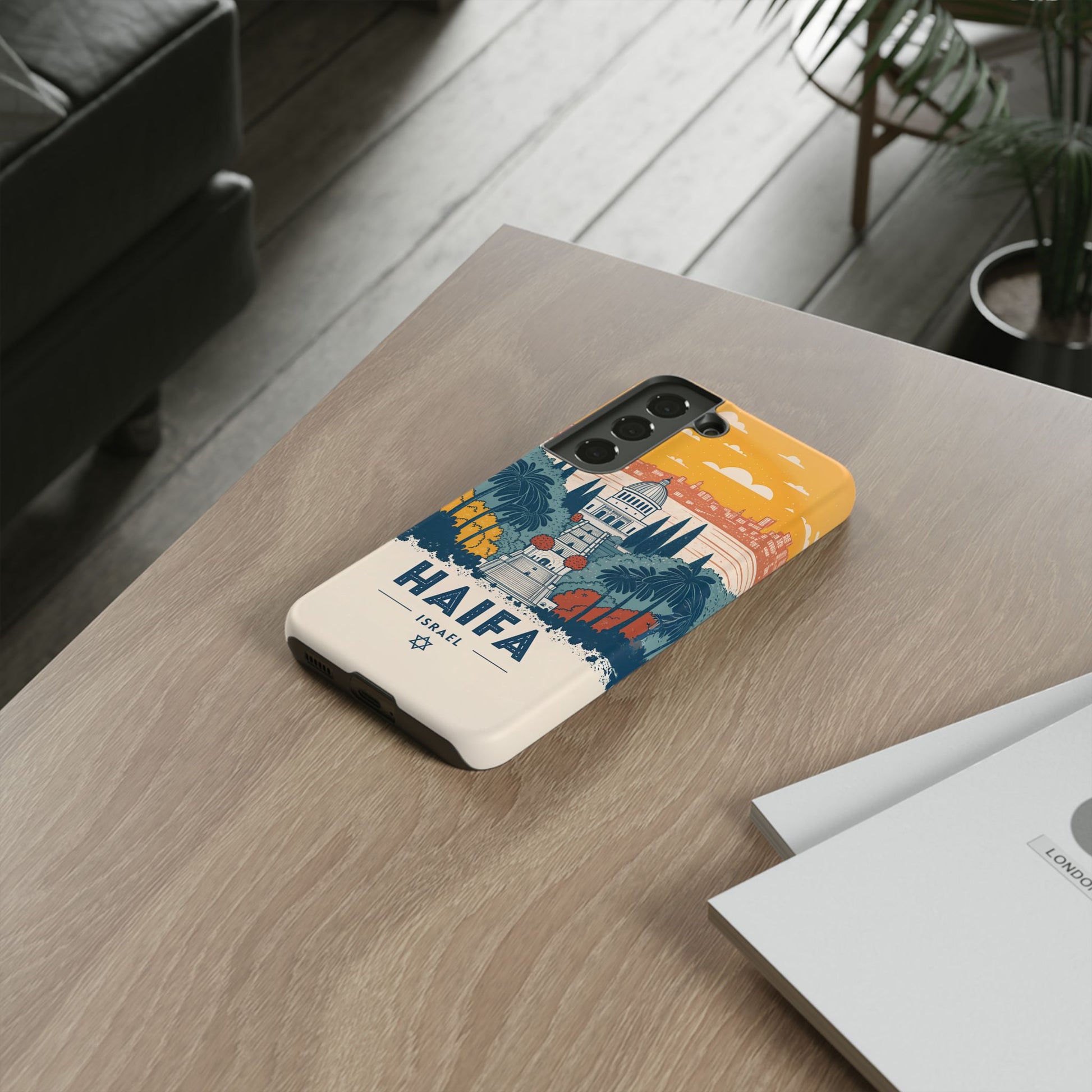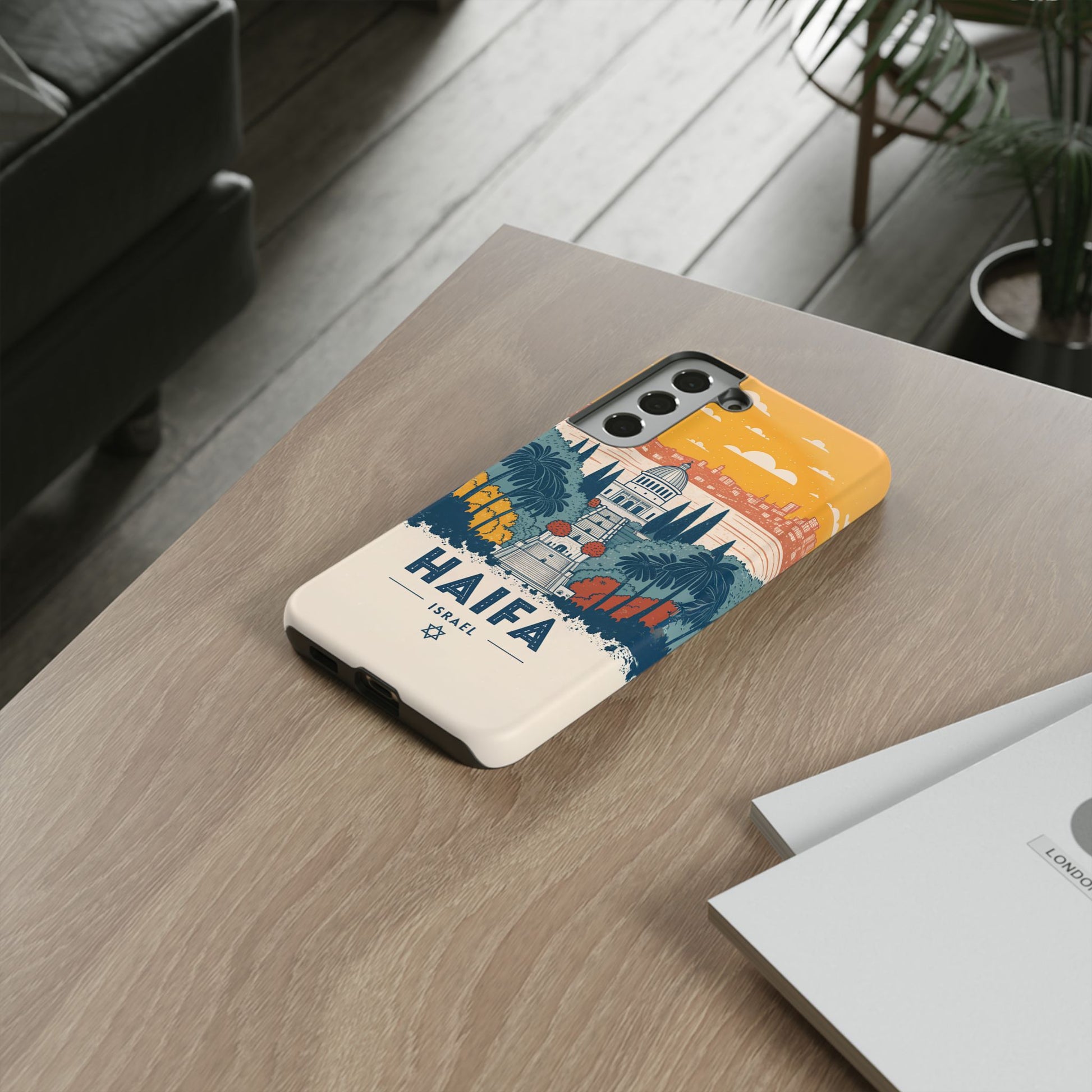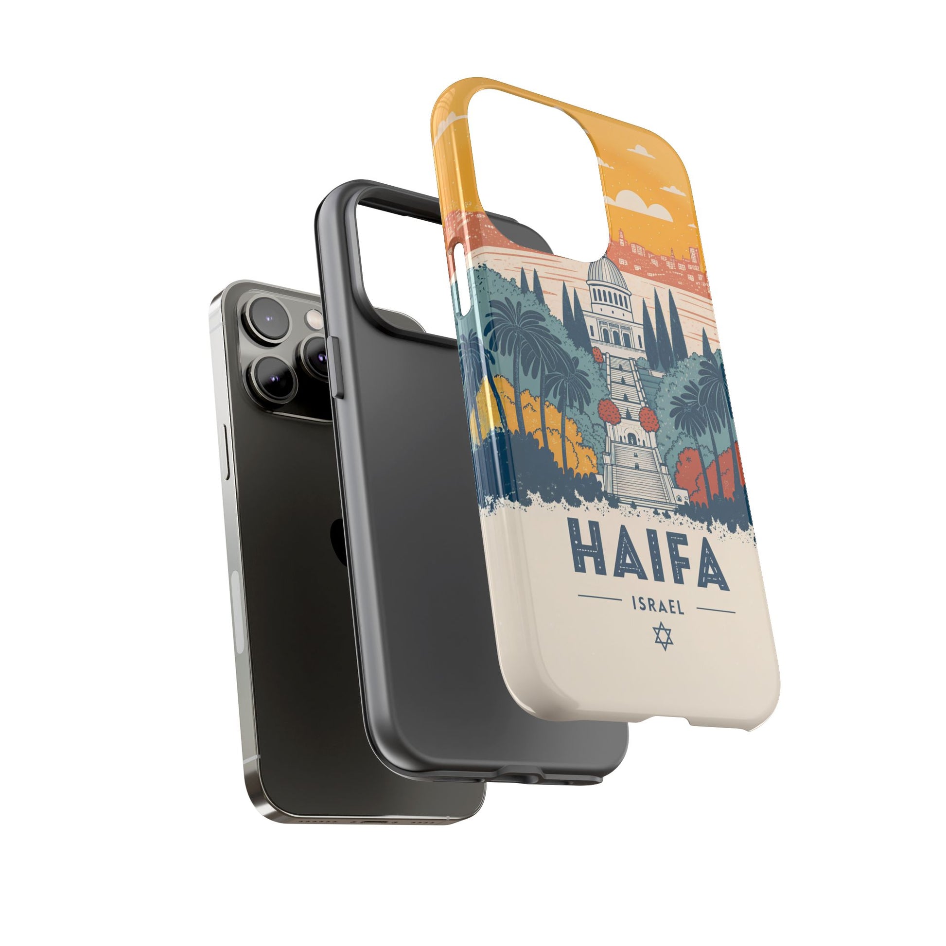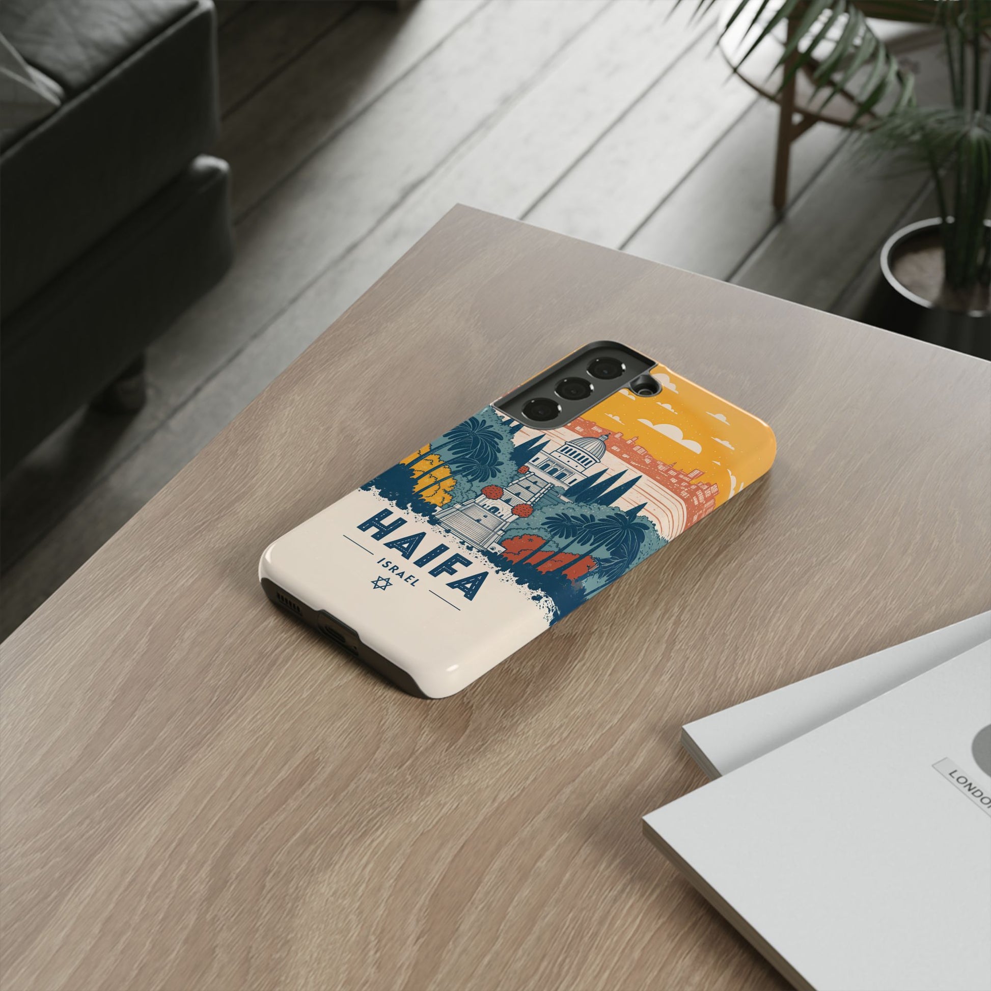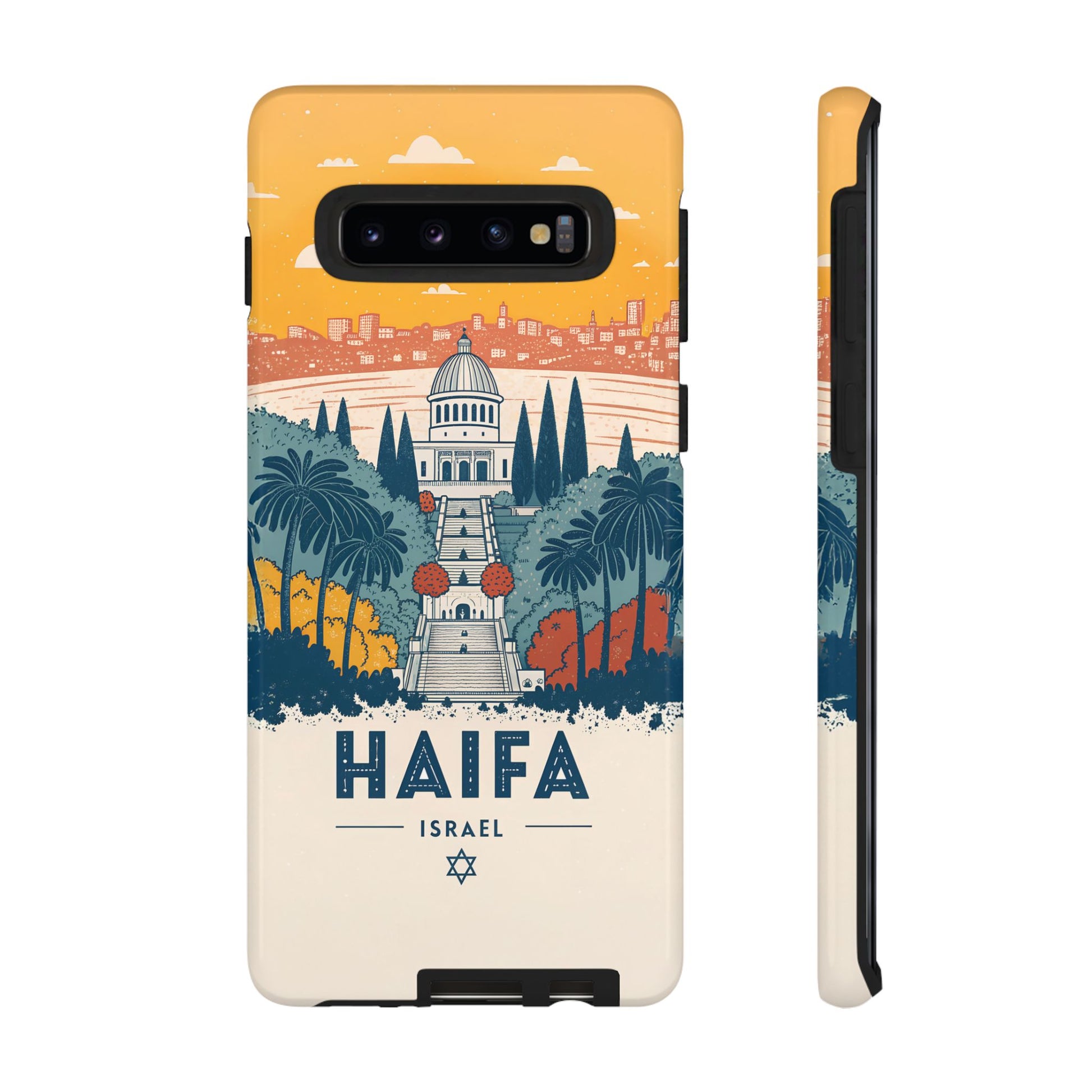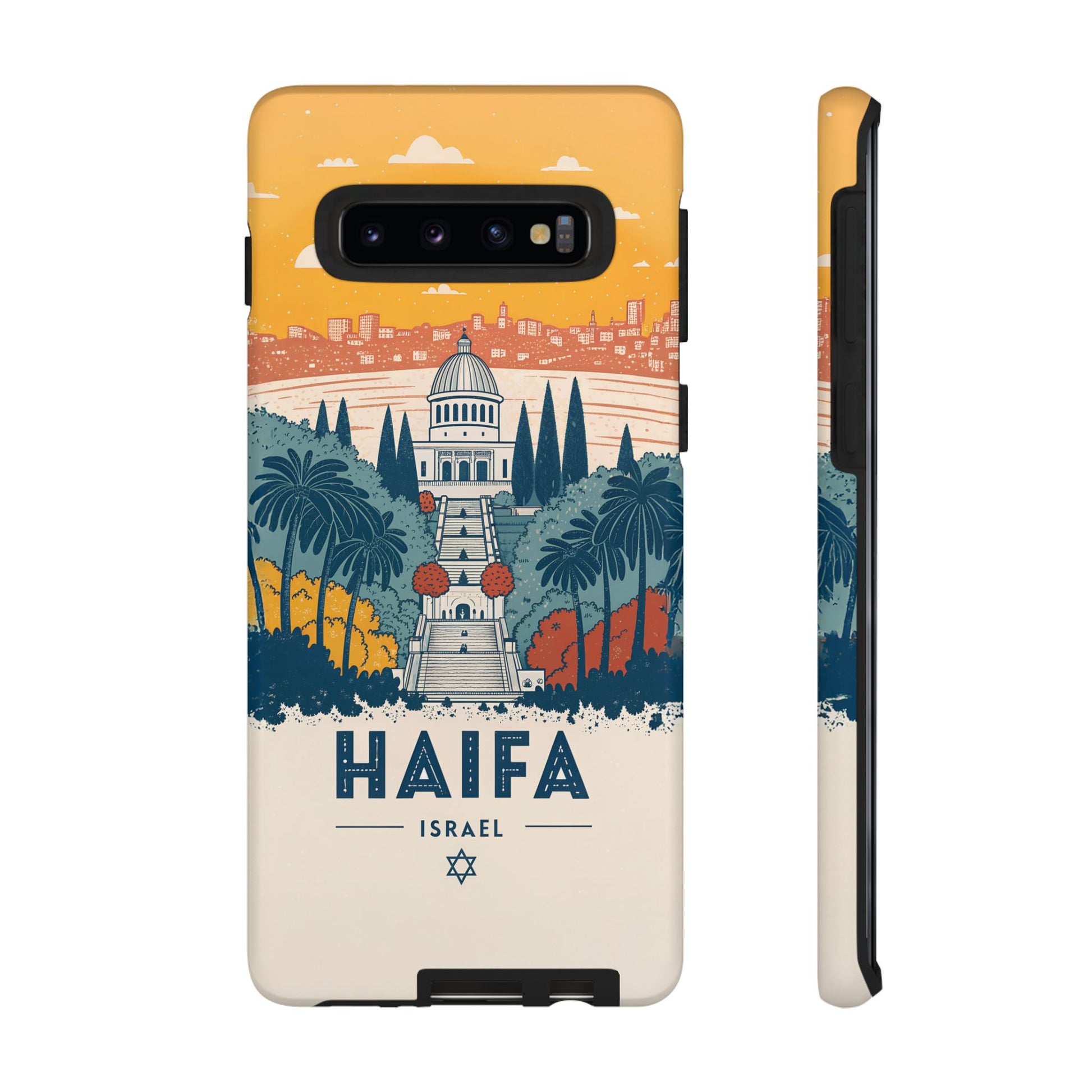 Oppdag Haifas tidløse skjønnhet med dette elegante mobildekselet inspirert av byens ikoniske terrasser og utsikt over Middelhavet. Designet viser den berømte hageaksen med symmetriske trapper, palmer og fargerike busker, alt satt mot en varm retro-himmel som skaper en kunstnerisk og nostalgisk plakatstil. Haifa kommer til live gjennom myke oransje- og blåtoner, rene linjer og et uttrykk som kombinerer ro, kultur og stolthet for Israel.