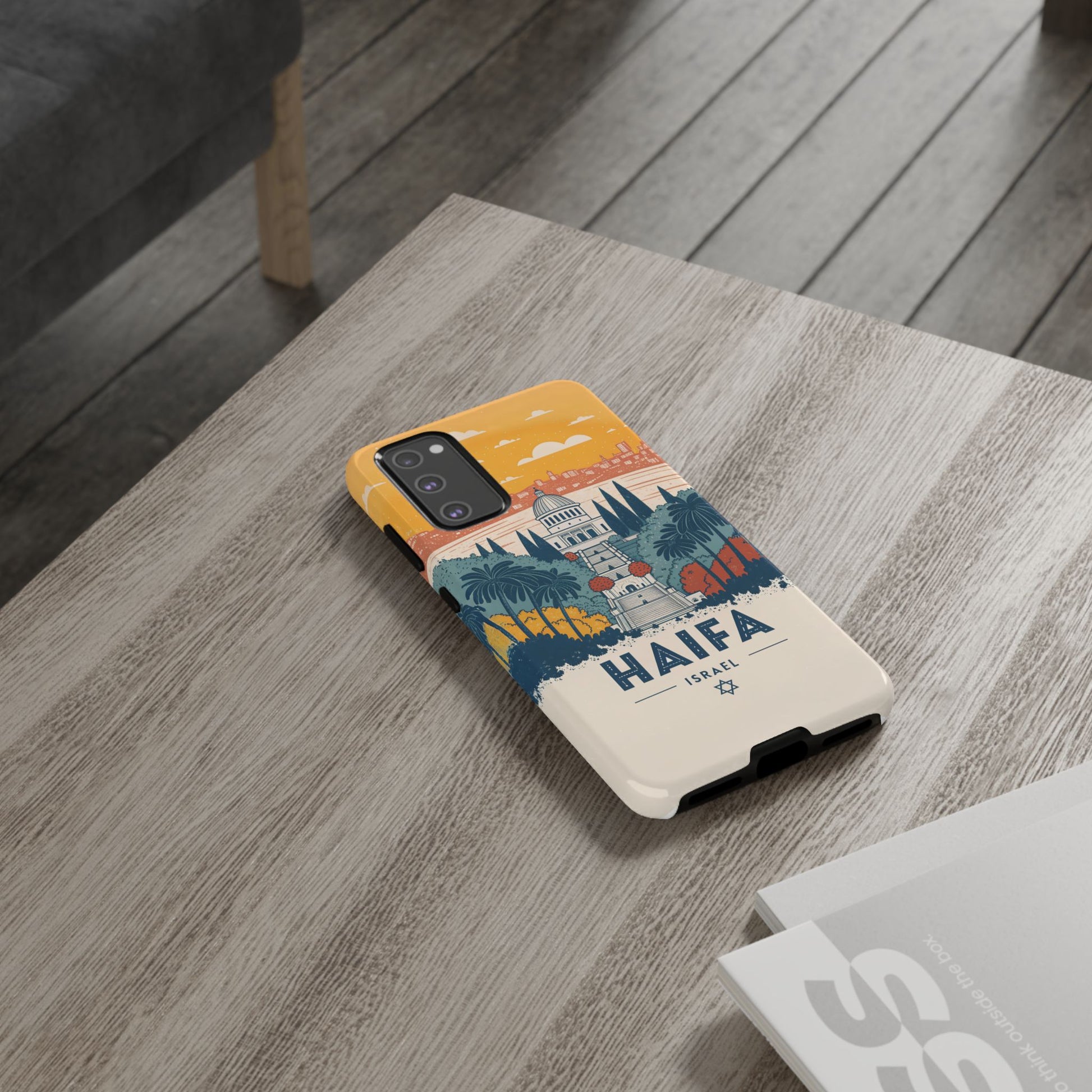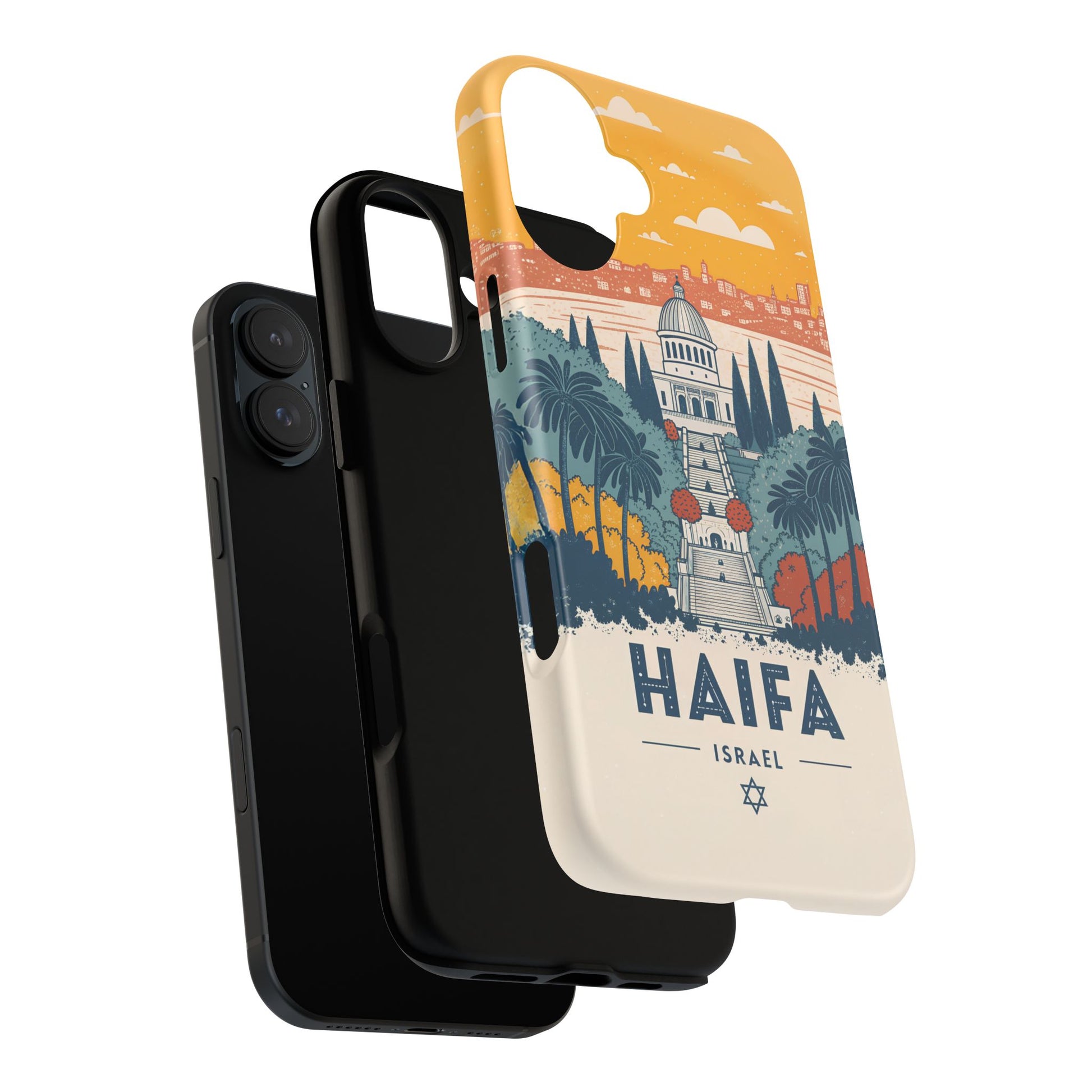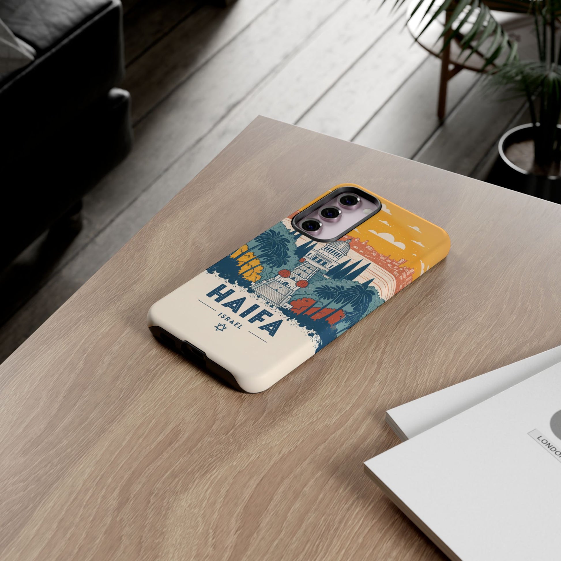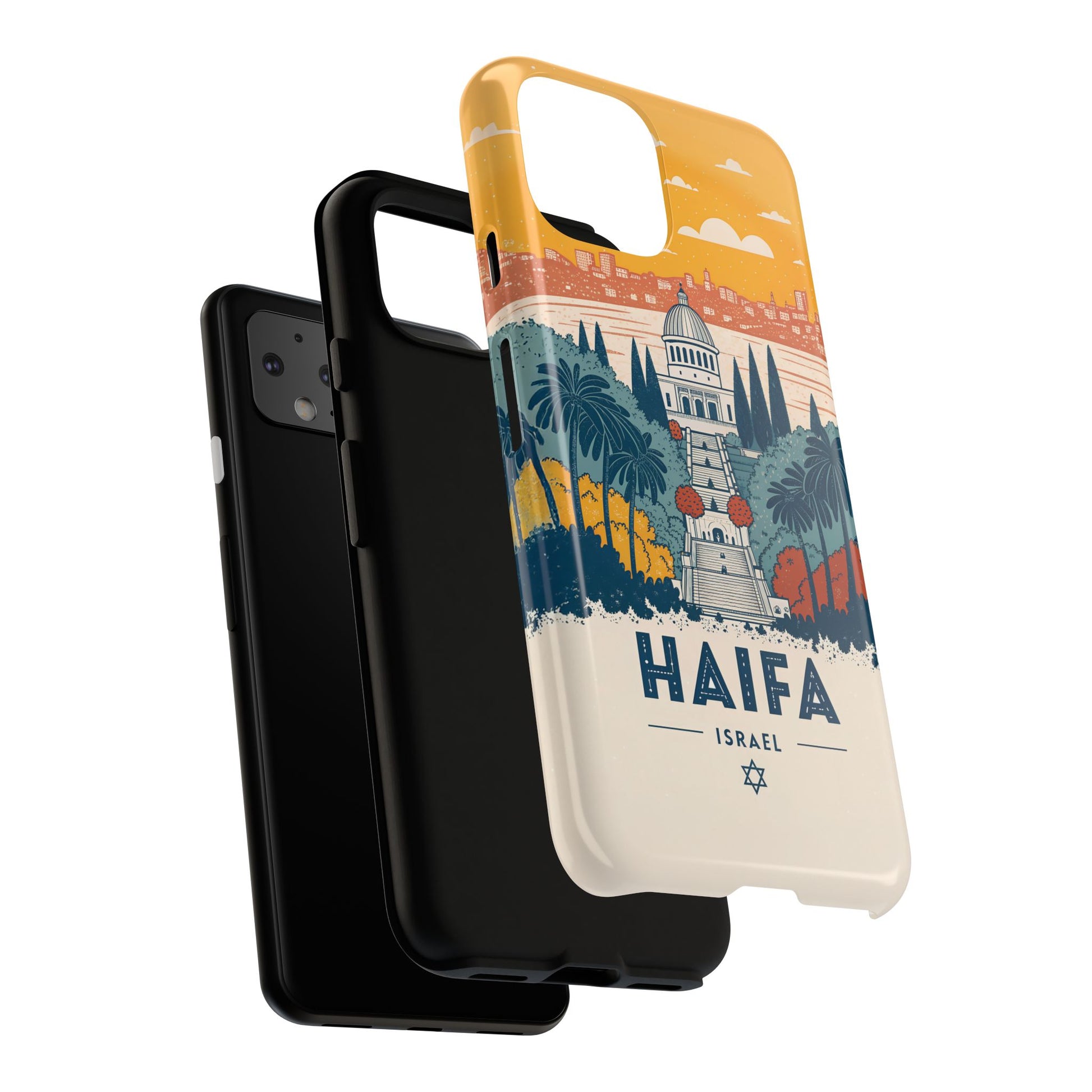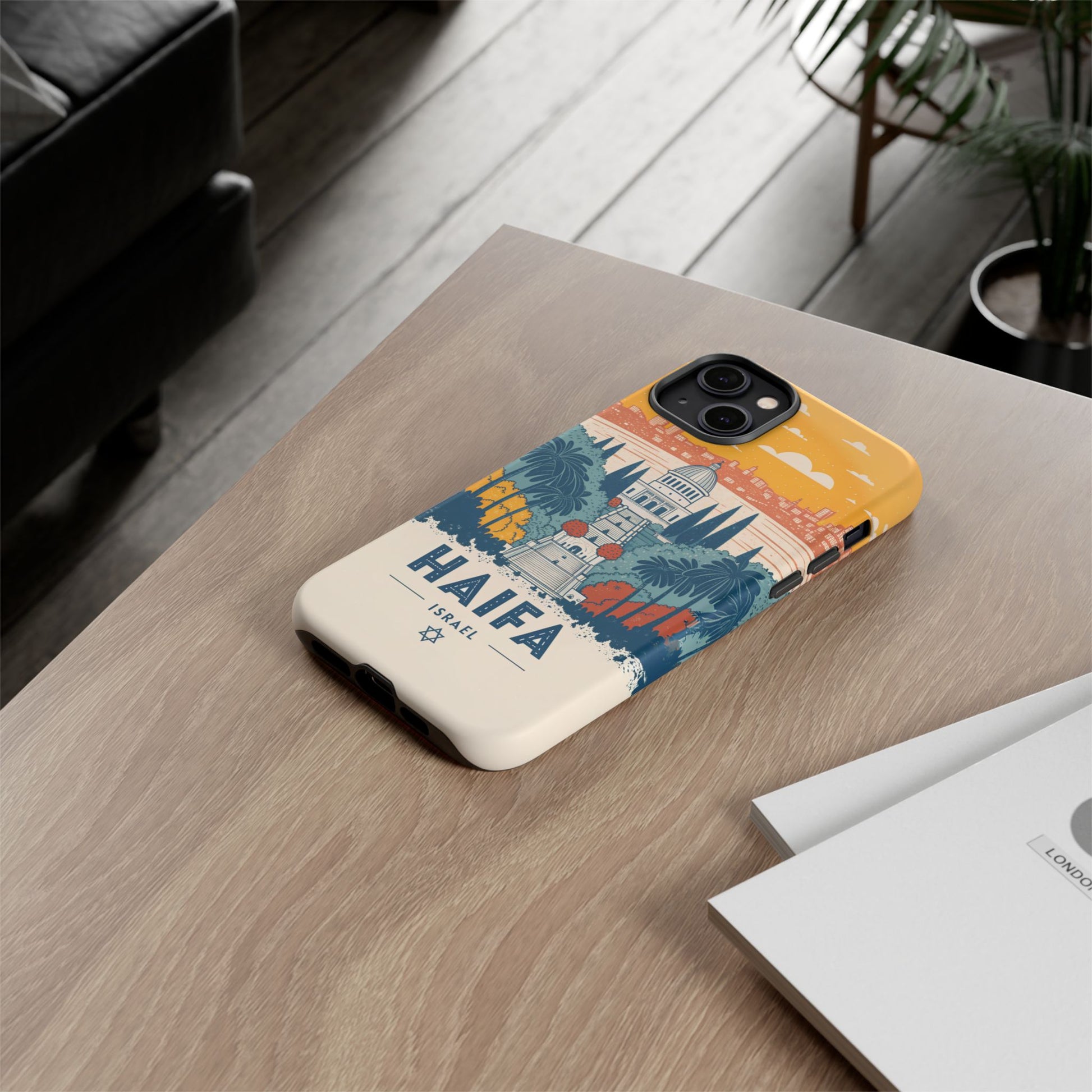 Oppdag Haifas tidløse skjønnhet med dette elegante mobildekselet inspirert av byens ikoniske terrasser og utsikt over Middelhavet. Designet viser den berømte hageaksen med symmetriske trapper, palmer og fargerike busker, alt satt mot en varm retro-himmel som skaper en kunstnerisk og nostalgisk plakatstil. Haifa kommer til live gjennom myke oransje- og blåtoner, rene linjer og et uttrykk som kombinerer ro, kultur og stolthet for Israel.