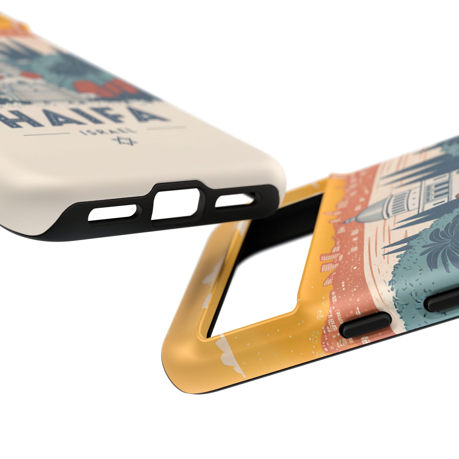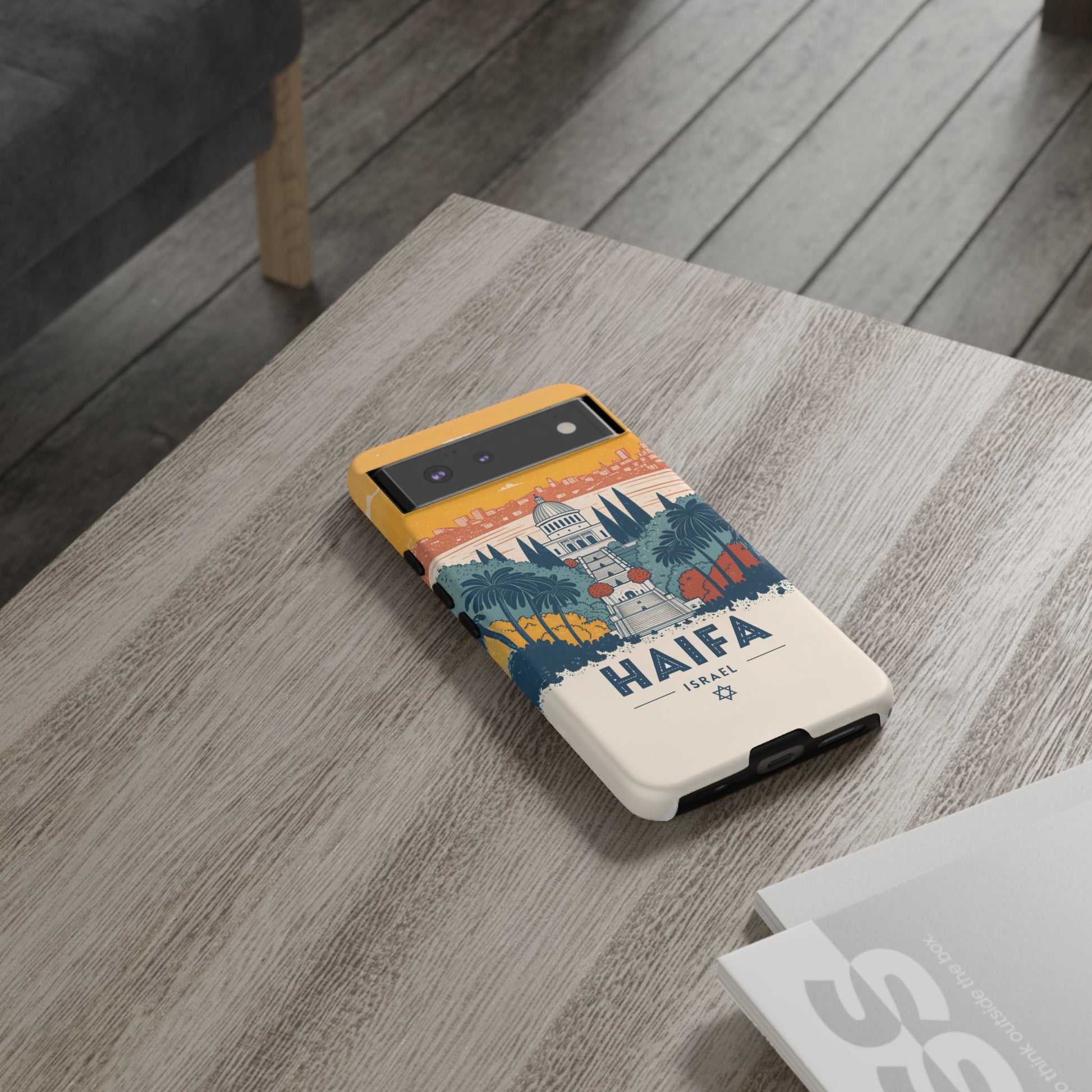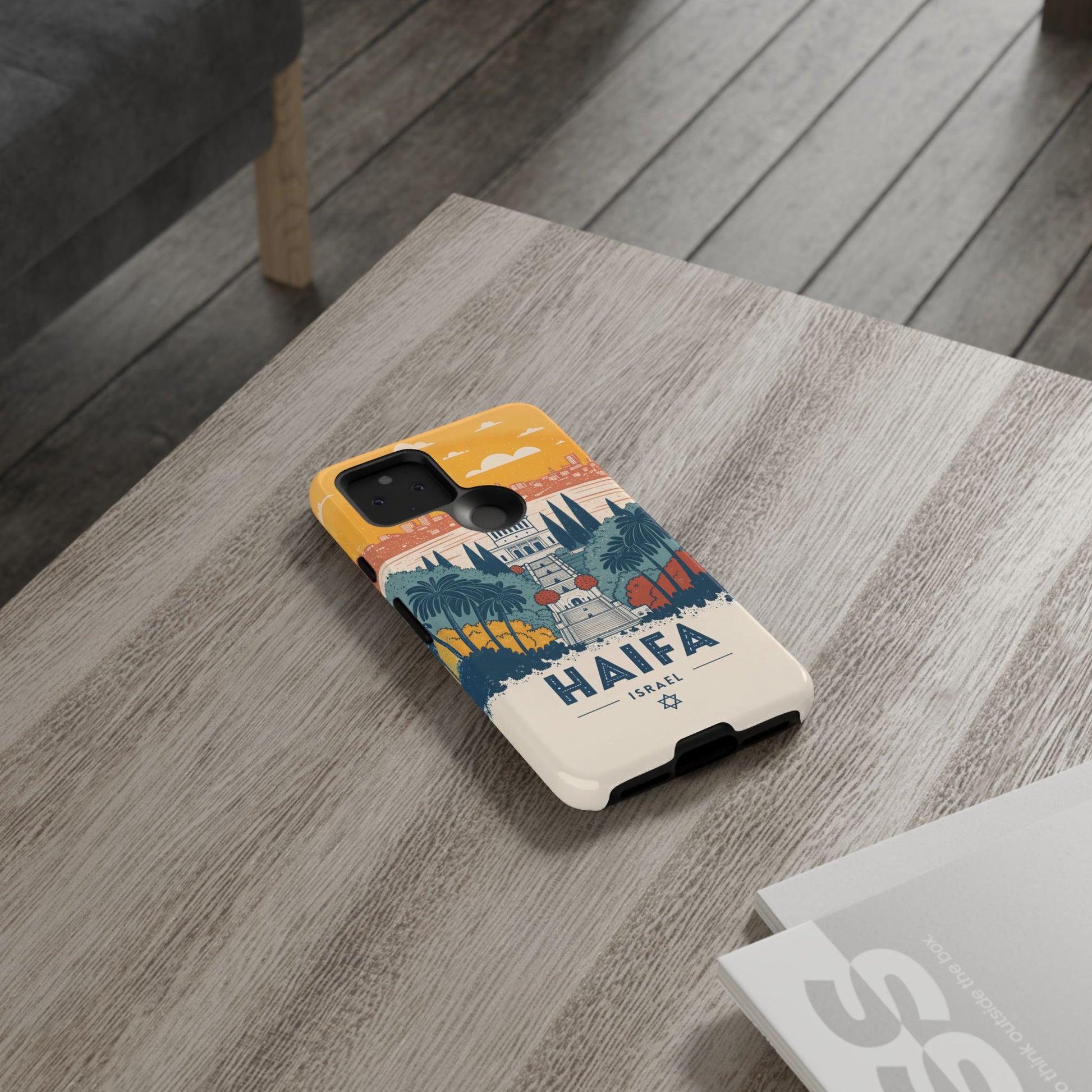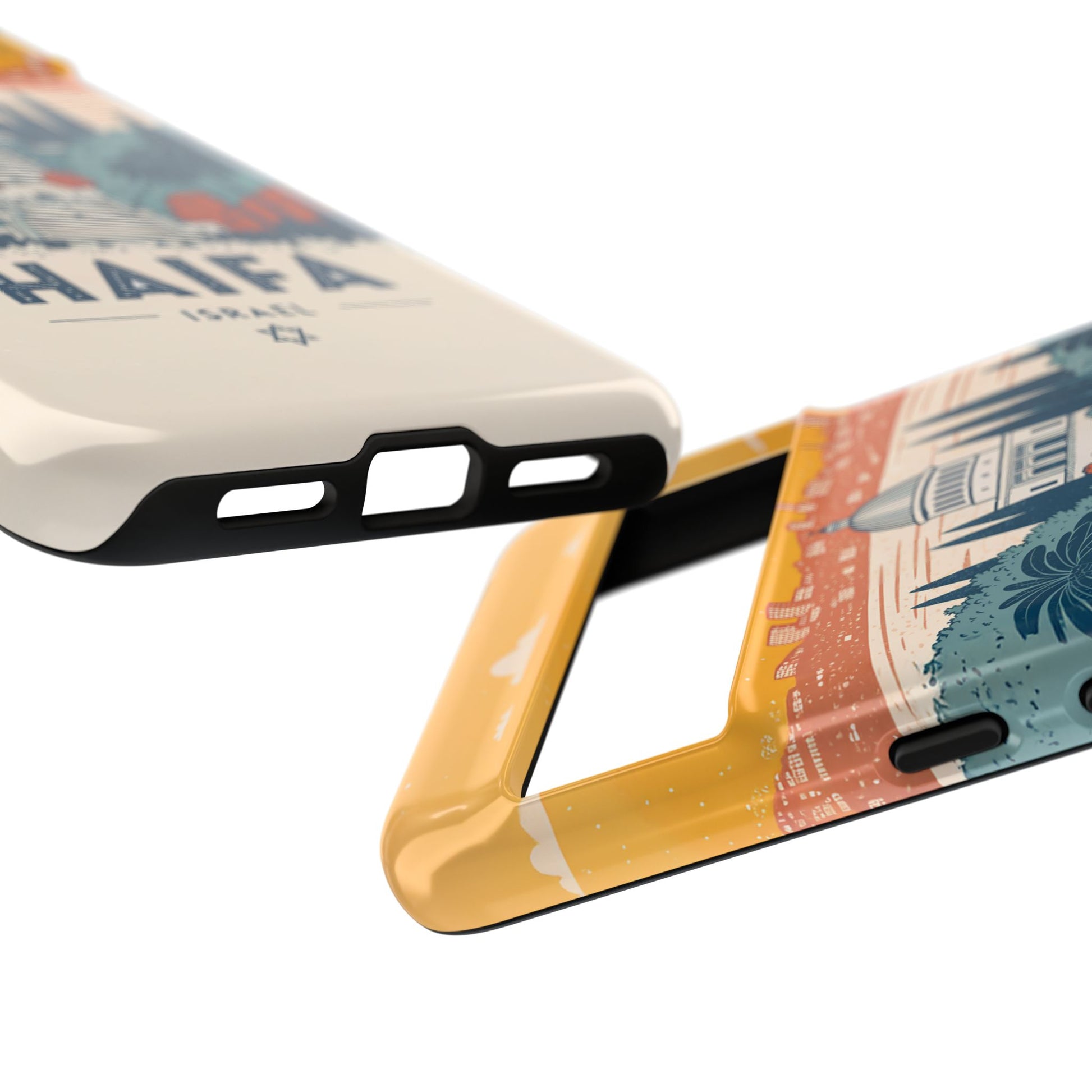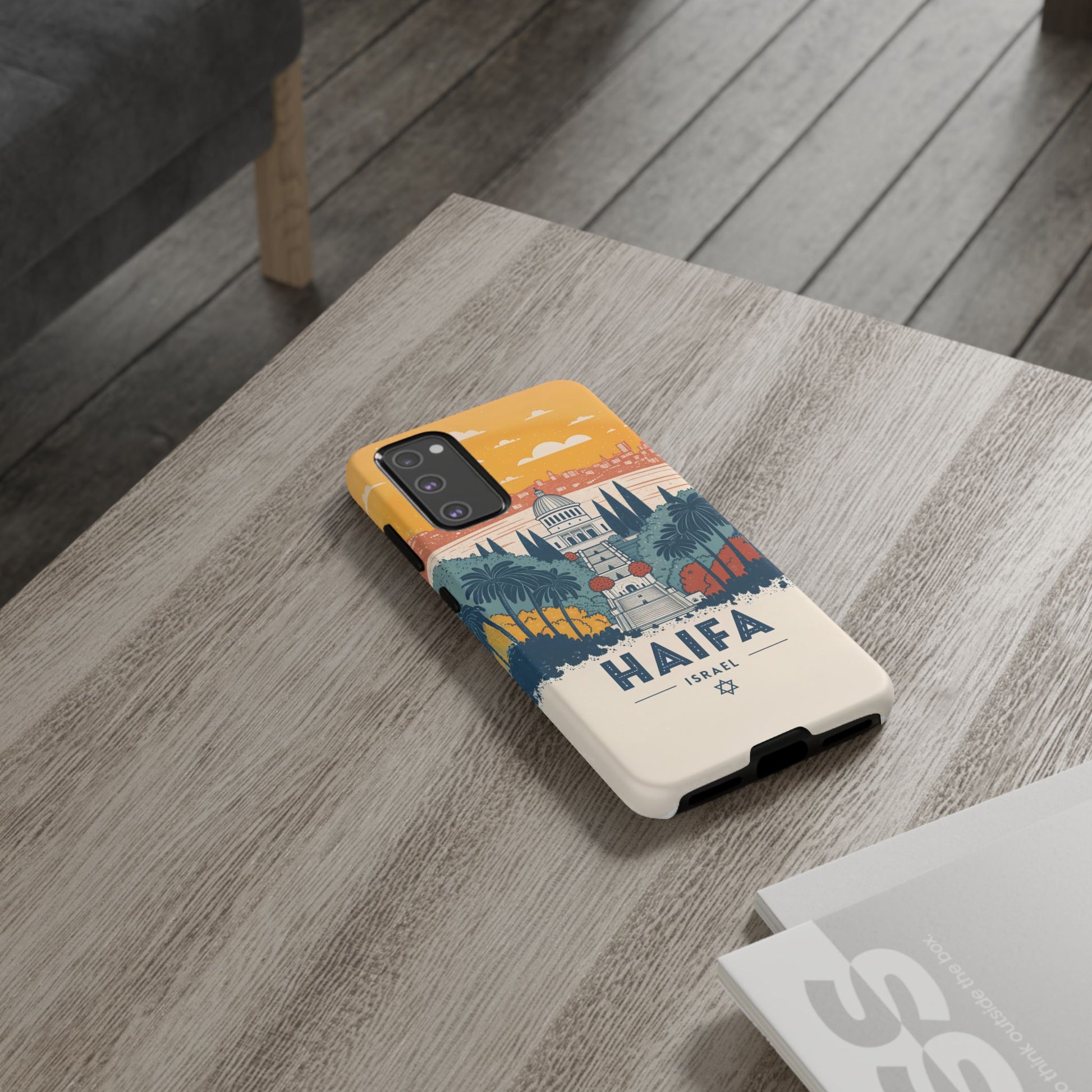 Oppdag Haifas tidløse skjønnhet med dette elegante mobildekselet inspirert av byens ikoniske terrasser og utsikt over Middelhavet. Designet viser den berømte hageaksen med symmetriske trapper, palmer og fargerike busker, alt satt mot en varm retro-himmel som skaper en kunstnerisk og nostalgisk plakatstil. Haifa kommer til live gjennom myke oransje- og blåtoner, rene linjer og et uttrykk som kombinerer ro, kultur og stolthet for Israel.
