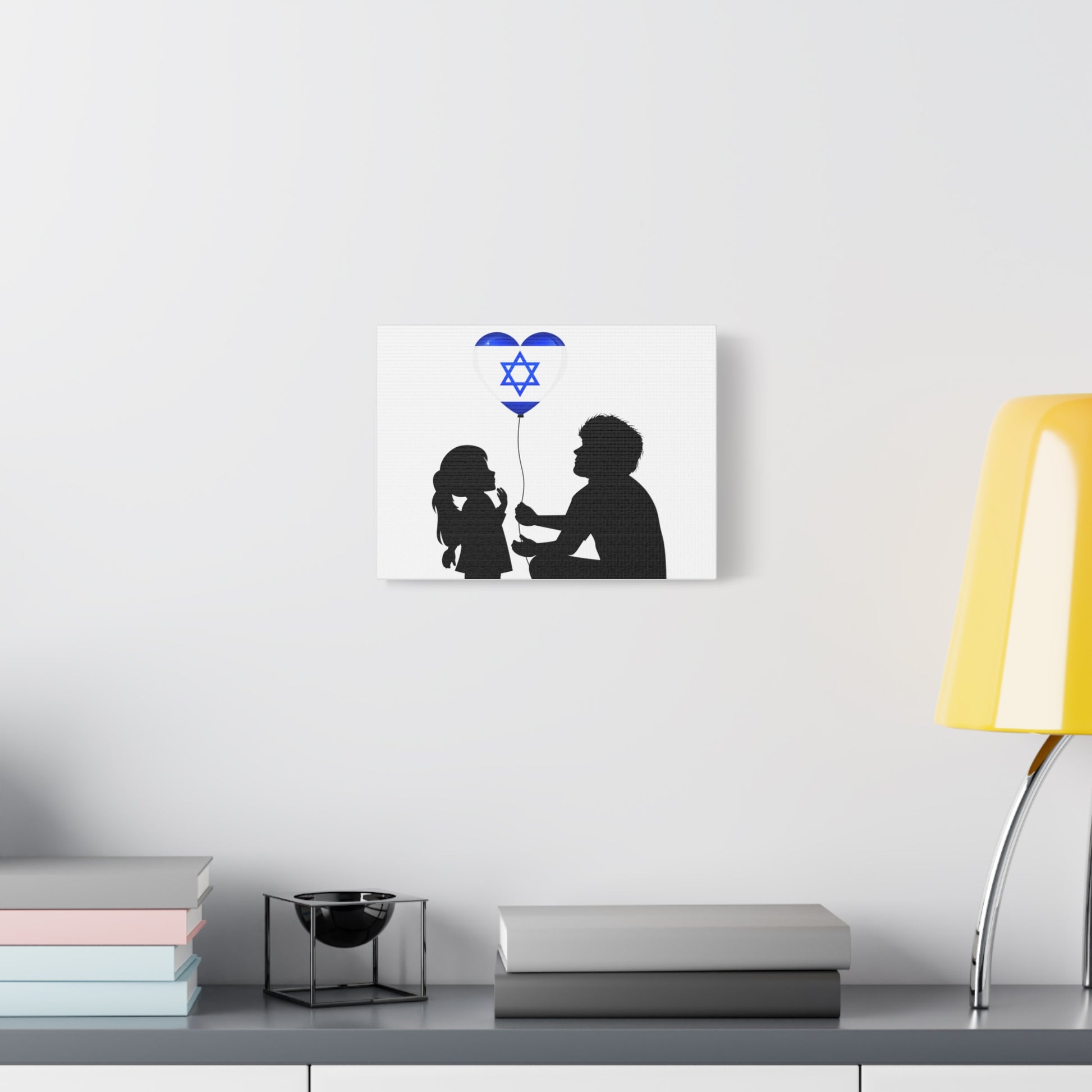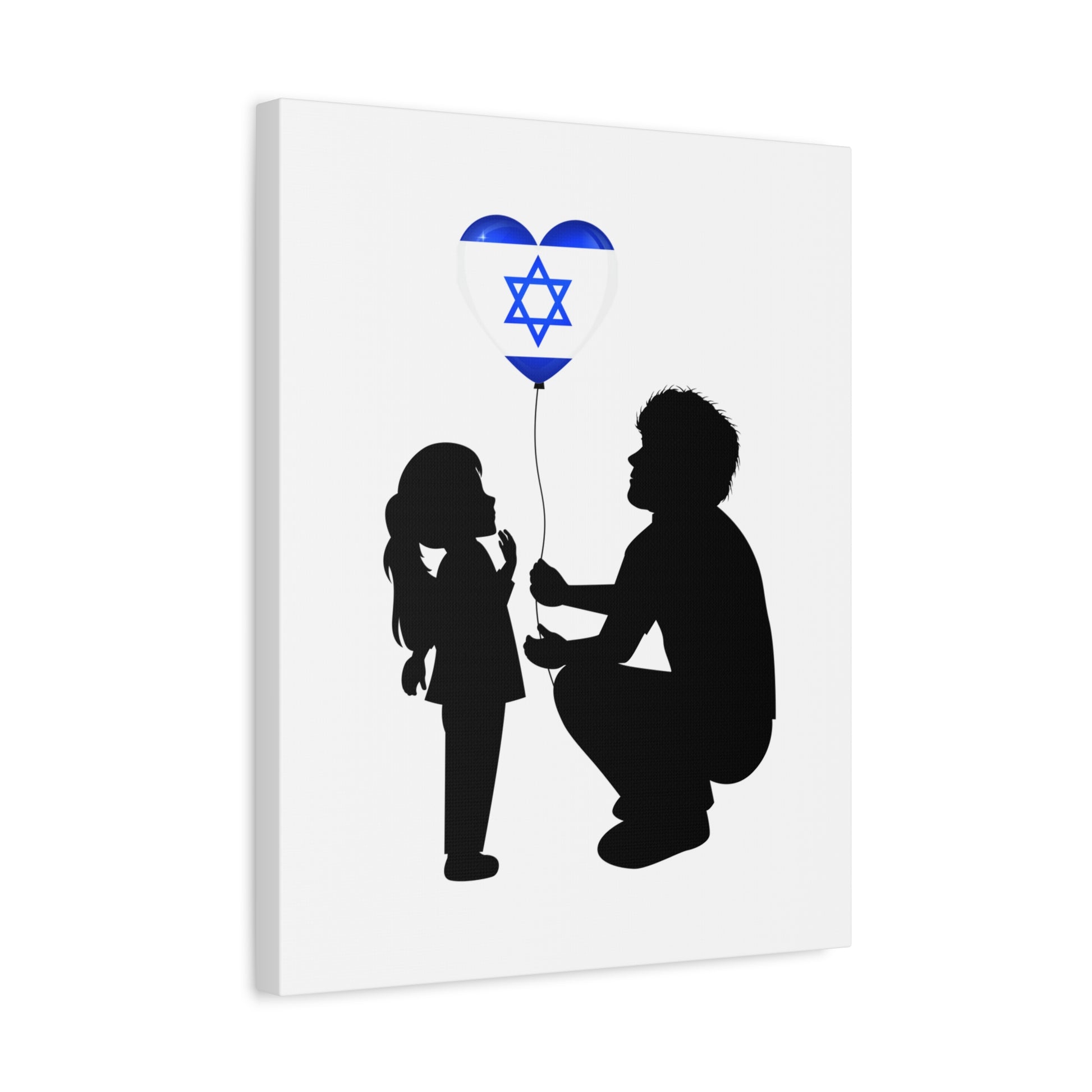 Dette vakre lerretsbildet fanger det tidløse båndet mellom far og datter, silhouettert mot et bakteppe av håp og enhet. Hjerteballongen, dekorert med det israelske flagget, symboliserer urokkelig kjærlighet, styrke og den dype tilknytningen til Israel.