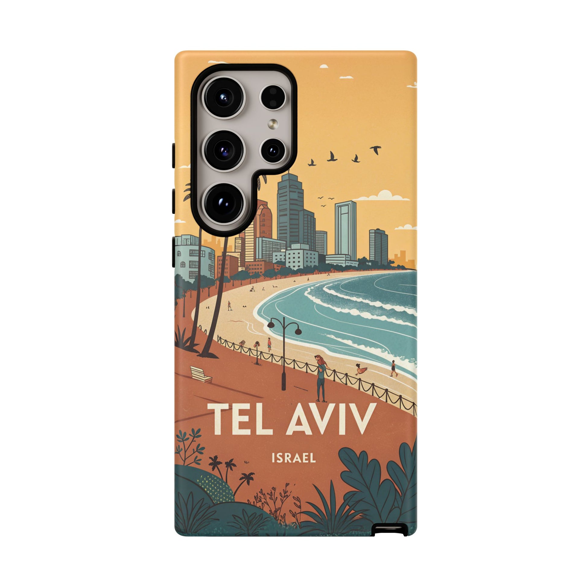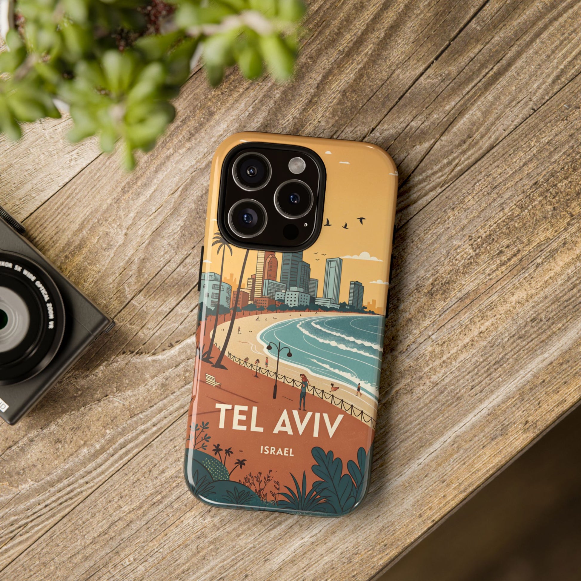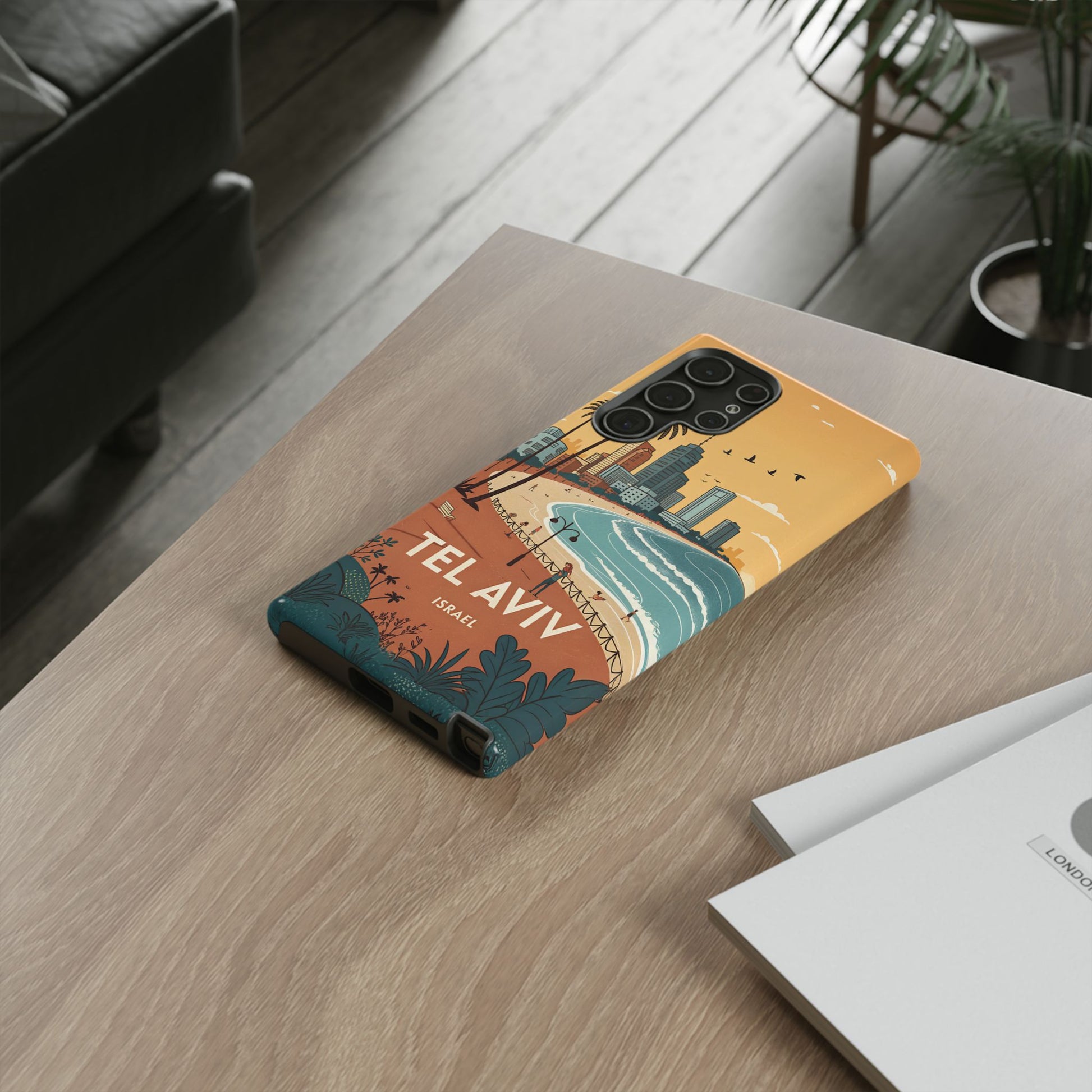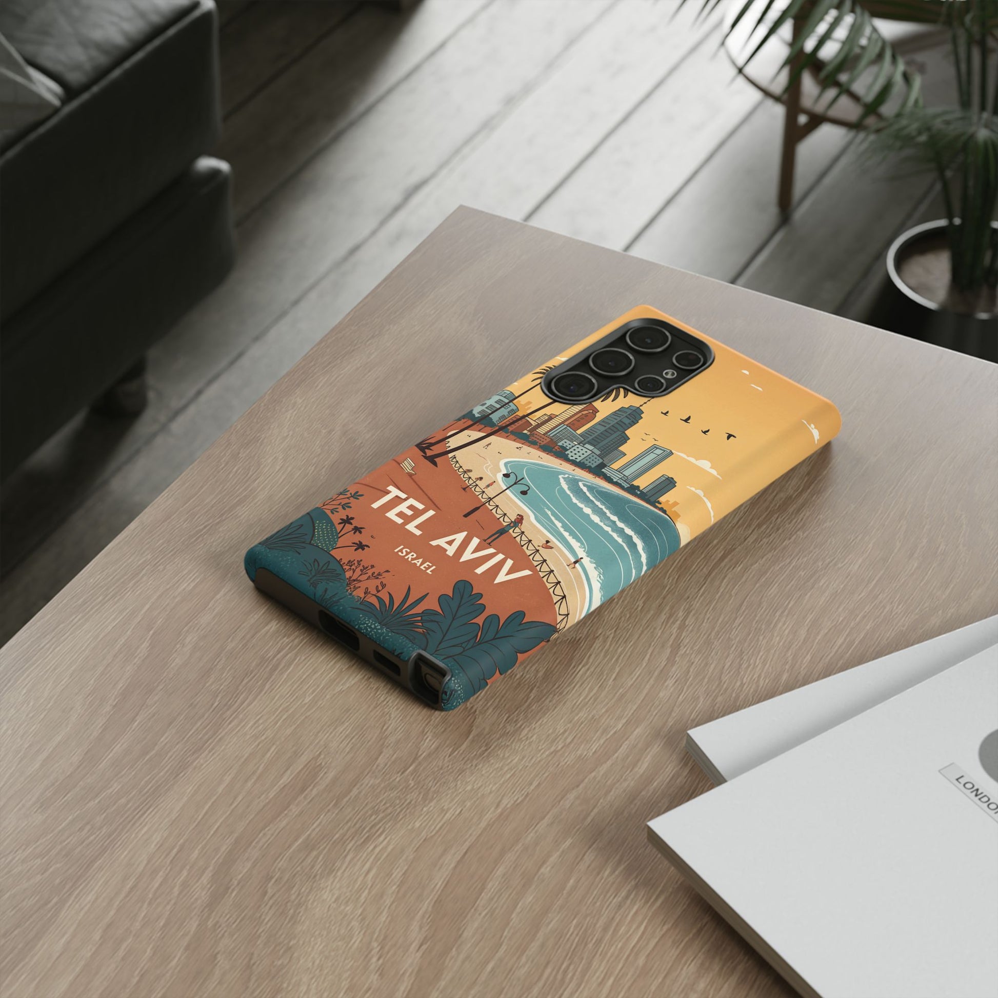 Ta med energien, varmen og livsgleden fra Israels middelhavskyst rett i hånden din med dette retro-inspirerte Tel Aviv-mobildekselet. Designet viser den ikoniske strandlinjen, moderne skyline, palmer og bølger i et varmt og kunstnerisk uttrykk. De myke oransje og blåtonene gir en nostalgisk, solfylt plakatstil som fanger essensen av Tel Aviv – frihet, kreativitet og pulserende byliv.