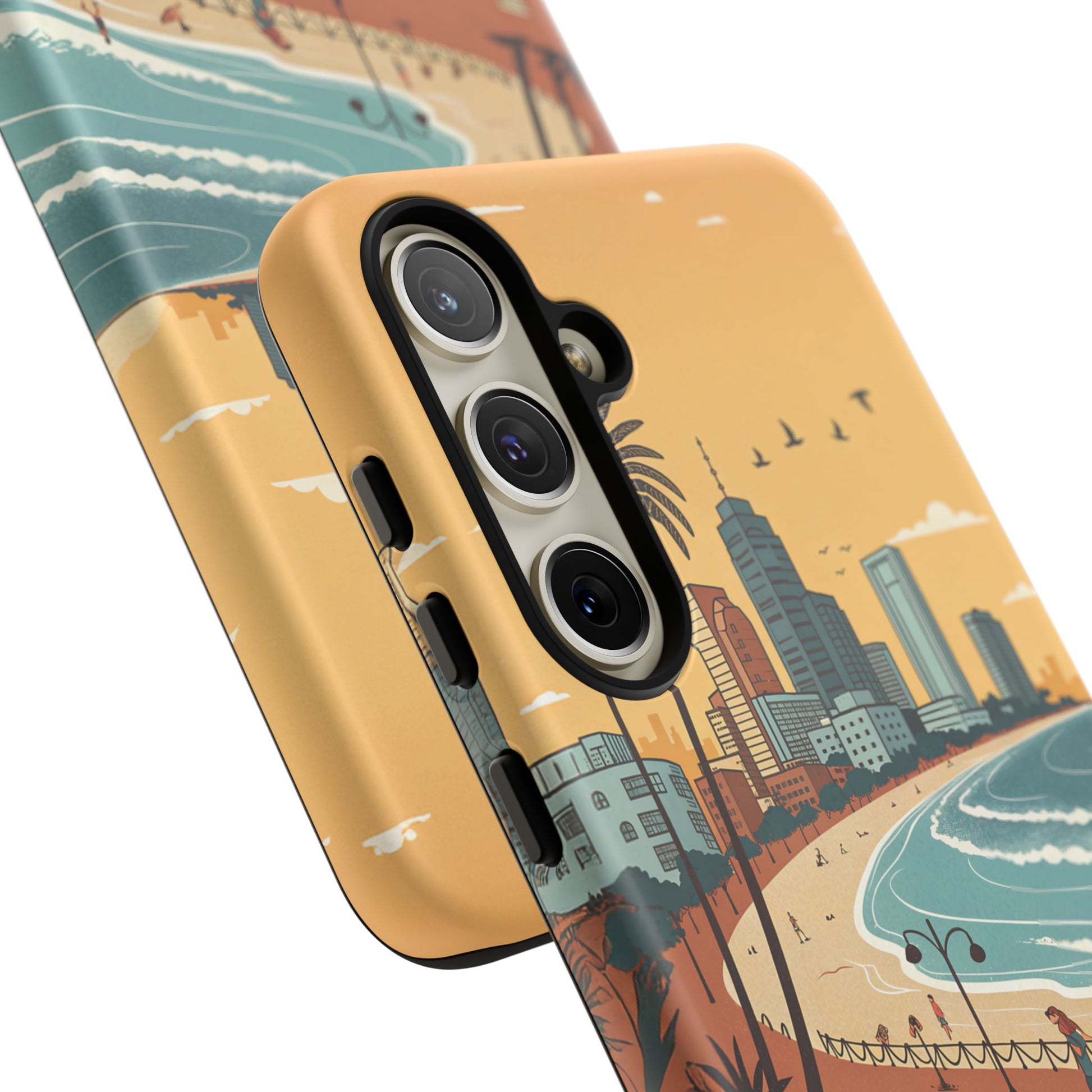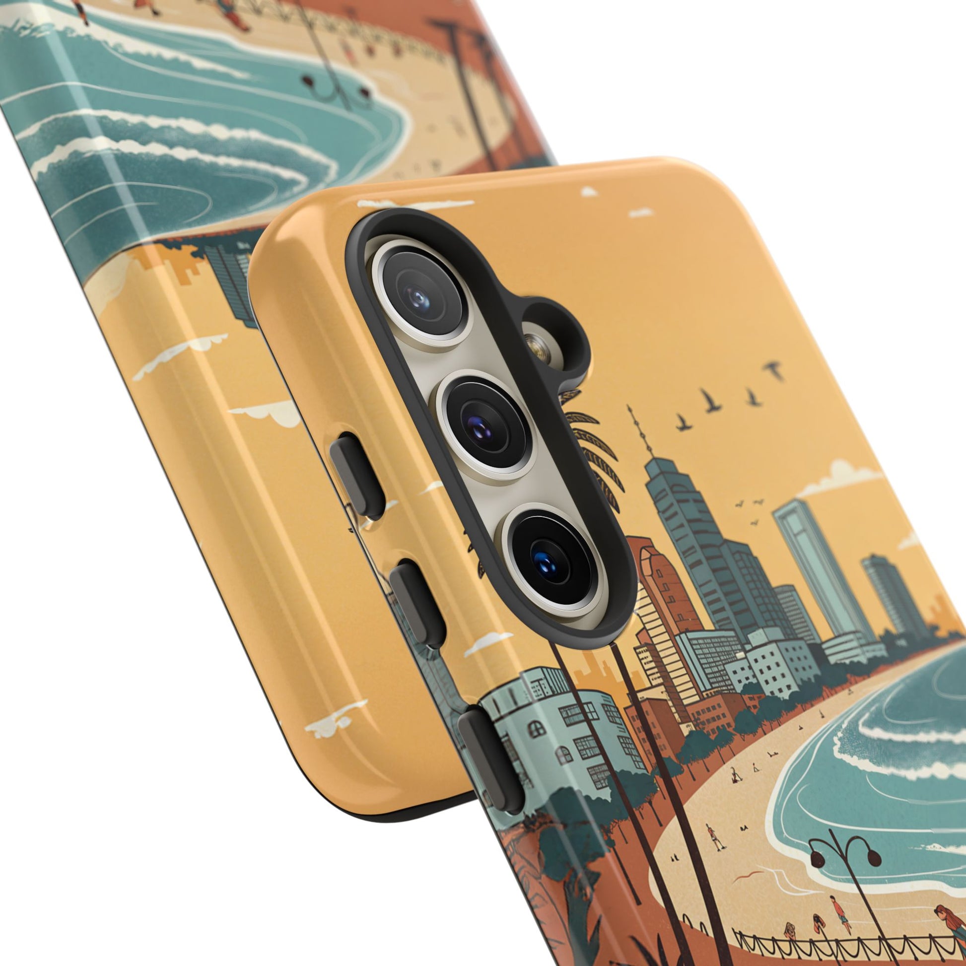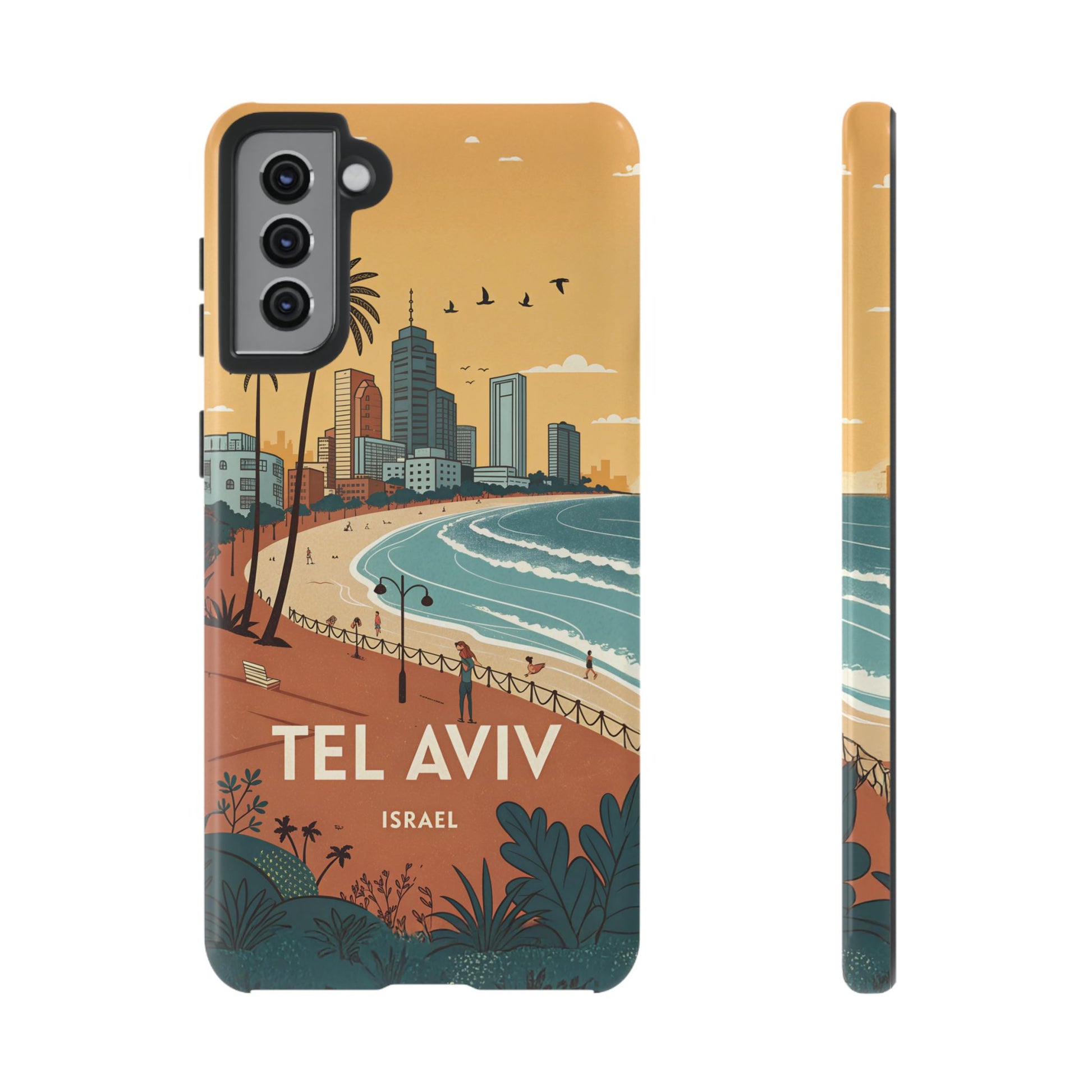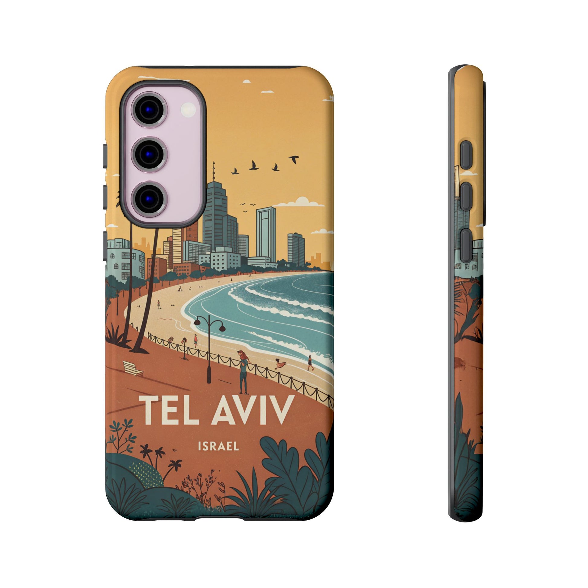 Ta med energien, varmen og livsgleden fra Israels middelhavskyst rett i hånden din med dette retro-inspirerte Tel Aviv-mobildekselet. Designet viser den ikoniske strandlinjen, moderne skyline, palmer og bølger i et varmt og kunstnerisk uttrykk. De myke oransje og blåtonene gir en nostalgisk, solfylt plakatstil som fanger essensen av Tel Aviv – frihet, kreativitet og pulserende byliv.